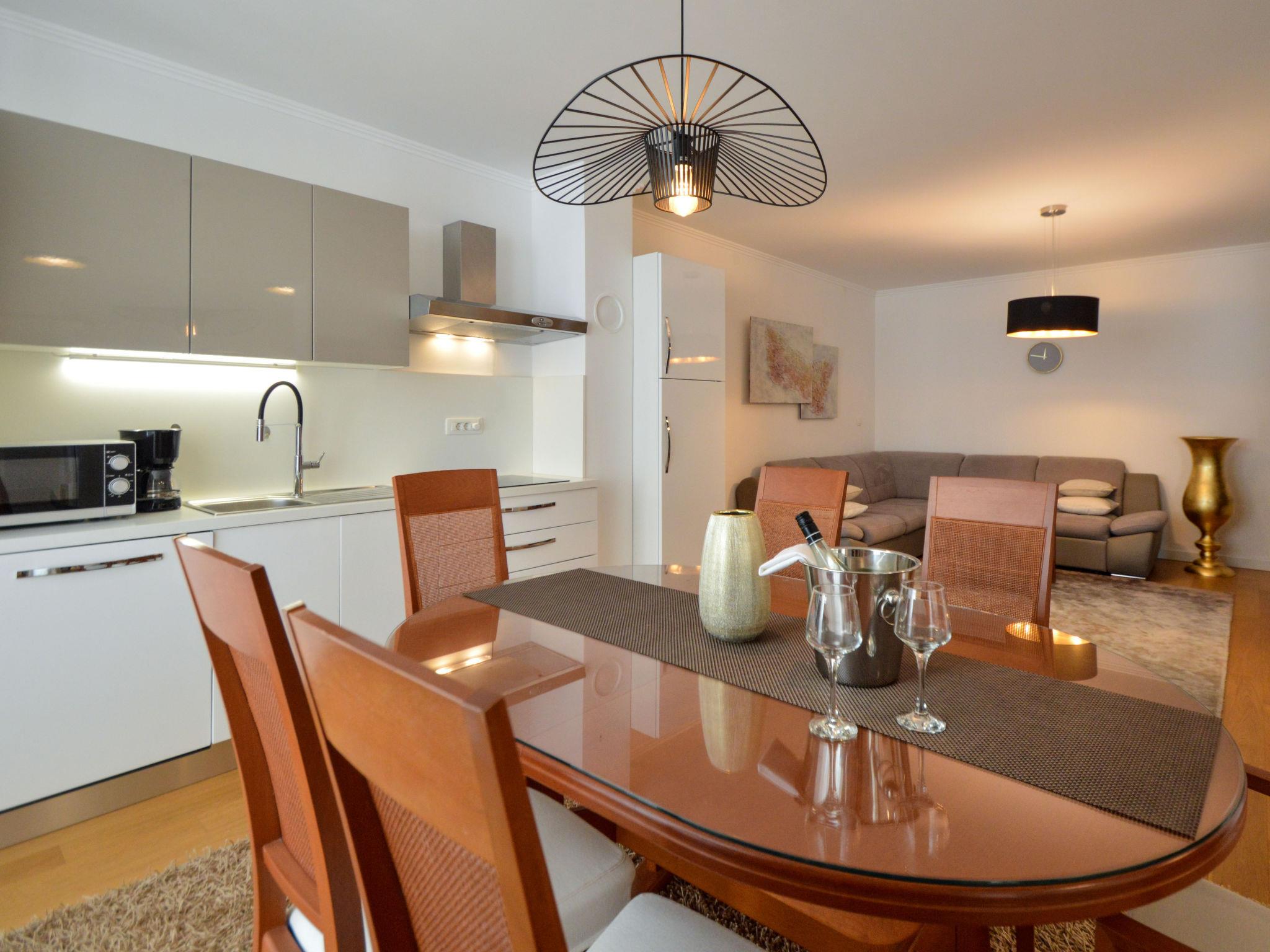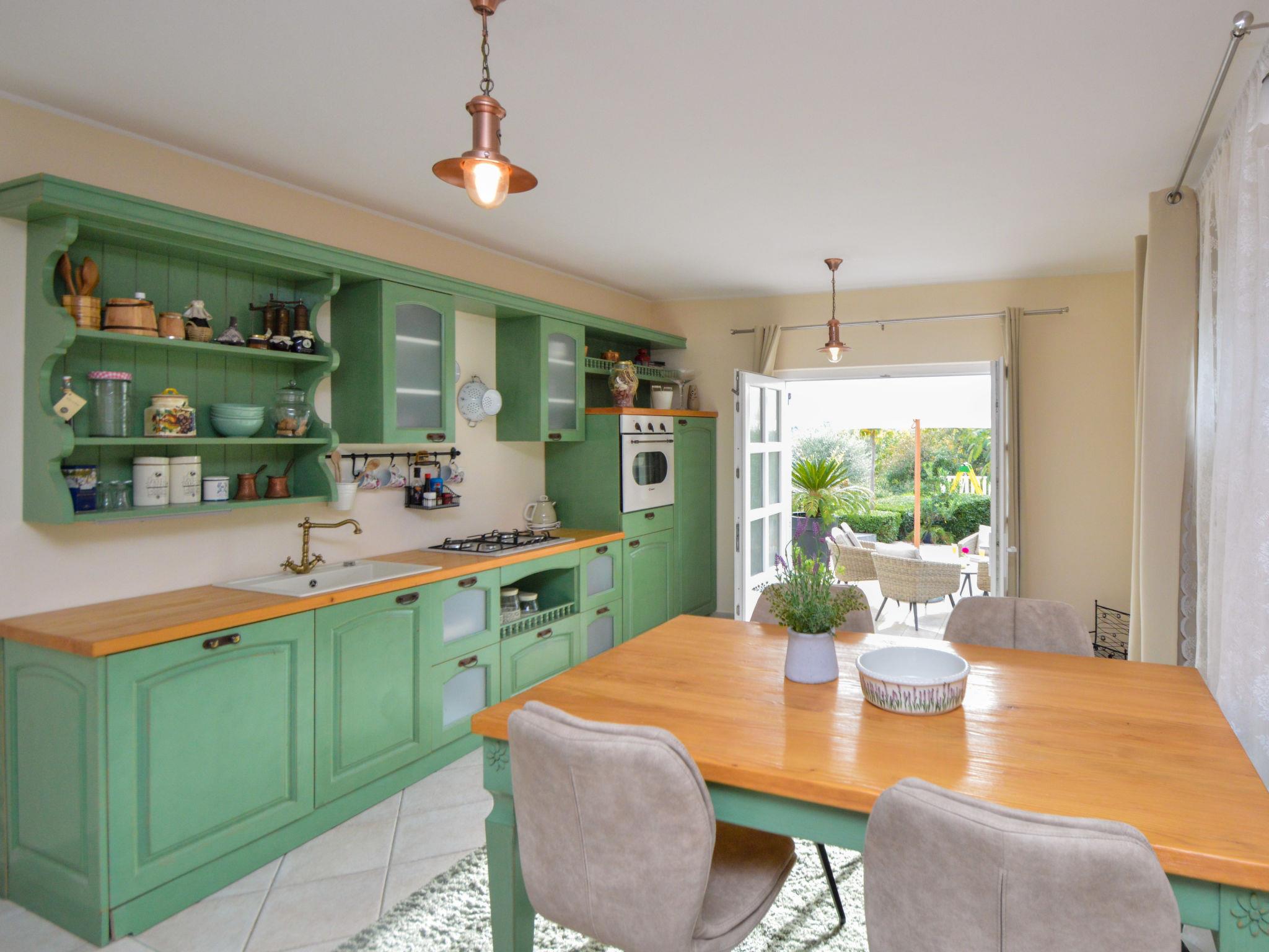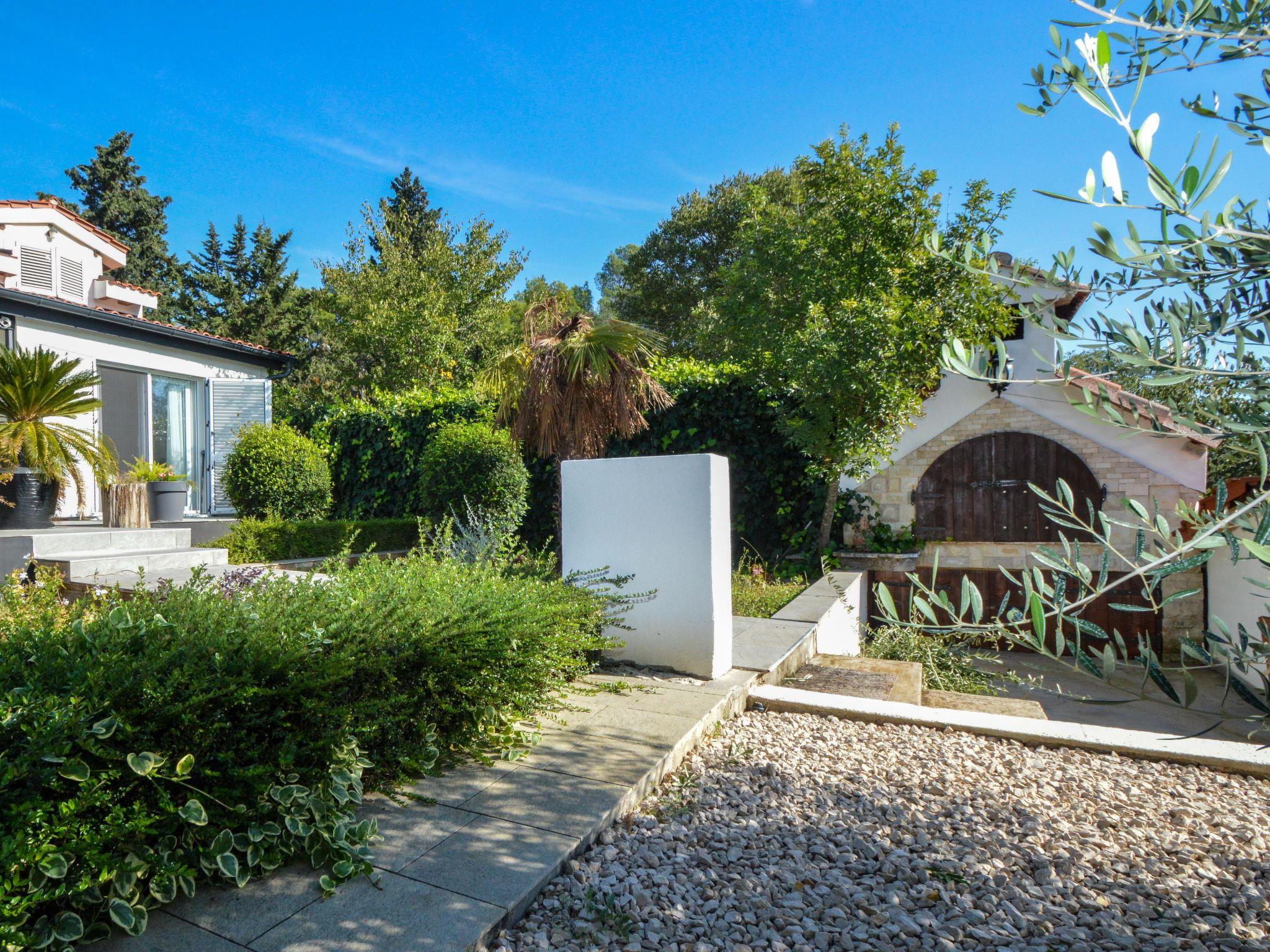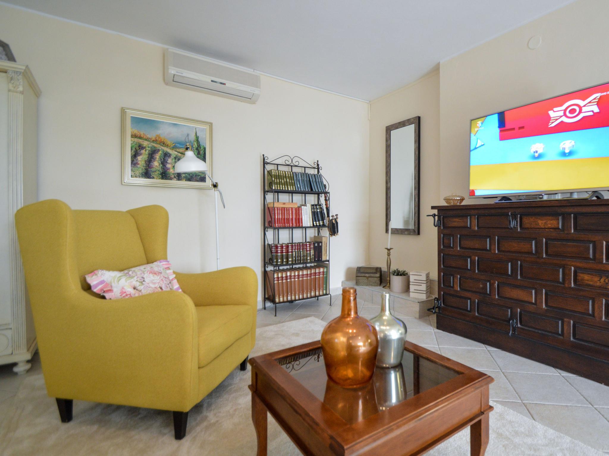 5-room house 180 m2, south facing position. Beautiful and tasteful furnishings: living/sleeping room with 1 french bed (140 cm, length 200 cm), dining table, kitchen corner and satellite TV (flat screen), air conditioning. Exit to the terrace. Living/sleeping room with 1 sofabed (100 cm, length 190 cm), 1 french bed (180 cm, length 200 cm), dining table, kitchen corner and satellite TV (flat screen), air conditioning. Exit to the terrace. Living/dining room 60 m2 with 1 sofabed (120 cm, length 200 cm), satellite TV (flat screen), air conditioning. Exit to the terrace. 1 room with 1 french bed (160 cm, length 200 cm), shower/WC and air conditioning. Exit to the terrace. 1 room with 2 beds (90 cm, length 200 cm). Exit to the balcony. Open kitchen (oven, dishwasher, 4 ceramic glass hob hotplates, toaster, kettle, microwave, freezer, electric coffee machine). Bath/WC, 2 showers/WC. No heating option. Balcony 4 m2, 2 terraces 30 m2, terrace 15 m2. Terrace furniture, deck chairs. View of the swimming pool and the garden. Facilities: washing machine, safe, children's high chair, baby cot, hair dryer. Internet (WiFi, free). No internal connecting door between the separated properties. Small detached house: living/ bedroom, open kitchen. Main building with 2 apartments on the ground floor, each apartment with separate and external entrance. One apartment: living/bedroom, open kitchen. The other apartment: living/dining area, open kitchen, 2 bedrooms.