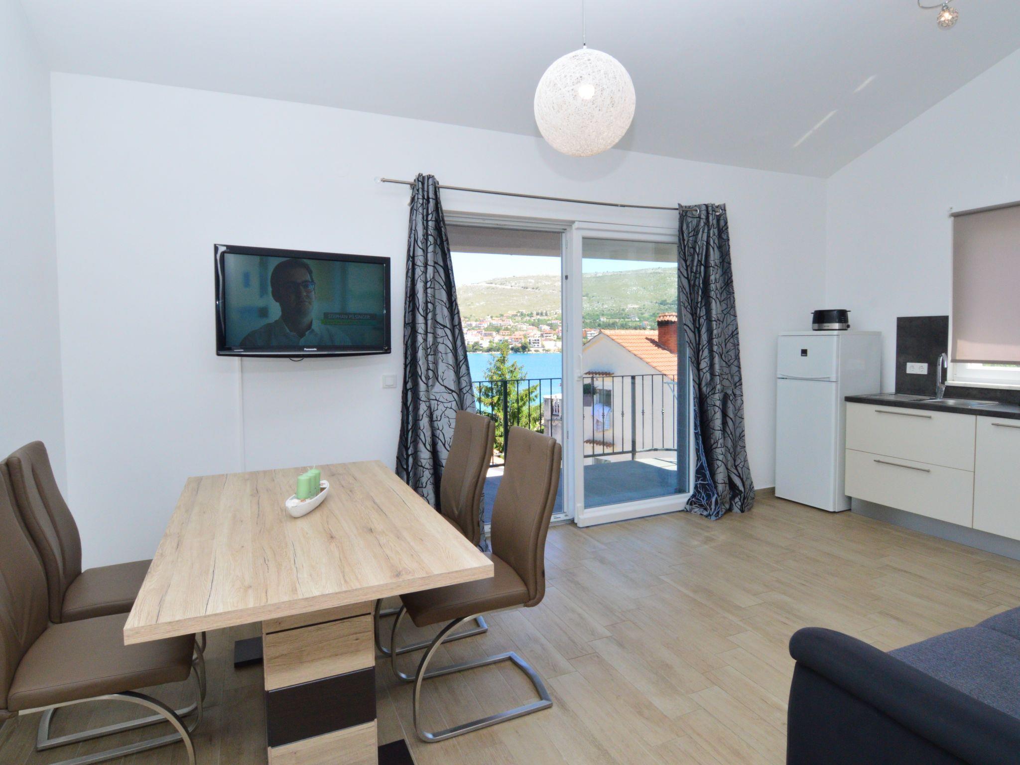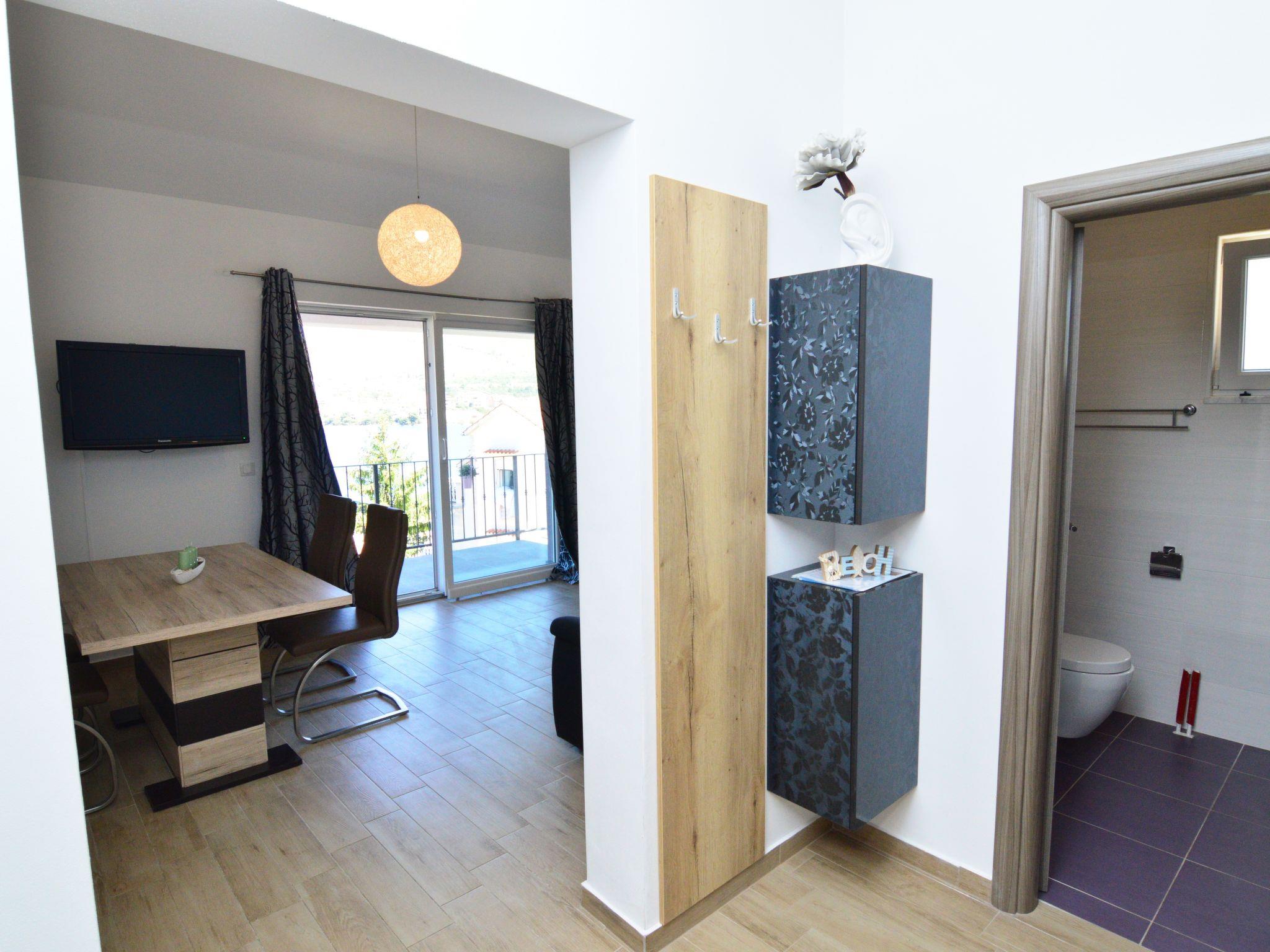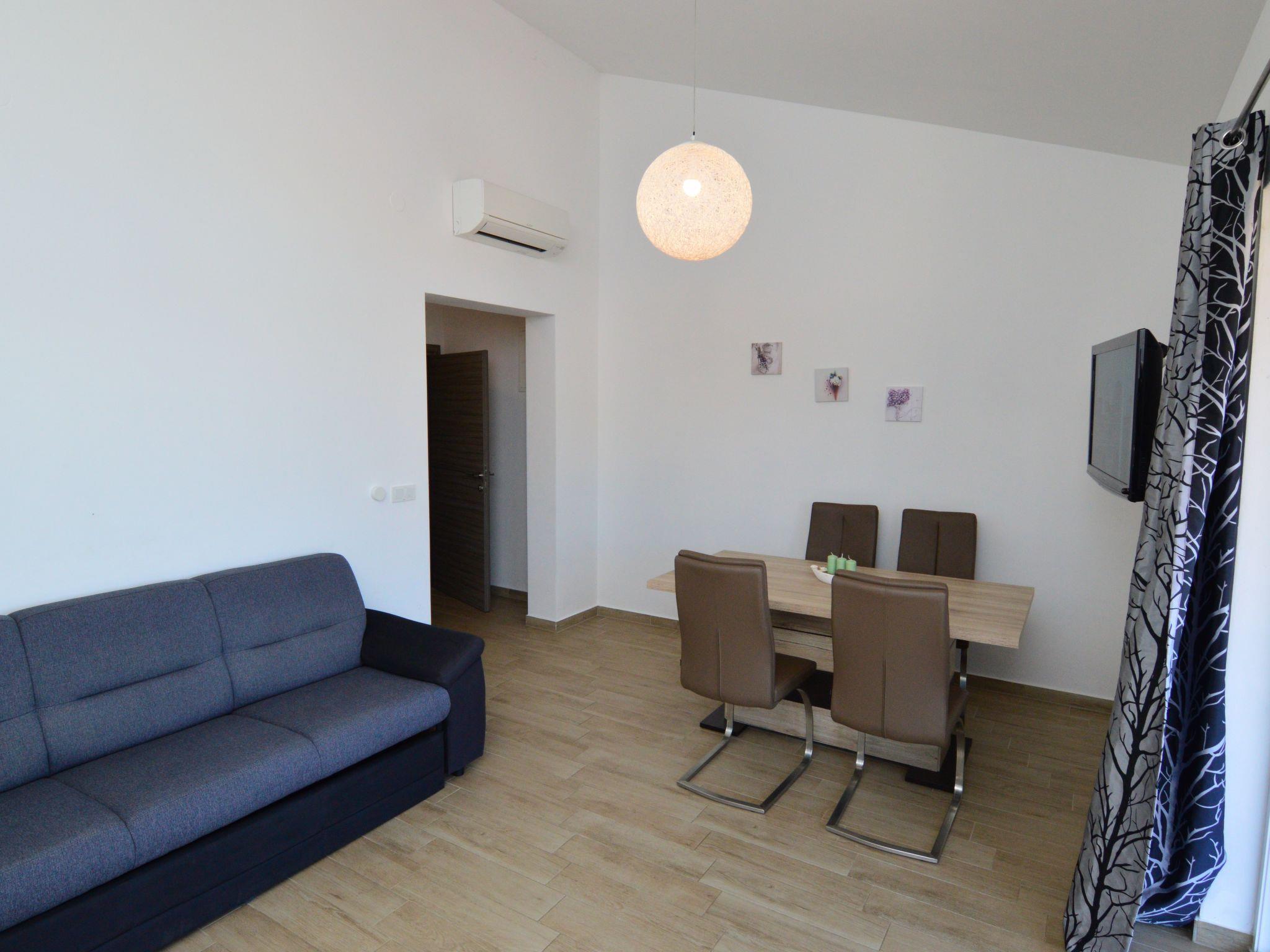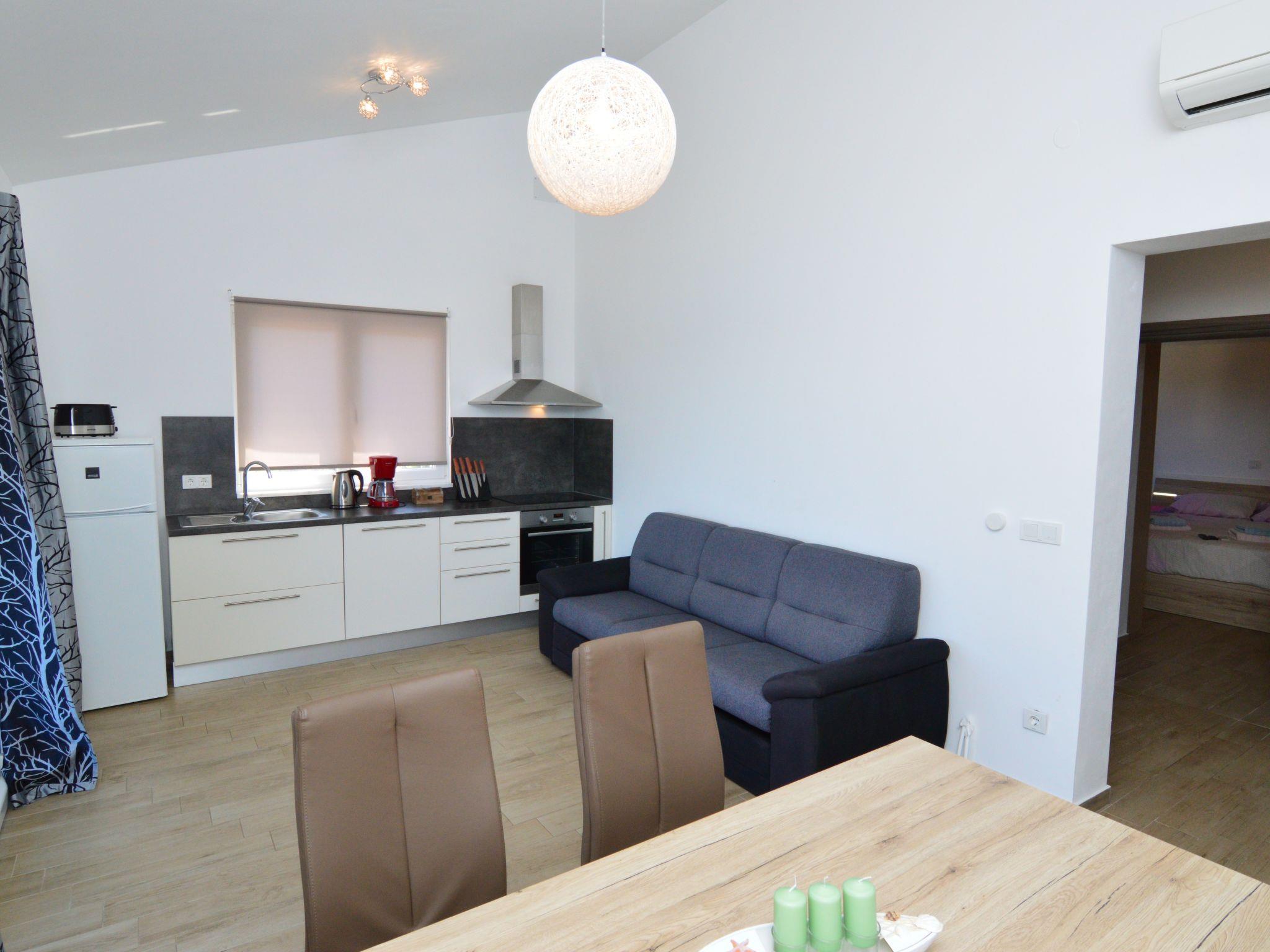 2-room apartment 40 m2 on 1st floor. Living/dining room with 1 double sofabed (160 cm), satellite TV (flat screen), air conditioning. Exit to the balcony. 1 room with 1 french bed (180 cm). Open kitchen (oven, dishwasher, 4 ceramic glass hob hotplates, toaster, kettle, freezer, electric coffee machine). Shower/WC. No heating option. Small balcony. Balcony furniture. View of the sea. Facilities: Internet (WiFi, free). Parking (1 car). Please note: non-smokers only.