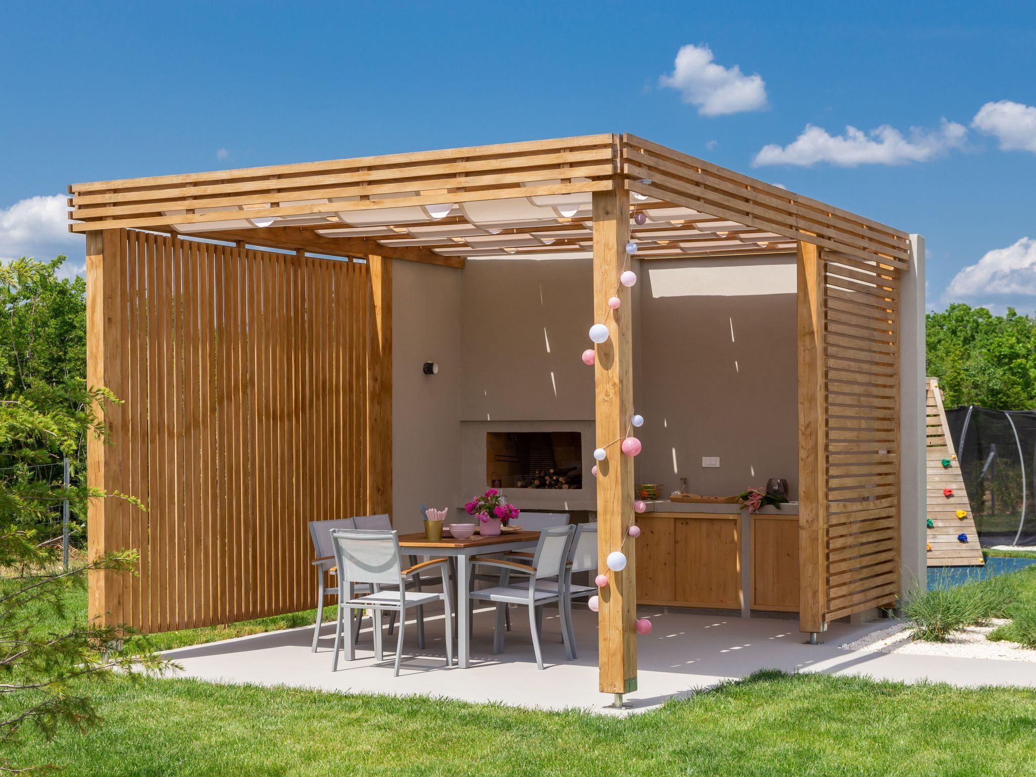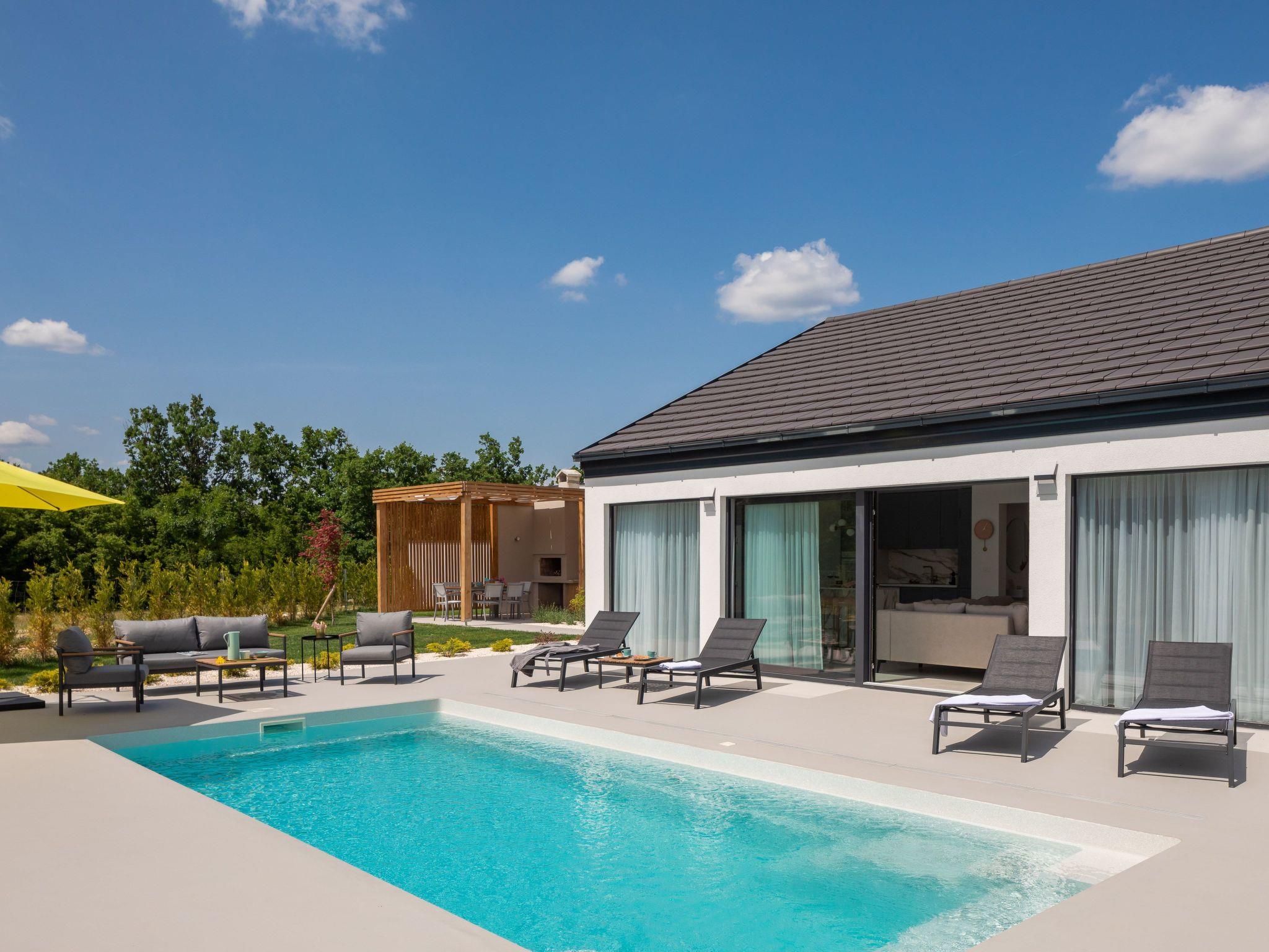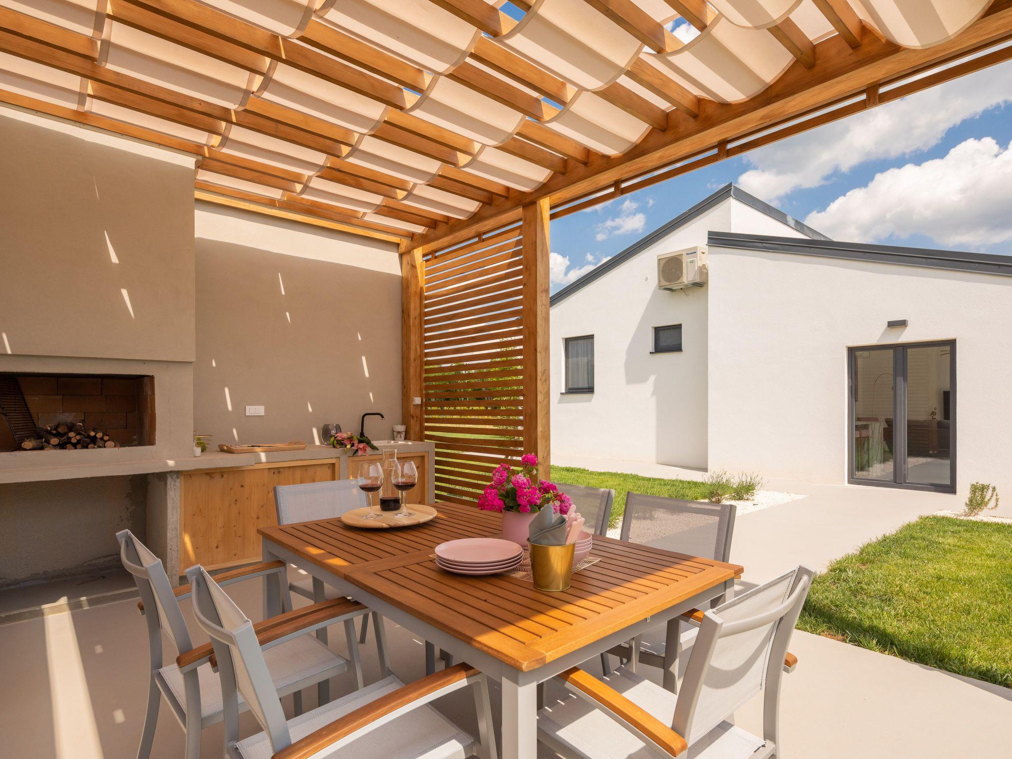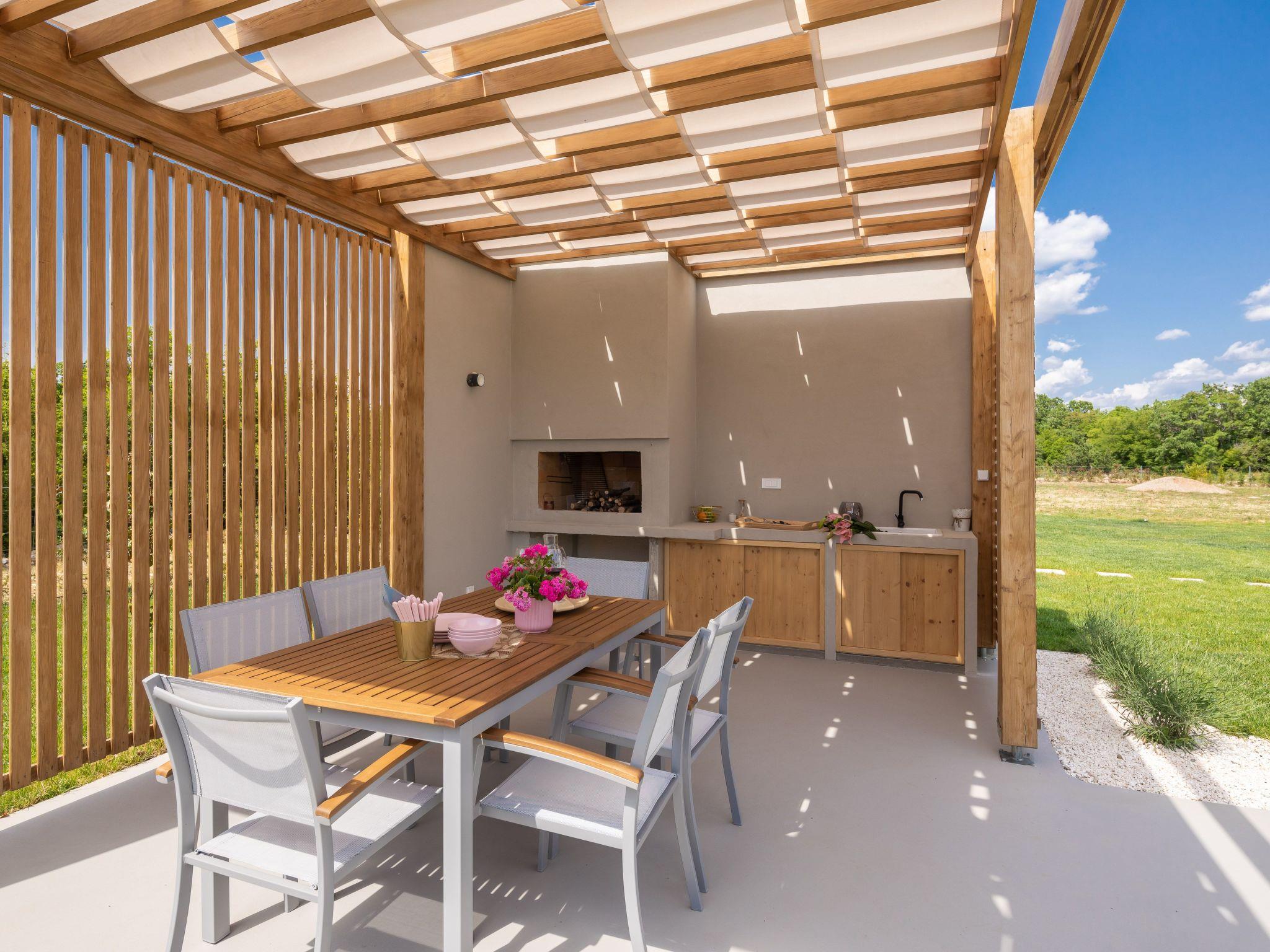 Just like you can cook in the indoor area, you can do it in the outdoor. Right by the beautiful outdoor dining area, under a wooden arbour, is the outdoor kitchen with a BBQ. While you are preparing your meals, the rest of the crew can swim in the pool, tan on the loungers, or drink a cocktail on the garden furniture.