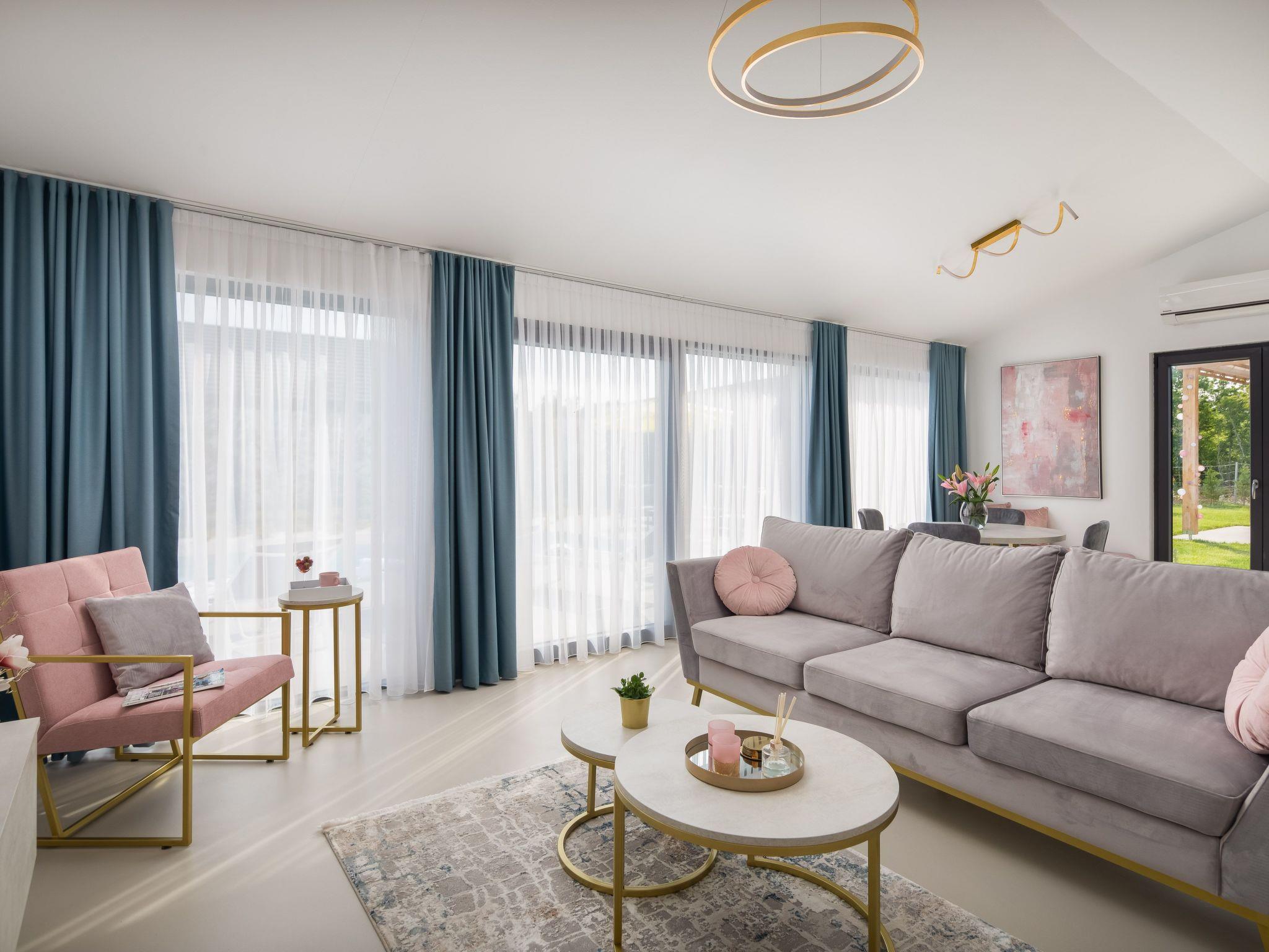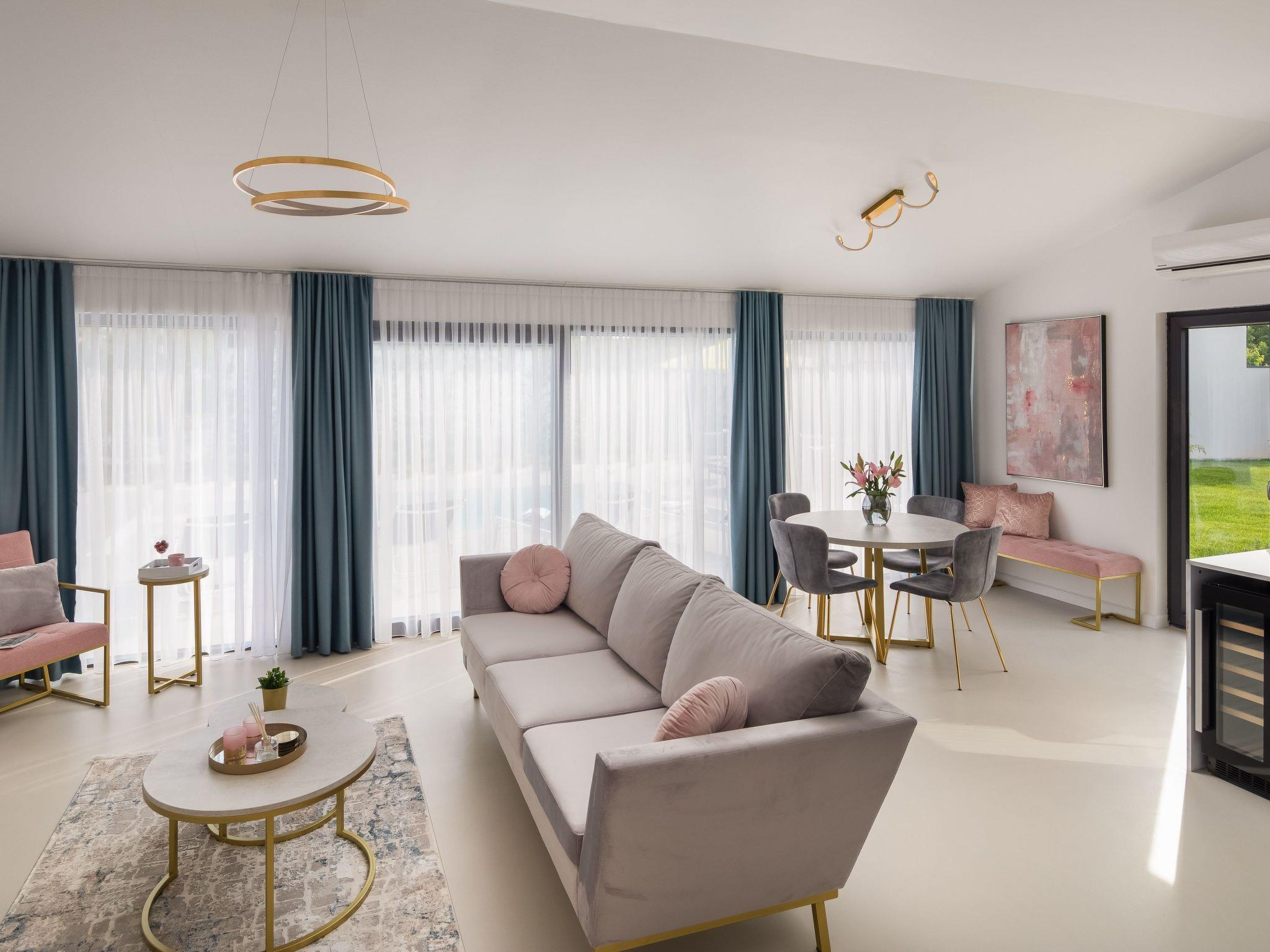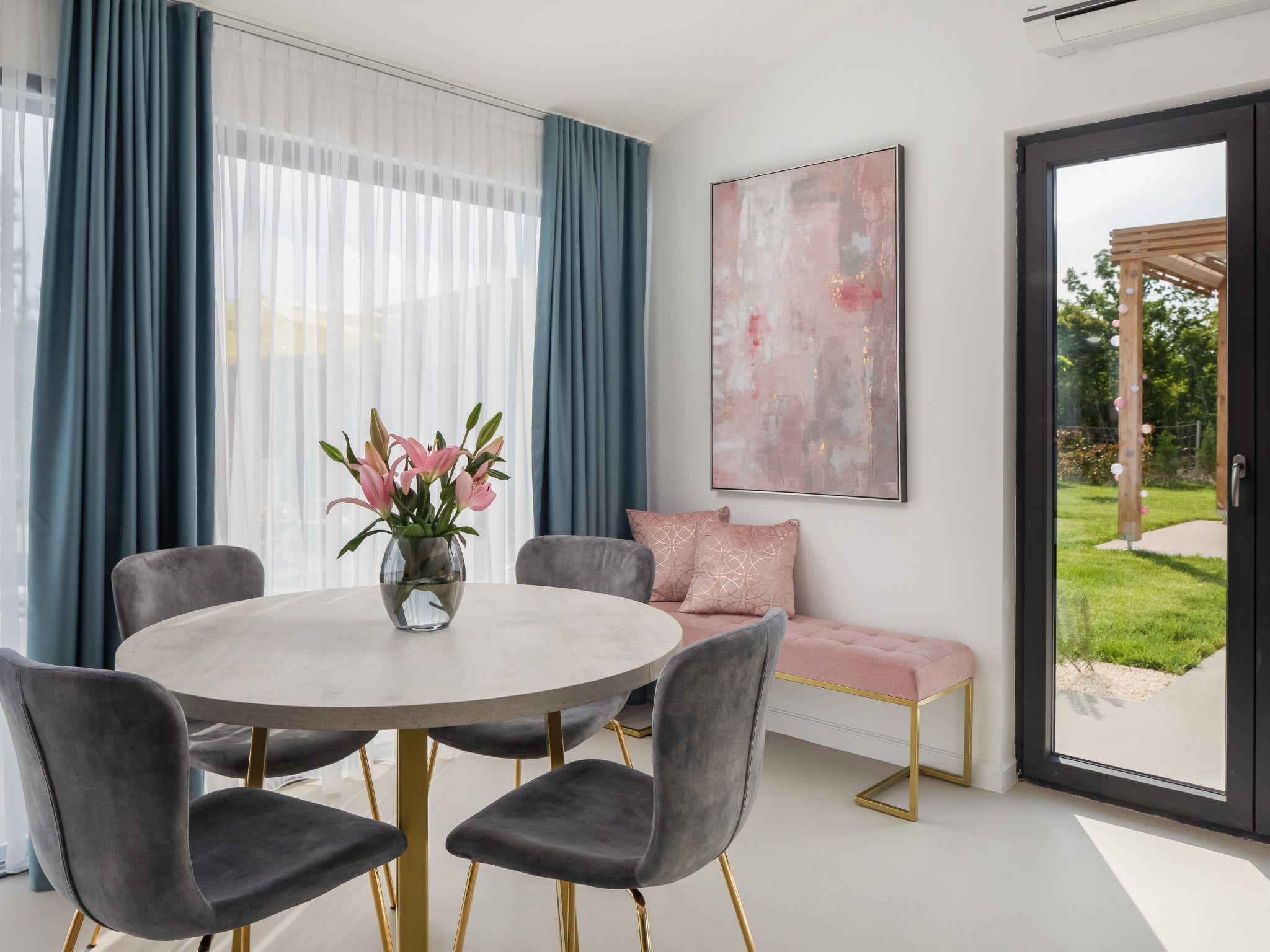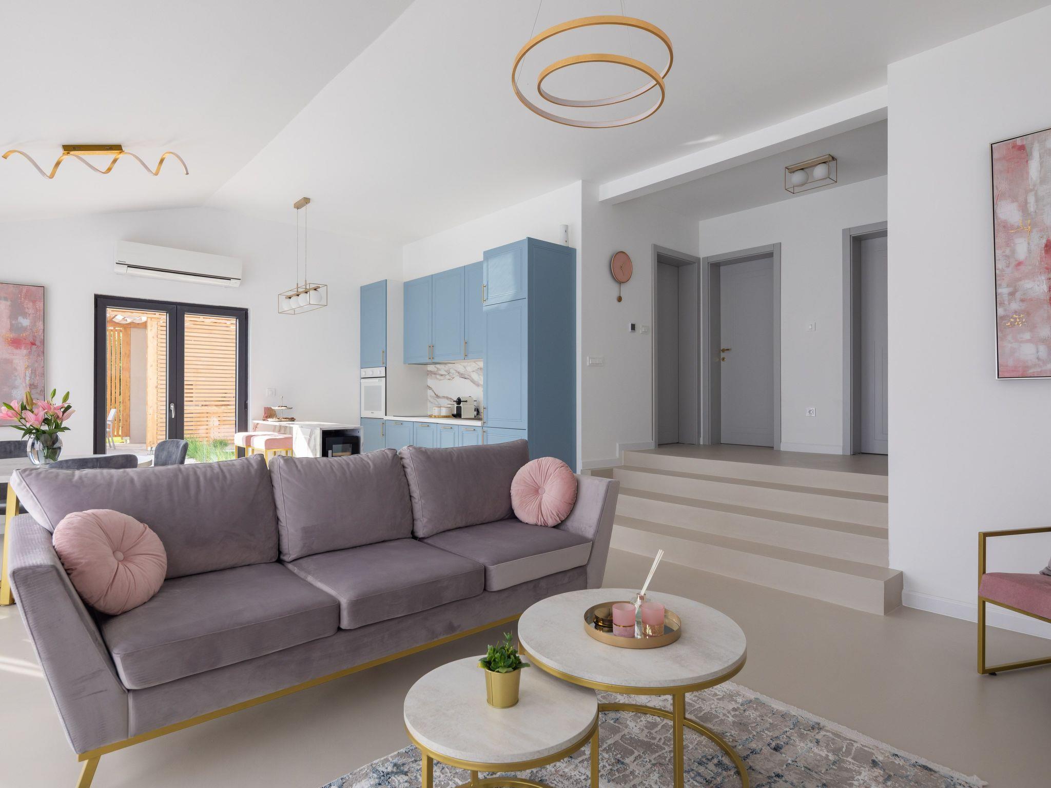 The maximum capacity of this villa is 4 guests. The bedrooms are large and spacious, one having a double bed and the other two single beds. This is excellent if you are travelling with children. The bathroom has all the toiletries you need, the bathrobes, pool towels, slippers, etc. The cooking is always easier when the kitchen is fully equipped, just like this one. There is even a child high chair for small children. The indoor dining area is right by it, just like the large living room. There are big window walls all around the villa so that the interior is also filled with sun rays.