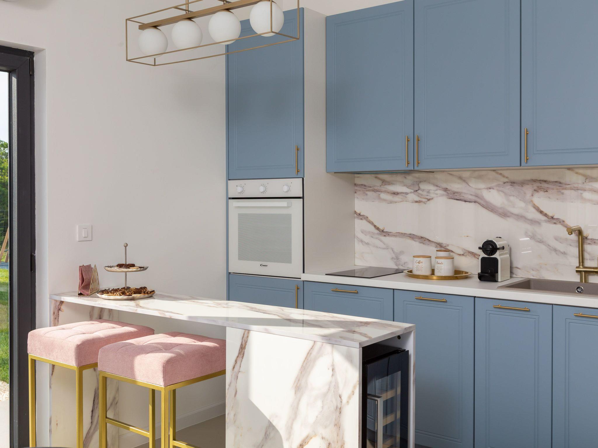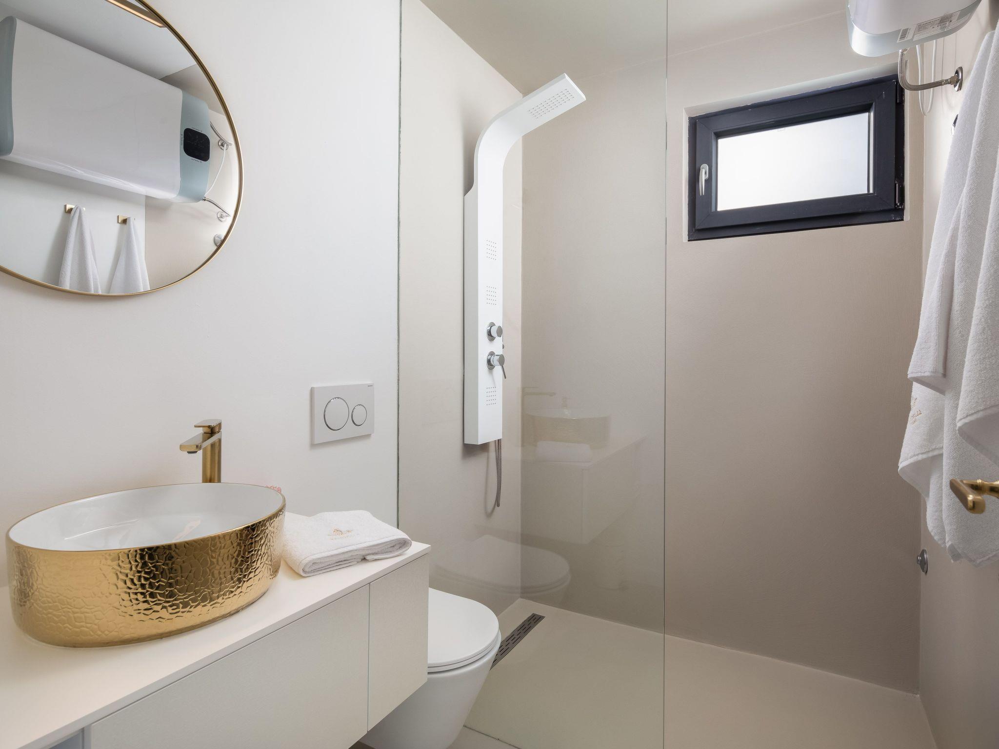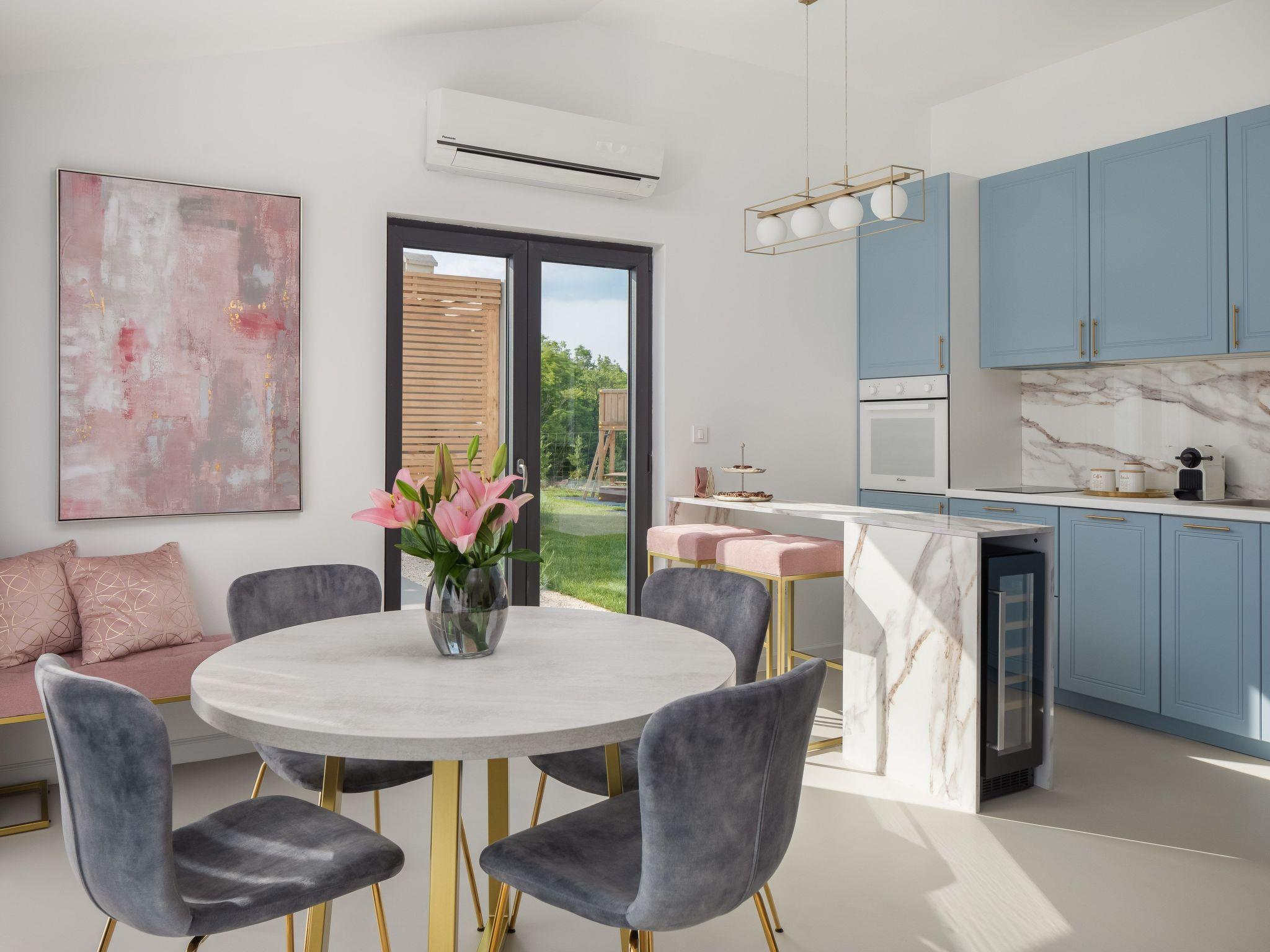 The maximum capacity of this villa is 4 guests. The bedrooms are large and spacious, one having a double bed and the other two single beds. This is excellent if you are travelling with children. The bathroom has all the toiletries you need, the bathrobes, pool towels, slippers, etc. The cooking is always easier when the kitchen is fully equipped, just like this one. There is even a child high chair for small children. The indoor dining area is right by it, just like the large living room. There are big window walls all around the villa so that the interior is also filled with sun rays.