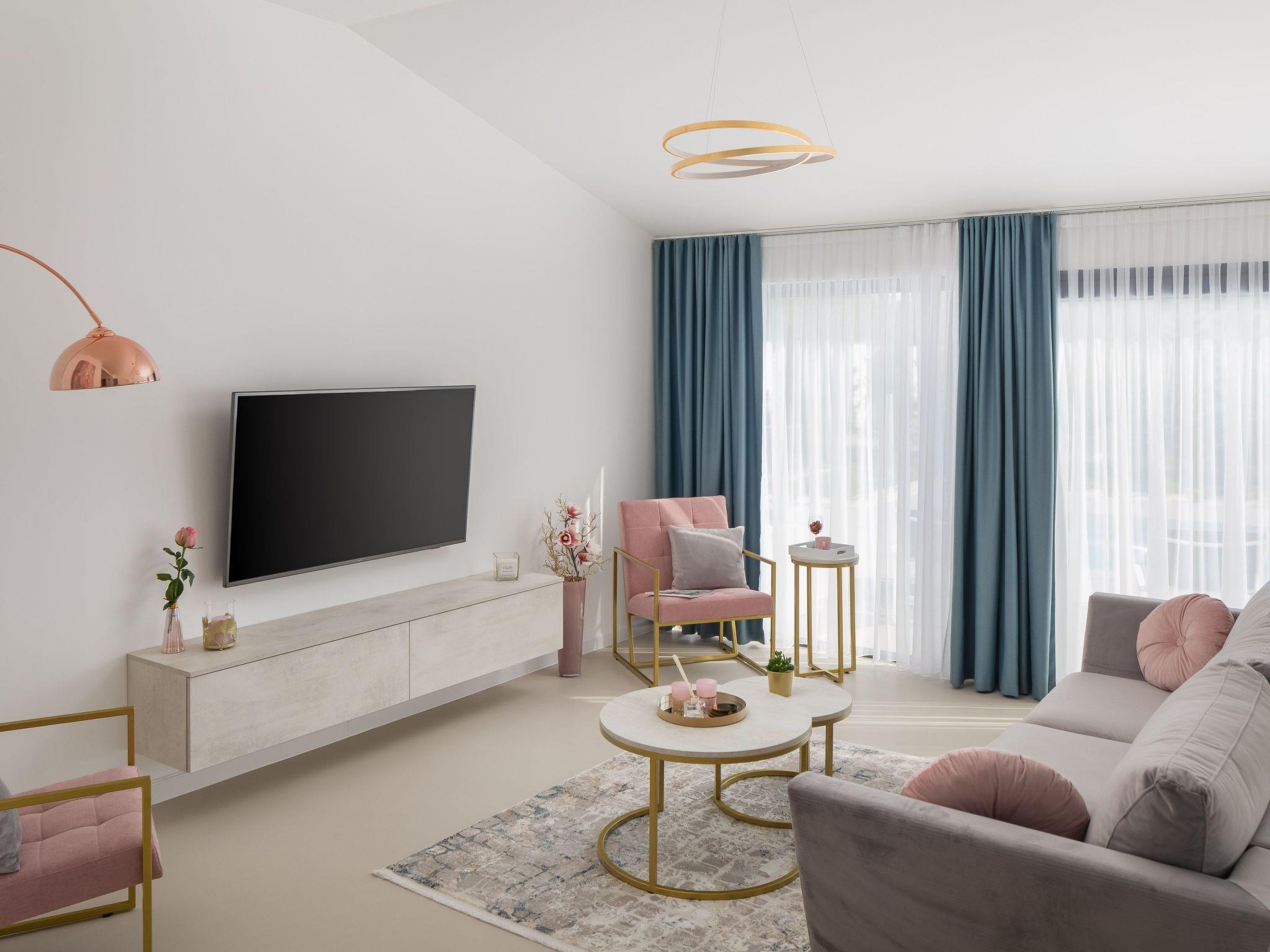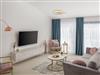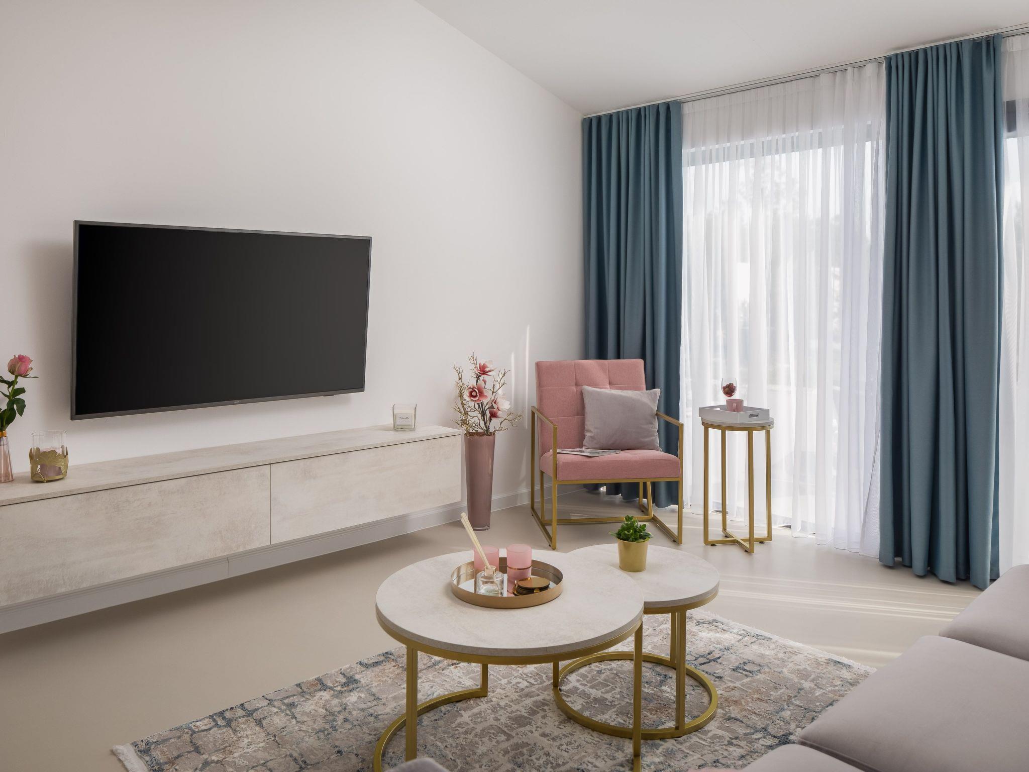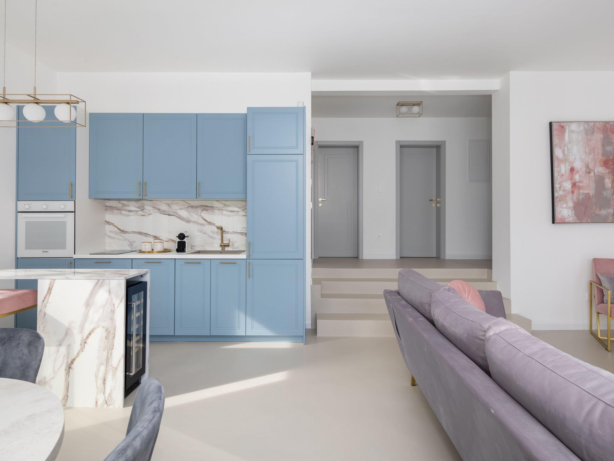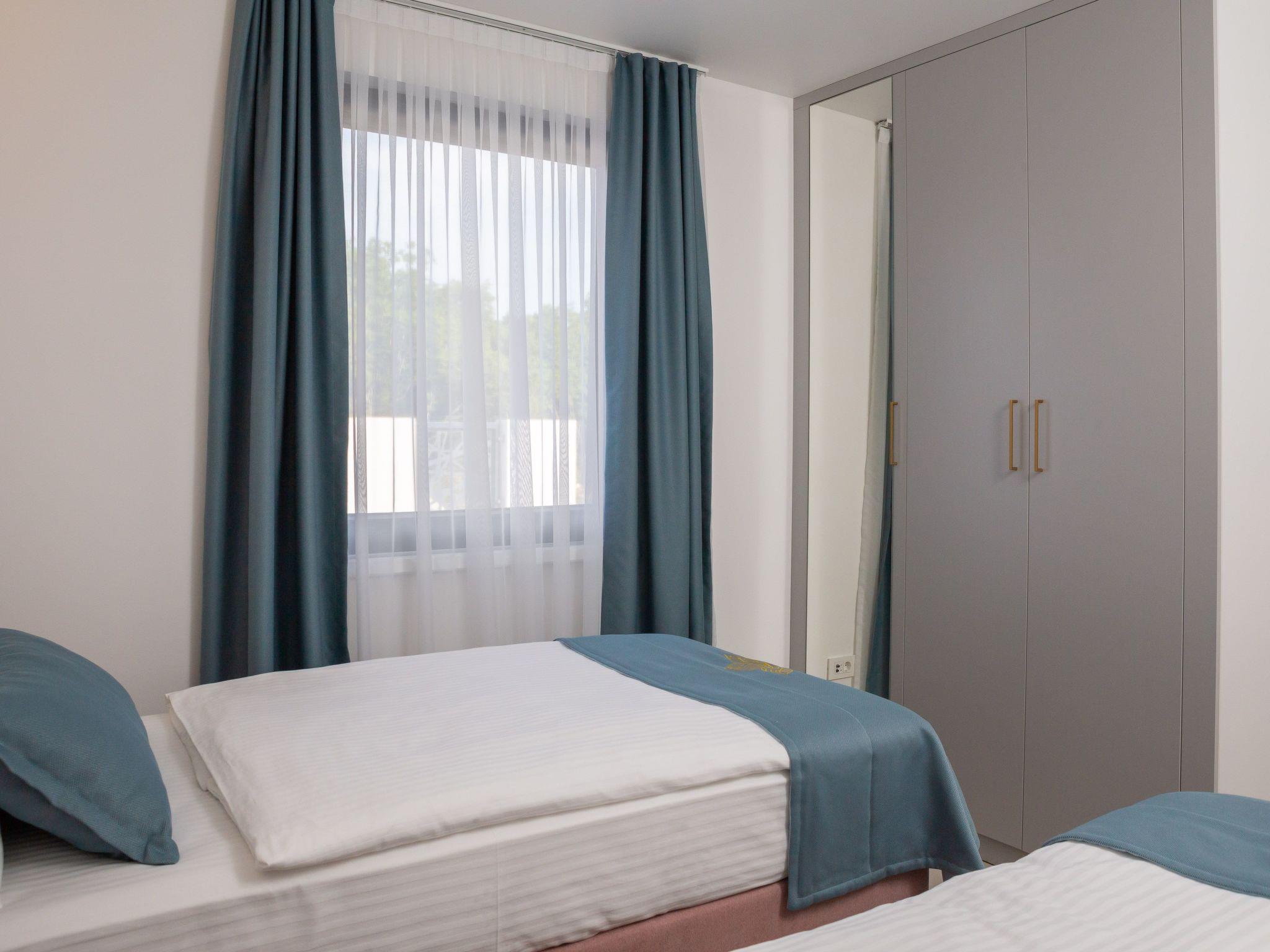 The maximum capacity of this villa is 4 guests. The bedrooms are large and spacious, one having a double bed and the other two single beds. This is excellent if you are travelling with children. The bathroom has all the toiletries you need, the bathrobes, pool towels, slippers, etc. The cooking is always easier when the kitchen is fully equipped, just like this one. There is even a child high chair for small children. The indoor dining area is right by it, just like the large living room. There are big window walls all around the villa so that the interior is also filled with sun rays.
