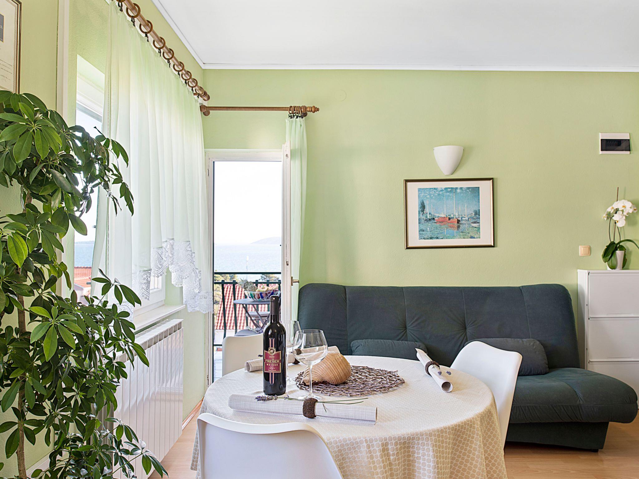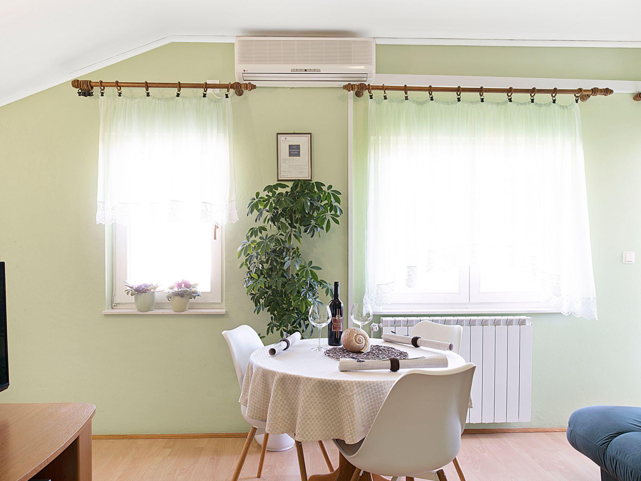 This modern apartment is on the third floor and can accommodate four people. The air-conditioned living room features a dining table with chairs, an LCD TV with satellite channels, and a small kitchen unit with a hob, fridge, microwave and coffee machine. The bedroom room comprises a double bed, a wardrobe and a sofa that can be converted into a bed for two more persons. The bathroom has a shower, washbasin and toilet.
