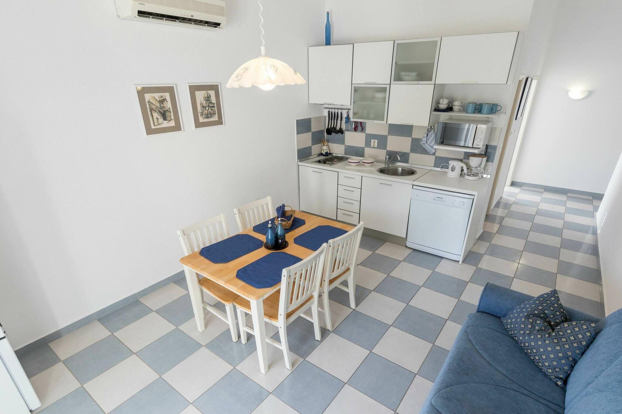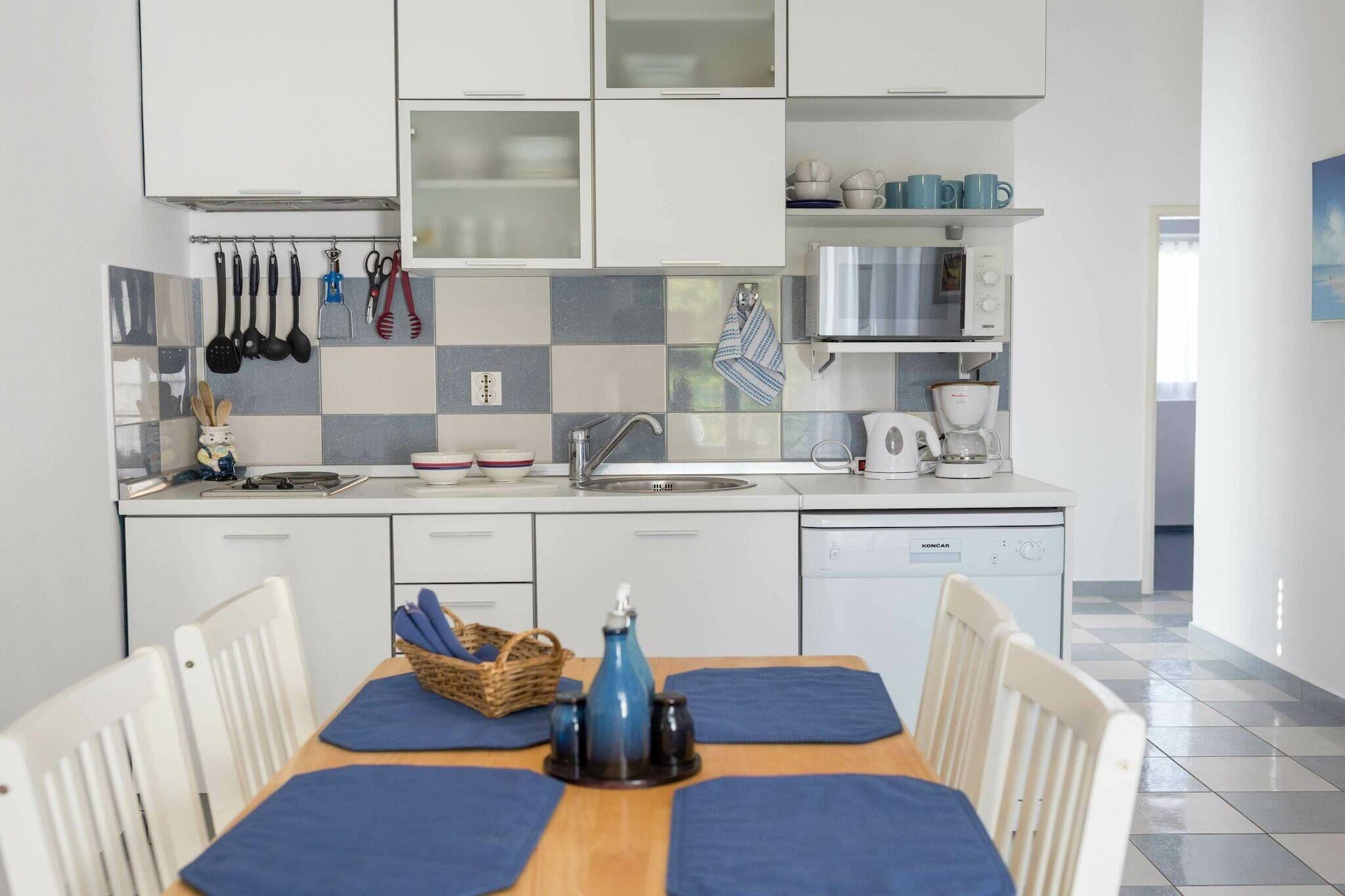 Hvis du leder efter en helt stressfri ferie ved havet, tilbyder denne behagelige lejlighed på første sal i Jadrija en ideel løsning til op til otte gæster. Denne bolig er smart indrettet som to moderne lejligheder lige ved siden af hinanden og tilbyder den perfekte balance mellem samvær og privatliv, hvilket gør den til en vidunderlig base for to familier eller en gruppe venner. Kun en lille, duftende fyrreskov adskiller din bolig fra selve stranden. Hver enhed har en hyggelig opholds- og spisestue, et veludstyret åbent køkken med opvaskemaskine, et moderne badeværelse og to soveværelser, hvilket sikrer fire private værelser i alt. Du har adgang til en dejlig balkon og en rummelig overdækket terrasse på 40 kvadratmeter, som er møbleret med et stort spisebord, der er klar til at servere dine gruppemåltider. I stueetagen hjælper de venlige ejere gerne med alt, hvad du måtte have brug for, og haven foran huset har en vidunderlig stengrill til at grille frisk dalmatisk mad. Den bekvemme beliggenhed betyder, at restauranter og dagligvarebutikker kun ligger en kort gåtur væk. Sibeniks livlige bymidte kan nås på cirka tyve minutter i bil, eller du kan nemt besøge vandfaldene i Krka Nationalpark, der kun ligger 30 kilometer væk. Bemærk venligst, at denne lejlighed for at bevare den fredelige atmosfære ikke kan lejes til grupper af unge under 25 år. Af hensyn til alle fremtidige gæsters komfort er rygning ikke tilladt indendørs, og kæledyr er ikke tilladt på ejendommen.