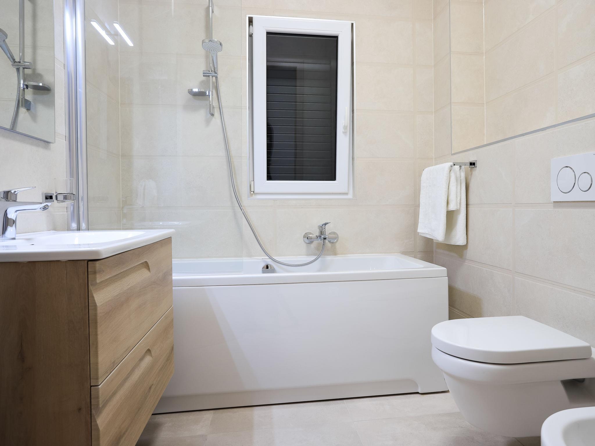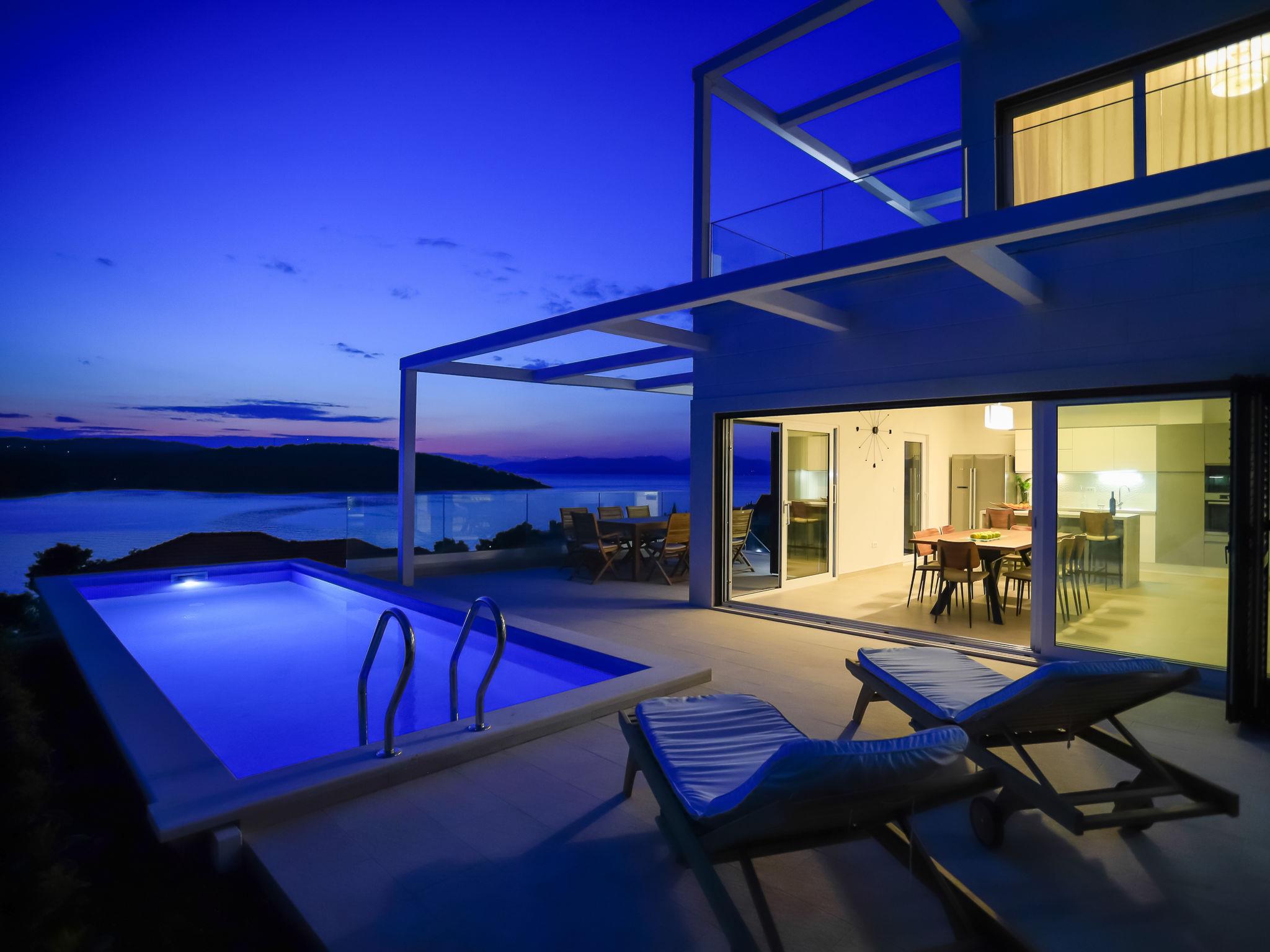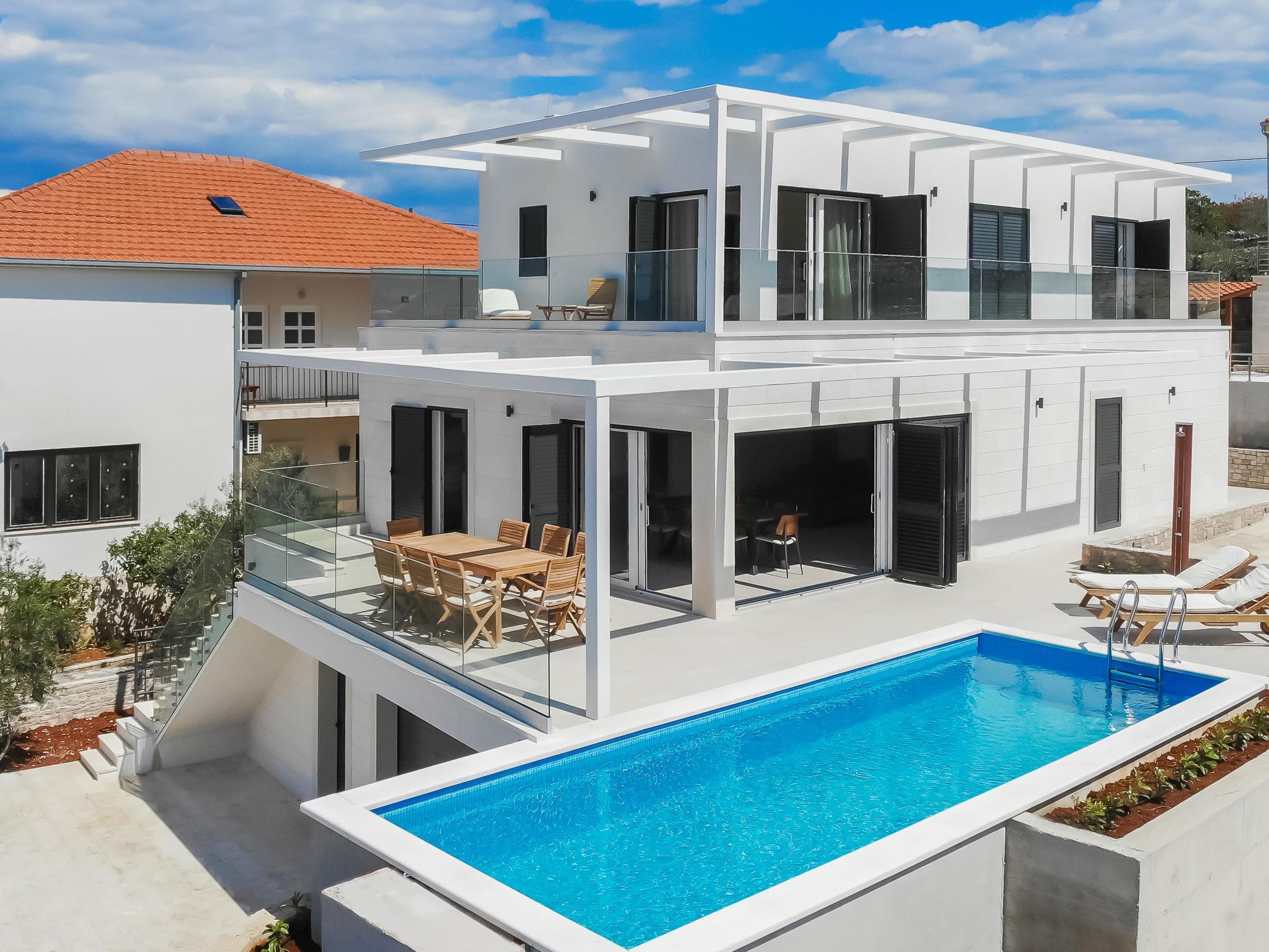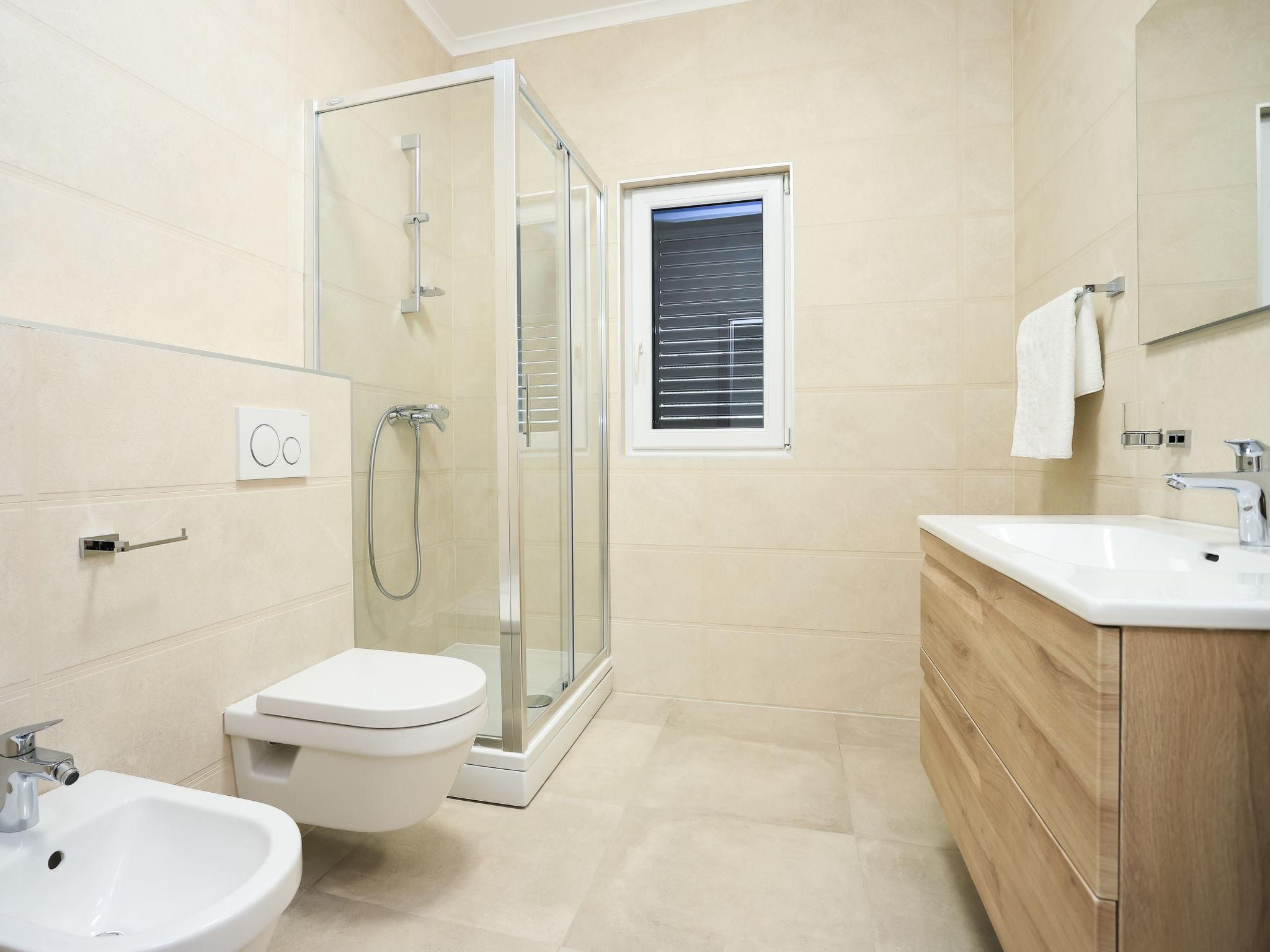 Single-family house "Jakša", 2 storeys, built in 2019. In a quiet, sunny, elevated position, 200 m from the sea, 200 m from the beach. Private: property 450 m2, swimming pool angular, heated (8 x 2 m, 20 m2, depth 150 cm, seasonal availability: 01.May. - 01.Oct.). Outdoor shower, terrace (60 m2), garden furniture. In the house: internet access, washing machine, tumble dryer. Available: bicycles (3). Parking (for 2 cars) at the house on the premises. Shop 5 km, restaurant 250 m, bus stop 550 m, pebble beach 500 m, rocky beach 200 m. Shop 850 m (15.06.-15.09.). Swimming pool heated (extra). Available: kayak (included in the price).