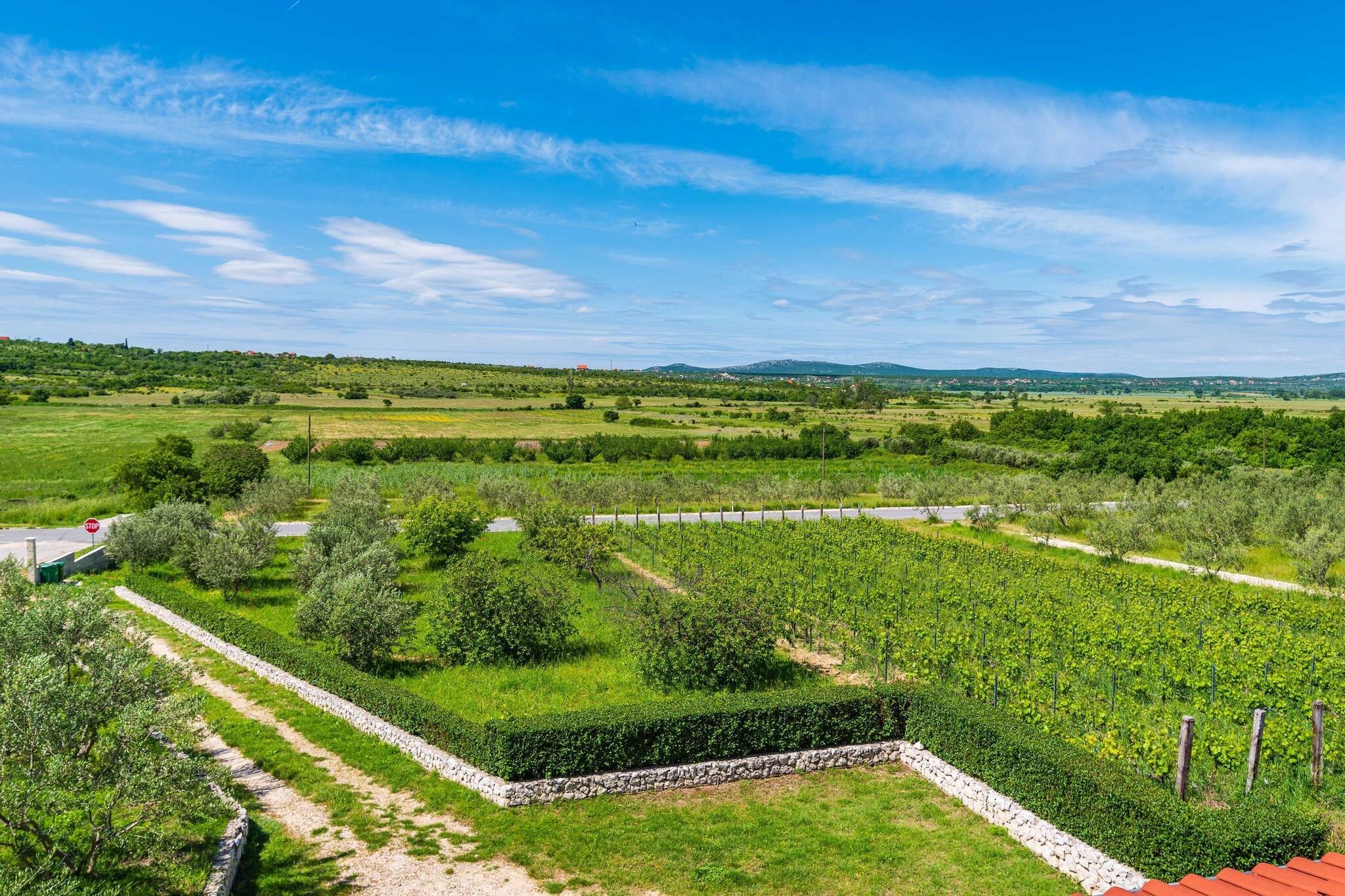 Dette smukke landlige feriehus ligger i et roligt område inde i landet nær Šibenik, kun 20 km fra den nærmeste strand og tæt på Krka Nationalpark. Omgivet af uberørt natur tilbyder det fuldstændig privatliv og afslappende ferie for familier eller grupper på op til 8 personer. På ejendommen er der en privat pool med hydromassage, en basketballbane og en legeplads for børn, hvilket skaber de perfekte betingelser for en fredelig ferie i naturen. Det nyrenoverede to-etagers hus har tre soveværelser, to badeværelser, en lys stue med spiseplads og et fuldt udstyret åbent køkken. På første sal er der en rummelig altan med udsigt over det grønne landskab og de nærliggende bakker. Den store overdækkede terrasse er udstyret med en stengrill, en udendørs spiseplads og et opholdsområde med tv – perfekt til afslappende eftermiddage og familiemåltider. Gæsterne kan nyde friske, økologiske produkter fra haven, leveret af de venlige værter, der ejer en nærliggende gård. Beliggenheden er ideel til at udforske Dalmatien. Krka Nationalpark, Vrana-søen og kystbyerne Vodice og Pirovac ligger inden for kort køreafstand. Byerne Zadar og Split ligger mindre end en times kørsel væk, og Šibenik kan nås på kun 30 minutter. Med sin kombination af komfort, natur og bekvemmelighed er dette feriehus det perfekte valg til en afslappende og autentisk ferie ved Middelhavet.