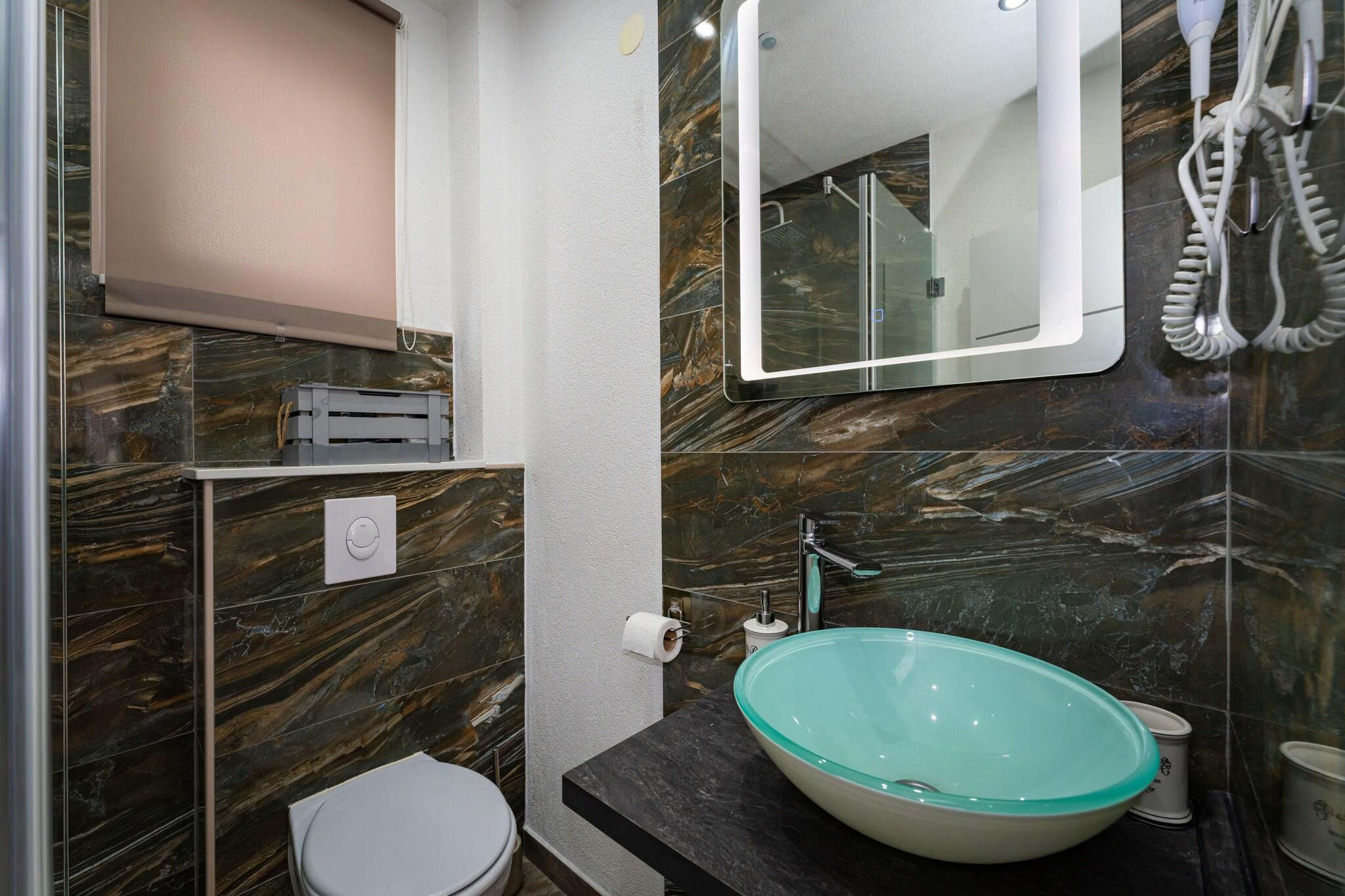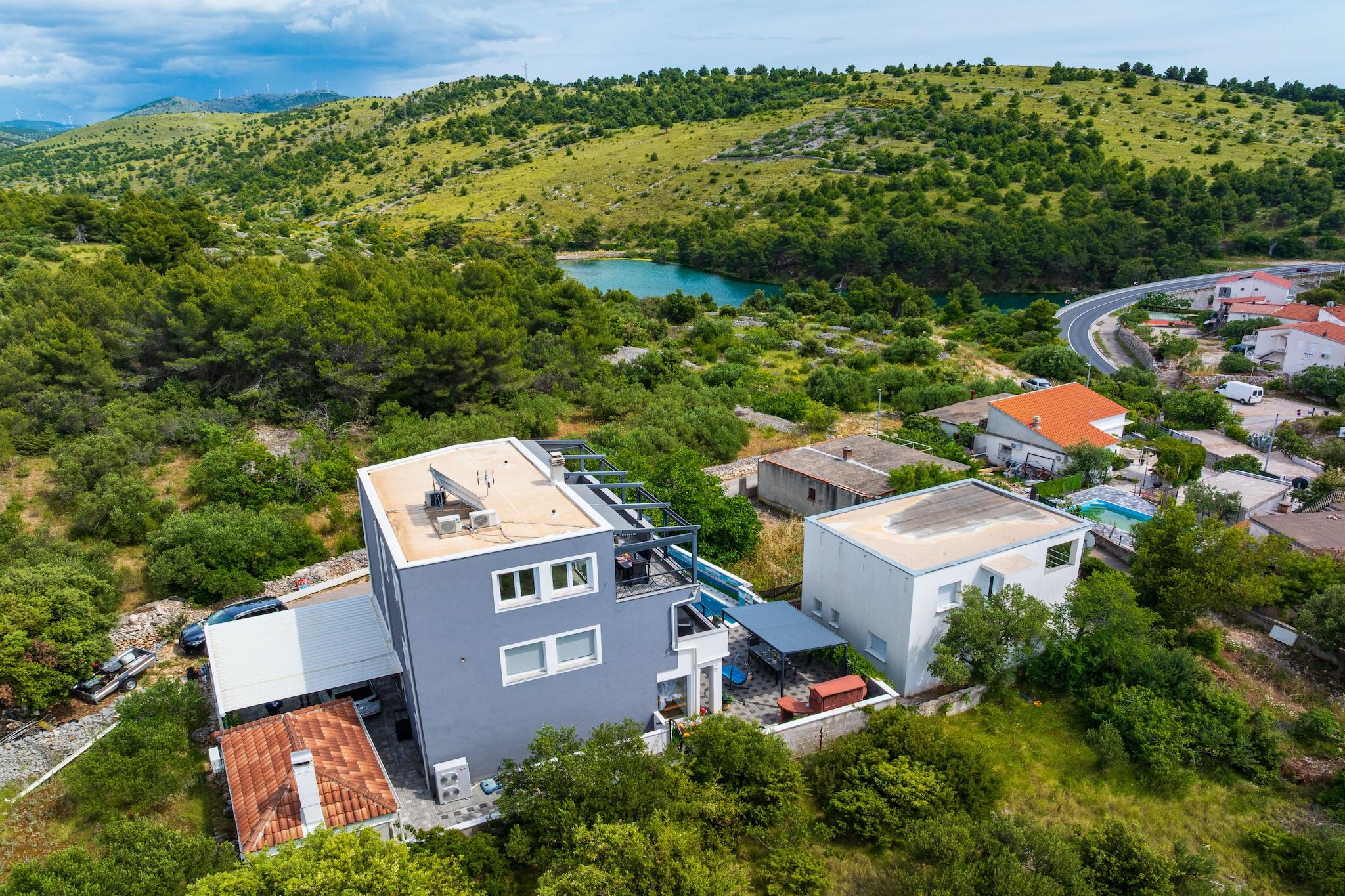 Denne moderne lejlighed med privat pool ligger i den rolige kystby Zaboric nær Sibenik, kun 350 meter fra den nærmeste stenstrand. Omgivet af en fredelig atmosfære er det det perfekte sted for par eller små familier, der søger afslapning væk fra sommerens folkemængder. Lejligheden ligger i stueetagen og har et komfortabelt soveværelse, et moderne badeværelse, et fuldt udstyret åbent køkken og en lys stue med spiseplads og direkte adgang til en privat terrasse. Udenfor kan gæsterne nyde den rummelige, indhegnede have med privat pool, liggestole og en stor overdækket terrasse, der er indrettet til udendørs spisning. Der er også grillfaciliteter og privat parkering til to biler samt hurtigt WiFi, der sikrer et behageligt ophold. En kort gåtur derfra finder du en købmand, en café og en lokal restaurant, der serverer traditionelle dalmatiske retter. Kun 11 km adskiller ejendommen fra den historiske by Šibenik, hvor du kan udforske charmerende stengader, strandpromenader og kulturarv. Naturelskere vil helt sikkert nyde et besøg i Krka Nationalpark, der ligger kun 20 kilometer fra ejendommen og er kendt for sine vandfald og maleriske vandrestier. Både Split og Zadar ligger inden for en times kørsel, hvilket gør lejligheden til et praktisk udgangspunkt for at udforske den dalmatiske kyst. Dette veludstyrede feriehus kombinerer komfort, privatliv og en fantastisk beliggenhed tæt på havet – perfekt til en afslappende ferie ved Middelhavet.