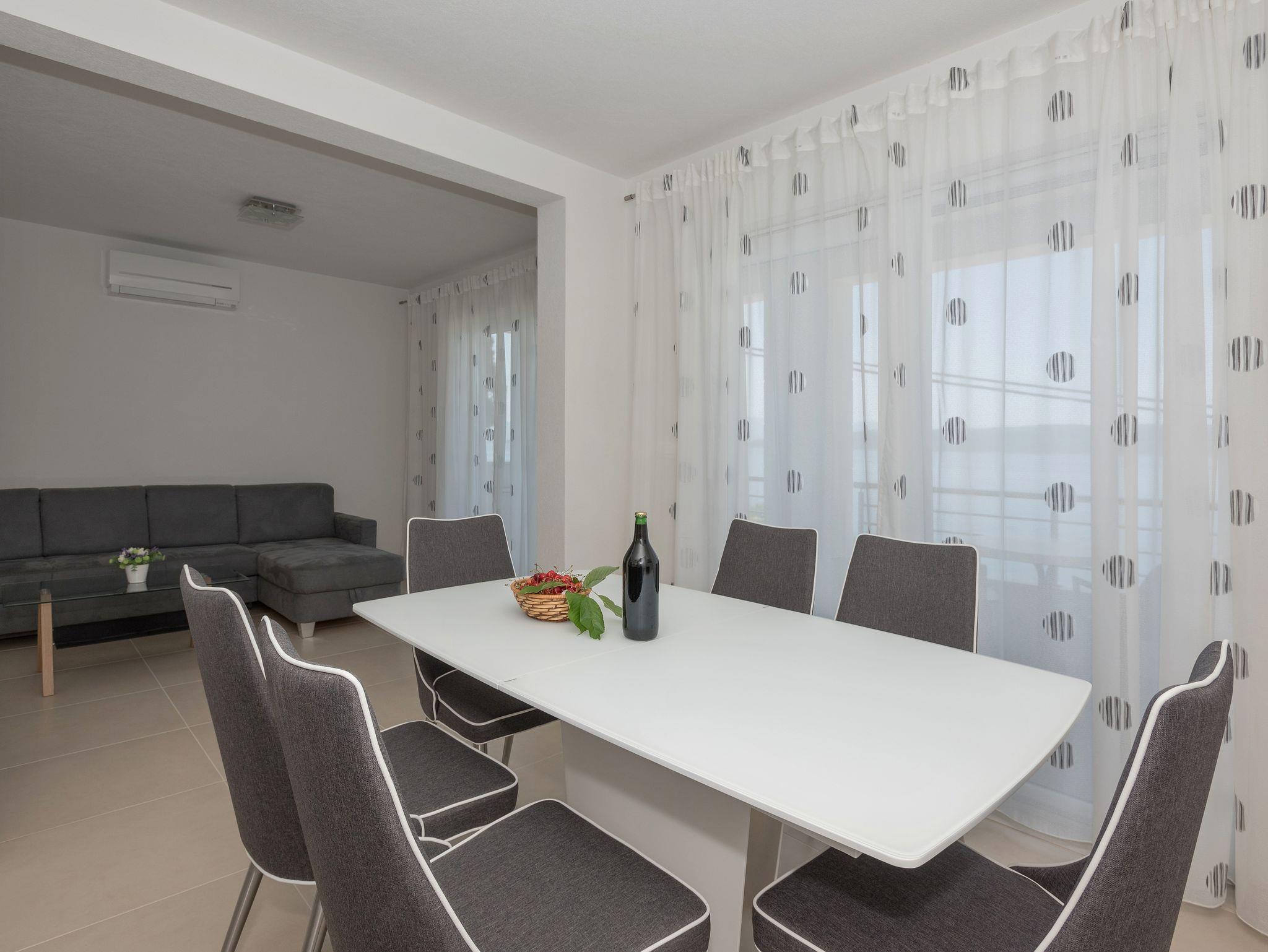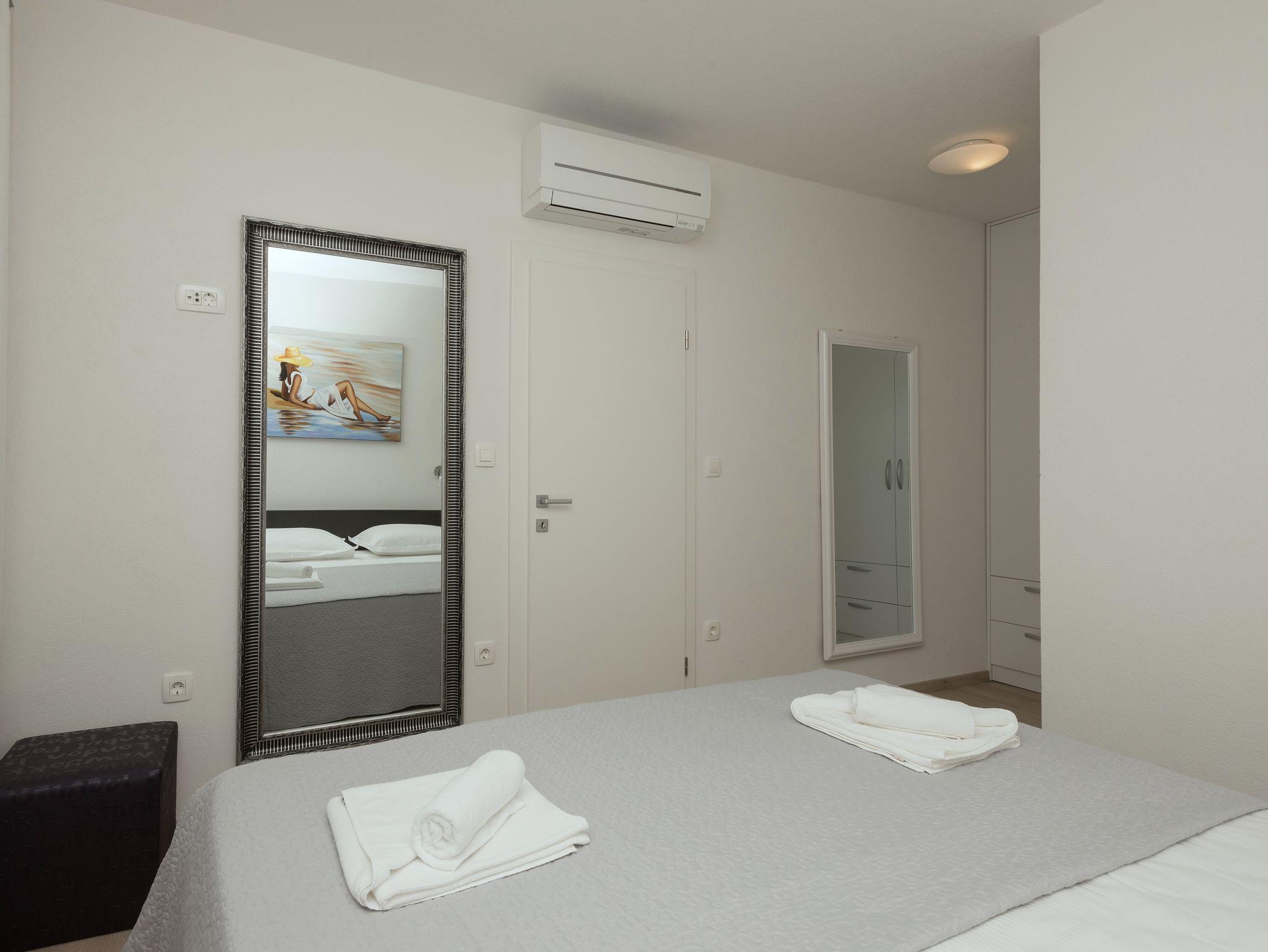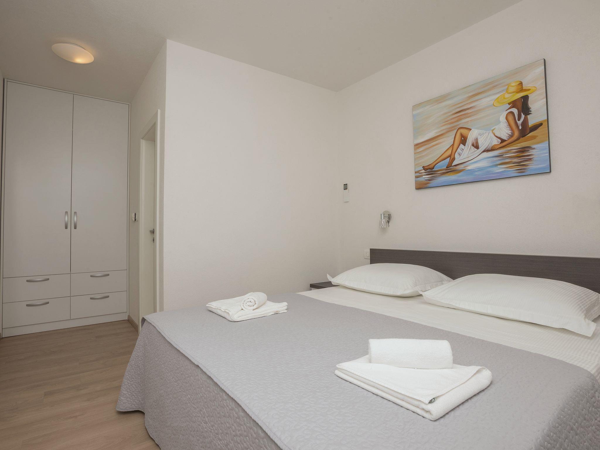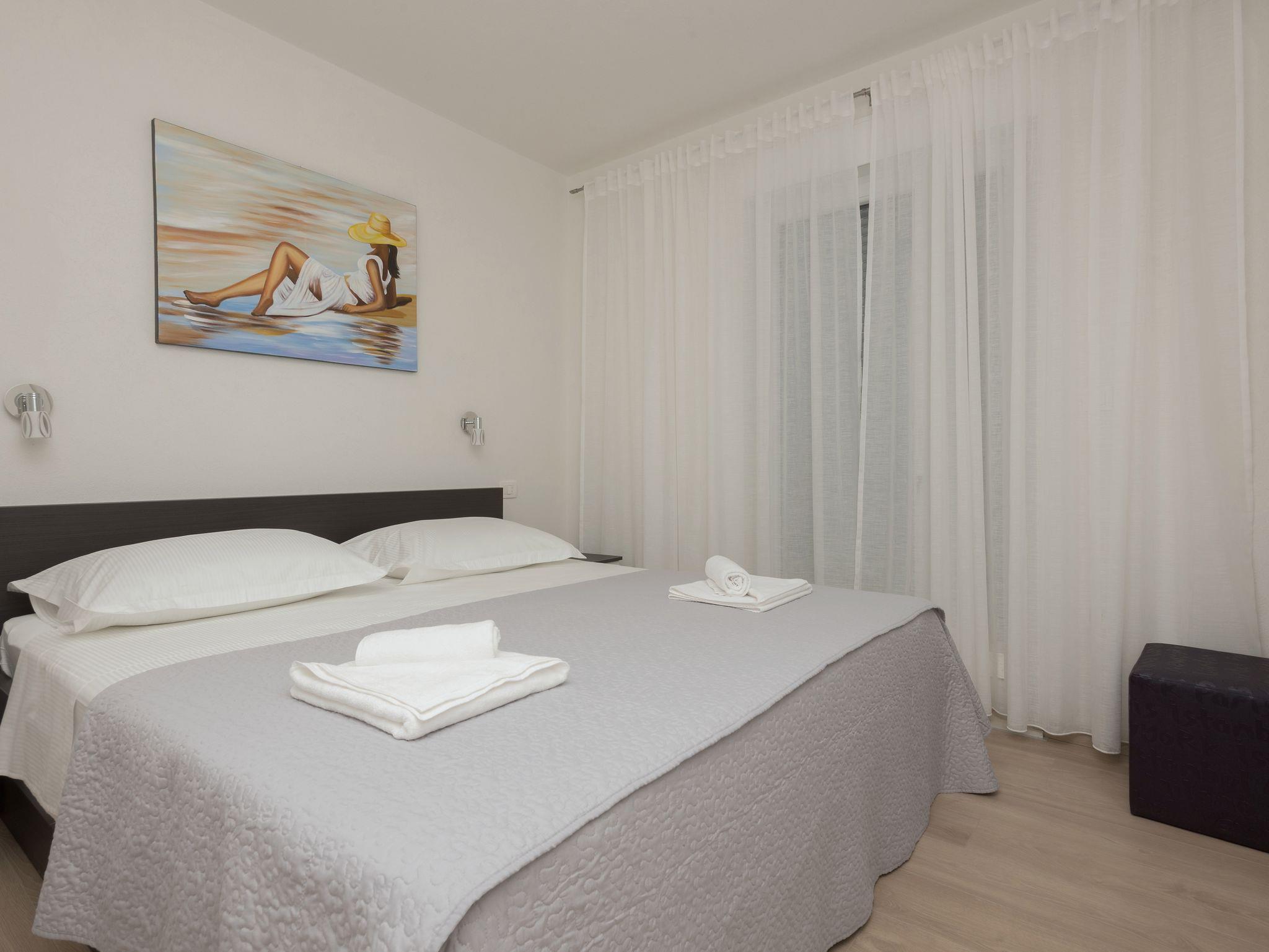 Ferienwohnung bietet Platz für 5 Gäste. Die Betten sind in Schlafzimmern, die es 3 gibt, innerhalb einer Gesamtfläche von 90m2, angeordnet. Die Gäste haben einen eigenen Balkon zur Verfügung, auf der sie in warmen Sommernächten genießen können. Das Apartment bietet Meerblick. Es ist erlaubt, Speisen auf dem Gemeinschafts-Grill vorzubereiten. IM PREIS INBEGRIFFEN: Kurtaxe, Endreinigung, Klimatisierung, Parkplatz, Internet, Bügeleisen, Bügelbrett, Föhn. Die Verfügbarkeit zusätzlicher Dienstleistungen in Ihrem reservierten Termin und die Preise derselben (falls nicht aufgeführt) müssen im Voraus überprüft werden. Zusätzliche Dienstleistungen die in der Zahlungsaufforderung nicht aufgeführt sind werden direkt beim Vermieter bezahlt, angenommen der Gast nutzt auch diese.