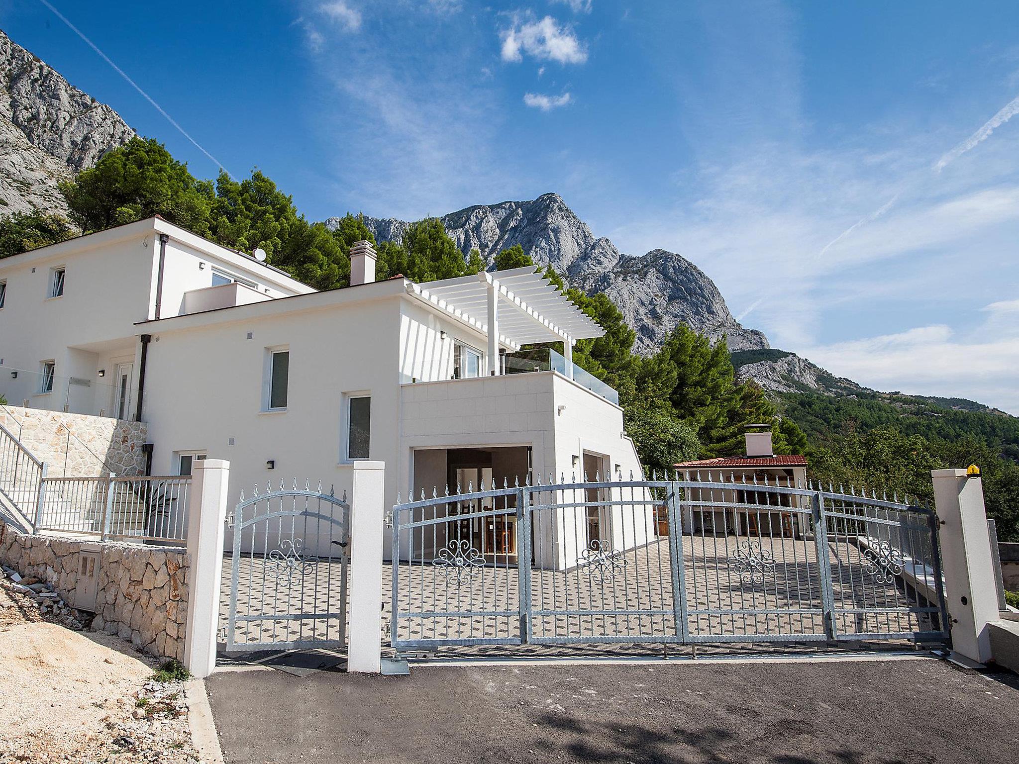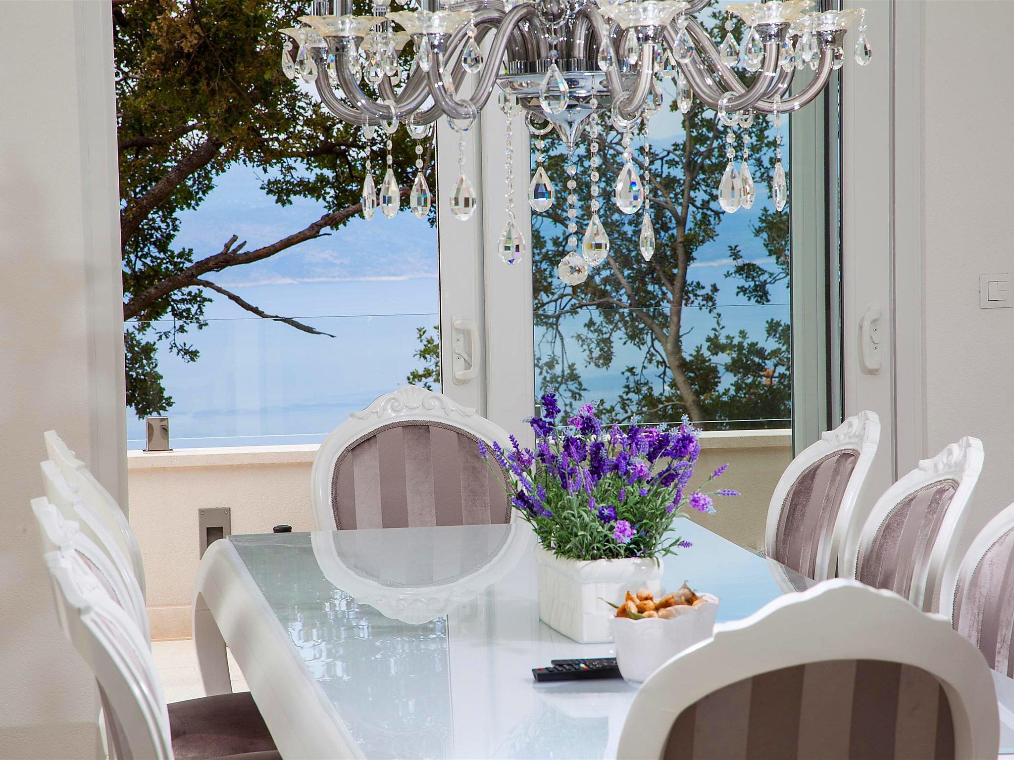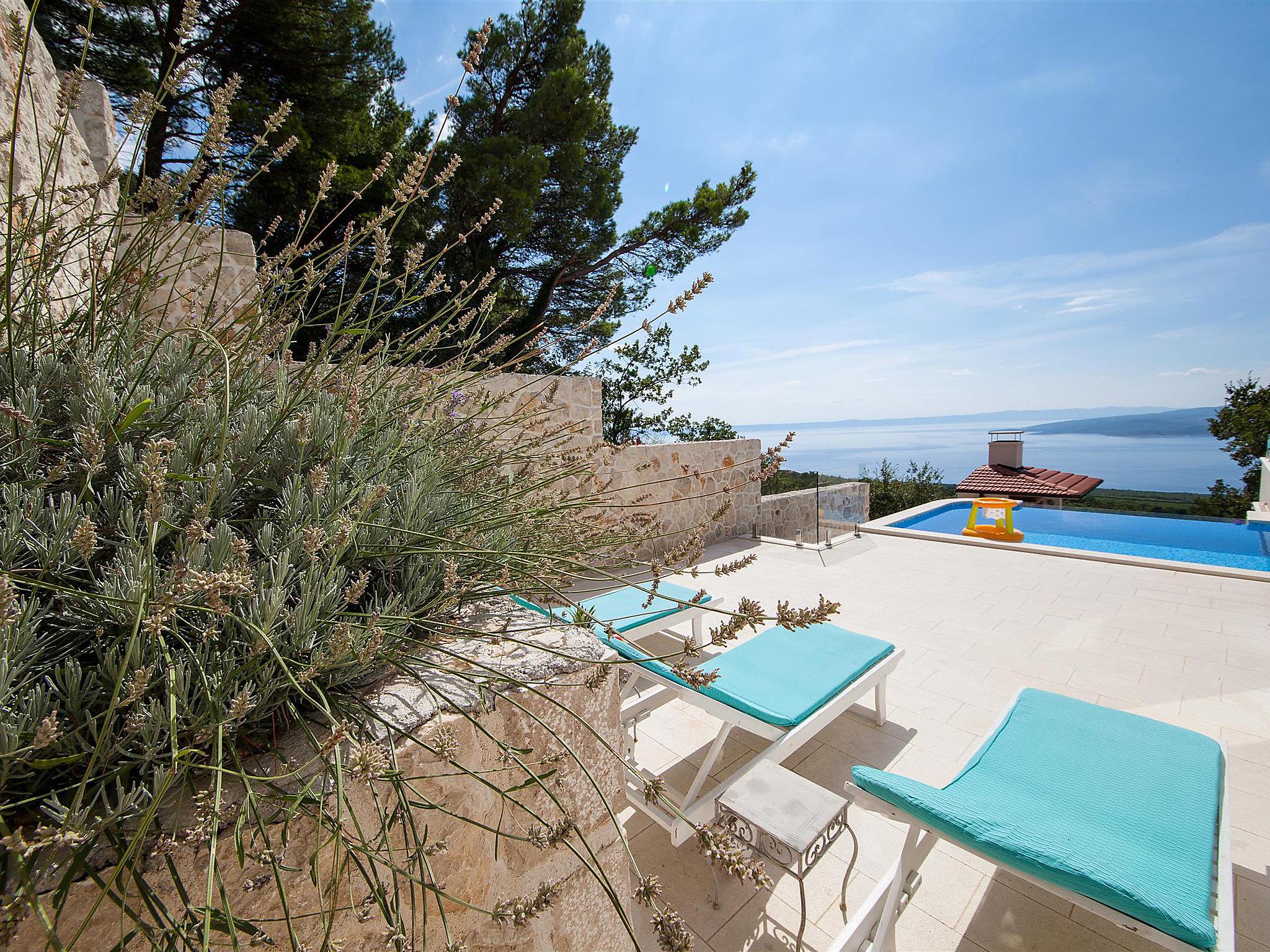 Villa "Prestige", 3 storeys. Above Baško Polje, in the hamlet Bast 3.5 km from the centre of Baško Polje, in a quiet, sunny, elevated position, 3 km from the sea, 3 km from the beach. Private: property 800 m2 (fenced), swimming pool angular, heated (6 x 4 m, depth 150 cm, seasonal availability: 01.Jan. - 31.Dec.). Outdoor shower, terrace (80 m2), garden furniture, barbecue, children's playground (slide, swing). In the house: internet access, sauna, fitness room, massage (extra). Washing machine. Cook on request (extra). Parking at the house on the premises. Shop 3 km, restaurant 100 m, bus stop 2.7 km, pebble beach 3 km. Walking paths from the house 40 m. Swimming pool with hydromassage. Pool heating charged extra.