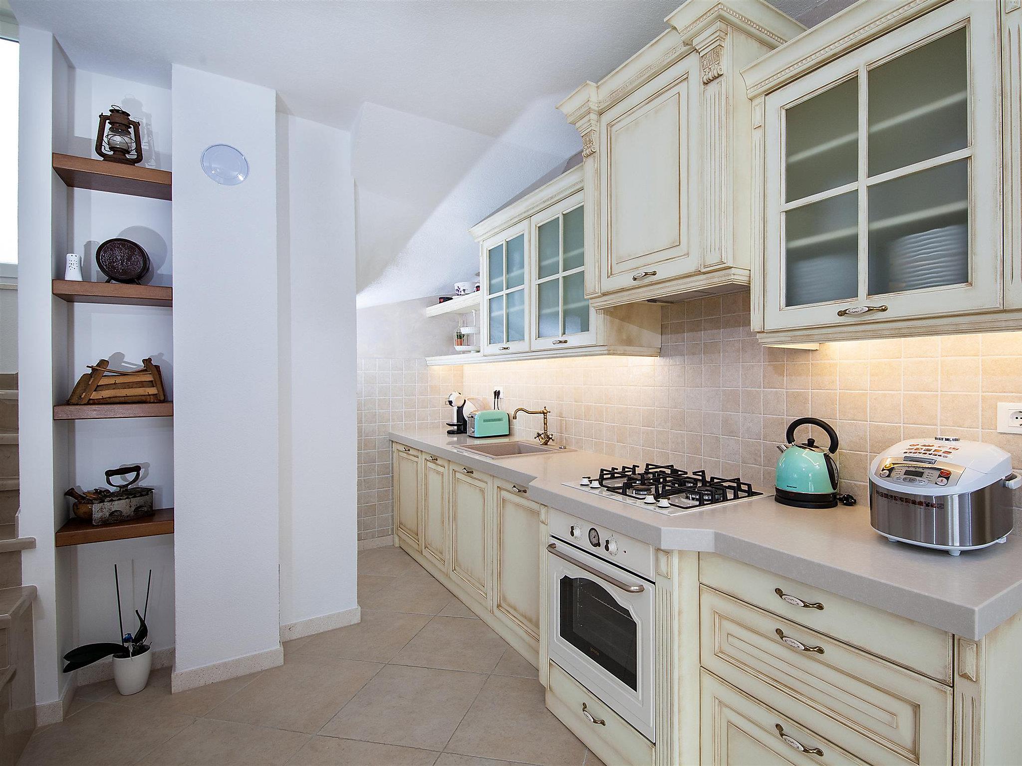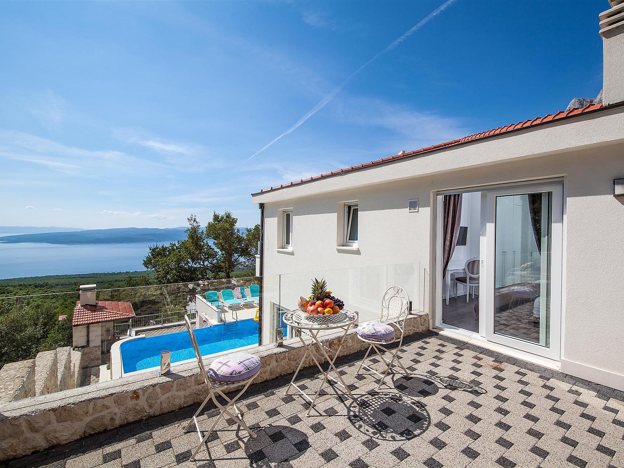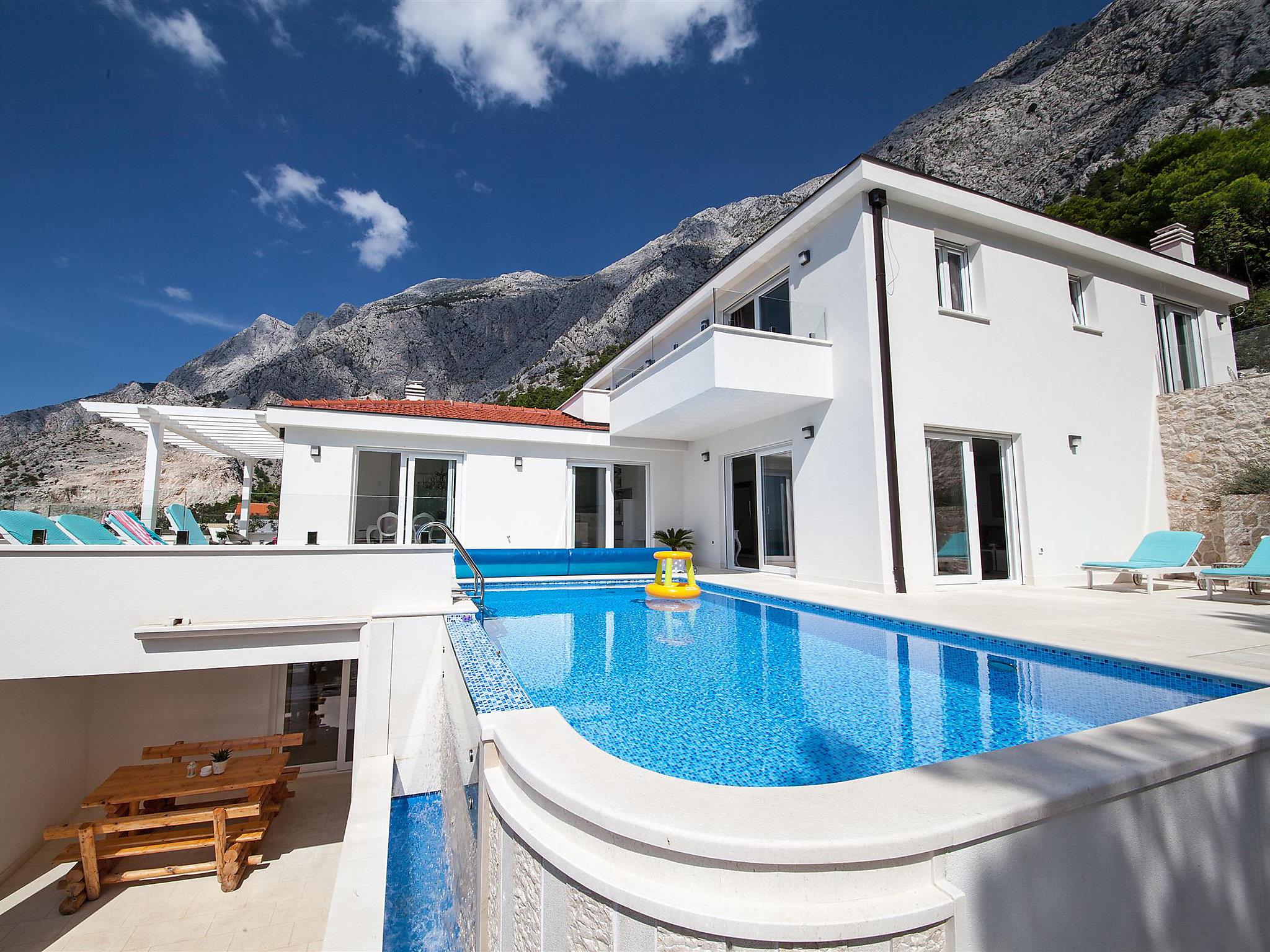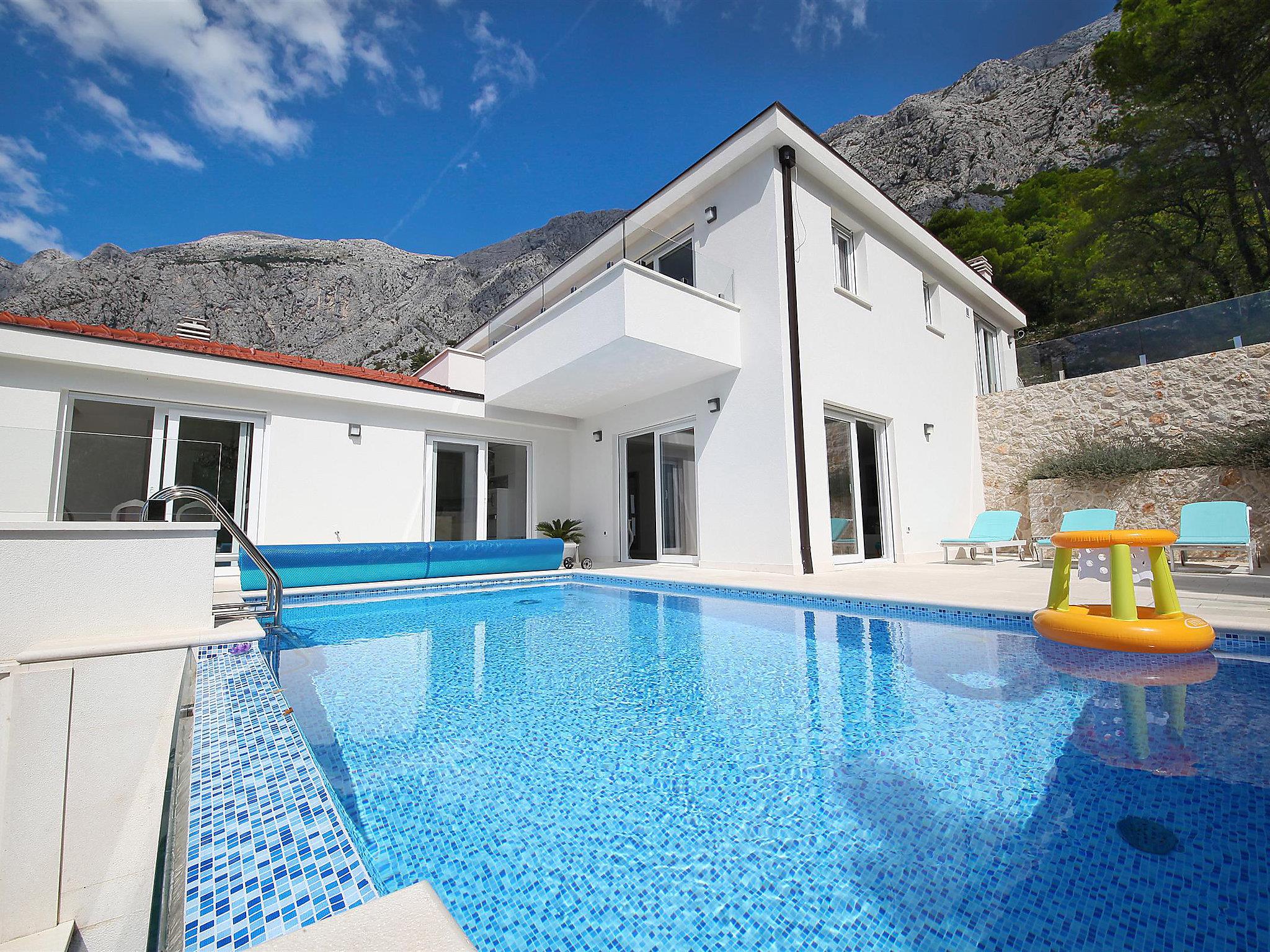 Villa "Prestige", 3 storeys. Above Baško Polje, in the hamlet Bast 3.5 km from the centre of Baško Polje, in a quiet, sunny, elevated position, 3 km from the sea, 3 km from the beach. Private: property 800 m2 (fenced), swimming pool angular, heated (6 x 4 m, depth 150 cm, seasonal availability: 01.Jan. - 31.Dec.). Outdoor shower, terrace (80 m2), garden furniture, barbecue, children's playground (slide, swing). In the house: internet access, sauna, fitness room, massage (extra). Washing machine. Cook on request (extra). Parking at the house on the premises. Shop 3 km, restaurant 100 m, bus stop 2.7 km, pebble beach 3 km. Walking paths from the house 40 m. Swimming pool with hydromassage. Pool heating charged extra.