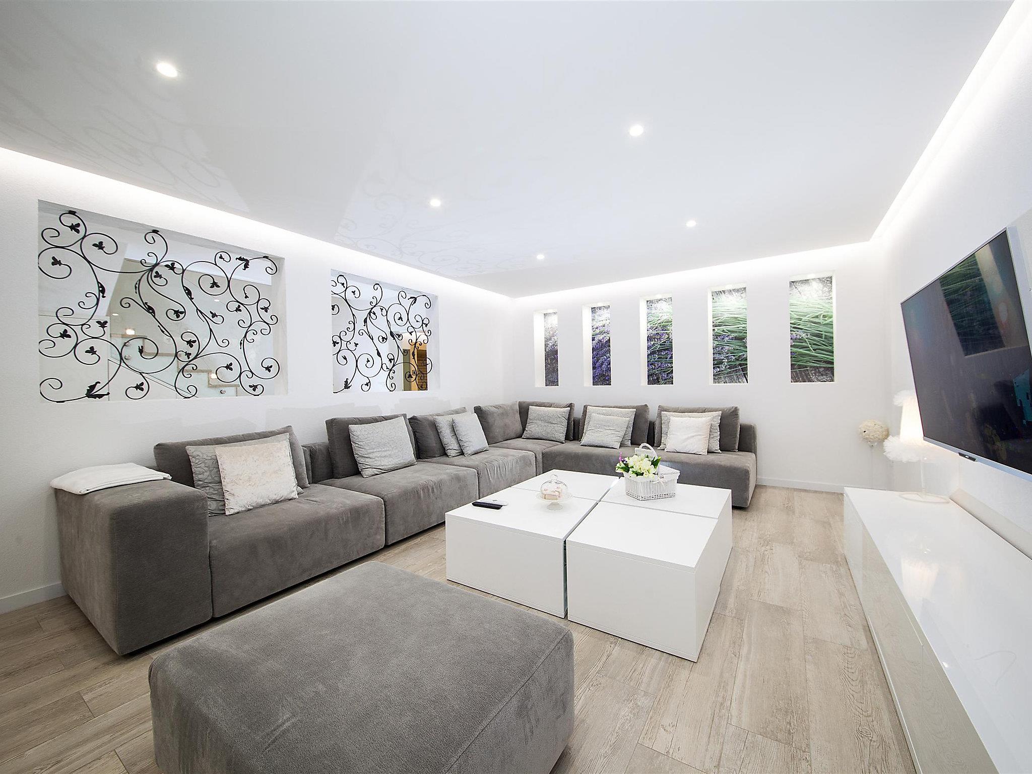 6-room villa 450 m2 on 3 levels, south facing position. Comfortable and tasteful furnishings: living room 40 m2 with satellite TV (flat screen), air conditioning. Exit to the terrace. Dining room with satellite TV (flat screen). Exit to the terrace. Open kitchen (oven, dishwasher, 4 ceramic glass hob hotplates, microwave, freezer). Sep. WC. On the lower ground floor: 1 room with 1 french bed (180 cm, length 200 cm), shower/WC and satellite TV (flat screen), air conditioning. Dining room. Exit to the terrace. Kitchen (4 hot plates, oven, dishwasher). Sep. WC. Upper floor: 1 room with 1 french bed (180 cm, length 200 cm), shower/WC and satellite TV (flat screen), air conditioning. Exit to the balcony. 2 rooms, each room with 1 french bed (180 cm, length 200 cm), shower/WC and satellite TV (flat screen), air conditioning. Exit to the terrace. 1 room with 1 french bed (180 cm, length 200 cm), bath/WC, hydro massage bath and satellite TV (flat screen), air conditioning. Exit to the balcony. Forced-air heating. 2 balconies 8 m2, terrace 80 m2 partly roofed, terrace 50 m2 partly roofed. Terrace furniture, deck chairs. Beautiful panoramic view of the sea. Facilities: safe, hair dryer. Internet (WiFi, free). Terrace 35 m2, terrace 25 m2.
