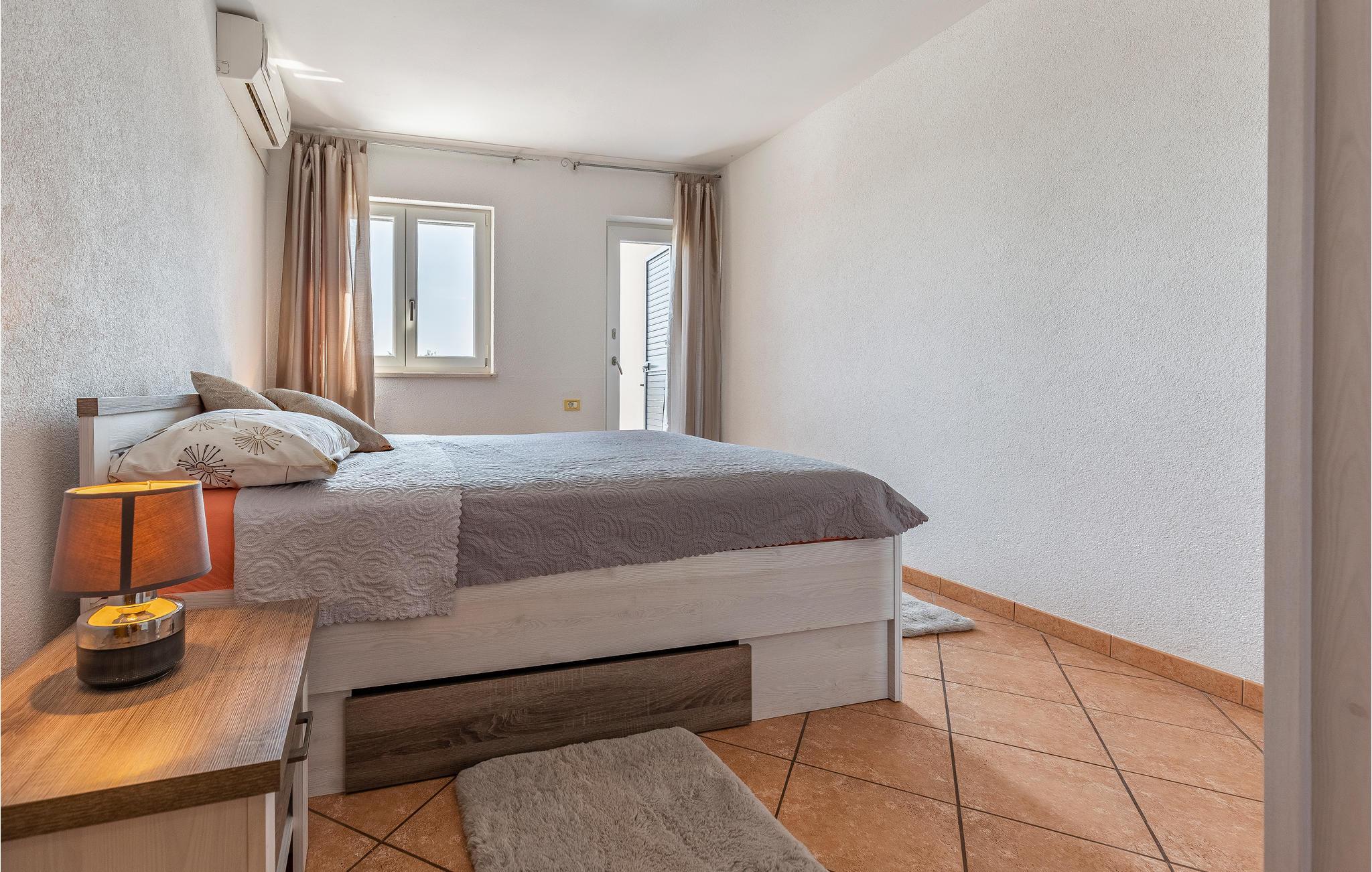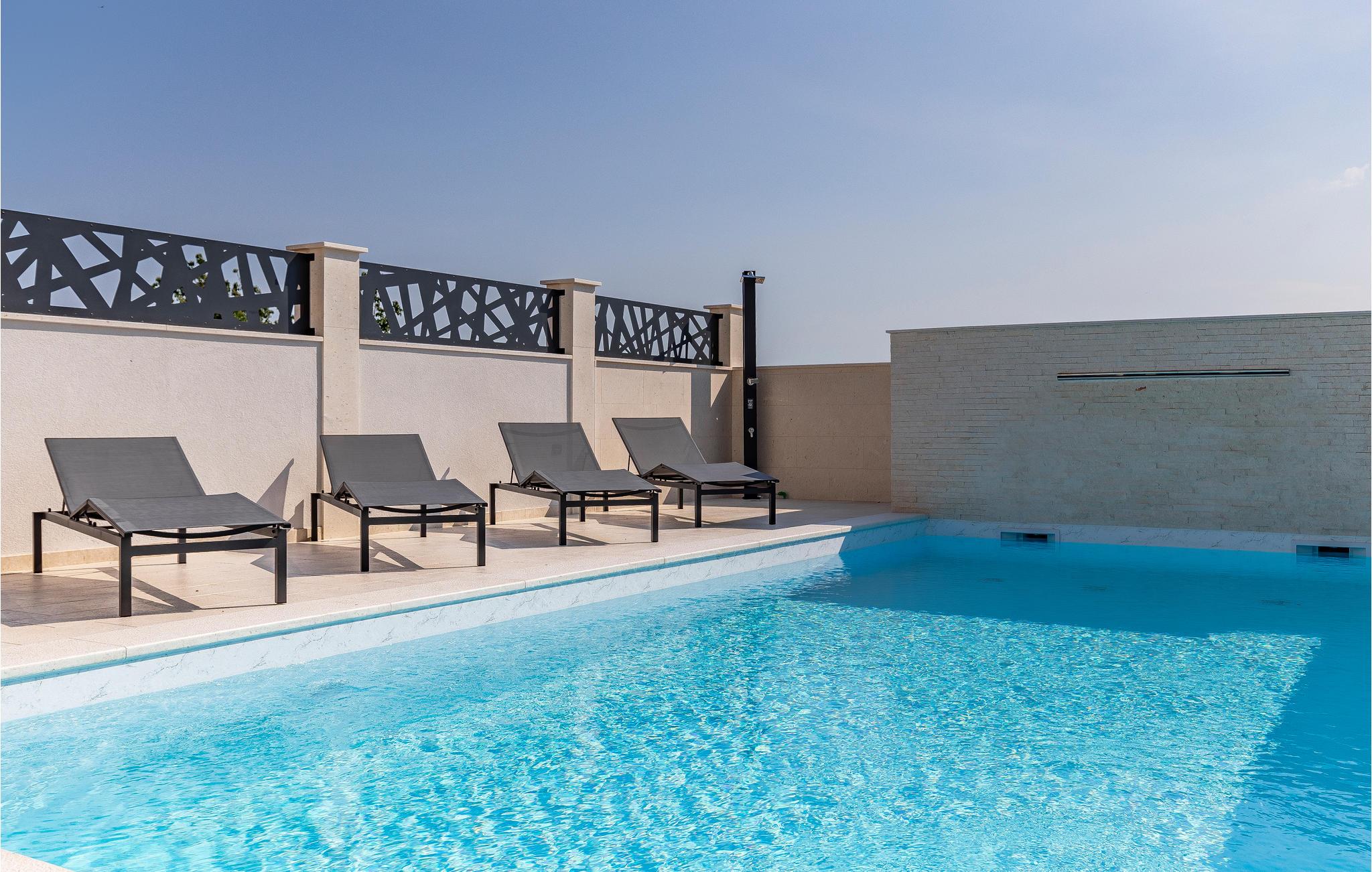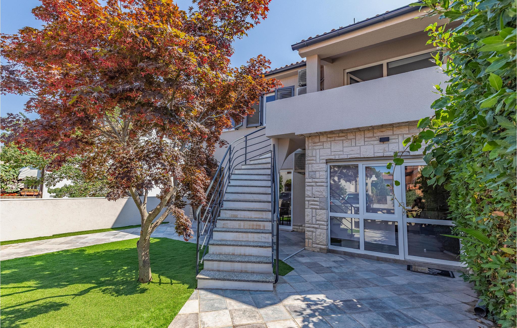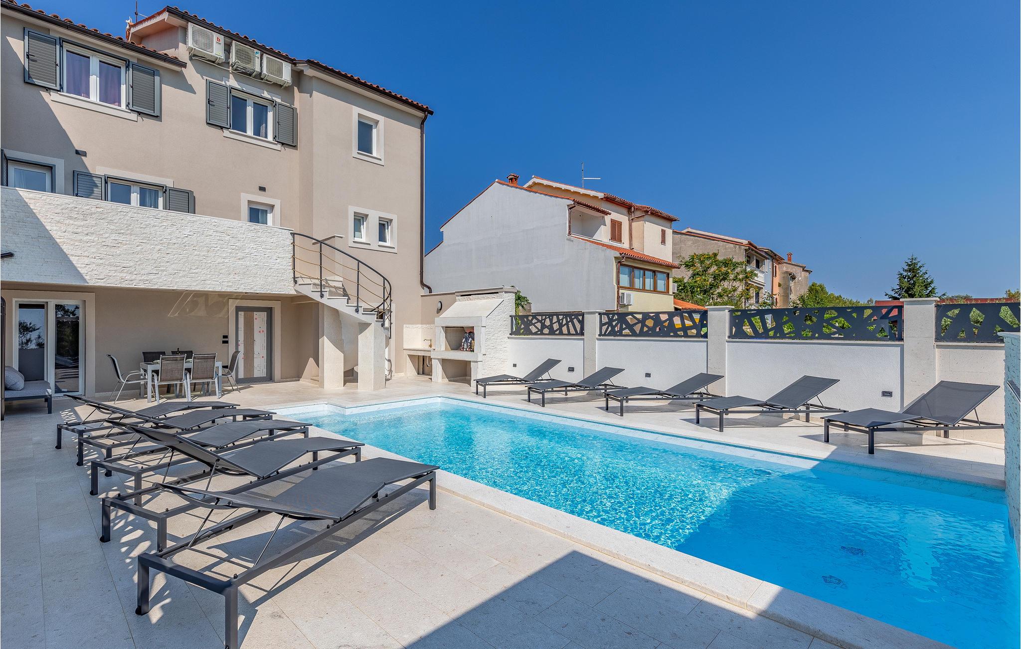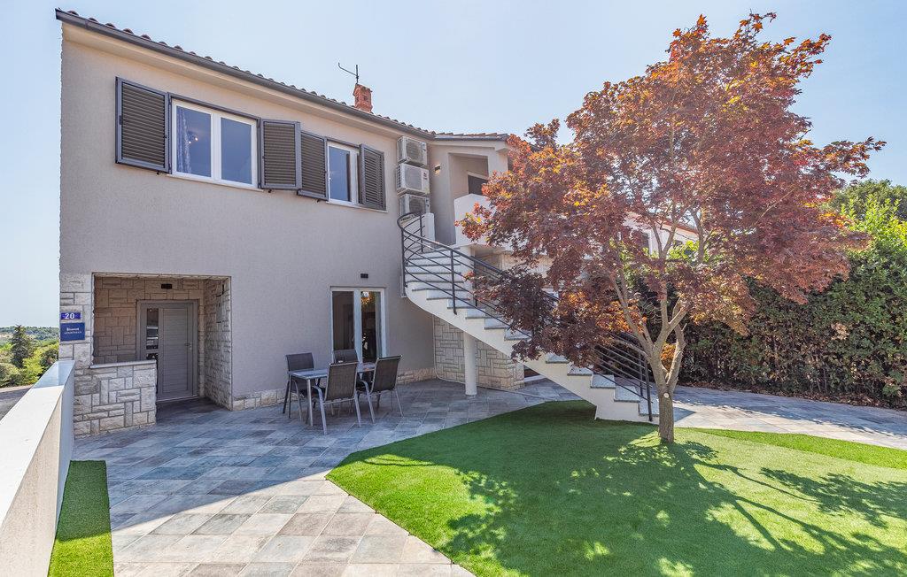 Det er beliggende i et roligt område tæt på butikker og restauranter med rige traditionelle, istriske specialiteter og fritidsfaciliteter. Den udendørs pool, der er oplyst i forskellige farver, med et vandfald og hydromassagestråler, indbyder til forfriskende dukkerter og afslapning i løbet af dagen og om aftenen. Grunden er indhegnet og velegnet til børn. Nyd at slappe af på liggestolene med forfriskende drinks, og tilbring hyggelige aftener med grillmad ved poolen.
