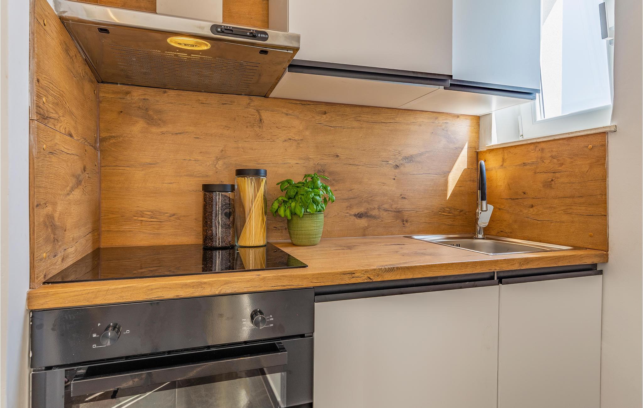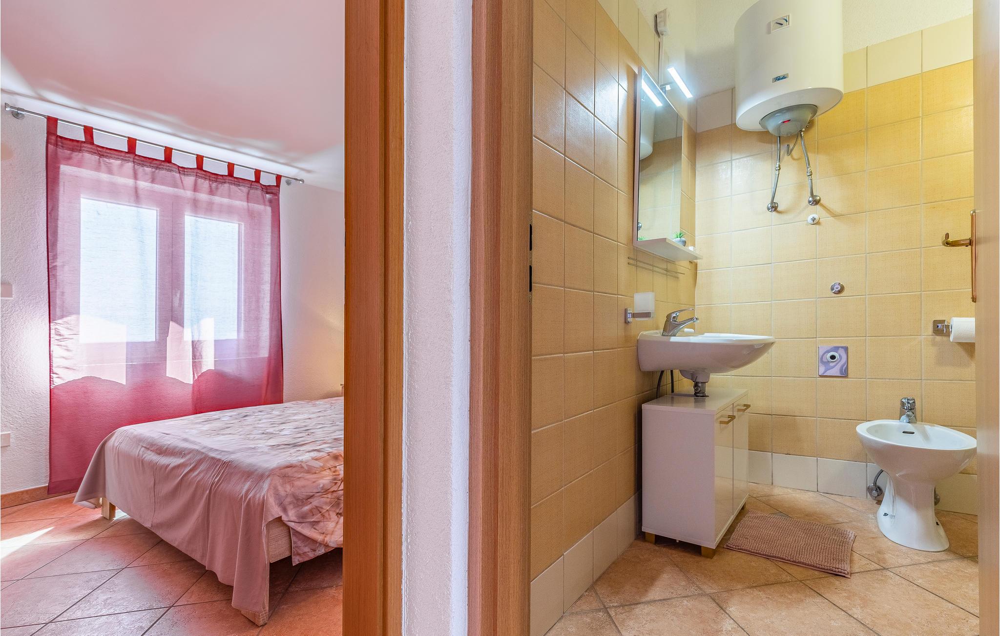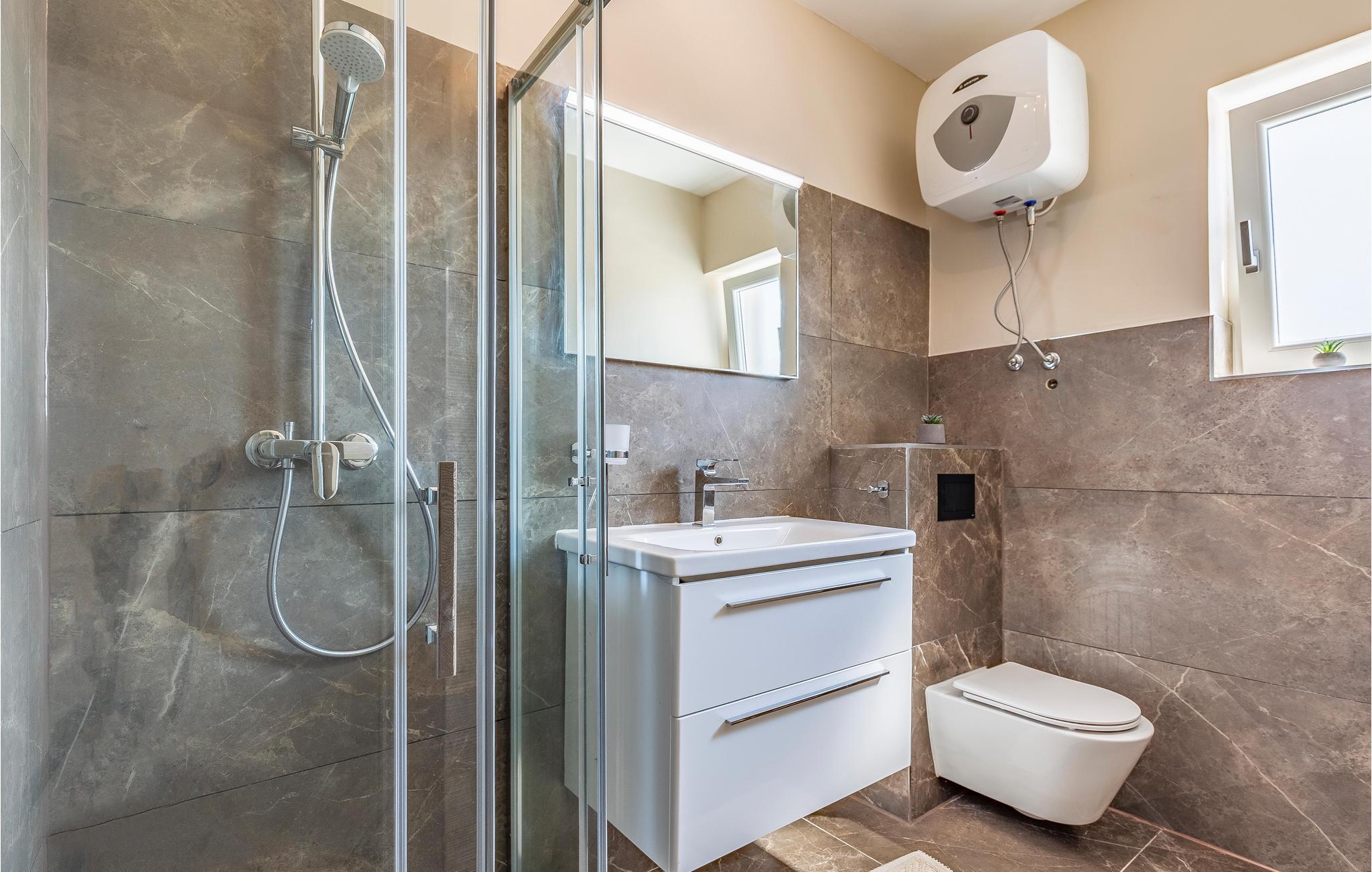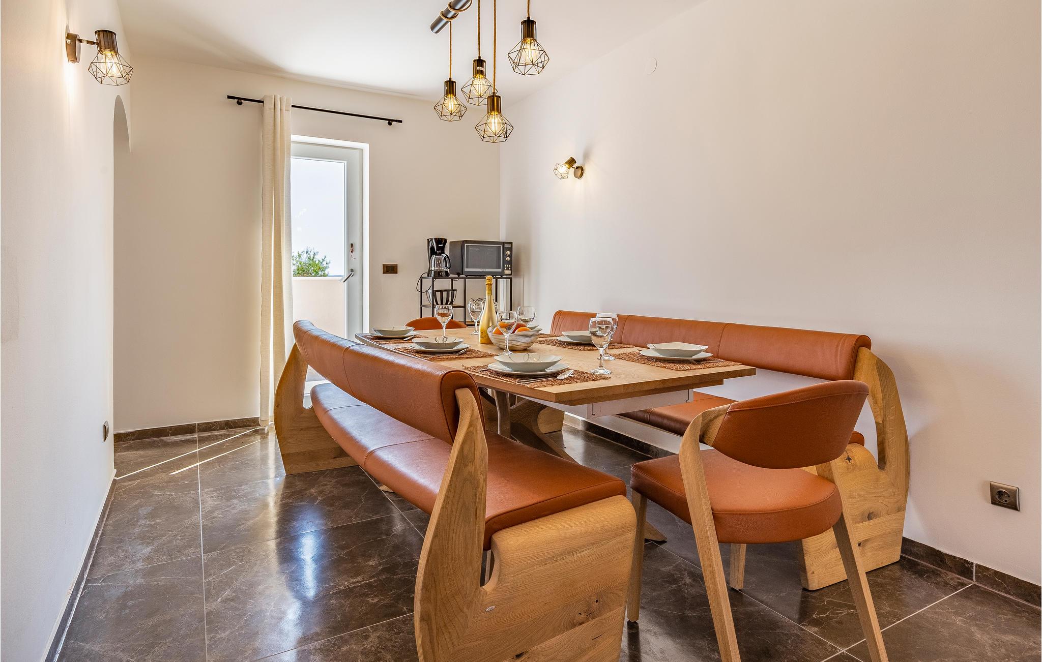 Det er beliggende i et roligt område tæt på butikker og restauranter med rige traditionelle, istriske specialiteter og fritidsfaciliteter. Den udendørs pool, der er oplyst i forskellige farver, med et vandfald og hydromassagestråler, indbyder til forfriskende dukkerter og afslapning i løbet af dagen og om aftenen. Grunden er indhegnet og velegnet til børn. Nyd at slappe af på liggestolene med forfriskende drinks, og tilbring hyggelige aftener med grillmad ved poolen.