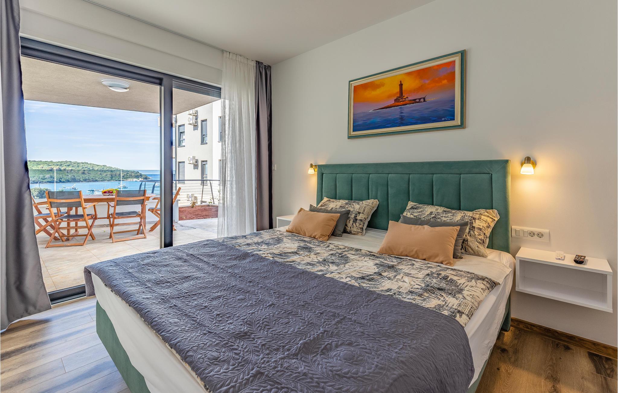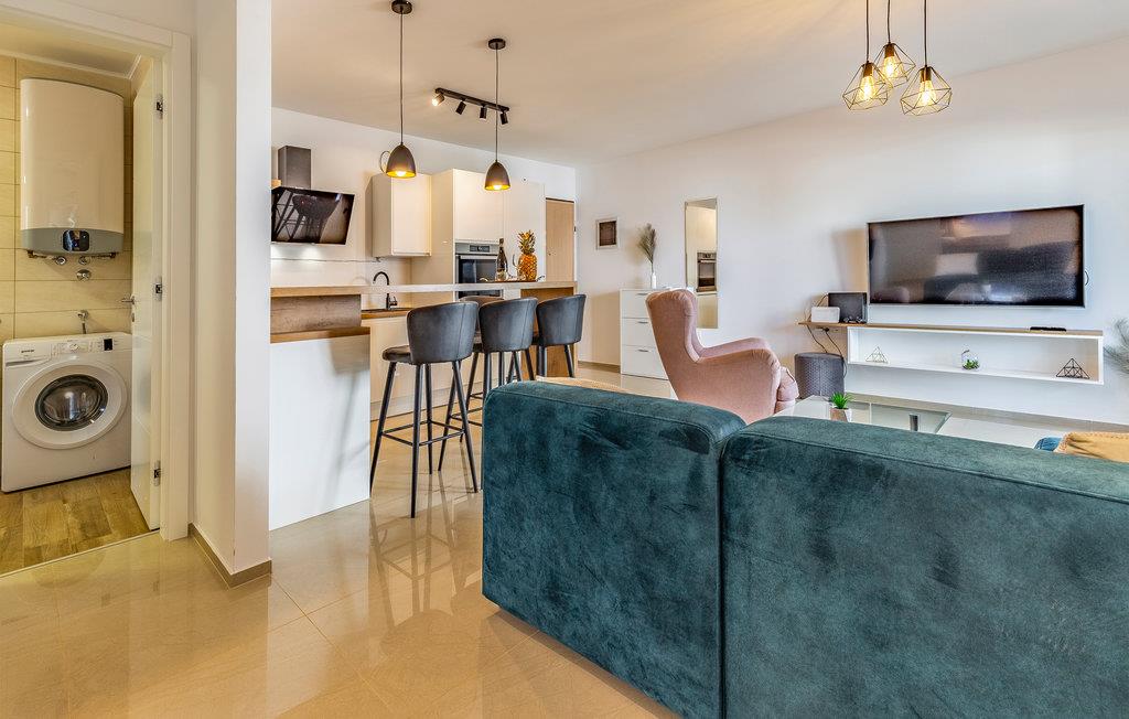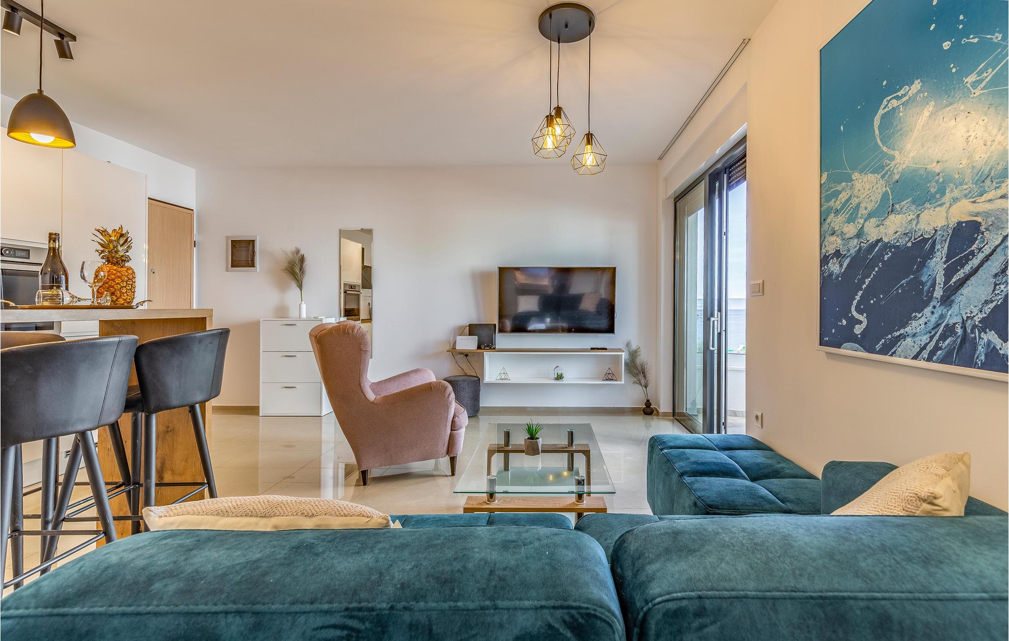 Denne lejlighed ligger i første række til havet og tilbyder en vidunderlig havudsigt fra terrassen. Hjertet i lejligheden er den lyse stue med åbent køkken og sofa, hvor I kan lave dejlig mad sammen og slappe af på sofaen. Der er to soveværelser til rådighed.