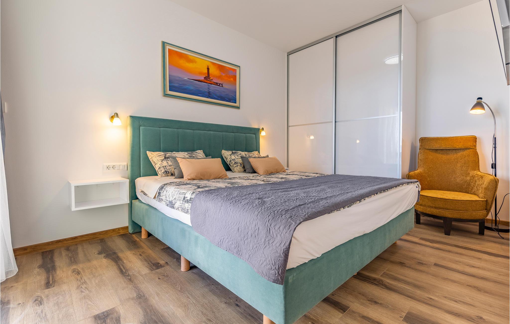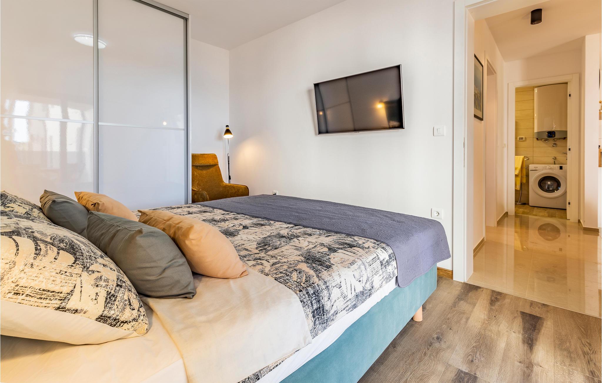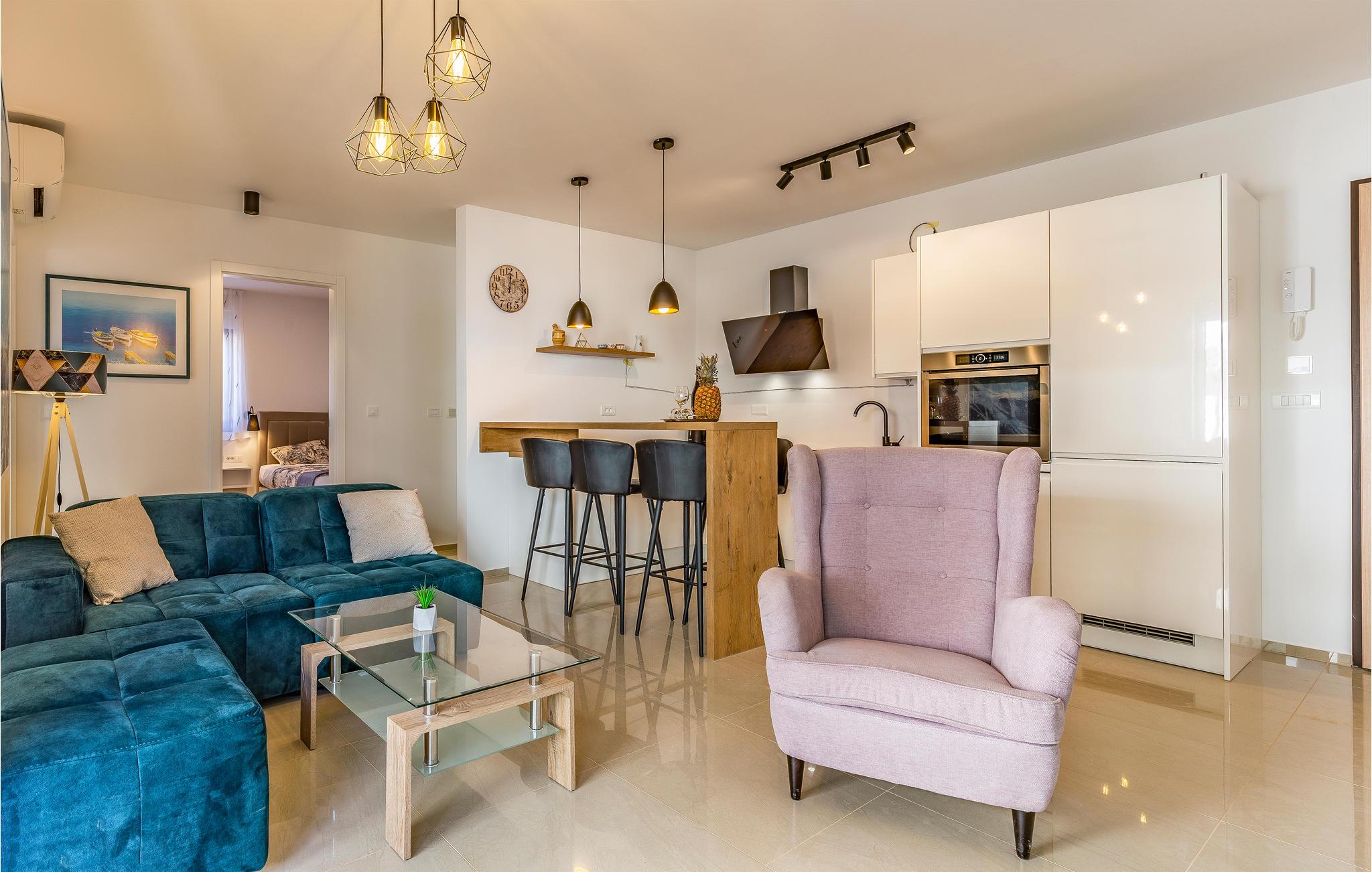 Denne lejlighed ligger i første række til havet og tilbyder en vidunderlig havudsigt fra terrassen. Hjertet i lejligheden er den lyse stue med åbent køkken og sofa, hvor I kan lave dejlig mad sammen og slappe af på sofaen. Der er to soveværelser til rådighed.