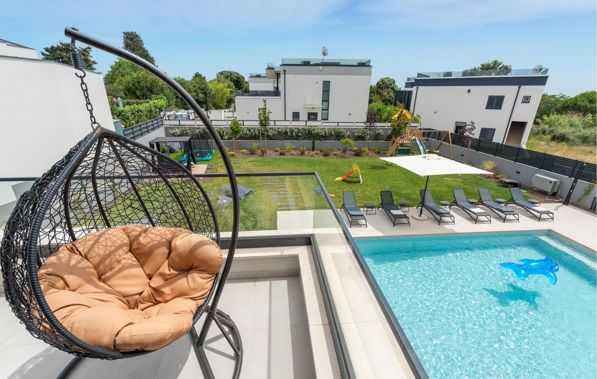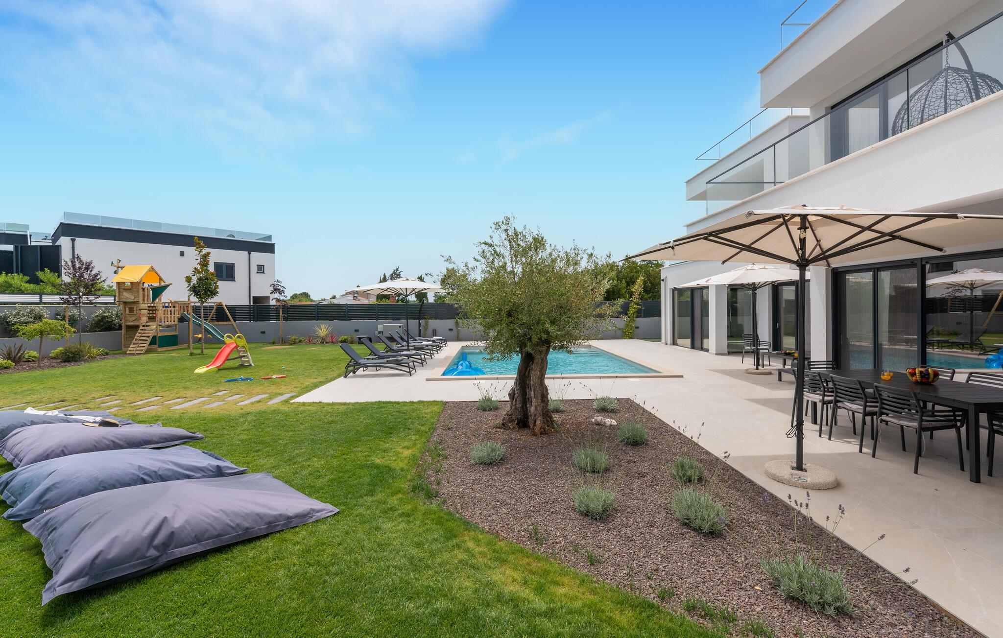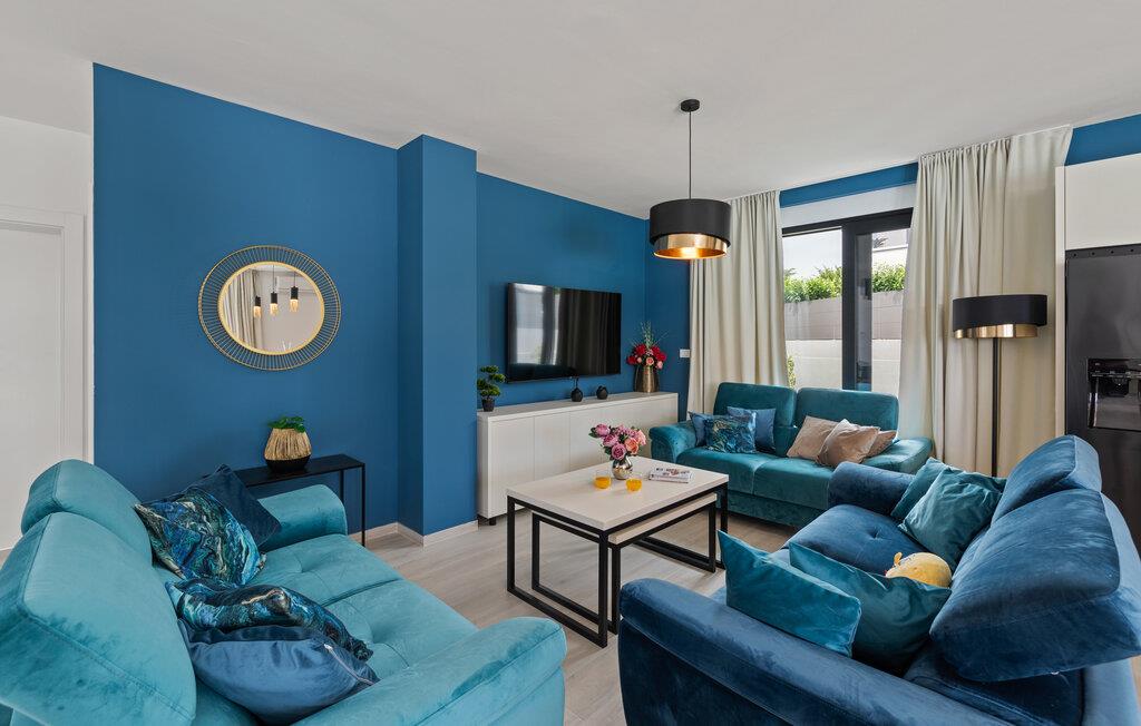 Huset byder jer velkommen i en fantastisk beliggenhed nær havet og skaber med moderne og stilfuldt møblerede værelser, der takker deres individuelle charme til slående farveaccenter, de ideelle rammer for en uforglemmelig ferie. Vågn op til udsigt over poolen gennem gulv-til-loft-vinduer. Uanset om I slapper af i komfortable sofaer og lænestole eller nyder måltider sammen ved det lange spisebord, har I plads til fælles aktiviteter og kan virkelig nyde jeres fritid.