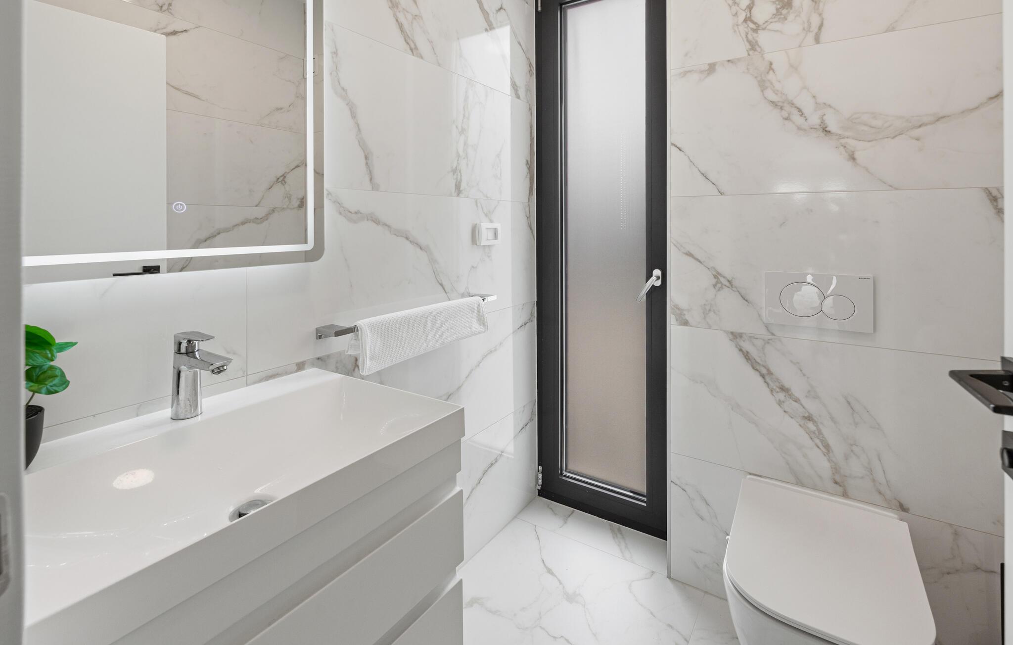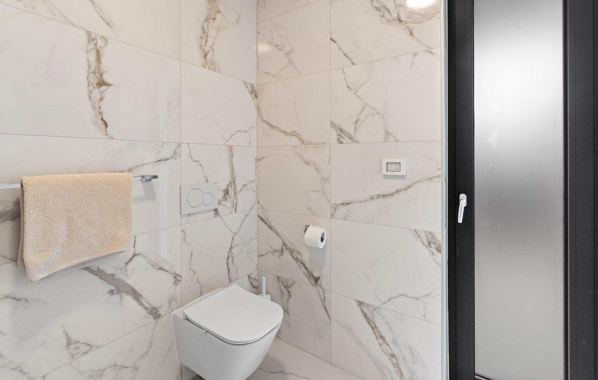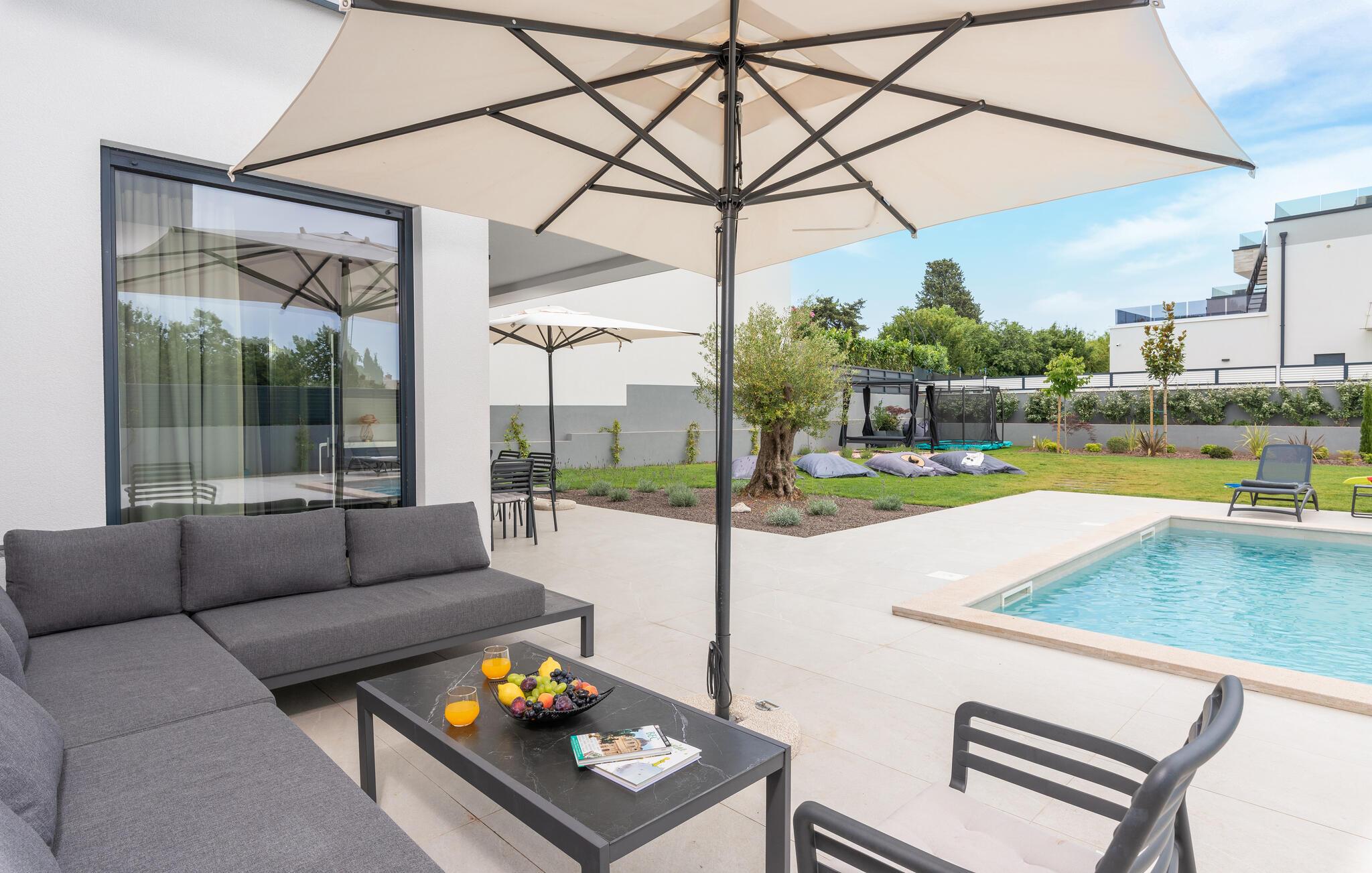 Huset byder jer velkommen i en fantastisk beliggenhed nær havet og skaber med moderne og stilfuldt møblerede værelser, der takker deres individuelle charme til slående farveaccenter, de ideelle rammer for en uforglemmelig ferie. Vågn op til udsigt over poolen gennem gulv-til-loft-vinduer. Uanset om I slapper af i komfortable sofaer og lænestole eller nyder måltider sammen ved det lange spisebord, har I plads til fælles aktiviteter og kan virkelig nyde jeres fritid.