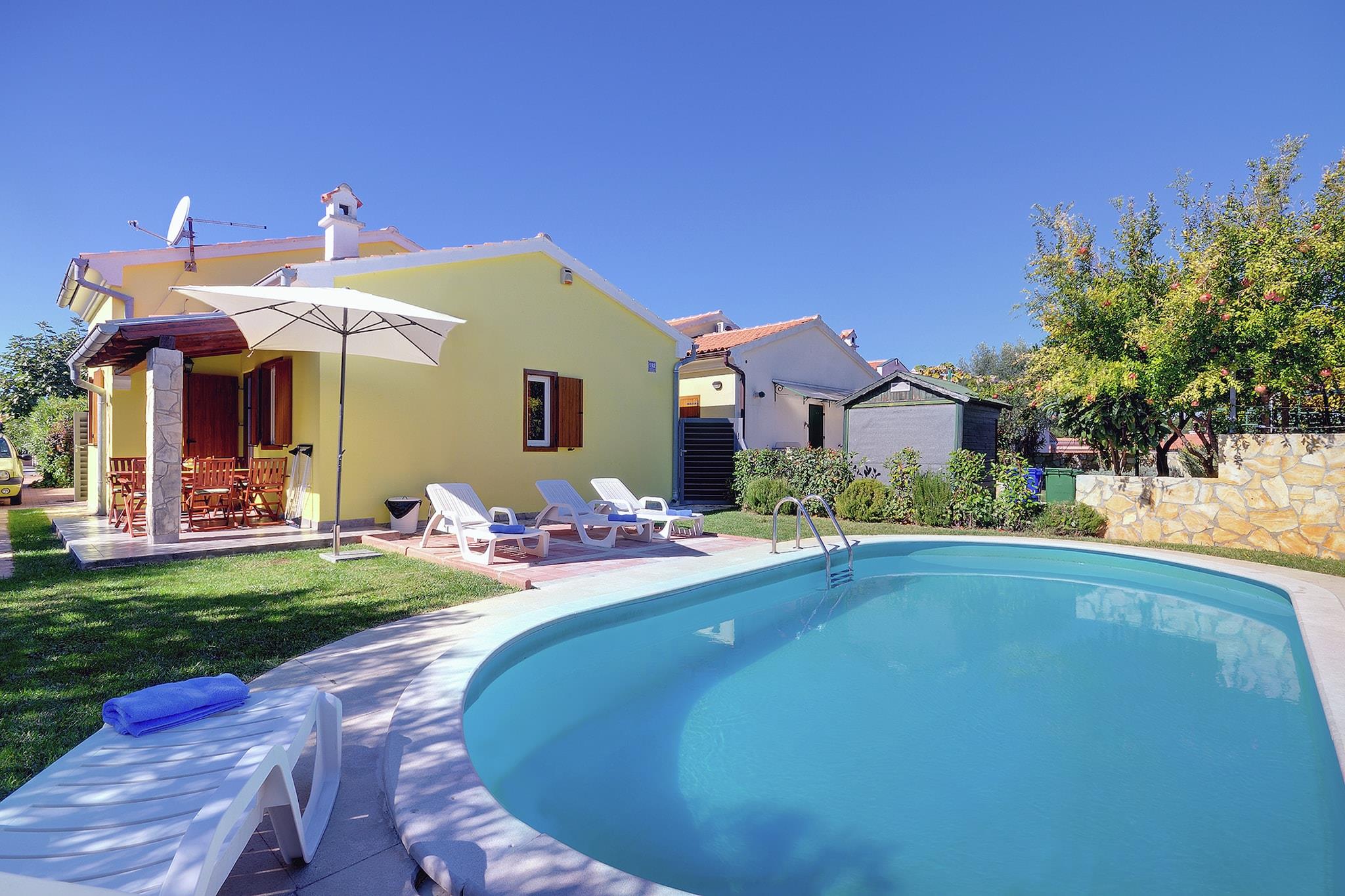 Dette smukke feriehus i Banjole, en lille fiskerby nær Pula, giver privat indkvartering til seks personer i glædeligt dekoreret interiør, som består af to soveværelser med dobbeltsenge, en rummelig separat stue med satellit-tv, køkken og spisestue i et værelse og en badeværelse med bruser og vaskemaskine. Gården er stor, med en pool, havemøbler, terrasse og grill. I dette hyggelige hus er tilladt at medbringe et kæledyr.