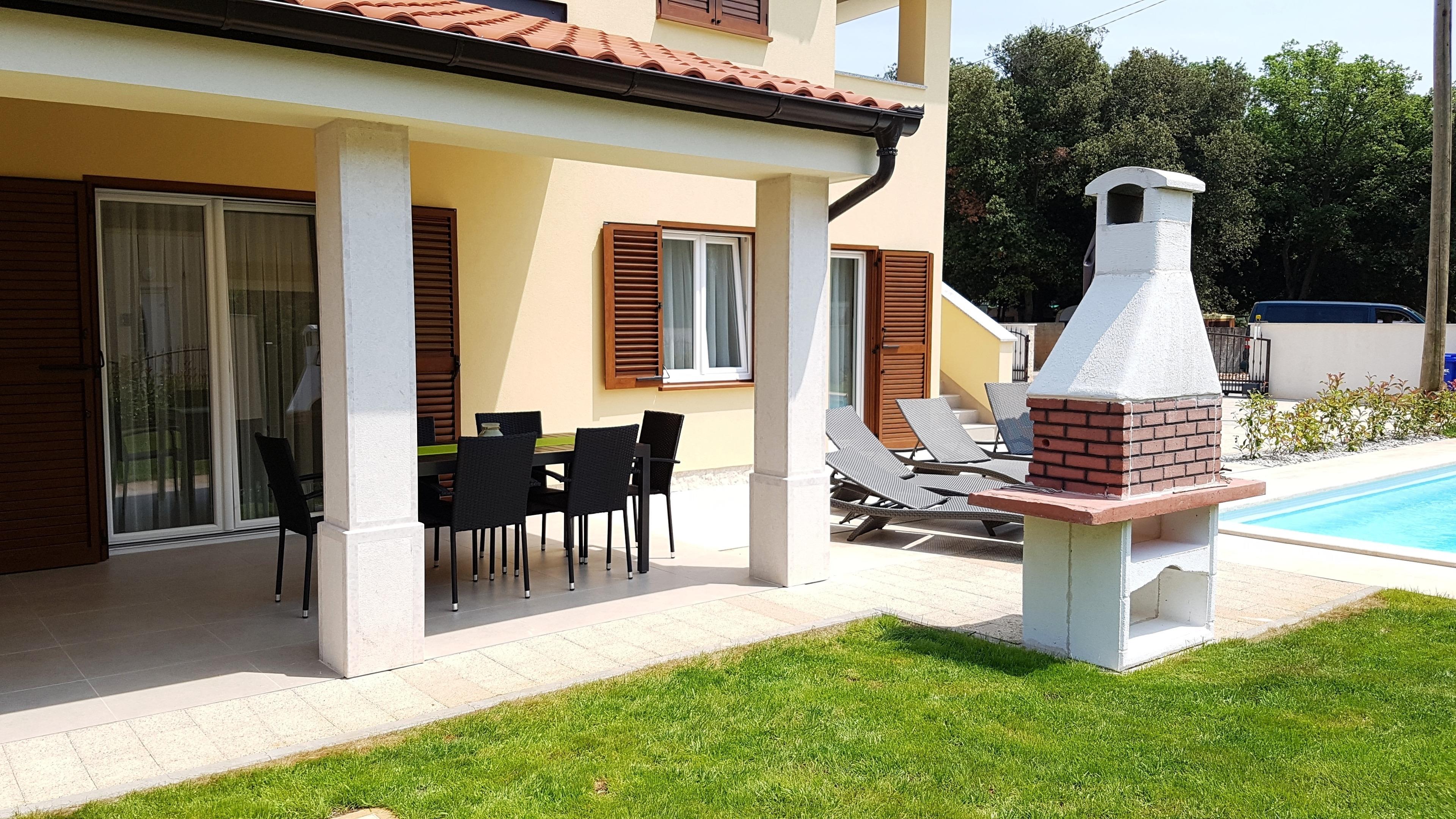 Die Villa bietet Platz für bis zu 8 + 2 Gäste. In der Villa gibt es 4 Schlafzimmer, jedes hat ein eigenes Badezimmer. Entspannen Sie im gemütlichen Wohnzimmer und machen köstliche Mahlzeiten in der voll ausgestatteten Küche mit Essbereich. Sie können sich im grünen Garten mit privatem Pool entspannen, auf Liegestühlen legen und die Sonne genießen. Sie können auch Spezialitäten auf Holzkohle Grill für Ihre Freunde und Familie vorbereiten. Wenn Sie zum Strand gehen wollen, nehmen Sie einfach Ihr Handtuch und in wenigen Minuten zu Fuß sind Sie am Strand, aber auch zu Fuß erreichbar gibt es tolle Restaurants. Die Villa ist klimatisiert, hat WiFi, Privatparkplatz für 3 Autos und bietet alles für einen angenehmen Urlaub.