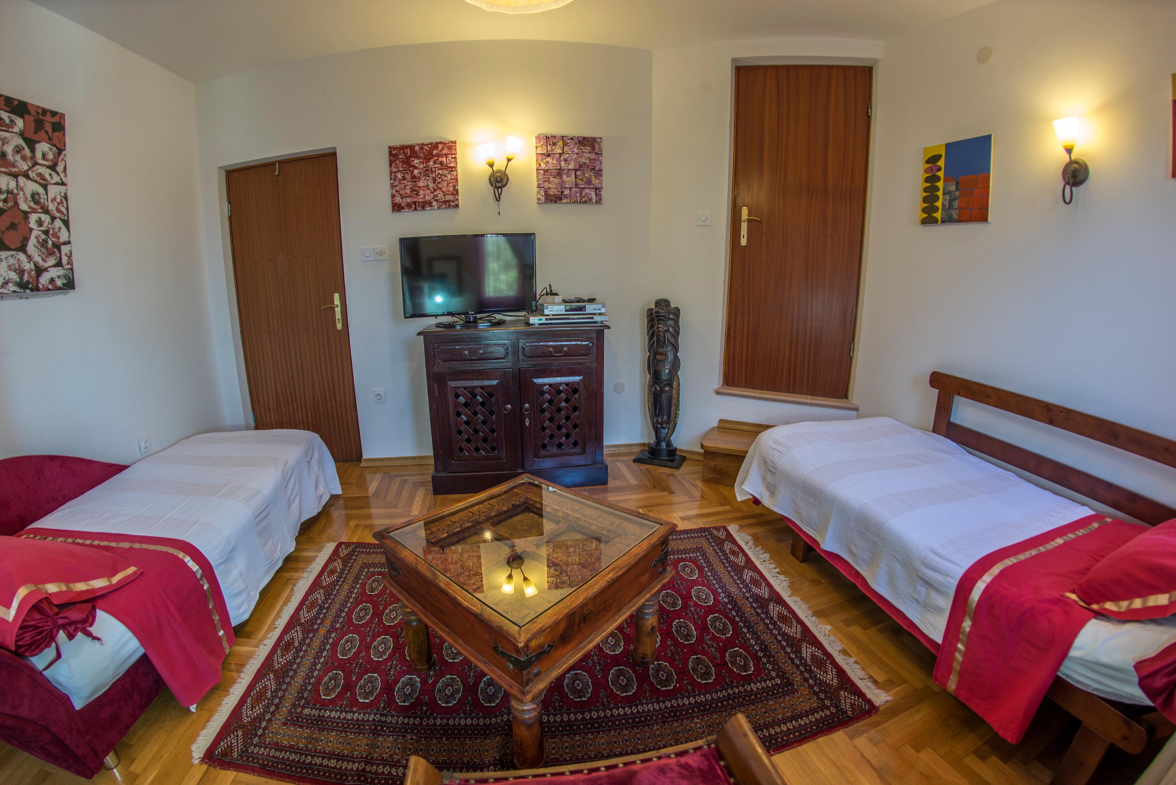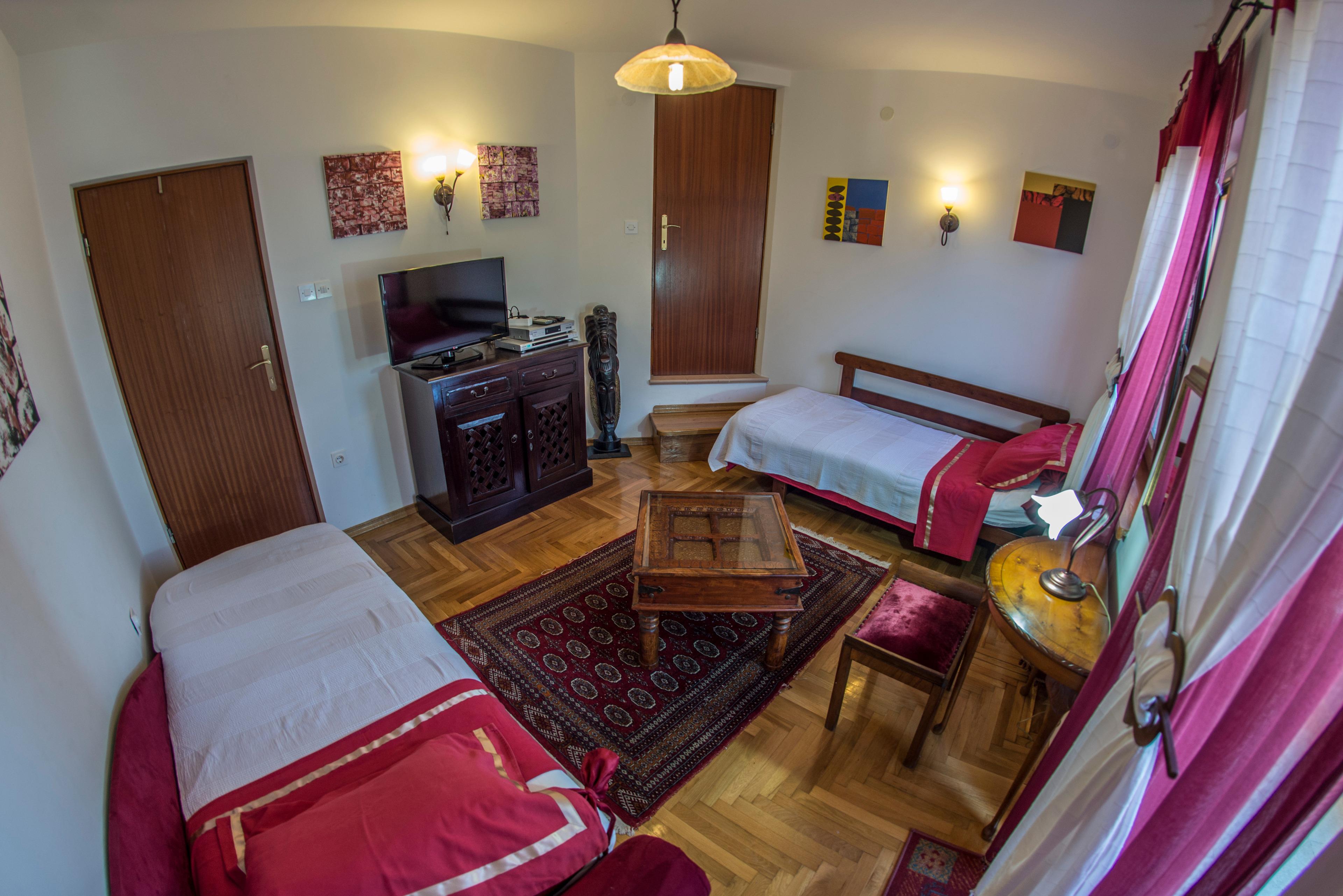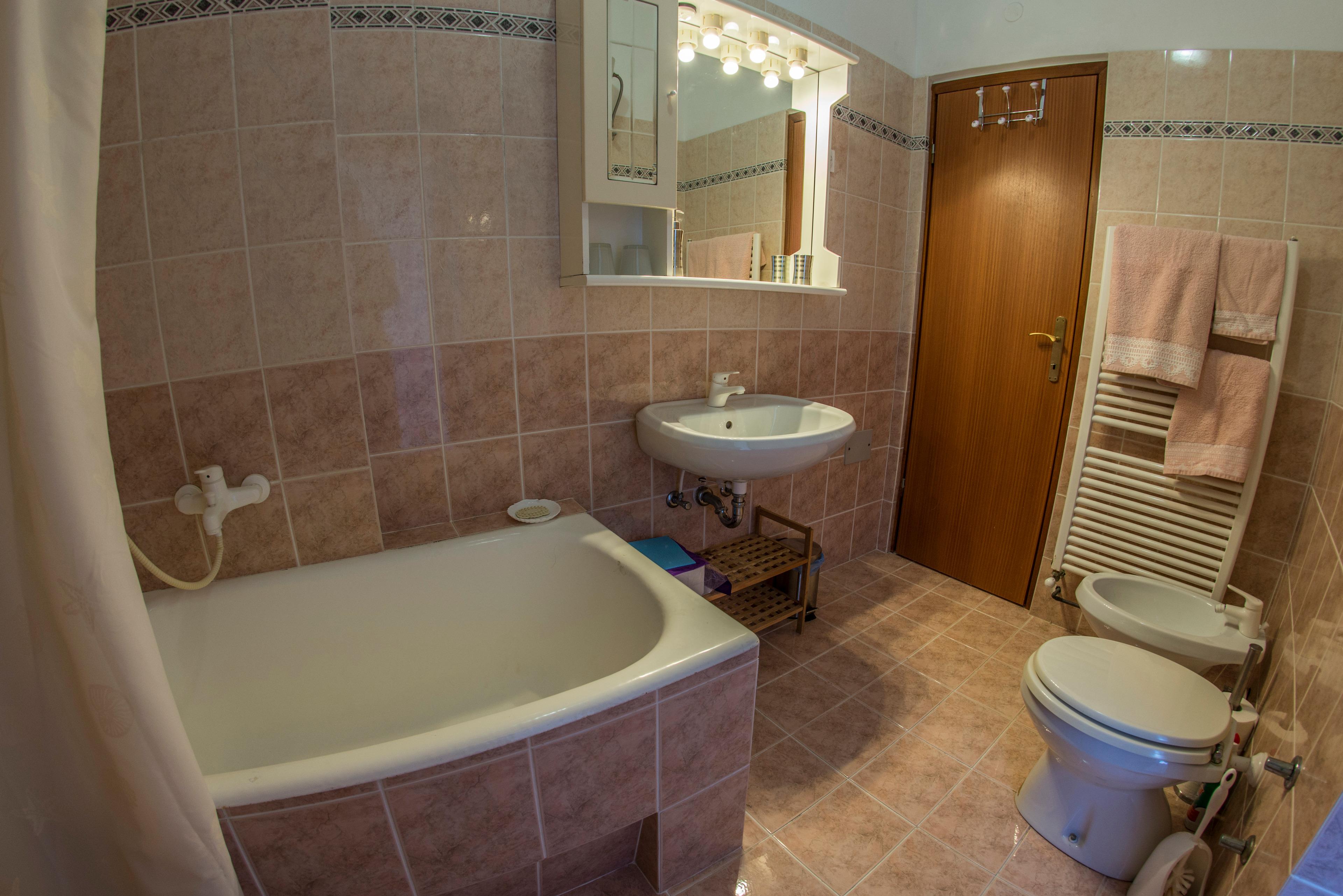 Das Badezimmer verfügt über eine Badewanne/Dusche, Waschbecken mit Spiegel, Bidet und Klosettschüssel. Im Bad finden Sie den Bügeleisen und Bügelbrett, als auch der Fön. Sie können auch Ihre Waren waschen, in Absprache mit dem Besitzer und in der Villa ausgestattet mit der Waschmaschine. Vom Bad kommen Sie zum Balkon, der zum Trocknen der Kleidung geignet ist. Die Ferienwohnung verfügt über ein geräumiges Schlafzimmer mit einem Doppelbett (160/200 cm groß), die Frisierkommode, ein Sofa und einen großen Kleiderschrank. Der zweite Raum ist mit zwei Einzelbetten (80/200 cm groß) eingerichtet, Schrank für Kleidung und Sat-TV. Vom Zimmer kommen Sie auf das Balkon mit Blick an den Garten der Villa und den umliegenden Wald. Appartement ist speziell gereinigt und desinfiziert mit Dampfreiniger.