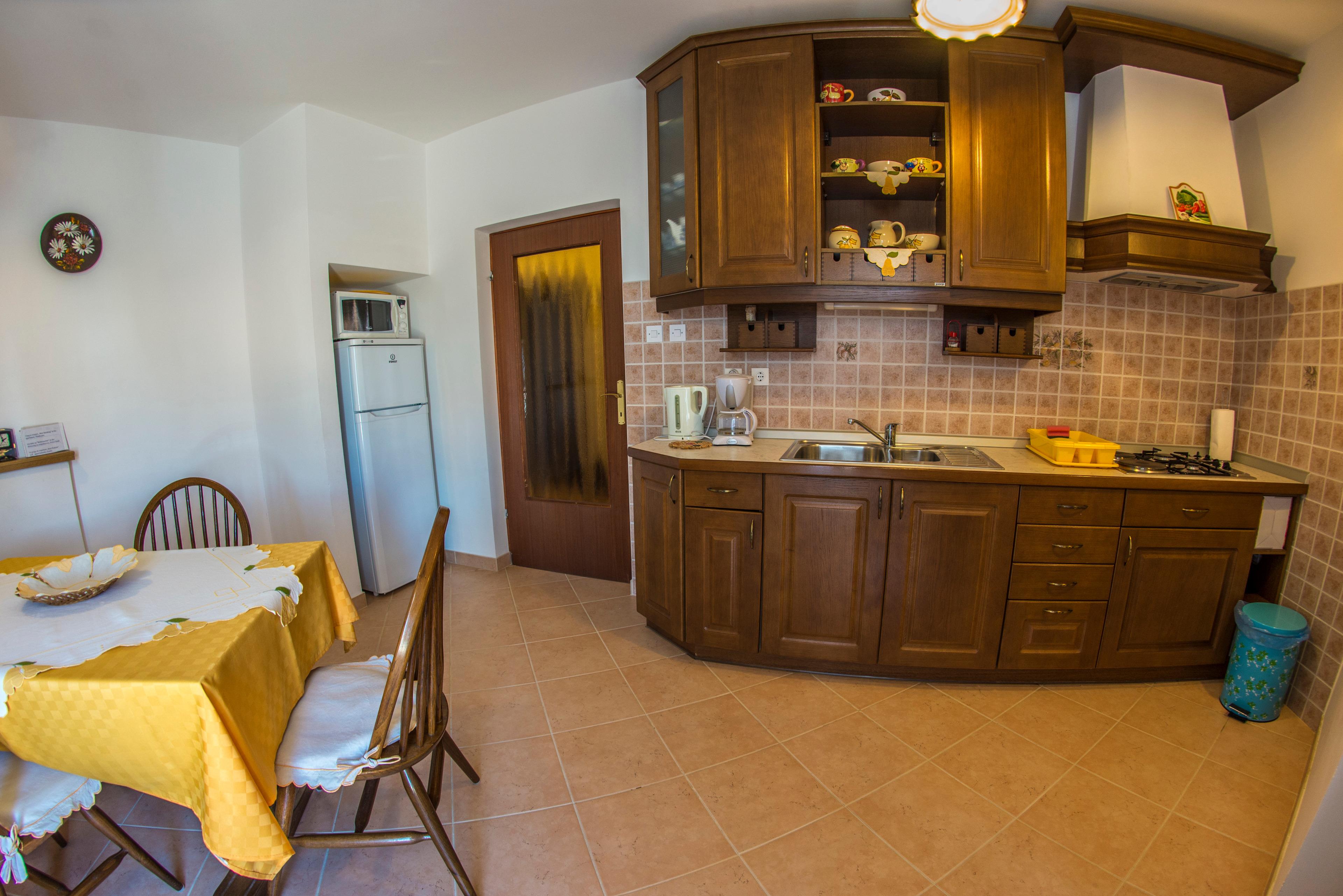 Ferienwohnung A1 befindet sich in der Villa MaVeRo 150 m vom Meer entfernt. Vom Balkon der Ferienwohnung haben Sie einen Blick auf das Meer und den Strand in Vinkuran Bucht. Die Ferienwohnung ist 79 m2 und befindet sich auf der ersten Etage. Die Ferienwohnung hat Klimaanlage, Heizungsradiator, WLAN-Internetzugang (im Preis eingerechnet). Die Ferienwohnung hat einen geräumigen Flur der zur Küche, Badezimmer und zwei Schlafzimmer führt. Die Küche verfügt über einen Arbeitsbereich komplett ausgestattet: elektrische Herdplatte, zwei Kochgas, Mikrowelle, Kühl- und Gefrierschrank, Toaster, Kaffeebrühen für deutsche Touristen, express Kaffee für italienische Touristen. Wohnbereich der Küche ist mit 4 Stühlen und einem großen Esstisch ausgestattet. In diesem Teil finden Sie das TV mit SAT auf der Wand. Von der Küche können Sie zu der halbrunden und bedeckte Terrasse herausgehen, wo Tisch für vier Personen ist, wobei Sie im Freien genießen können. Von der Terrasse haben Sie einen Blick auf den Strand, der von Villa 150 m entfernt ist.