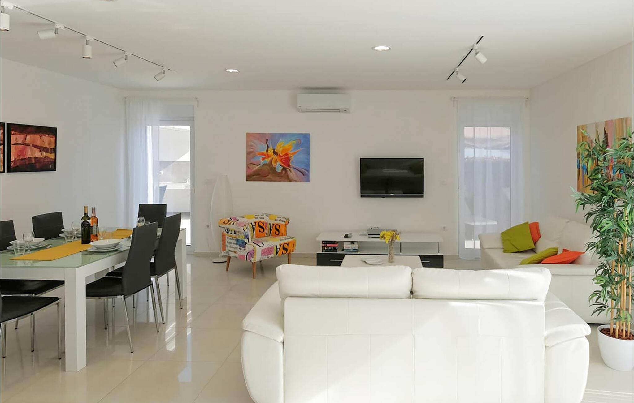 Lad hverdagen ligge og nyd stilfuld komfort: Den lyse opholdsstue er noget særligt med møbler med lækre kvalitetsløsninger og gennemtænkte detaljer, der vil gøre jeres tid med familie eller venner til noget særligt. Tilbered morgenmad i det moderne udstyrede køkken, inden I sætter jer ved det hvide spisebord. Lyse sofaer lægger op til at slappe af, læse en god bog eller se en spændende film. Hvis I har lyst, kan I træne jeres styrke og udholdenhed i fitnessrummet.