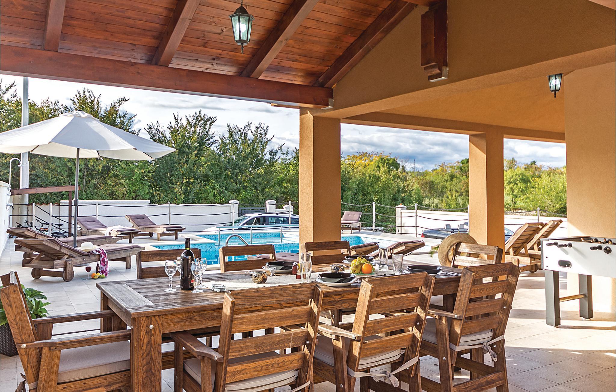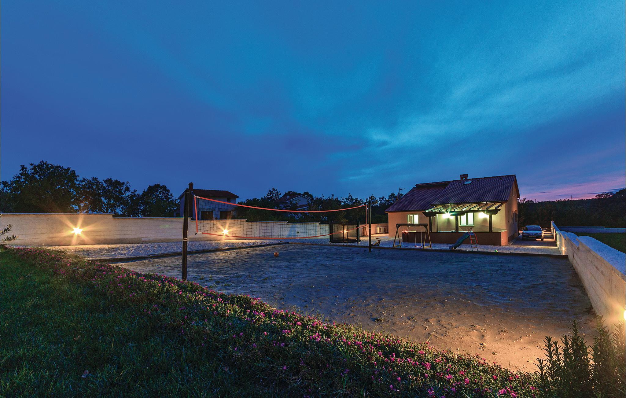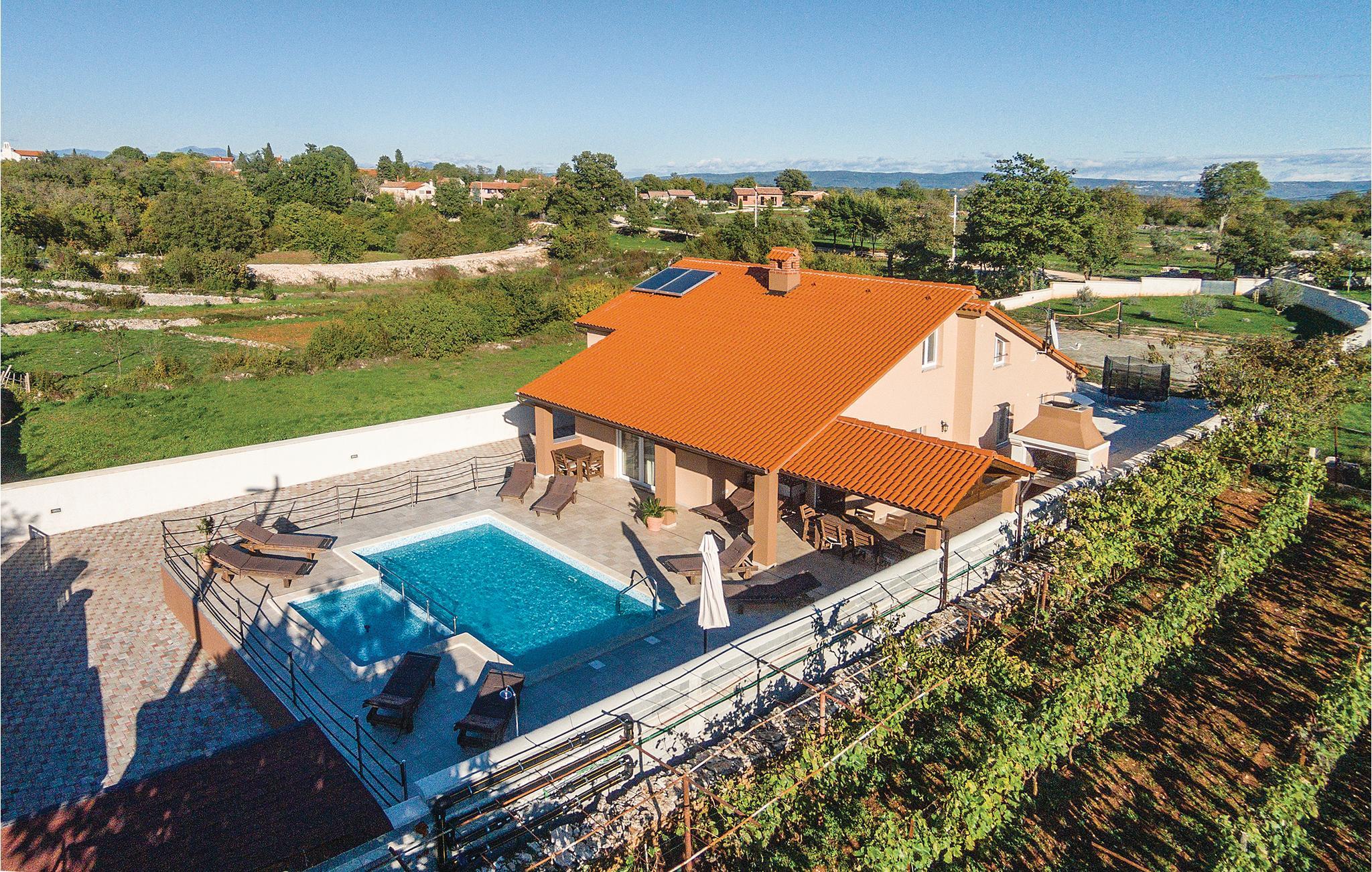 Dette skønne feriehus ligger i den rolige lille by Filipana, er omgivet af frodigt grønt, med en skøn afslappet atmosfære. Huset er indrettet i moderne stil, på første sal ligger de to soveværelser og et stort badeværelse med whirlpool. Laveste loftshøjde er 160 cm. I stueplan ligger yderligere to soveværelser, hver med et badeværelse og en komfortabel stue med en stor terrasse foran. På den udendørs grill, kan I lave lækker mad, mens I holder øje med børnene der leger i haven. Ved siden af poolen ligger et badebassin til børnene. Tag på ture i omgivelserne til fods, på cykel eller i bil, besøg ranchen Barba Tone og klatreparken Glavani.