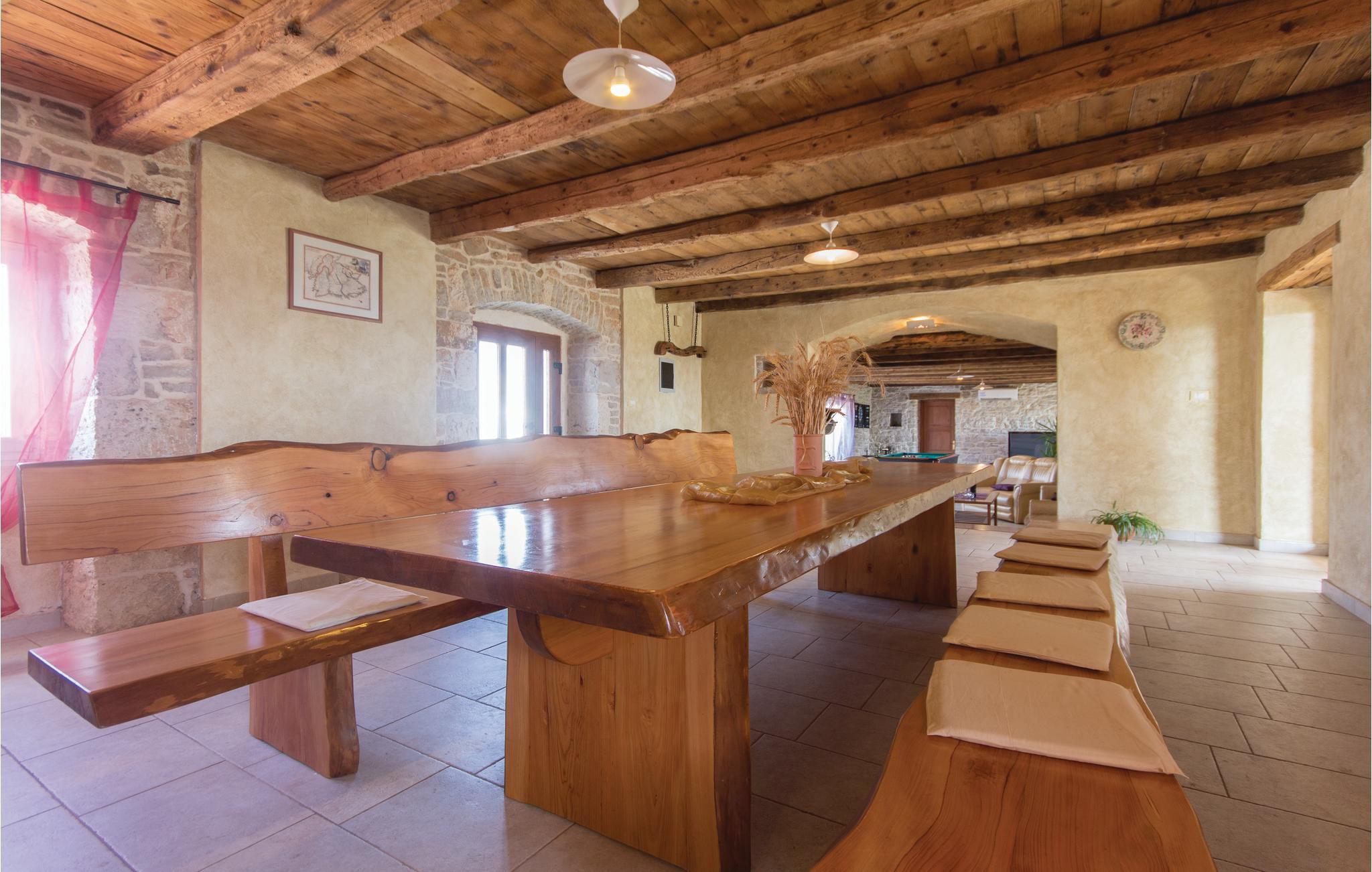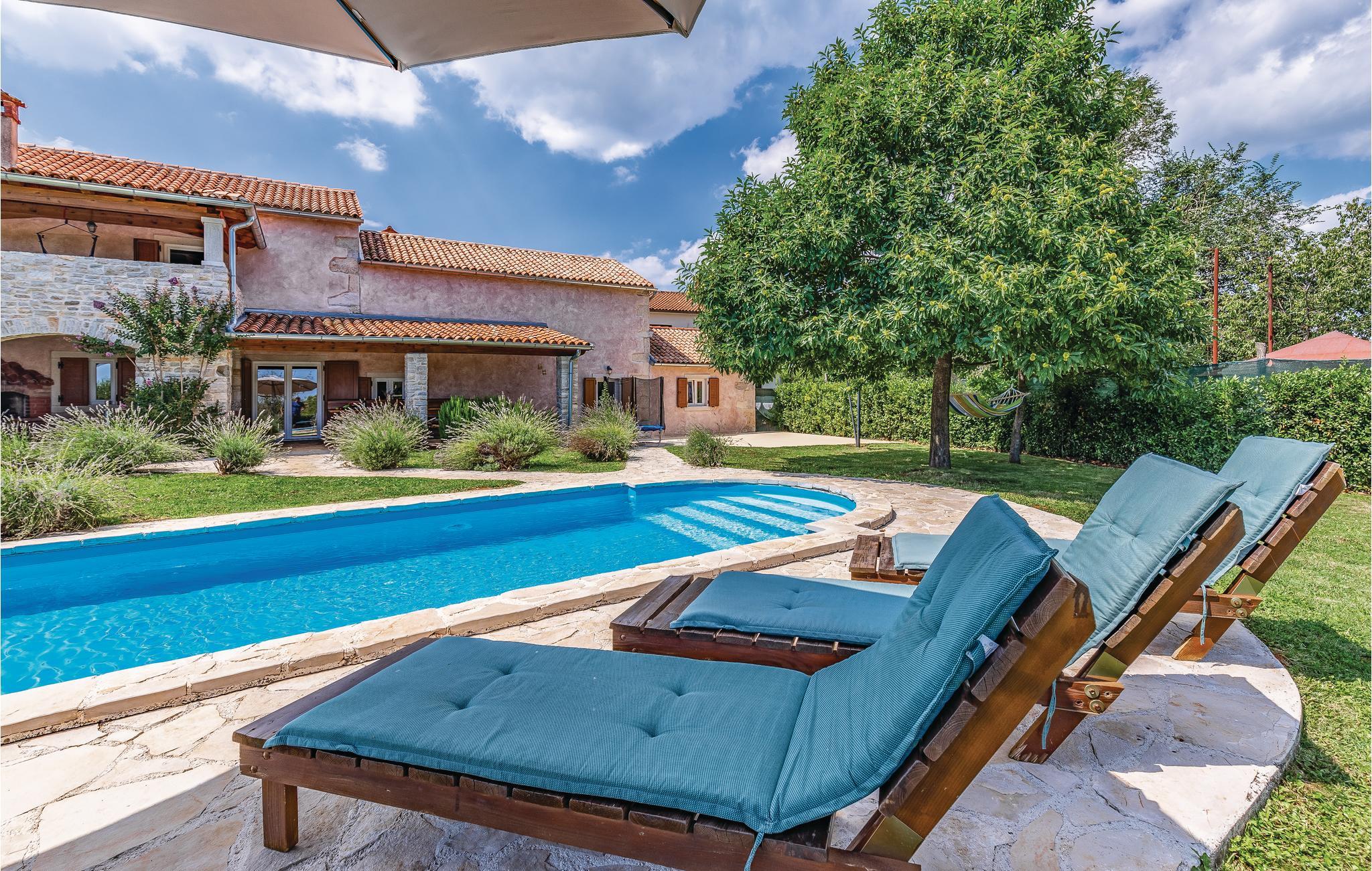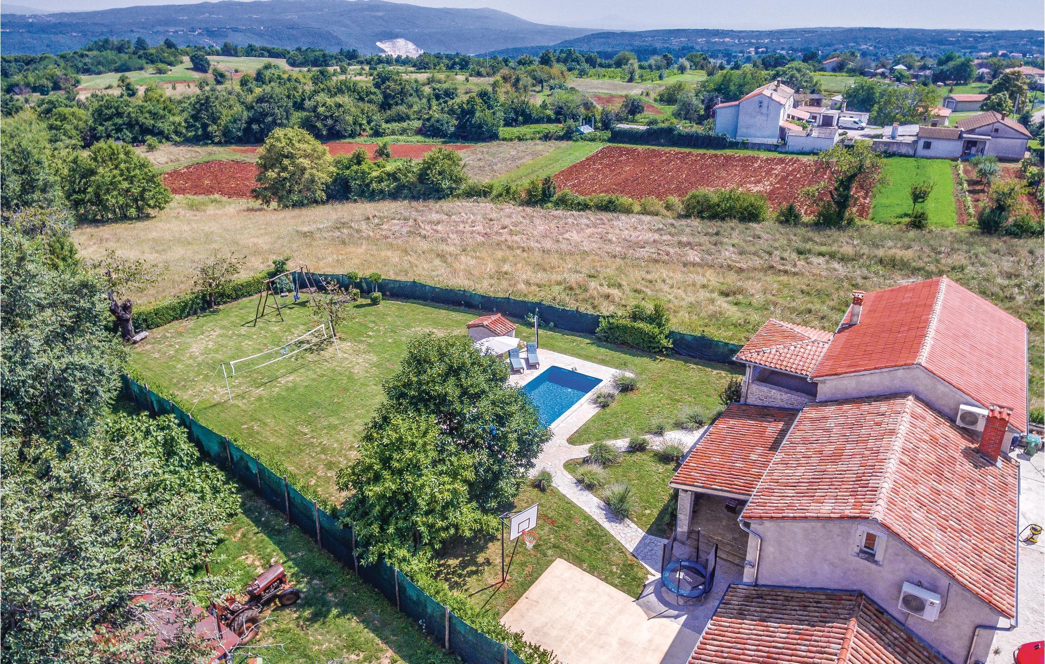 Dette typisk istriske feriehus, ligger nær den maleriske middelalderby Barban. Det er indrettet rustikt med møbler af god kvalitet, har smukke stenvægge og flotte trælofter med frilagte bjælker. Huset rummer fire soveværelser, hvert bekvemt med eget badeværelse og klimaanlæg. I stueplan er der et stort værelse med kamin, et fuldt udstyret køkken med alle hjælpemidler, hvor det er nemt at tilberede lækker feriemad, og med spisehjørne og på terrassen står grillen hvis I ikke har lyst til at lave mad indendørs. Tag en forfriskende svømmetur i poolen i den smukke have og nyd de fredelige landlige omgivelser. Her er både en overdækket terrasse med bord og bænke, samt en altan der ligeledes er møbleret, hvor I kan nyde udsigten over landskaberne. Her er trådløst netværk så I kan følge med og holde kontakt med dem derhjemme. Grunden er helt indhegnet, så her kan I trygt lade børnene lege mens I slapper af. Nær huset er det muligt at købe ind i en lille butik. Et unikt hus til en unik dejlig ferie.
