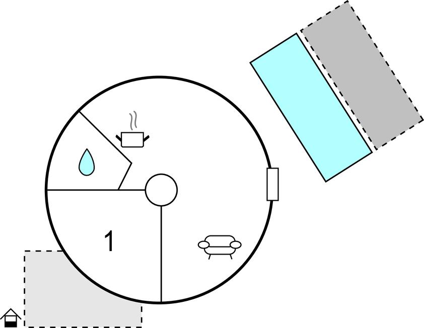 Den usædvanlige, runde arkitektur vil inspirere dig. Huset har et soveværelse, en stue åben til køkkenet og en spiseplads. Også et badeværelse. Du og dit kæledyr har masser af bevægelsesfrihed i den store, lukkede have. Efter en lang dag med masser af sol og pool kan du alternativt forberede din middag på grillen og spise udenfor. Forkæl dig selv med denne ro - og ikke mindst sindsro - og vågn op om morgenen til fuglenes kvidrende sang.