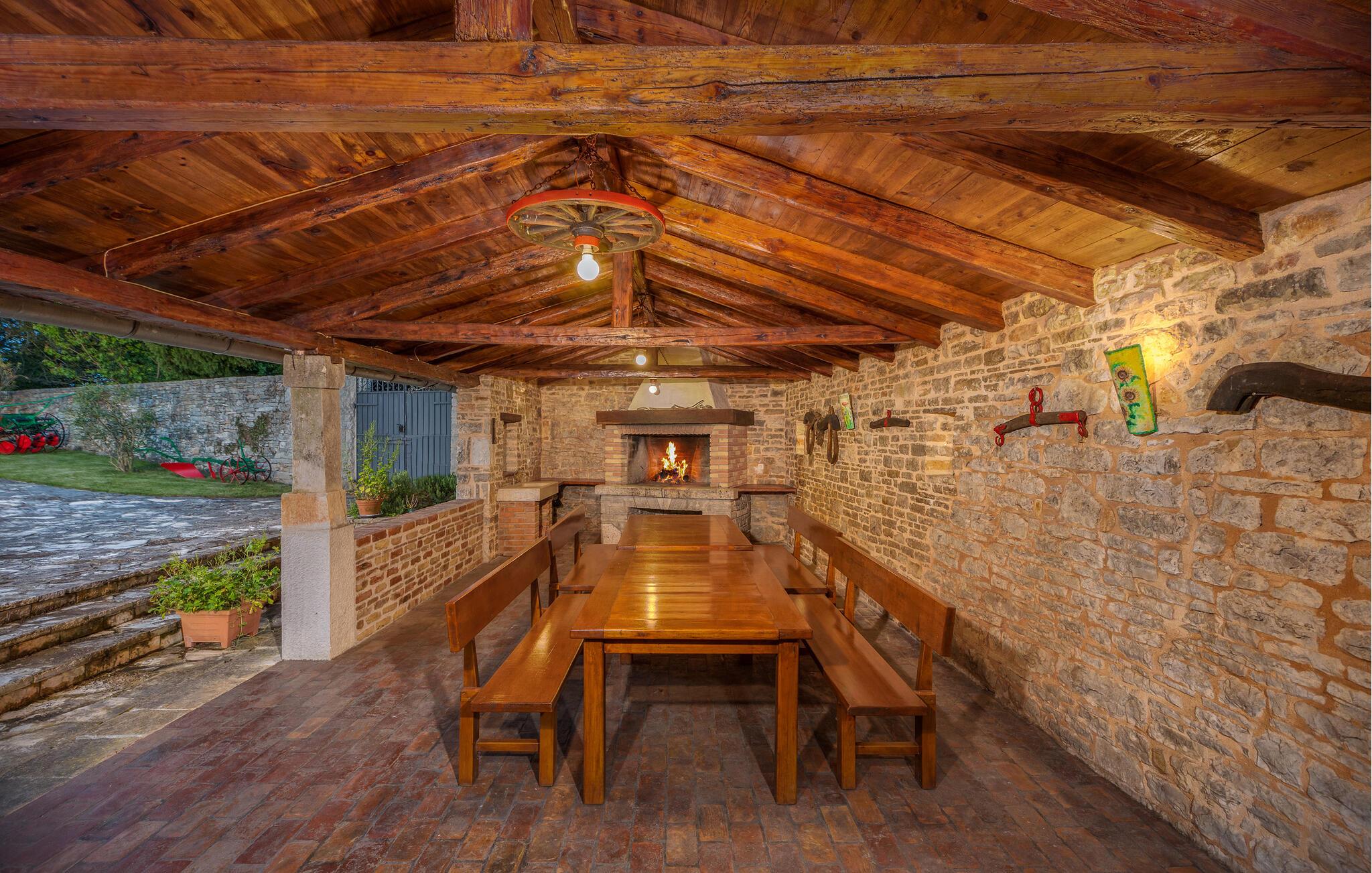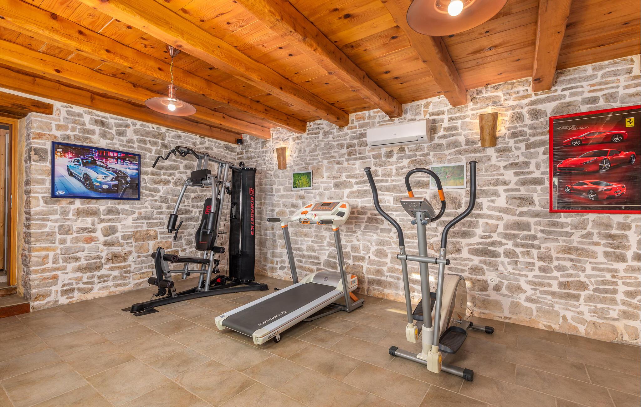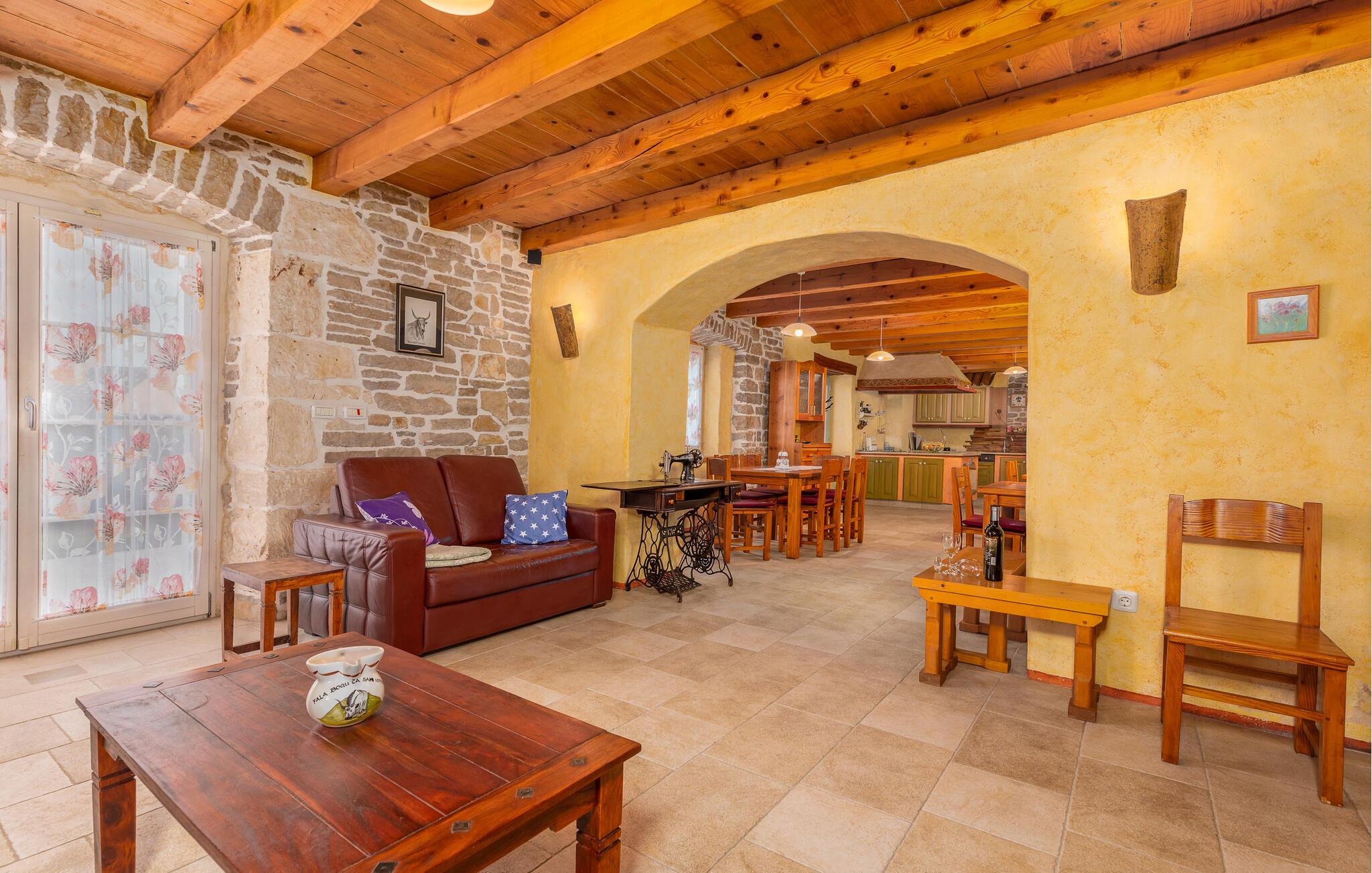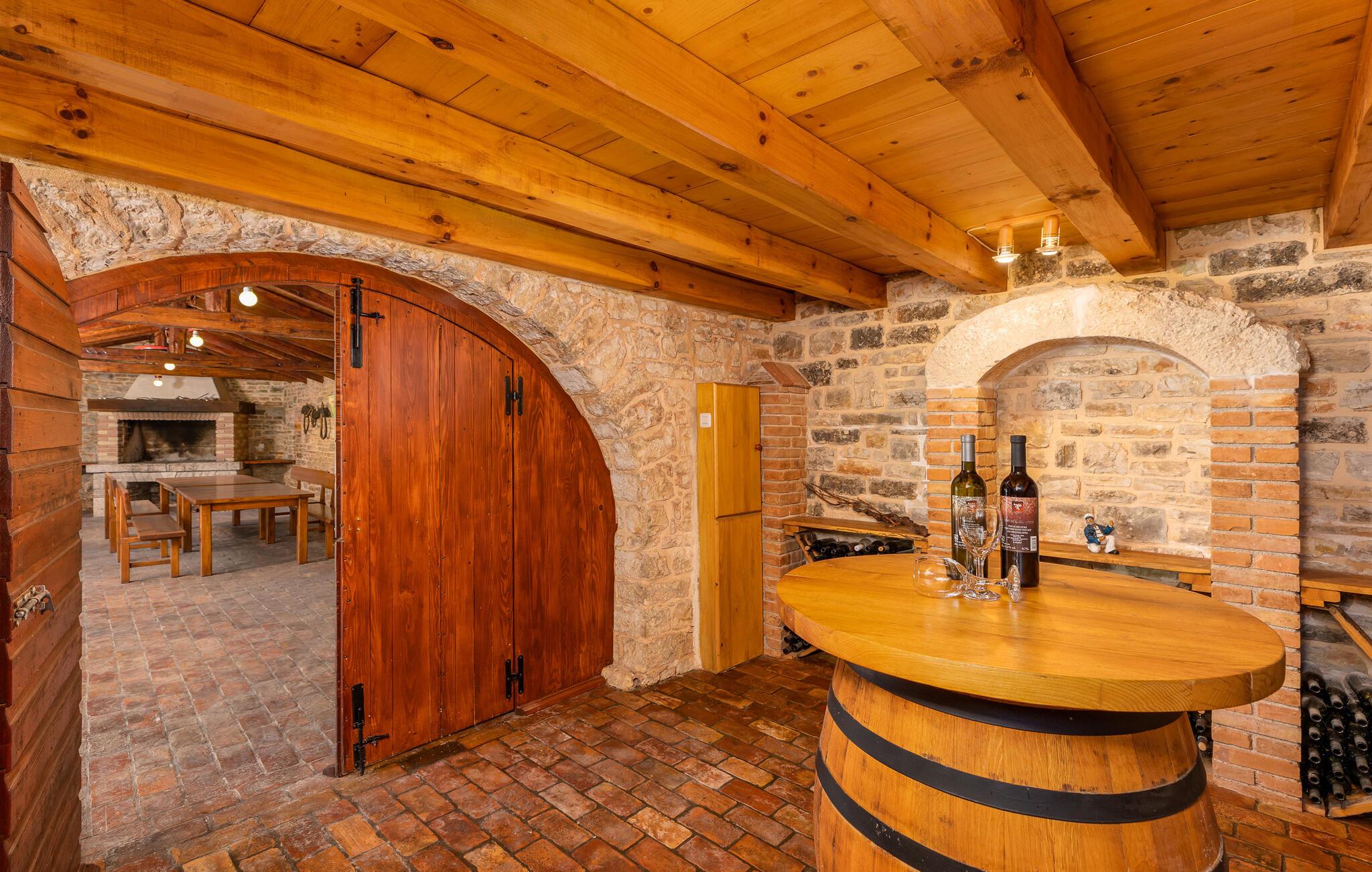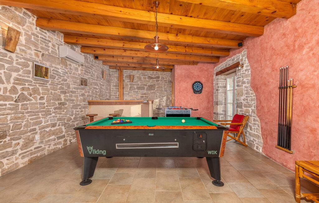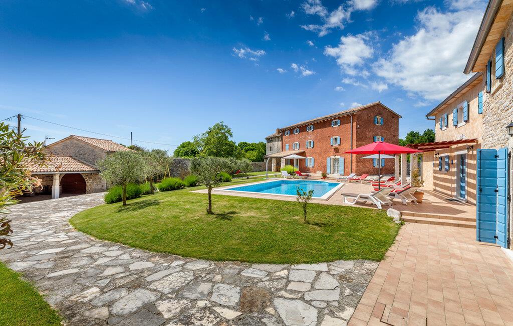 Dette meget rustikke hus med en stor kapacitet fra det 19. århundrede er opdelt i tre ferielejligheder i udkanten af en typisk istrisk landsby. De hundredårige vægge er blevet fuldstændigt restaureret. Her sikres privatlivets fred og ro. I det første hus i stueetagen er en stor stue med køkken og en rustik spisestue. På samme etage findes det hyggelige soveværelse. I stueetagen i det andet hus kan I mødes til timevis af underholdning i et rekreativt rum med en lille bar, billard, dart eller bordfodbold. I wellness-oasen kan I slappe af i en sauna, og et fitness-rum for de aktive er også til rådighed. Her er noget for enhver smag og alder. På de øverste etager af det andet hus findes yderligere tre soveværelser, med hvert sit private badeværelse. De to huse er forbundet via en udendørs trappe. På den delvist lukkede (4500 m²) grund findes en meget stor udendørs pool. Her kan du nyde en forfriskende dukkert på varme dage. Et legeområde for børn og et stort sommerkøkken fuldender det idylliske billede. Det skovklædte område er ideelt til afslappende gåture. Dette fantastiske feriehus vil sikre dig til en afslappende og uforglemmelig ferie. Besøg den middelalderlige by Barban! Barban har meget at byde på: paladser, kirker, monumenter fra barok og gotisk arkitektur, fresker, glagolitiske optegnelser og en bymur. Denne region er med sin rige kulturarv med til at gøre stedet til en fantastisk ferie for kulturelskere.