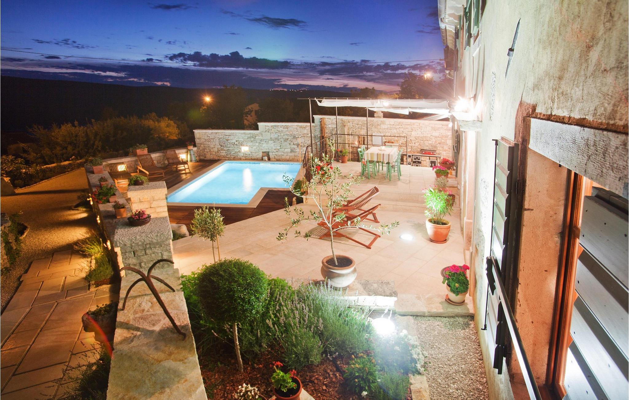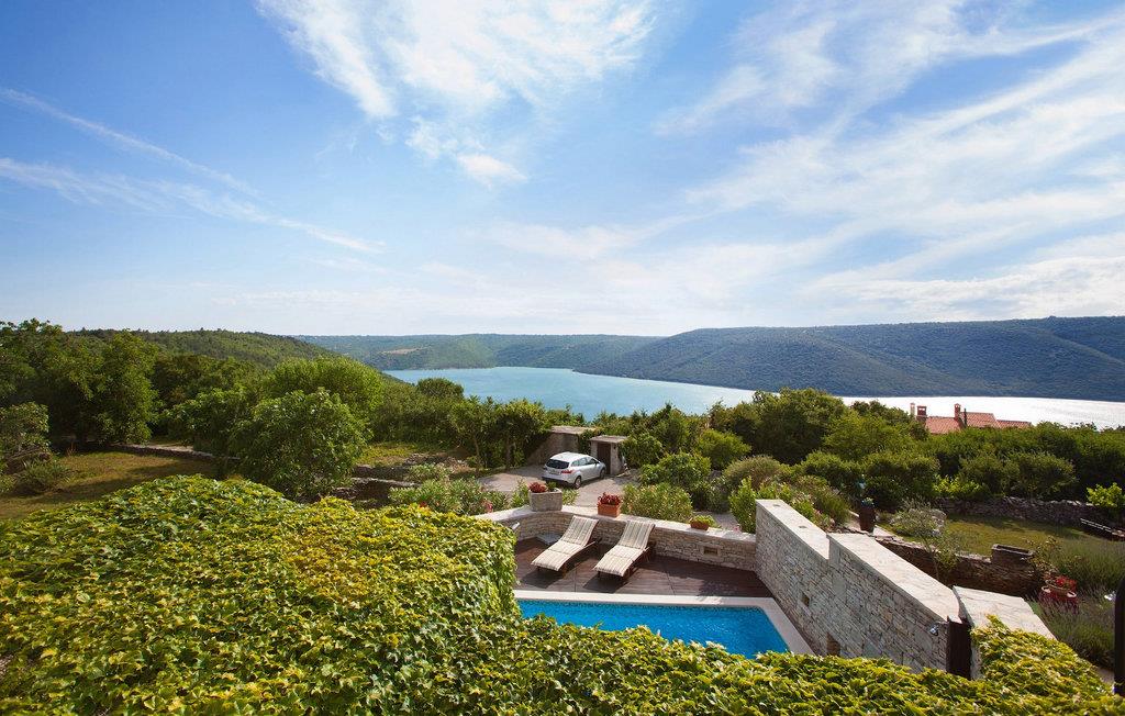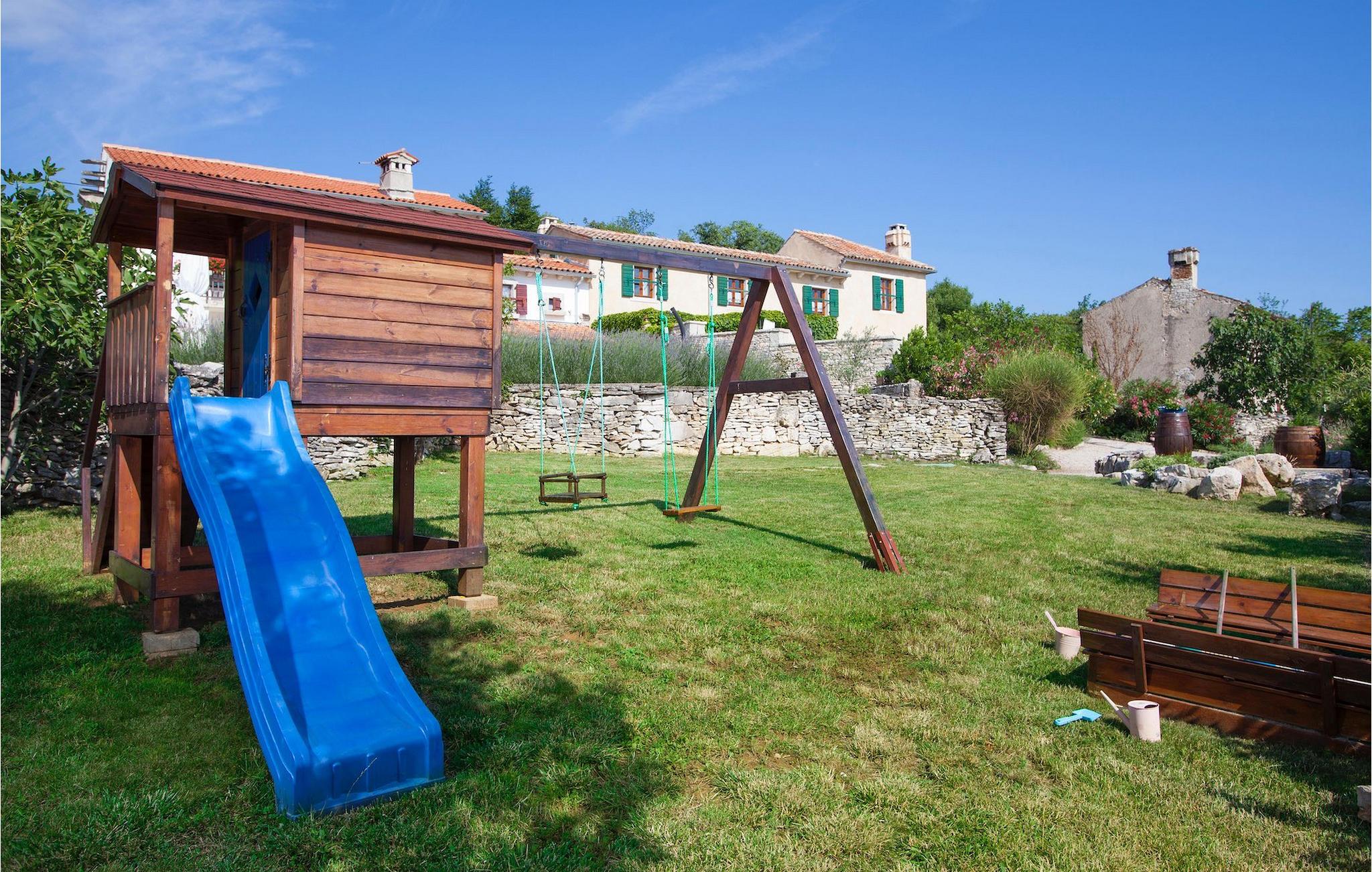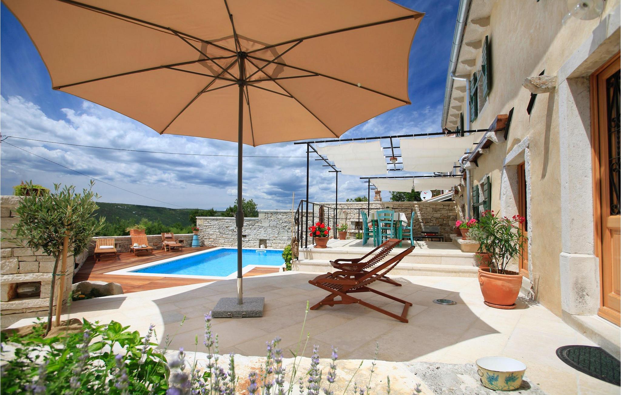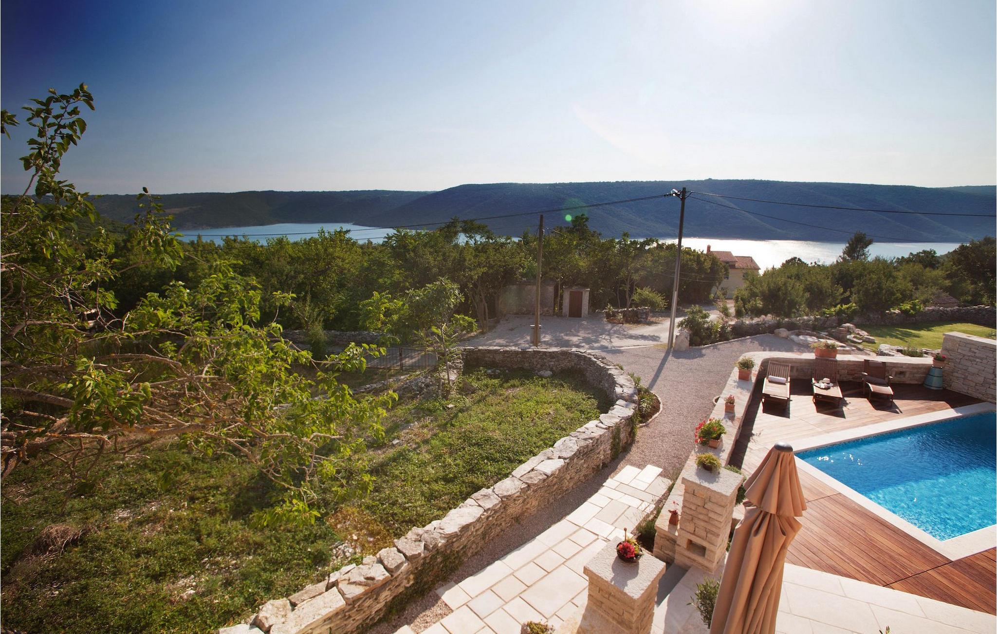 I den udvendige del af den 1400 kvadratmeter store ejendom finder du en rummelig terrasse med privat pool, som giver dig en betagende udsigt over Adriaterhavet og de omkringliggende bakker. Hvis du vil prøve et par lokale delikatesser, står en grill til din rådighed på terrassen. Og mens du sætter dine kulinariske færdigheder på prøve, kan dine børn hygge sig på legepladsen lige ved siden af. Alle gæster, som ikke kun ønsker at slikke sol og hav, men også gerne vil være aktive og udforske det unikke istriske landskab og natur, har mulighed for at leje cykler på stedet. Kort sagt: Alt hvad du behøver for en perfekt ferie kan du finde i den smukke Villa Gelci.Villa Gelci ligger i Trget i Istrien. Denne idylliske fiskerby ligger i den tolv kilometer lange Raša-bugt sydvest for byen Labin. Trget er kendetegnet ved sin uberørte natur og rolige beliggenhed, hvilket gør den perfekt til især familier med børn, men også for alle, der længes efter fred og afslapning. Den første strand ligger kun 900 meter fra Villa Gelci.