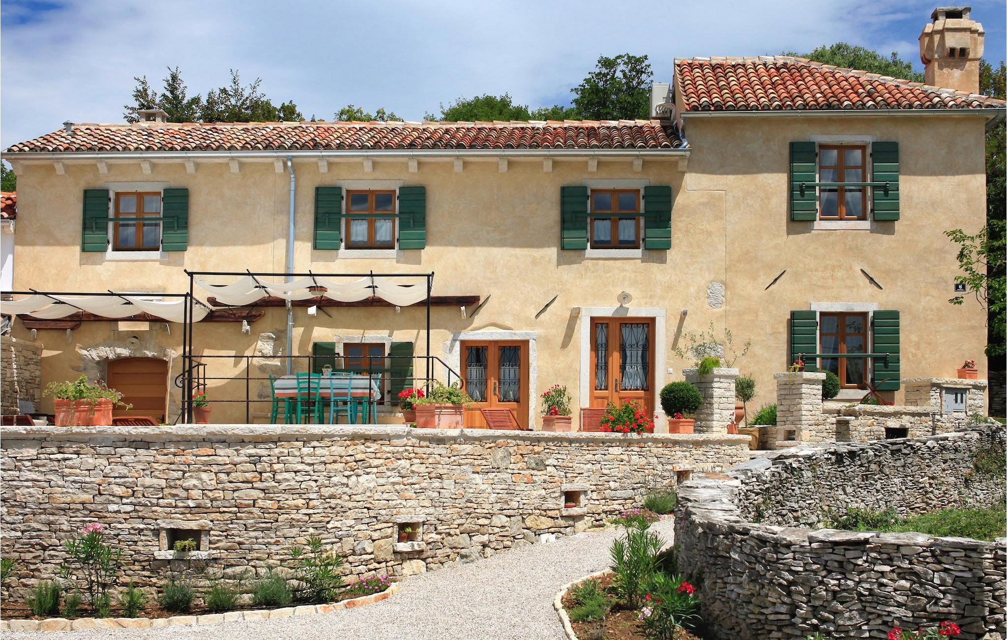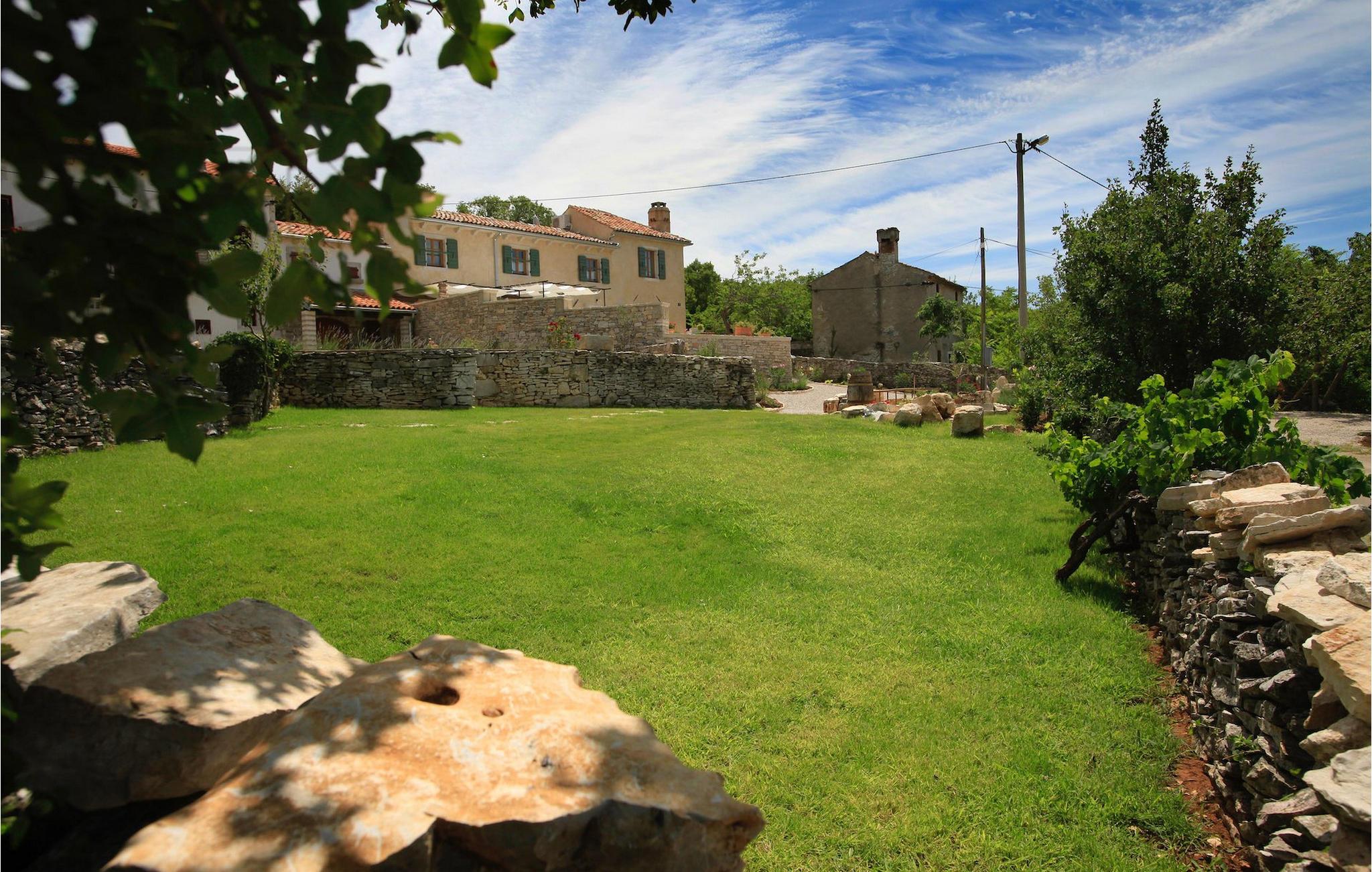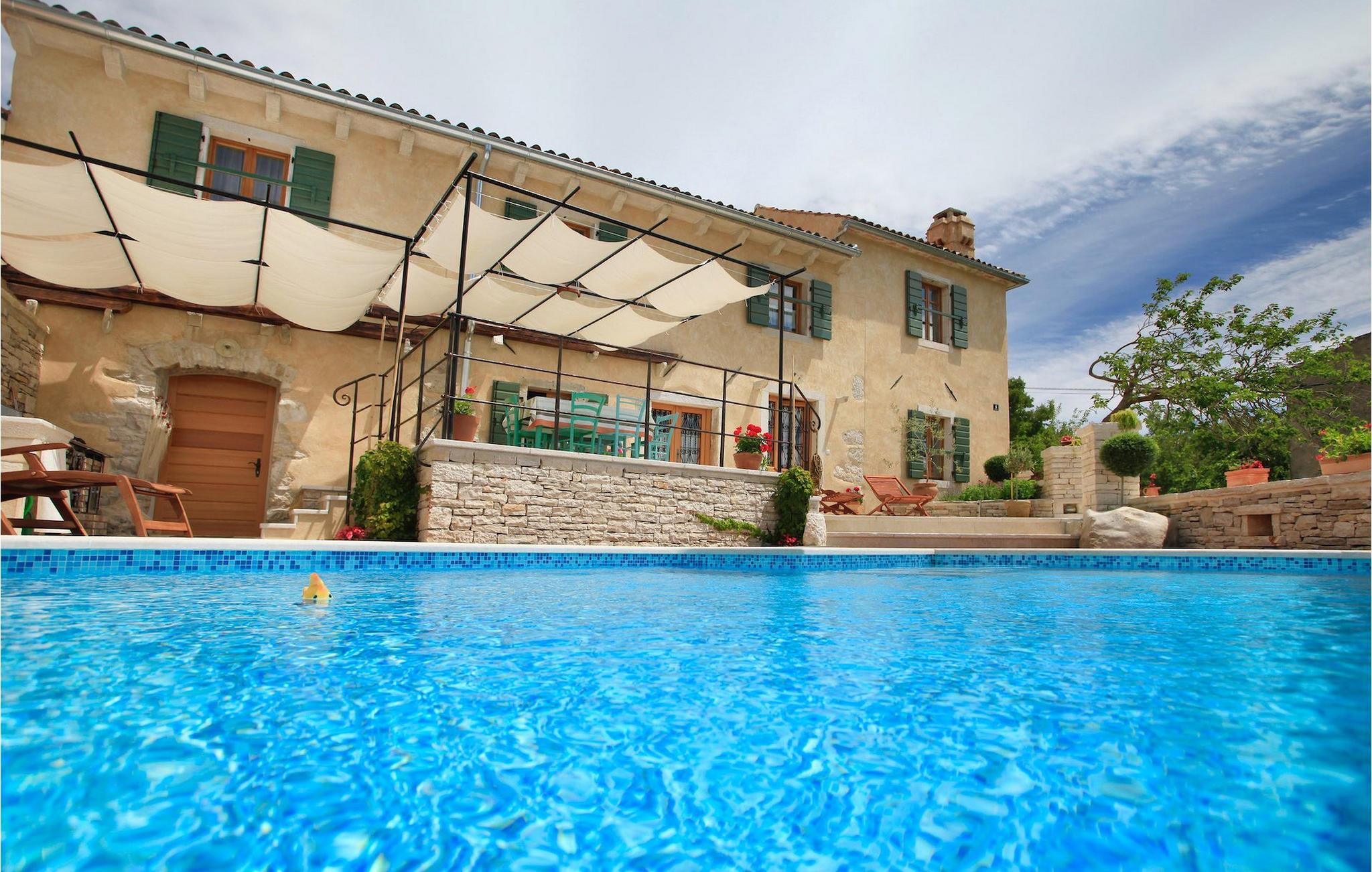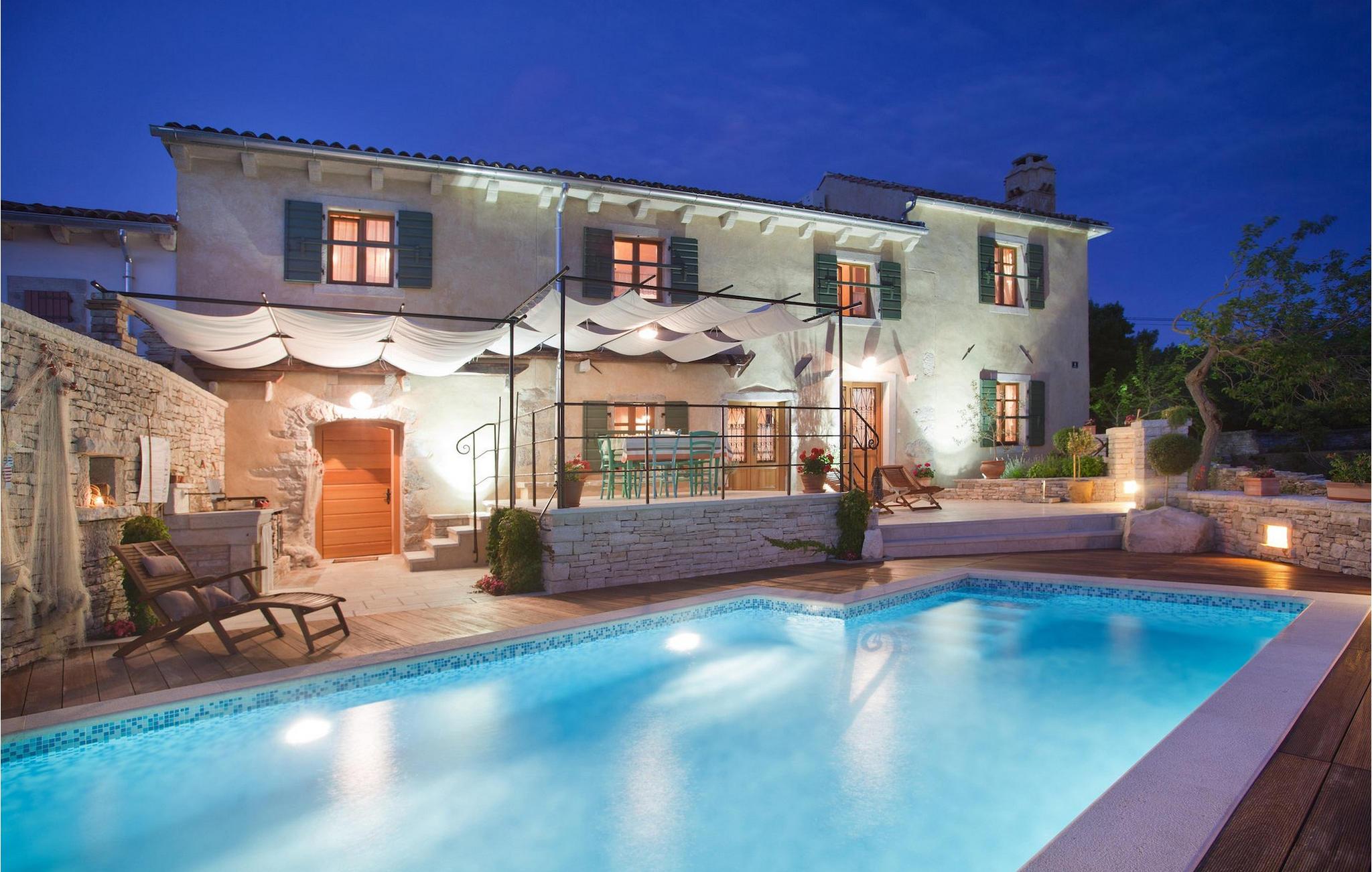 I den udvendige del af den 1400 kvadratmeter store ejendom finder du en rummelig terrasse med privat pool, som giver dig en betagende udsigt over Adriaterhavet og de omkringliggende bakker. Hvis du vil prøve et par lokale delikatesser, står en grill til din rådighed på terrassen. Og mens du sætter dine kulinariske færdigheder på prøve, kan dine børn hygge sig på legepladsen lige ved siden af. Alle gæster, som ikke kun ønsker at slikke sol og hav, men også gerne vil være aktive og udforske det unikke istriske landskab og natur, har mulighed for at leje cykler på stedet. Kort sagt: Alt hvad du behøver for en perfekt ferie kan du finde i den smukke Villa Gelci.Villa Gelci ligger i Trget i Istrien. Denne idylliske fiskerby ligger i den tolv kilometer lange Raša-bugt sydvest for byen Labin. Trget er kendetegnet ved sin uberørte natur og rolige beliggenhed, hvilket gør den perfekt til især familier med børn, men også for alle, der længes efter fred og afslapning. Den første strand ligger kun 900 meter fra Villa Gelci.