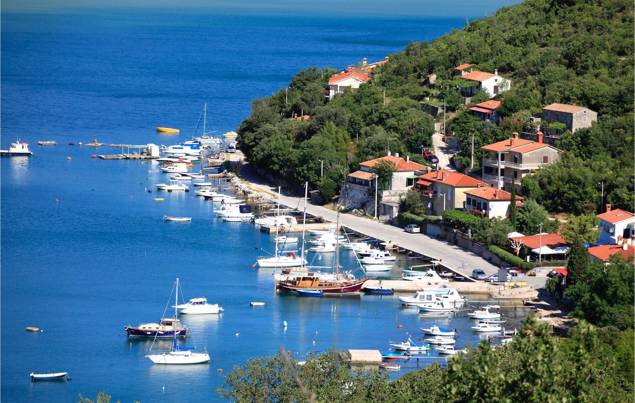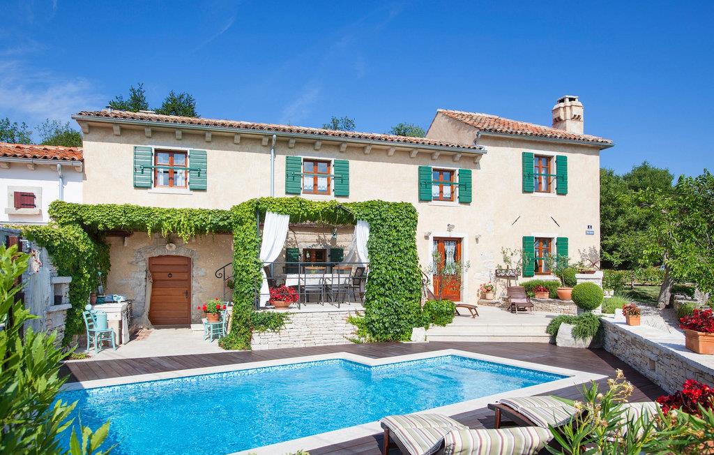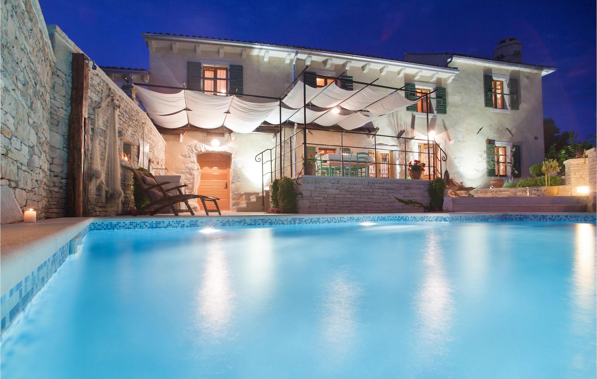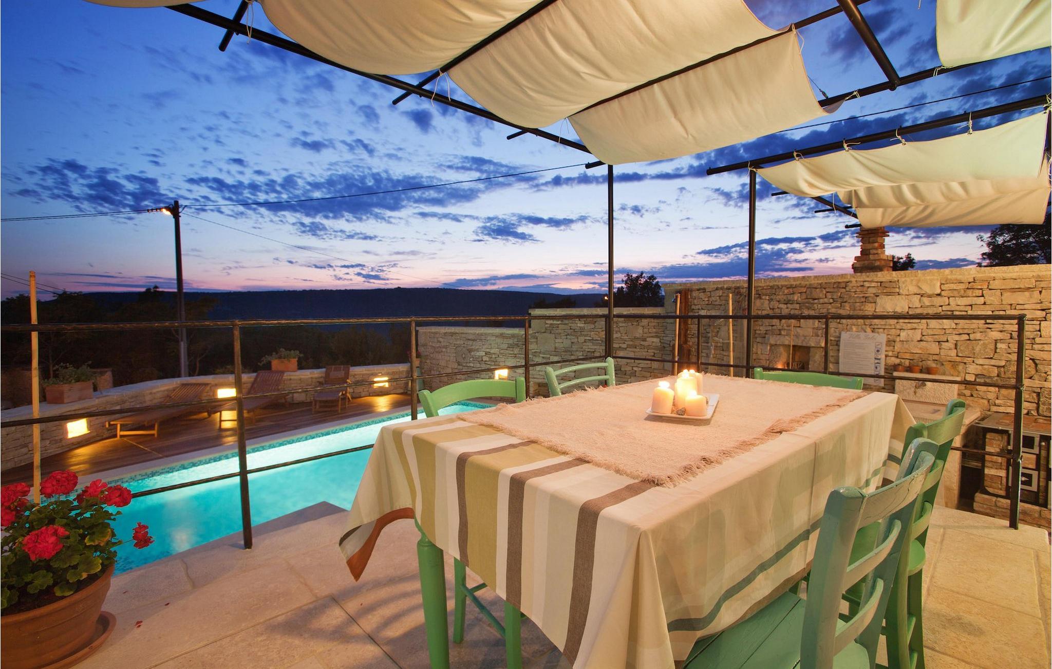 I den udvendige del af den 1400 kvadratmeter store ejendom finder du en rummelig terrasse med privat pool, som giver dig en betagende udsigt over Adriaterhavet og de omkringliggende bakker. Hvis du vil prøve et par lokale delikatesser, står en grill til din rådighed på terrassen. Og mens du sætter dine kulinariske færdigheder på prøve, kan dine børn hygge sig på legepladsen lige ved siden af. Alle gæster, som ikke kun ønsker at slikke sol og hav, men også gerne vil være aktive og udforske det unikke istriske landskab og natur, har mulighed for at leje cykler på stedet. Kort sagt: Alt hvad du behøver for en perfekt ferie kan du finde i den smukke Villa Gelci.Villa Gelci ligger i Trget i Istrien. Denne idylliske fiskerby ligger i den tolv kilometer lange Raša-bugt sydvest for byen Labin. Trget er kendetegnet ved sin uberørte natur og rolige beliggenhed, hvilket gør den perfekt til især familier med børn, men også for alle, der længes efter fred og afslapning. Den første strand ligger kun 900 meter fra Villa Gelci.