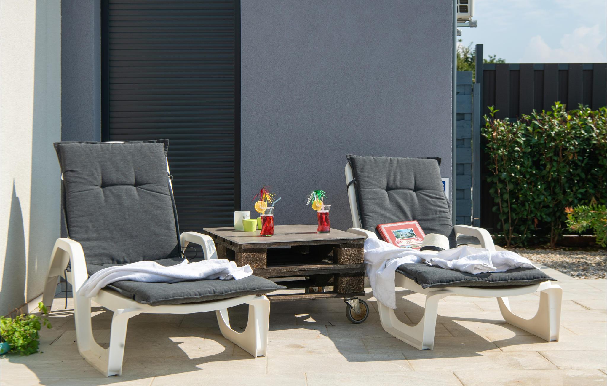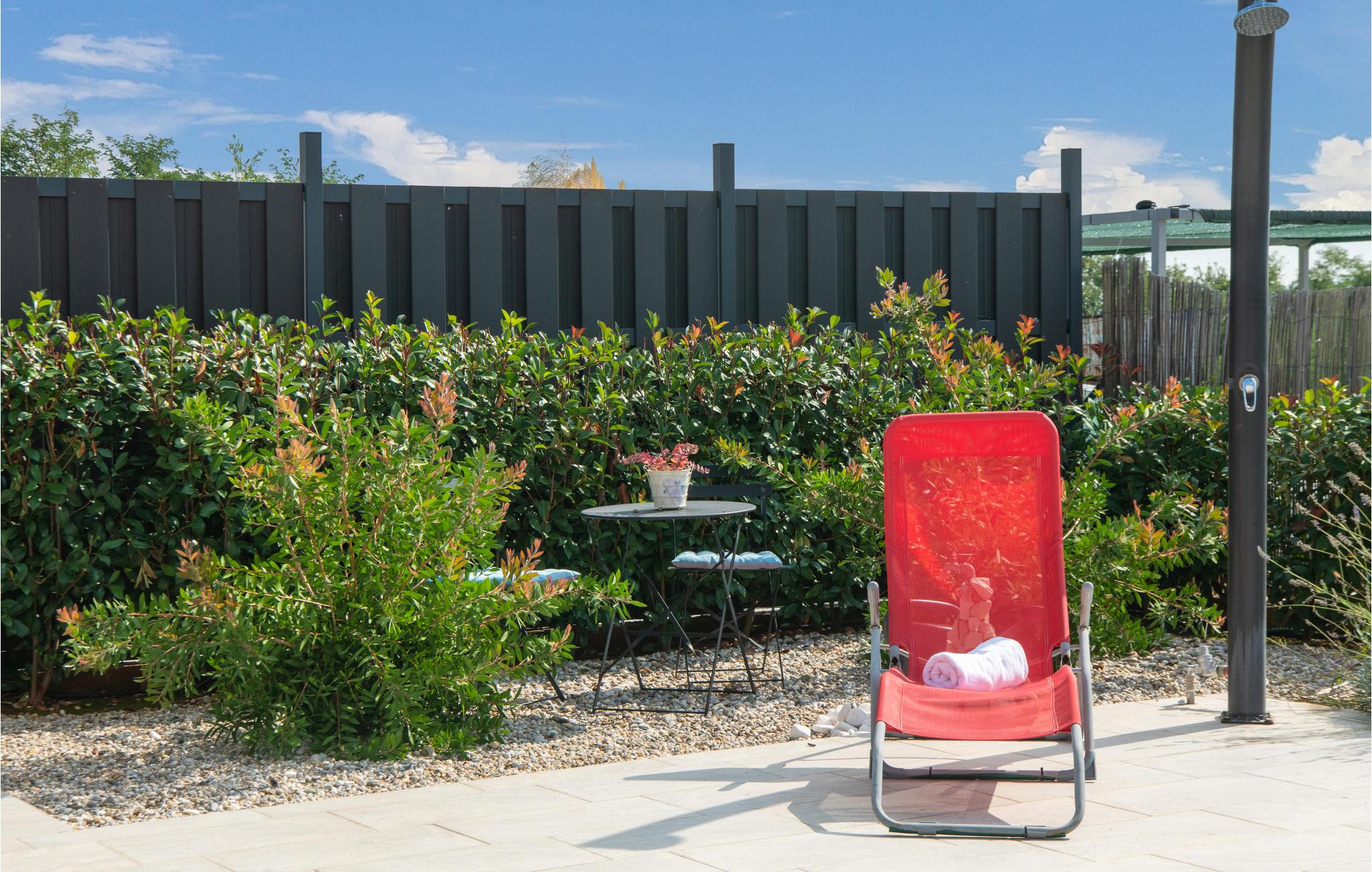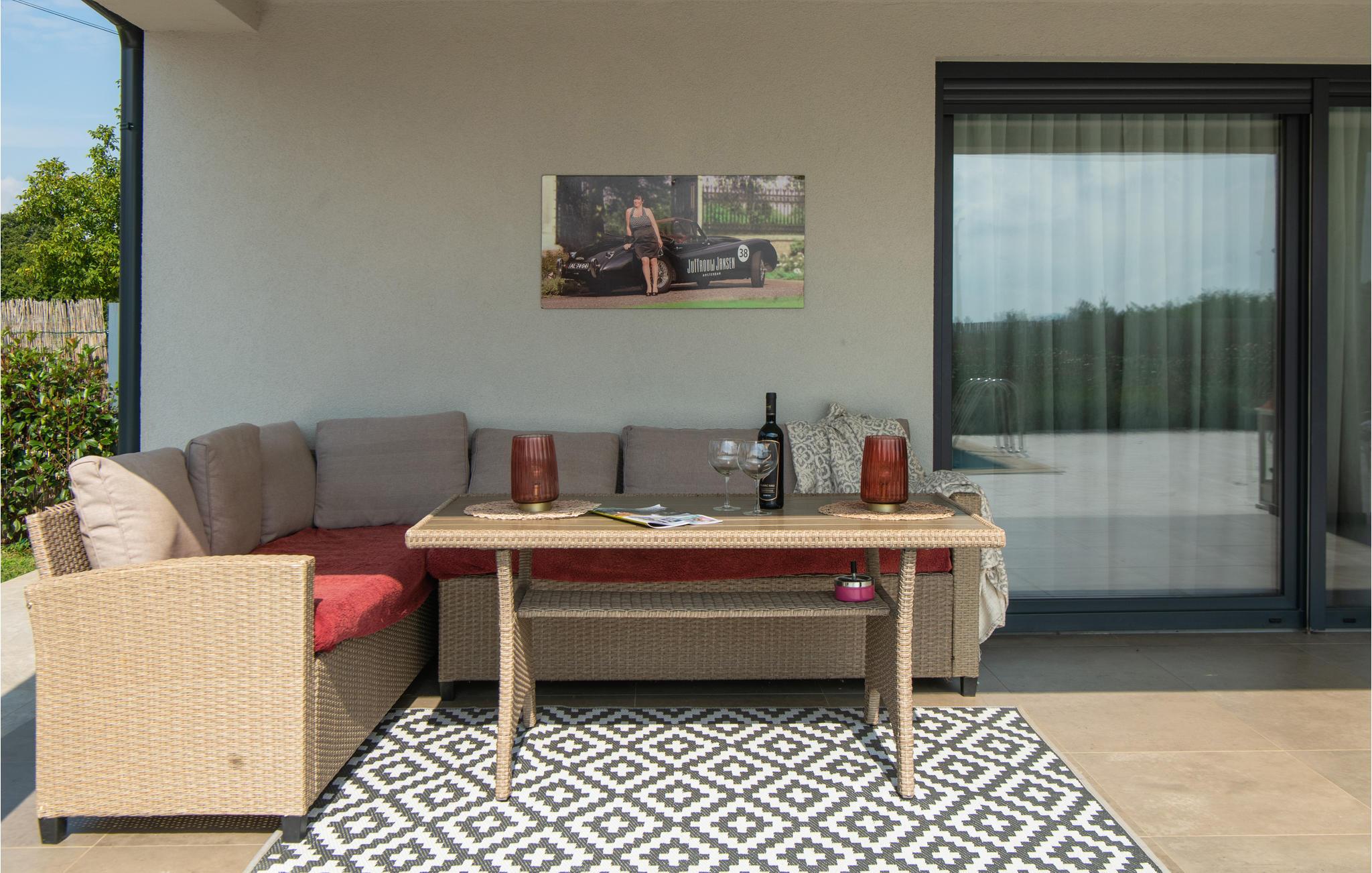 Nyd det behagelige klima og de milde sommeraftener på husets terrasse med komfortable havemøbler. Tilbrered lækre feriemåltider på grillen og køl ned i poolen, når I har lyst. Der er legeredskaber til jeres børn i haven.