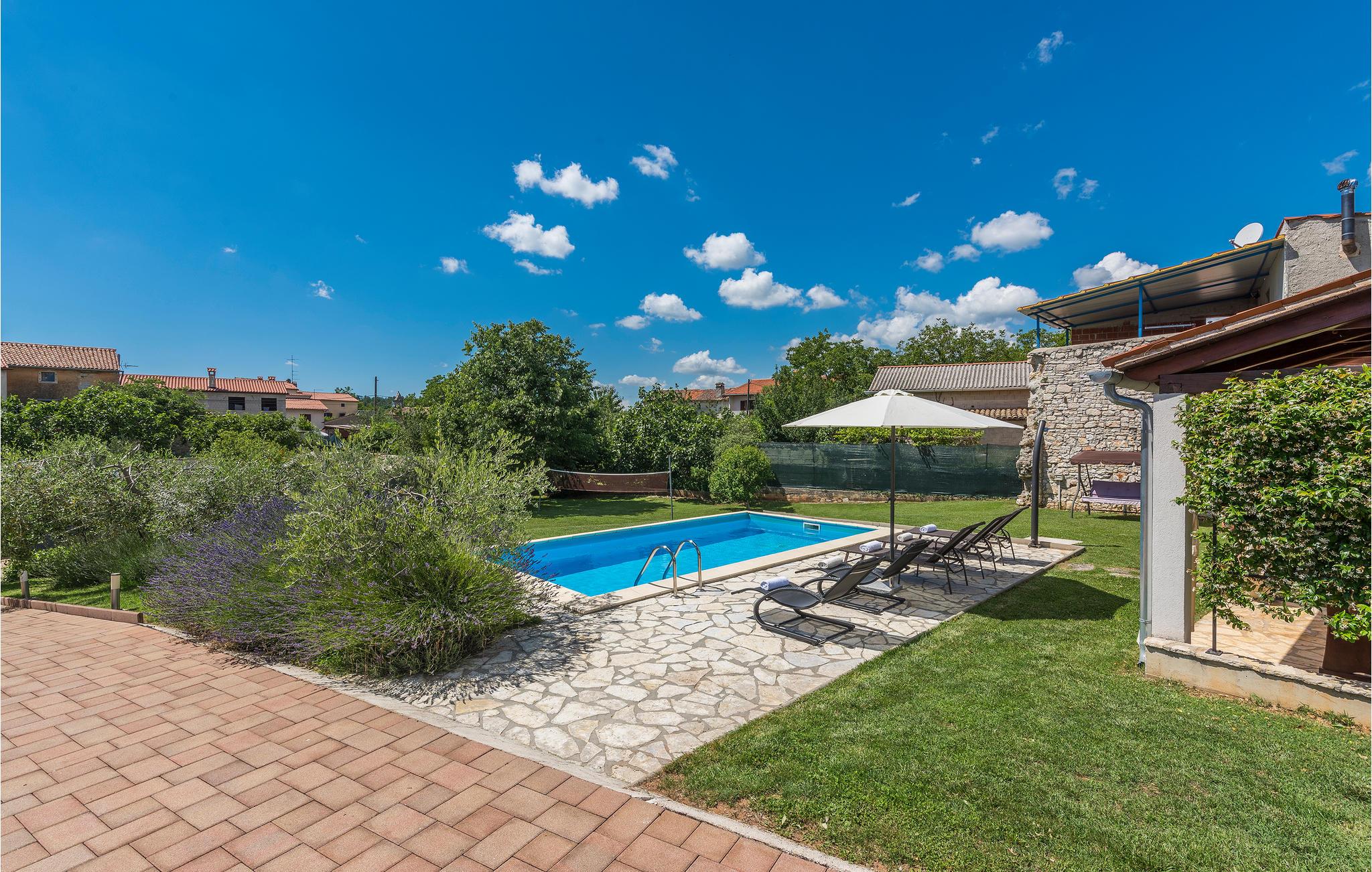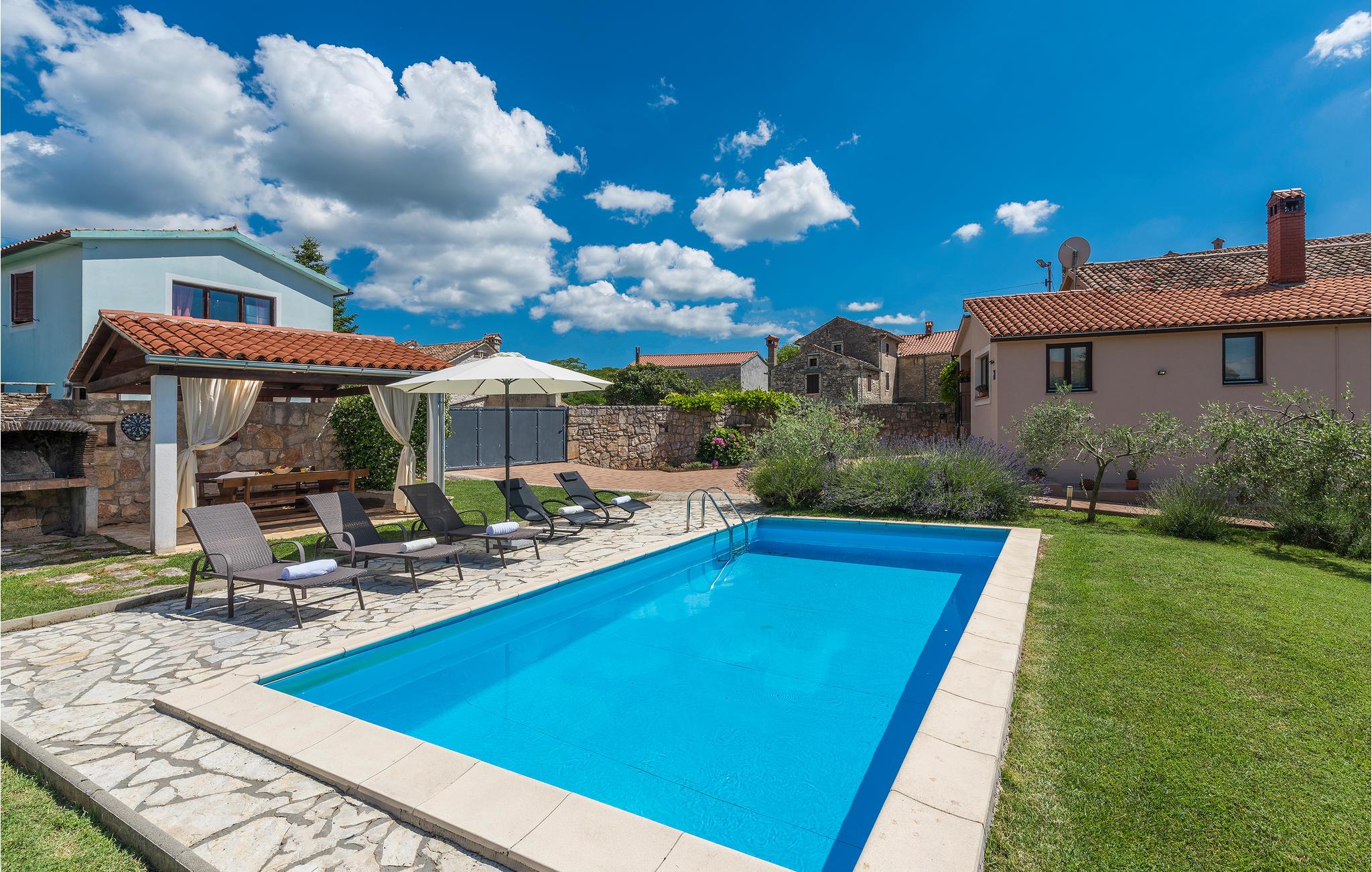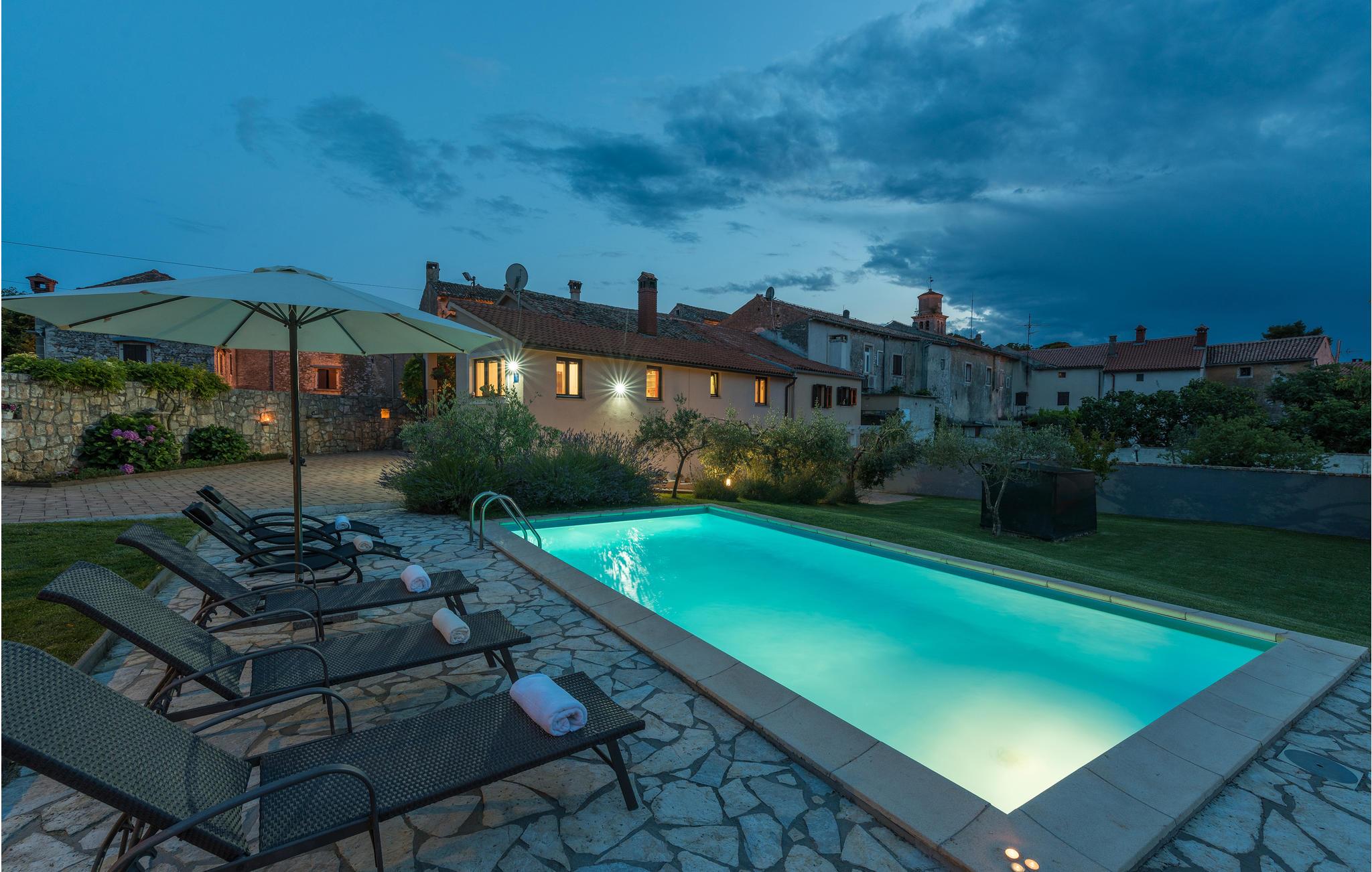 I den gamle bydel i en af de små istriske byer ligger dette dejlige feriehus. Området omkring huset har flere fordele: Her kan I både opleve seværdigheder fra antikken samt butikker, caféer og restauranter. Boligen strækker sig over førstesalen i huset. Huset råder over et veludstyret køkken, en klimatiseret opholdsstue, to soveværelser og et badeværelse. Interiøret er moderne, og indretningen er kvalitetsbevidst. Den store indhegnede grund indbyder til afslappende stunder ved siden af den lækre swimmingpool.