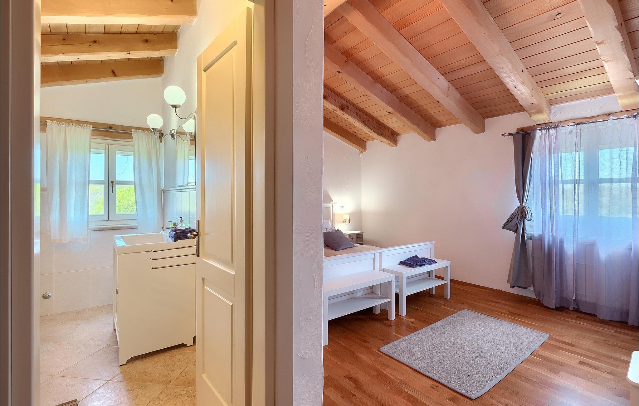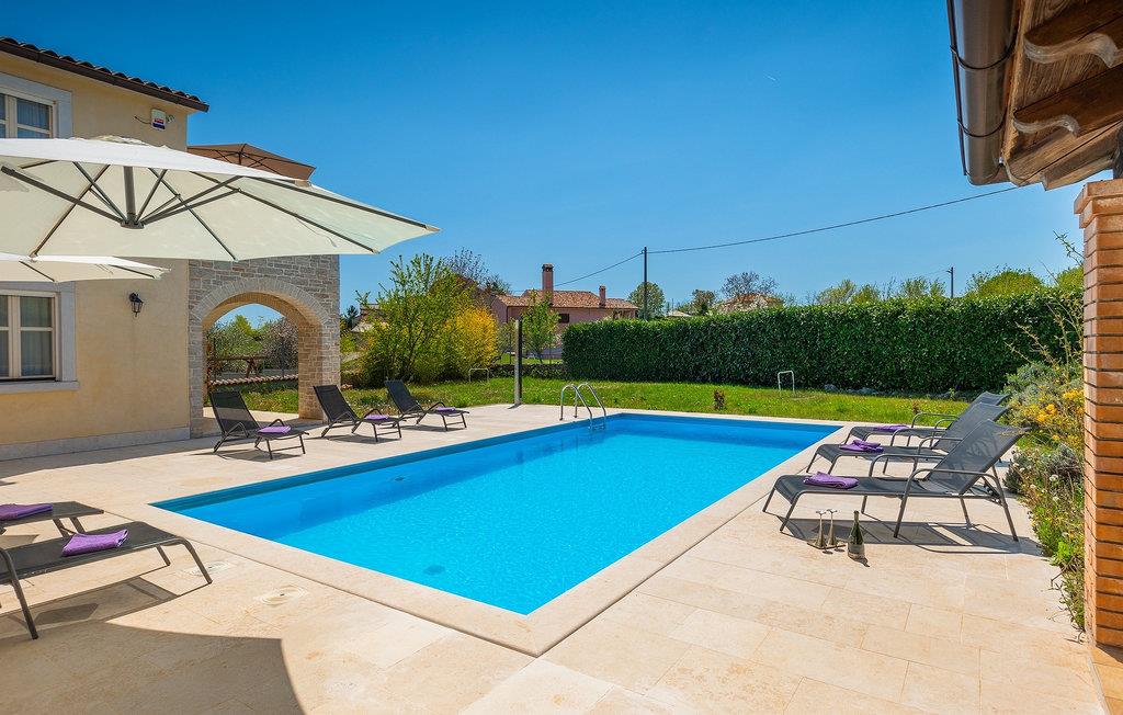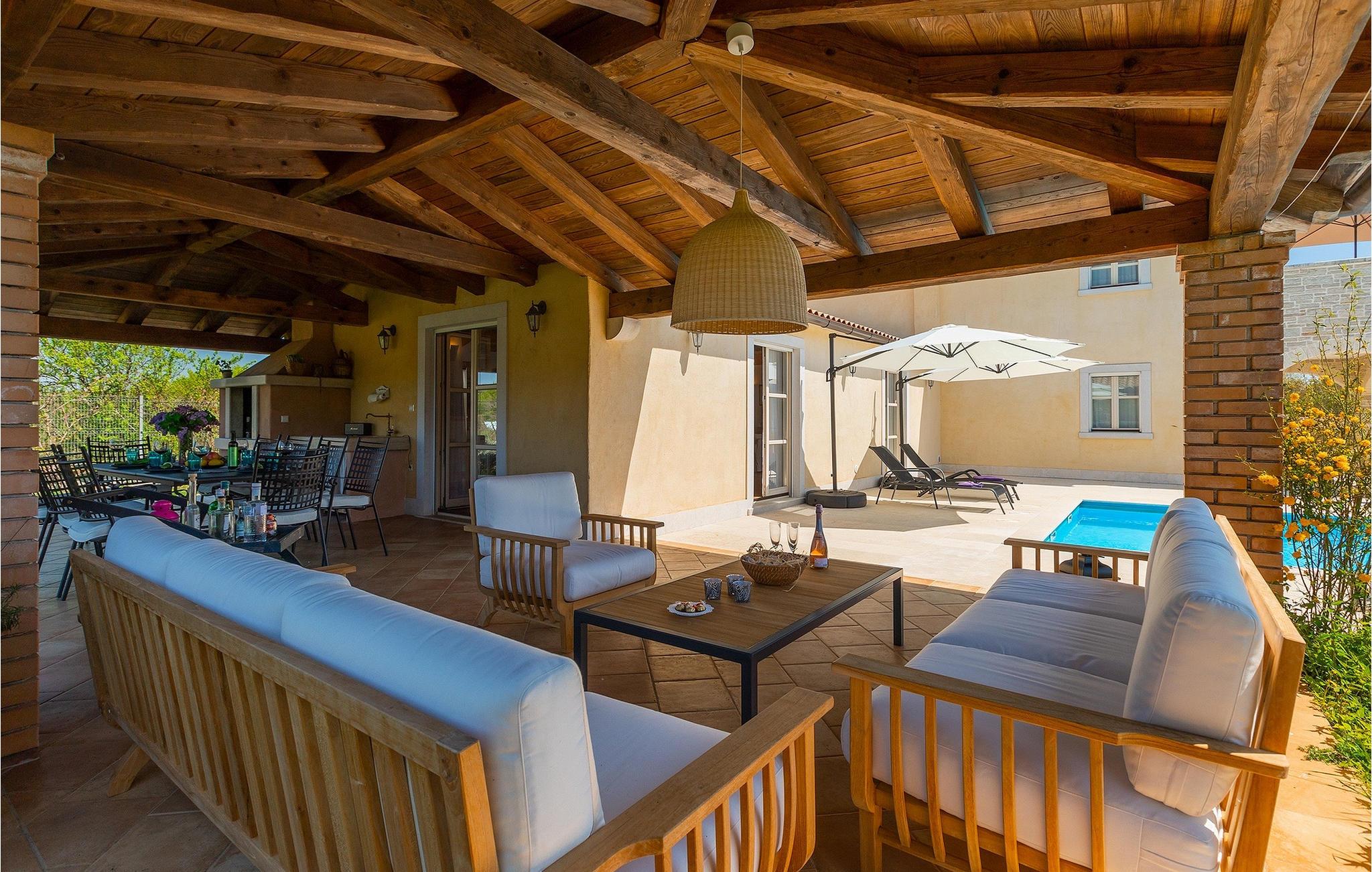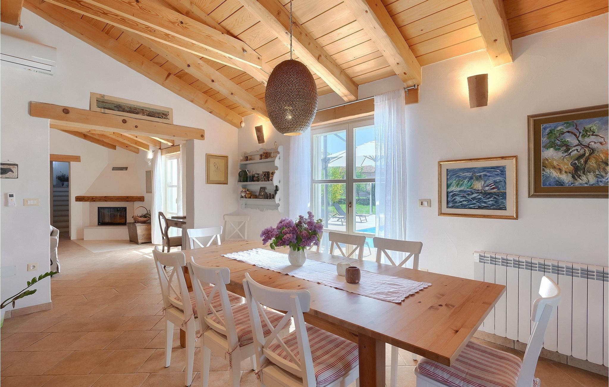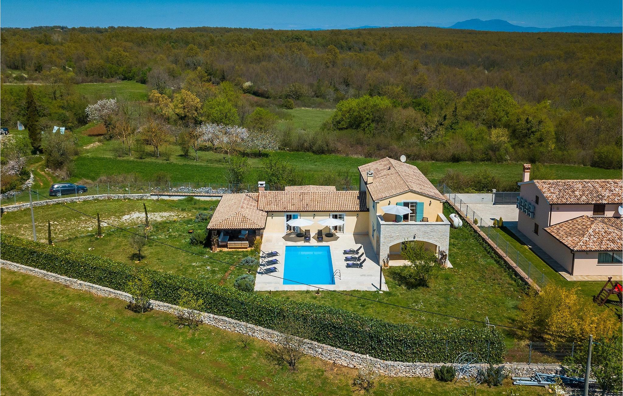 Den smukke Villa Lavanda Savicenta ligger i den lille landsby Rojnici i Barban kommune. Familievillaen kan i alt rumme op til 10 personer. Stueetagen består af en rummelig stue med pejs, en spiseplads, et fuldt udstyret køkken og to soveværelser med eget badeværelse. Ovenpå finder du yderligere to soveværelser, også med ensuite badeværelser. I alt har villaen 4 soveværelser, hvoraf to er udstyret med dobbeltseng og de to andre med to enkeltsenge. Foran villaen er en 40m2 privat pool, hvor du kan tage en forfriskende svømmetur eller slappe af på en af de komfortable liggestole. Ved siden af poolområdet er en overdækket spiseplads med en kulgrill, hvor du kan tilberede lækre måltider til din familie og venner. Villaen er det perfekte valg for en stor familie med børn eller en gruppe venner, der ønsker at tilbringe en afslappende ferie i Istrien. Den charmerende villa er beliggende i en lille landsby Rojnici, i kommunen Barban. Alle de nødvendige faciliteter såsom butikker, caféer og restauranter ligger i nærheden af villaen. Hvis du vil holde din ferie ved det turkise Adriaterhav, ligger den første strand 18 kilometer væk i Trget. Placeringen af villaen er et ideelt udgangspunkt for mange dagsture. Vi anbefaler, at du besøger kystbyer som Pula og dets storslåede amfiteater, Rovinj og mange farverige huse, og Porec med dens Euphrasian Basilica, som tilhører Unescos kulturarv. For alle naturelskere er en uundværlig destination at besøge den eneste nationalpark i Istrien, og det er Brijuni. Dette magiske sted vil glæde dig med smukke strande, uberørt natur og talrige dyreliv. Det centrale Istrien er ideelt for alle elskere af aktiv sport og gastronomi. Besøg dalen ved floden Mirna og adskillige byer på bakkerne, såsom Motovun, Grožnjan og Buzet.