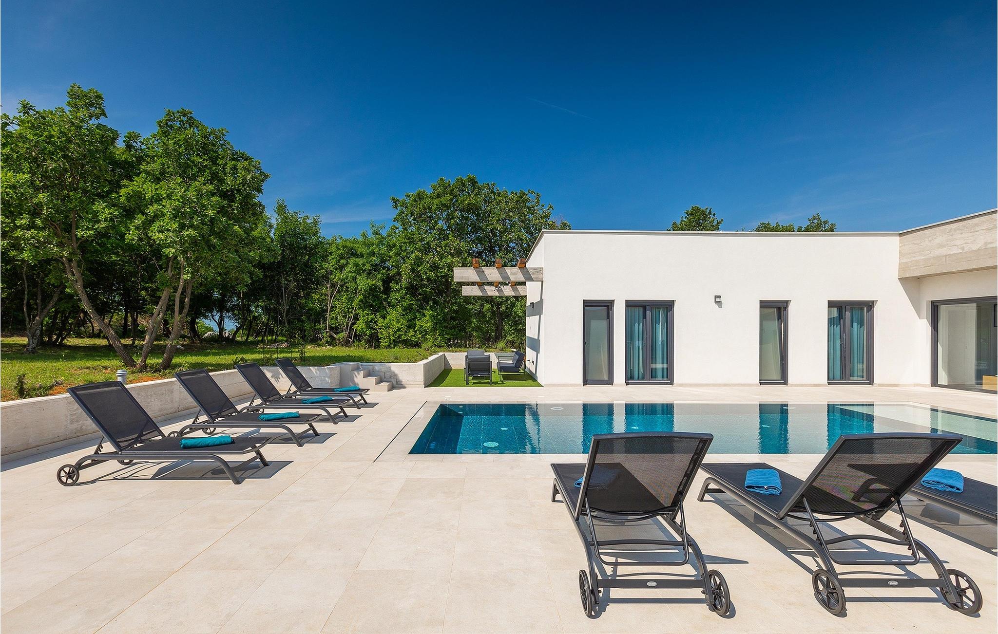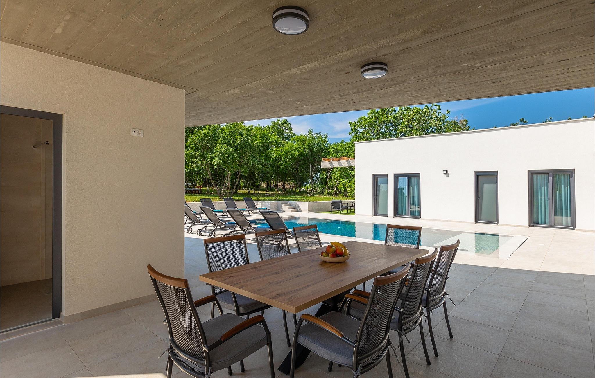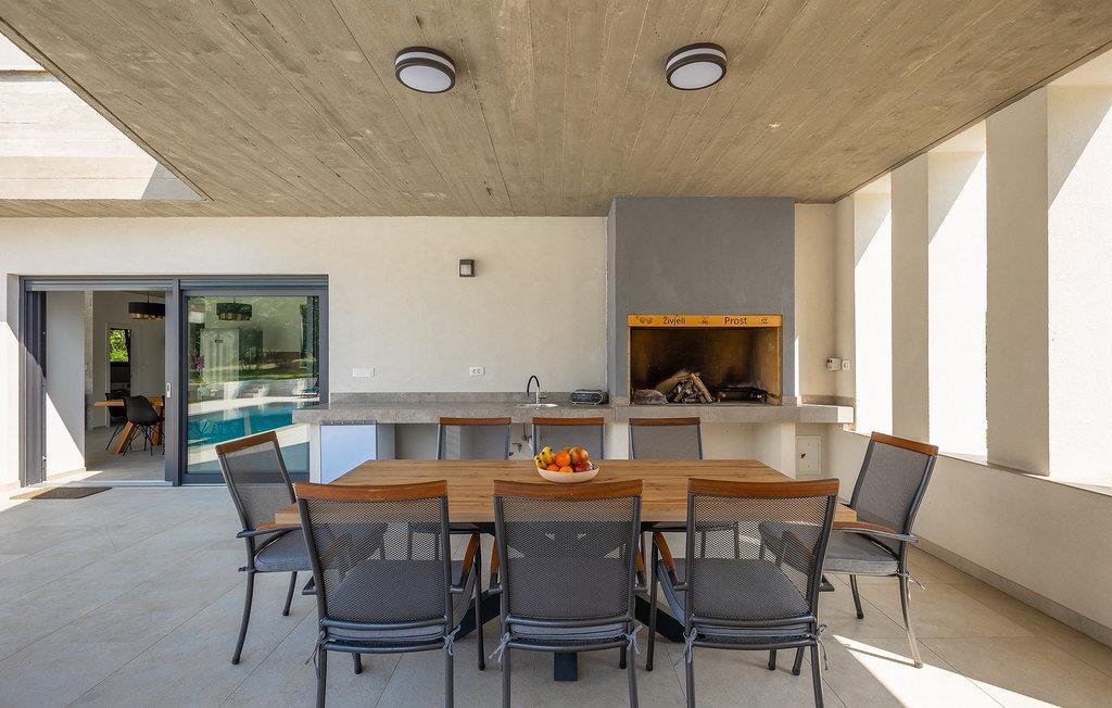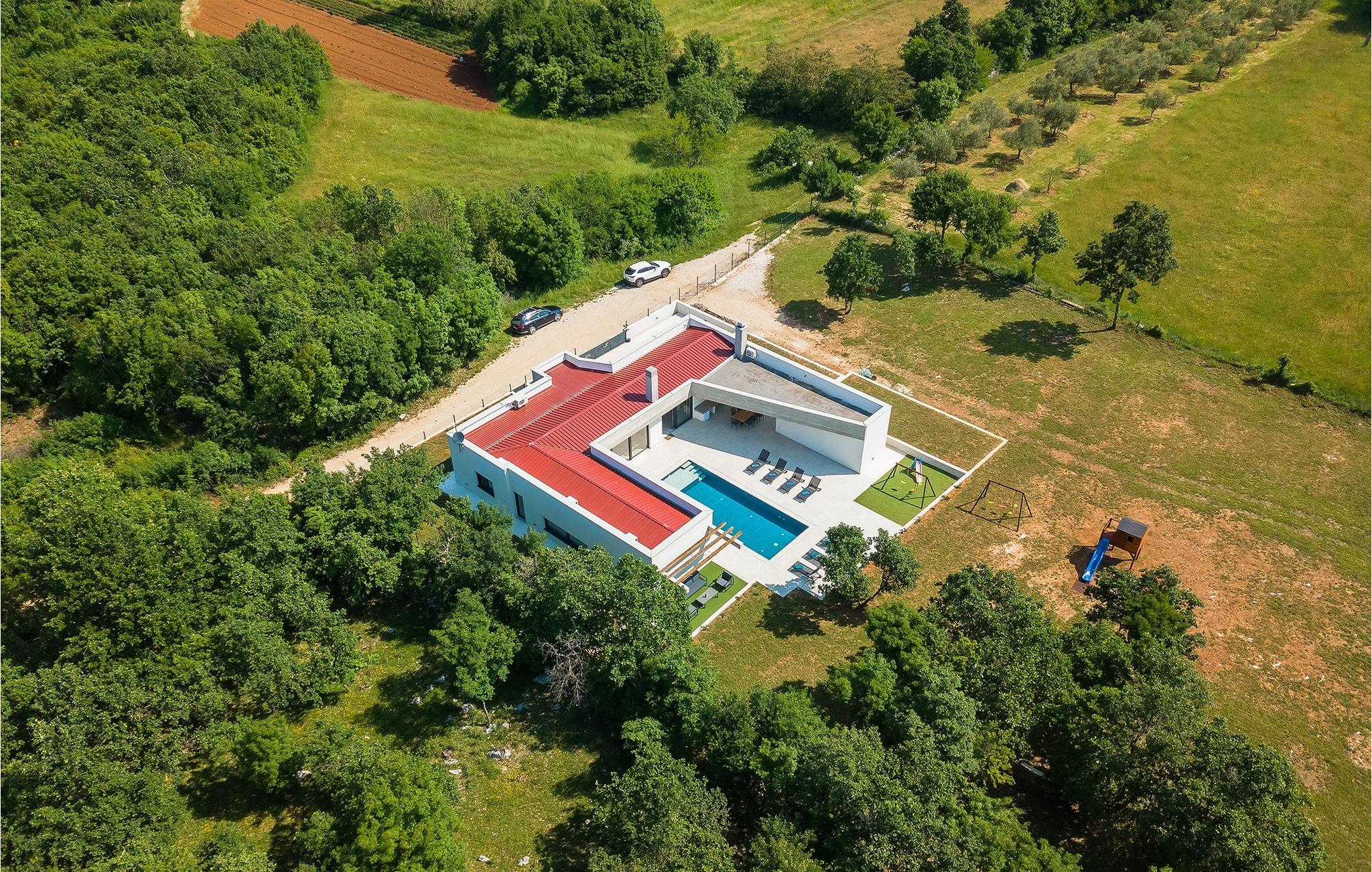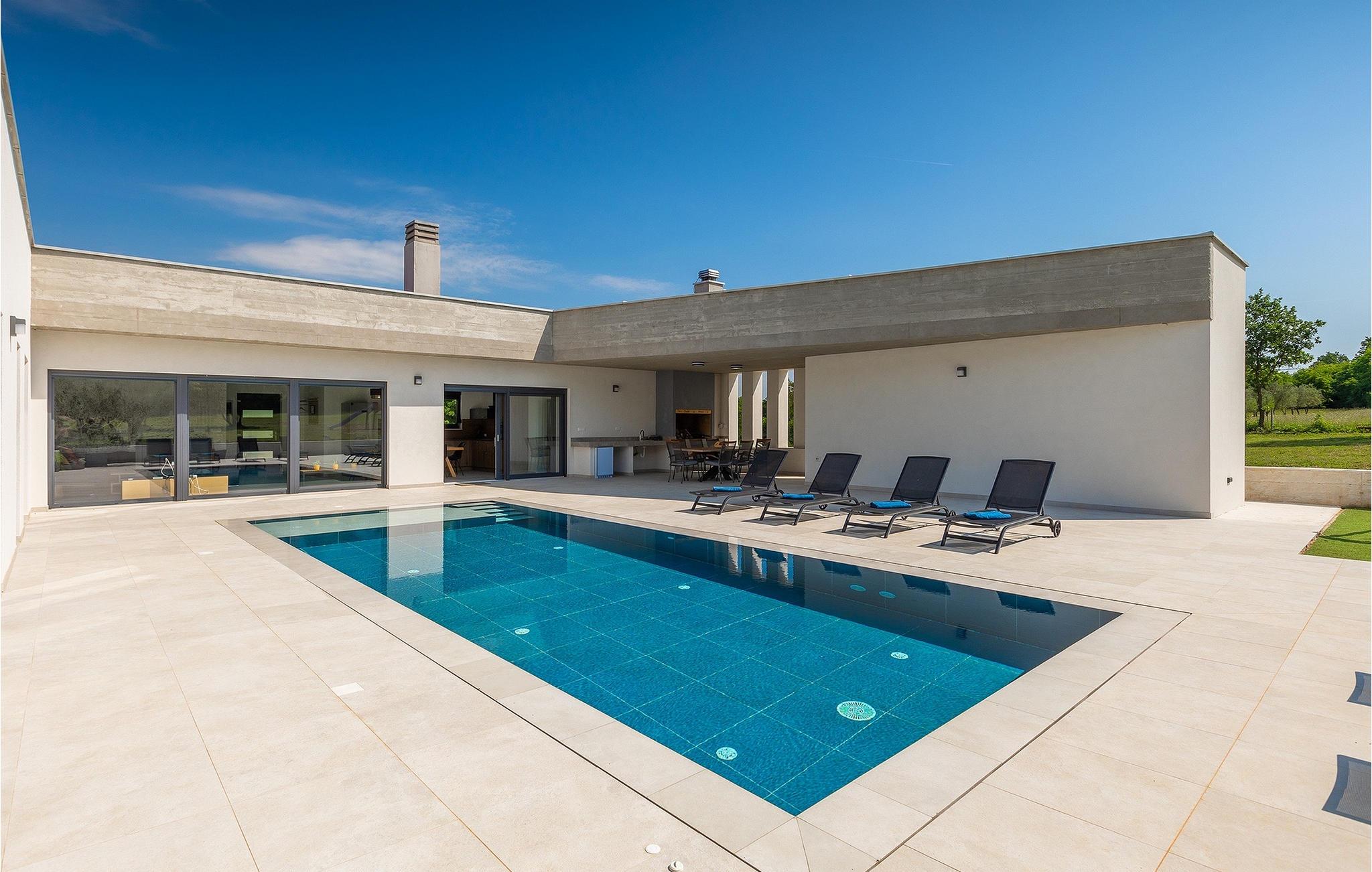 Villa Bateli ist eine modern eingerichtete und charmante einstöckige Villa, deren Außenbereich sich bis zu 4000 m2 erstreckt. Im Außenbereich befindet sich ein privater Pool, in dem Sie mit Ihren Liebsten schwimmen oder auf Liegestühlen die Sonnenstrahlen genießen können. Es gibt auch einen Ruhebereich mit einem großen Tisch, an dem Sie sich mit einem erfrischenden Getränk mit Blick auf den Pool abkühlen können. Während Sie sich ausruhen, können die anderen versuchen, köstliche istrische Köstlichkeiten auf dem Grill in der Sommerküche zuzubereiten, um die beliebte Gastronomie dieser Region zu erleben. Die Terrasse bietet einen Blick auf die idyllische istrische Landschaft, die von roter Erde und Wald charakterisiert ist. Von der Terrasse aus gelangt man direkt in das Innere des einstöckigen Hauses, wo sich ein lichtdurchflutetes Wohnzimmer, eine voll ausgestattete Küche und ein Esszimmer befinden, und im Anschluss ein Flur, der zu den anderen Räumen führt. Im Anschluss des Flures befinden sich 4 komfortable Schlafzimmer, die einen ruhigen und erholsamen Schlaf bieten, einige davon mit direktem Ausgang und Blick auf den Pool. Jedes Zimmer verfügt über ein eigenes Bad. Wenn Sie eine Villa für Ihren Traumurlaub in der Region Istrien suchen, buchen Sie die Villa Bateli und sichern Sie sich einen unvergesslichen Urlaub für sich und Ihre Lieben!Die Villa Bateli liegt in der Nähe der beliebten istrischen Städte Labin und Rabac, die für ihre Restaurants mit istrischen Köstlichkeiten und Kunstateliers bekannt sind. Bei Tagesausflügen können Sie die wunderschöne Landschaft Istriens genießen, einige Vorschläge sind Küstenstädte wie Pula, Porec, Rovinj oder Motovun. Aufgrund seiner begehrten zentralen Lage für Adrenalinliebhaber befindet sich der Adrenalinpark Galvani in der Nähe, wo Sie Aktivitäten wie Kajakfahren, Quadfahren, Safaris, Radfahren und Wandern auf bekannten Wegen durch die idyllische Natur ausprobieren können. Für Liebhaber der Gastronomie ist die Verkostung istrischer Köstlichkeiten - istrischer Malvasia, Prosciutto und Pasta mit Trüffeln, für die diese Region berühmt ist, ein Muss.
