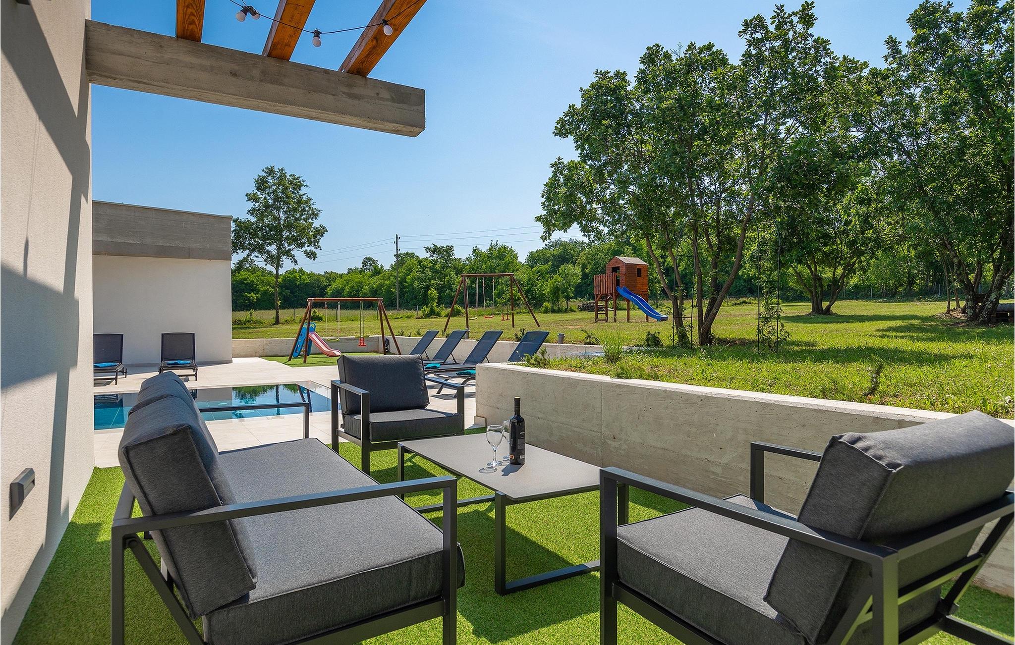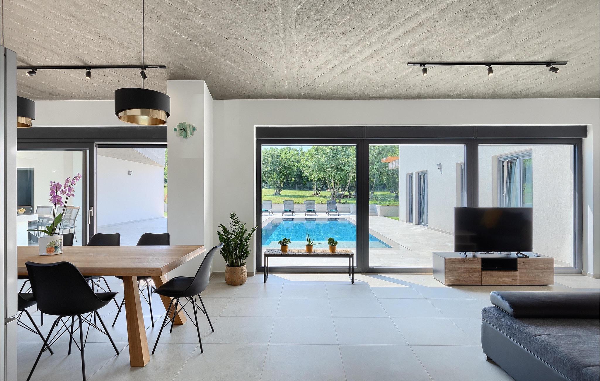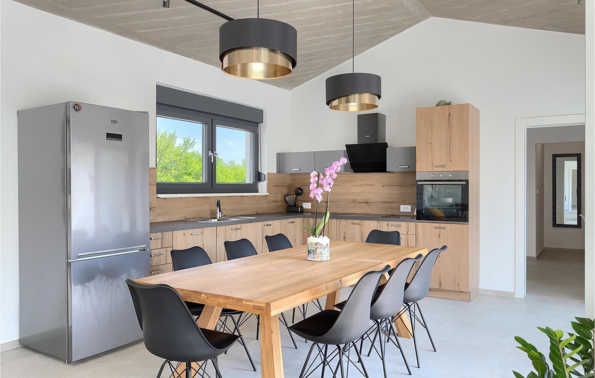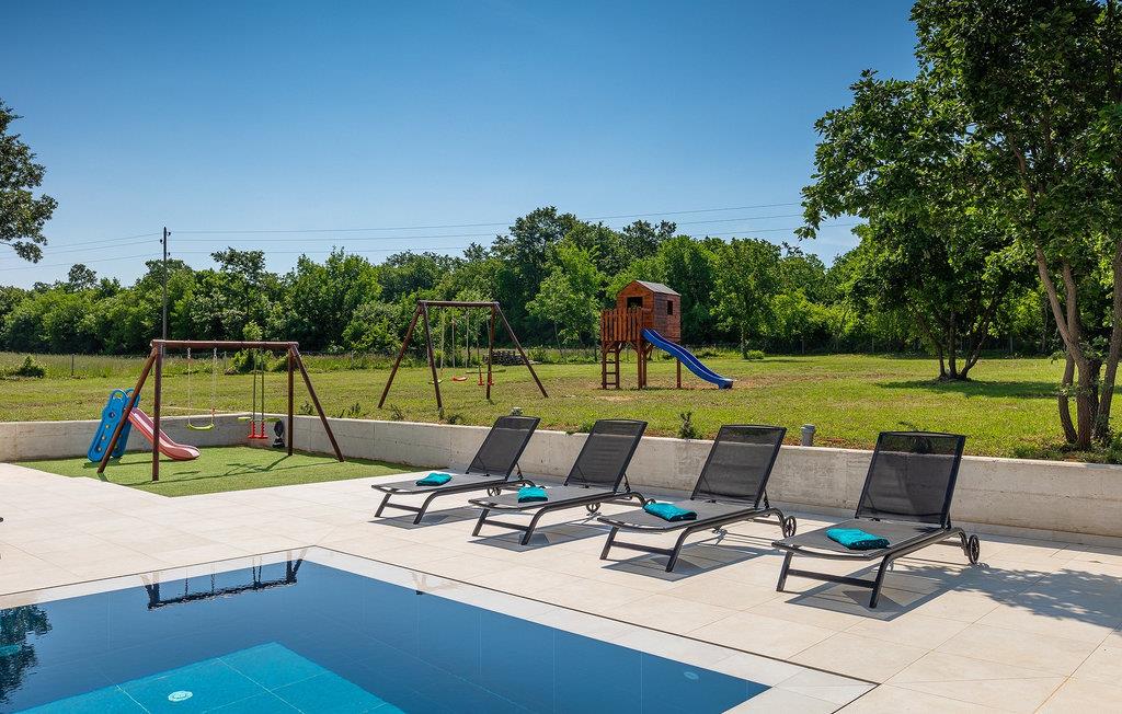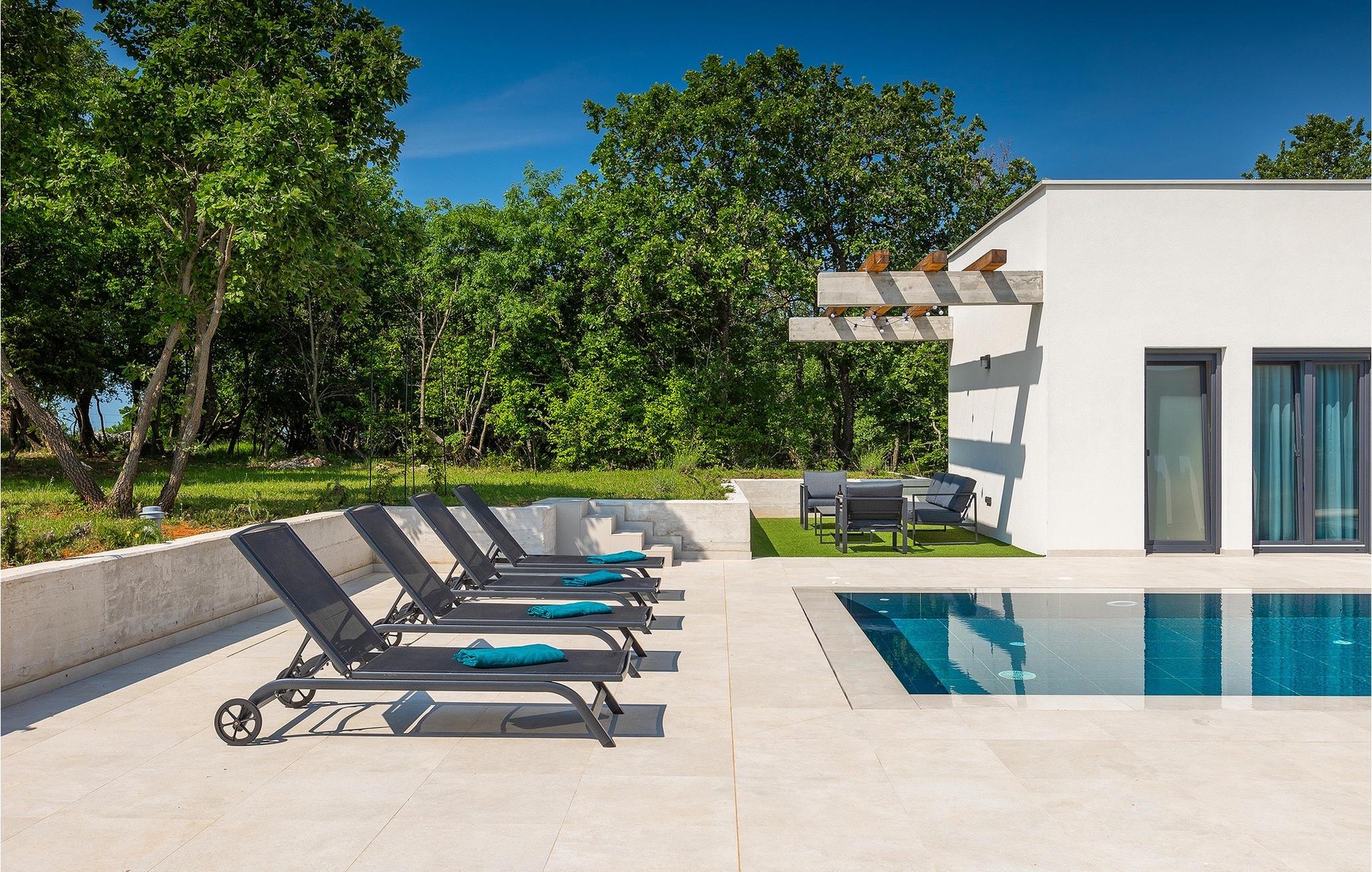 Villa Bateli ist eine modern eingerichtete und charmante einstöckige Villa, deren Außenbereich sich bis zu 4000 m2 erstreckt. Im Außenbereich befindet sich ein privater Pool, in dem Sie mit Ihren Liebsten schwimmen oder auf Liegestühlen die Sonnenstrahlen genießen können. Es gibt auch einen Ruhebereich mit einem großen Tisch, an dem Sie sich mit einem erfrischenden Getränk mit Blick auf den Pool abkühlen können. Während Sie sich ausruhen, können die anderen versuchen, köstliche istrische Köstlichkeiten auf dem Grill in der Sommerküche zuzubereiten, um die beliebte Gastronomie dieser Region zu erleben. Die Terrasse bietet einen Blick auf die idyllische istrische Landschaft, die von roter Erde und Wald charakterisiert ist. Von der Terrasse aus gelangt man direkt in das Innere des einstöckigen Hauses, wo sich ein lichtdurchflutetes Wohnzimmer, eine voll ausgestattete Küche und ein Esszimmer befinden, und im Anschluss ein Flur, der zu den anderen Räumen führt. Im Anschluss des Flures befinden sich 4 komfortable Schlafzimmer, die einen ruhigen und erholsamen Schlaf bieten, einige davon mit direktem Ausgang und Blick auf den Pool. Jedes Zimmer verfügt über ein eigenes Bad. Wenn Sie eine Villa für Ihren Traumurlaub in der Region Istrien suchen, buchen Sie die Villa Bateli und sichern Sie sich einen unvergesslichen Urlaub für sich und Ihre Lieben!Die Villa Bateli liegt in der Nähe der beliebten istrischen Städte Labin und Rabac, die für ihre Restaurants mit istrischen Köstlichkeiten und Kunstateliers bekannt sind. Bei Tagesausflügen können Sie die wunderschöne Landschaft Istriens genießen, einige Vorschläge sind Küstenstädte wie Pula, Porec, Rovinj oder Motovun. Aufgrund seiner begehrten zentralen Lage für Adrenalinliebhaber befindet sich der Adrenalinpark Galvani in der Nähe, wo Sie Aktivitäten wie Kajakfahren, Quadfahren, Safaris, Radfahren und Wandern auf bekannten Wegen durch die idyllische Natur ausprobieren können. Für Liebhaber der Gastronomie ist die Verkostung istrischer Köstlichkeiten - istrischer Malvasia, Prosciutto und Pasta mit Trüffeln, für die diese Region berühmt ist, ein Muss.