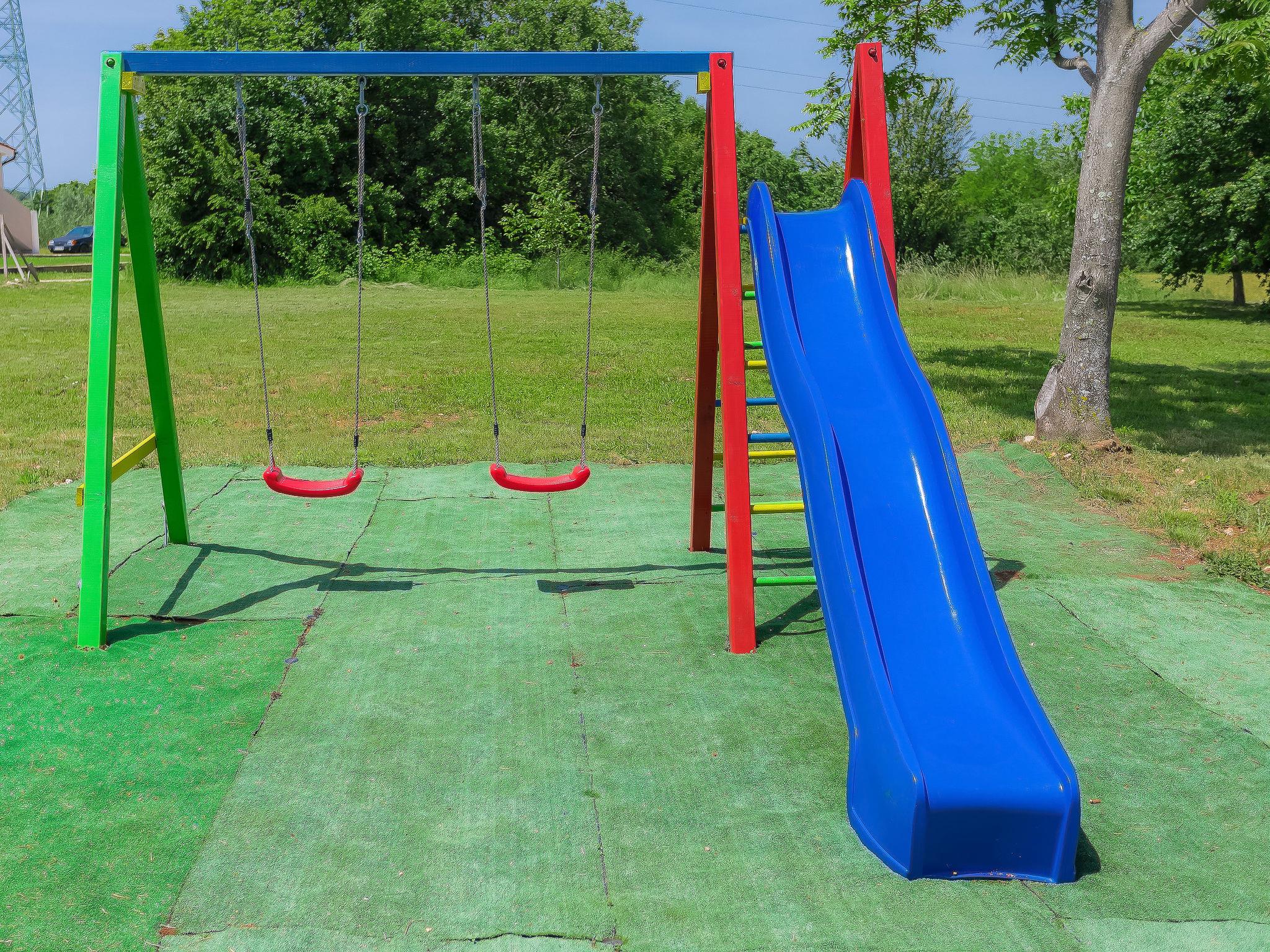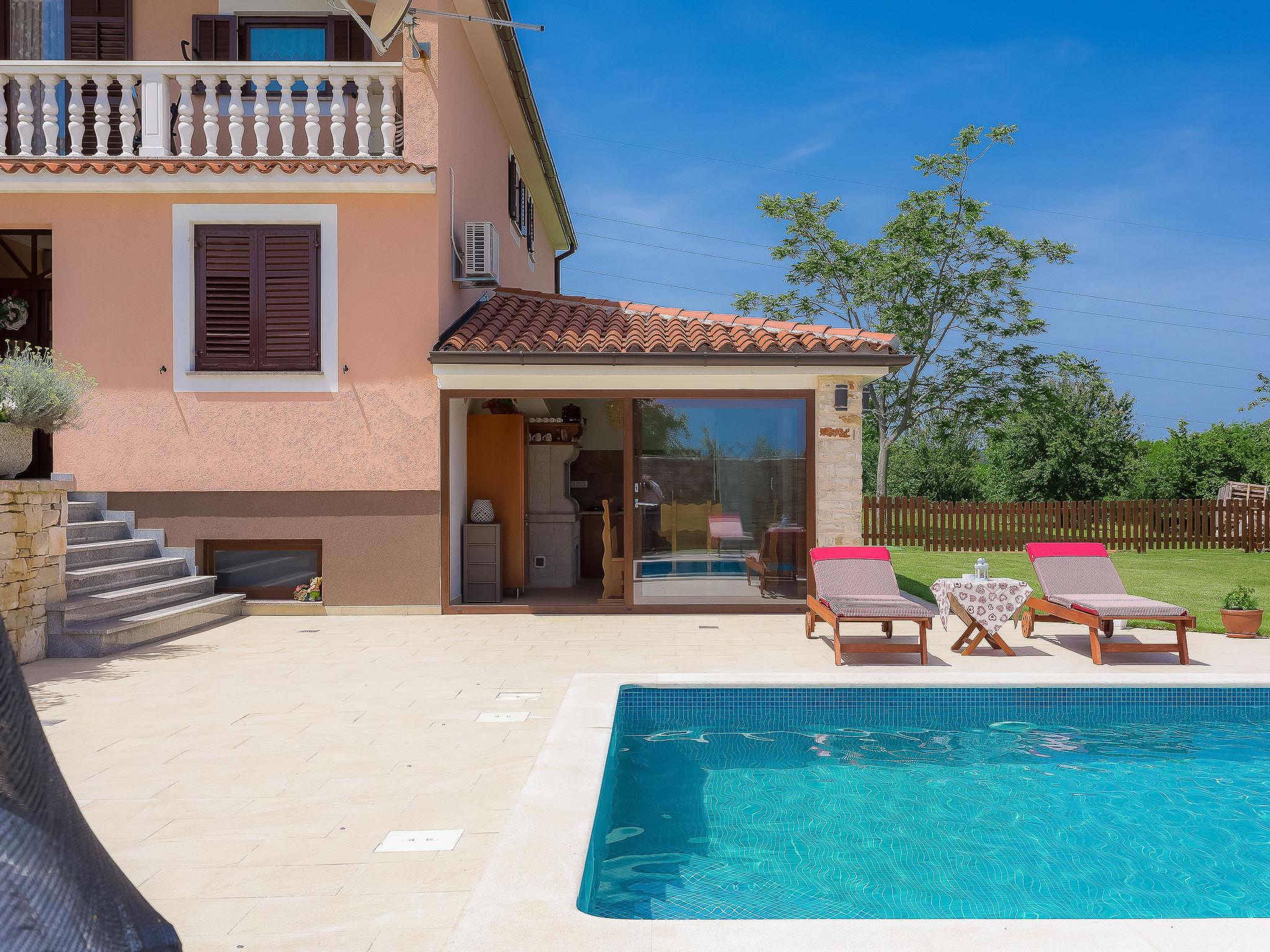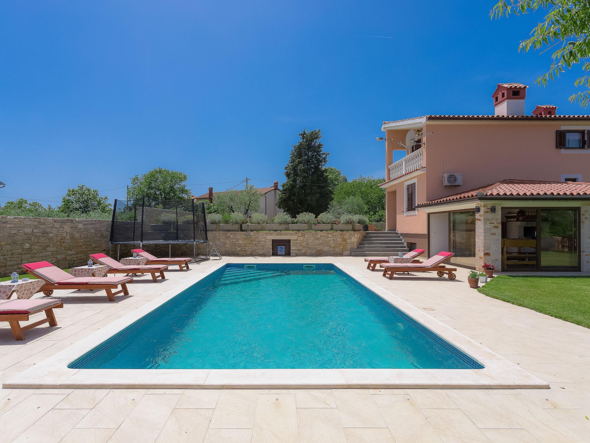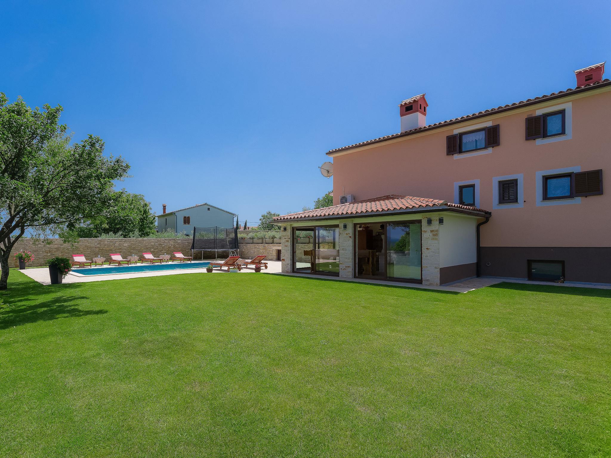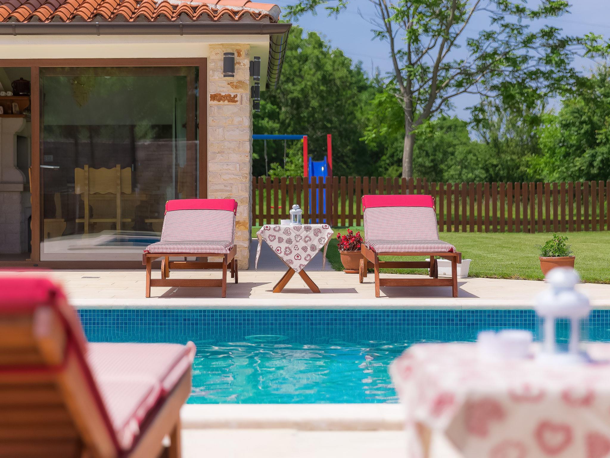 Beautiful single-family house "Mirjana", 2 storeys. In the hamlet Frkeci 2 km from the centre of Barban, 20 km from the centre of Rabac, in a quiet, sunny position, 10 km from the sea. Private: property 1'500 m2 (fenced), beautiful garden with lawn and wildlife garden, swimming pool angular (10 x 4 m, depth 150 cm, seasonal availability: 27.Apr. - 28.Sep.) with internal staircase. Outdoor shower, pool house with fridge and cooking stove, terrace (30 m2), garden furniture, barbecue, children's playground (slide, swing). In the house: internet access, sauna, trampoline, washing machine. Parking (for 3 cars) at the house on the premises. Shop 2 km, supermarket 12 km, restaurant 2 km, bus stop 2.2 km, pebble beach 12 km, rocky beach 10 km. Riding stable 9 km, walking paths from the house 500 m, cycle lane 550 m. Nearby attractions: adrenalin park 8 km. Groups of teenagers on request only.