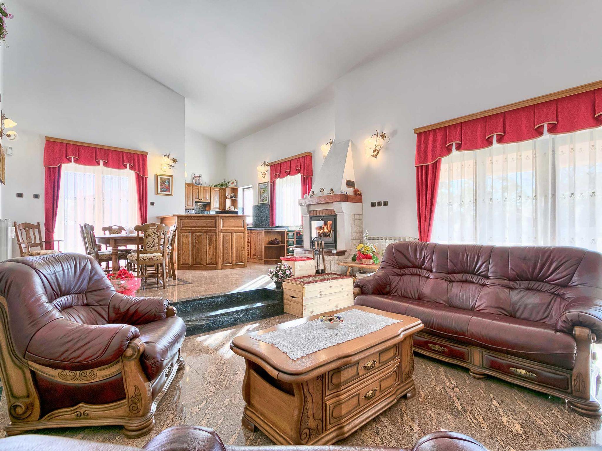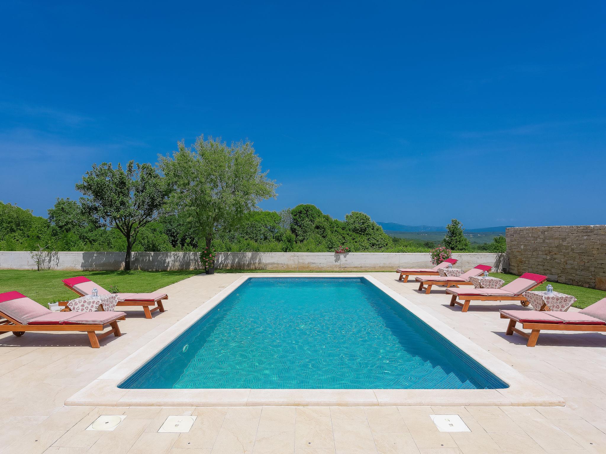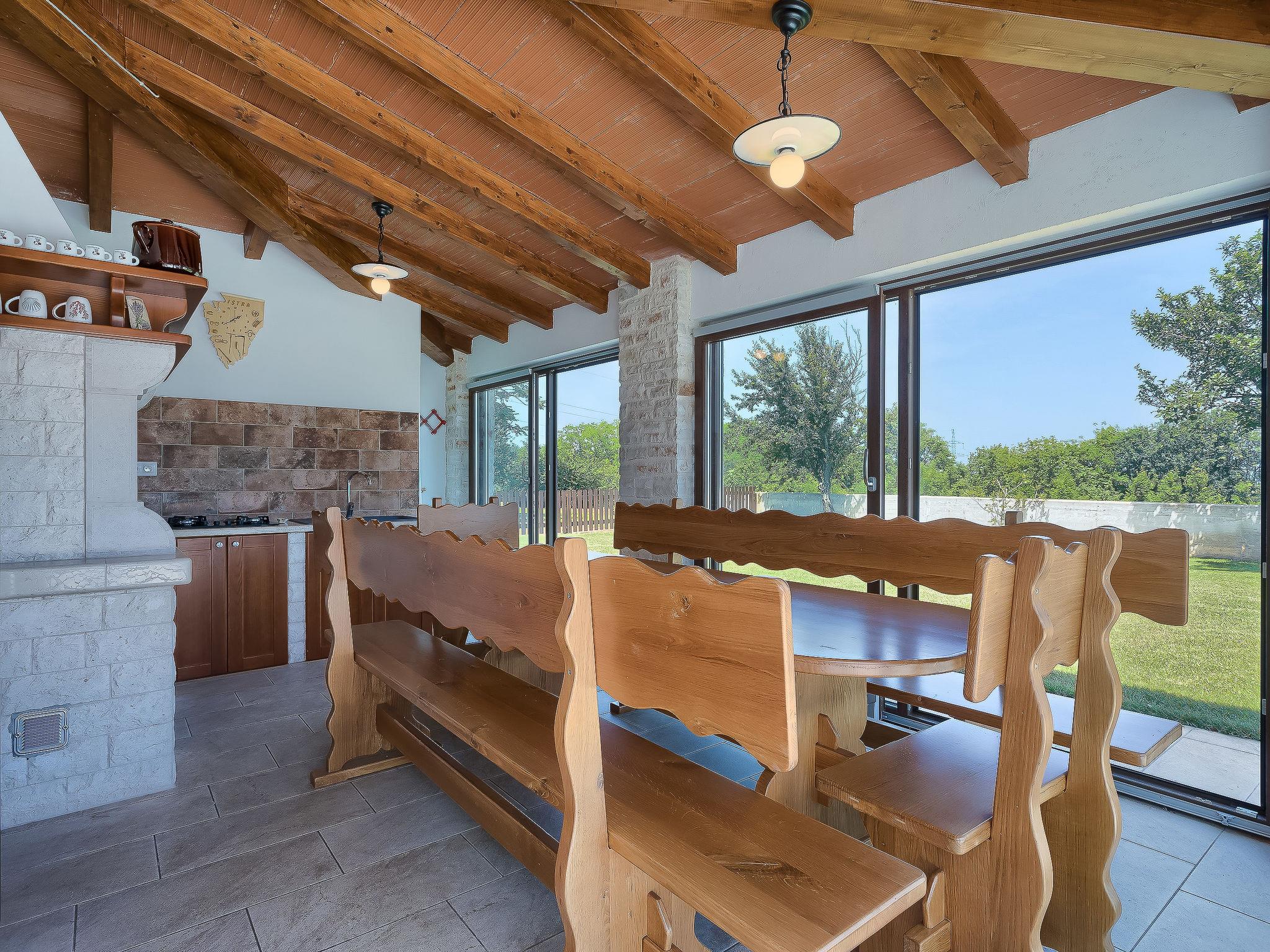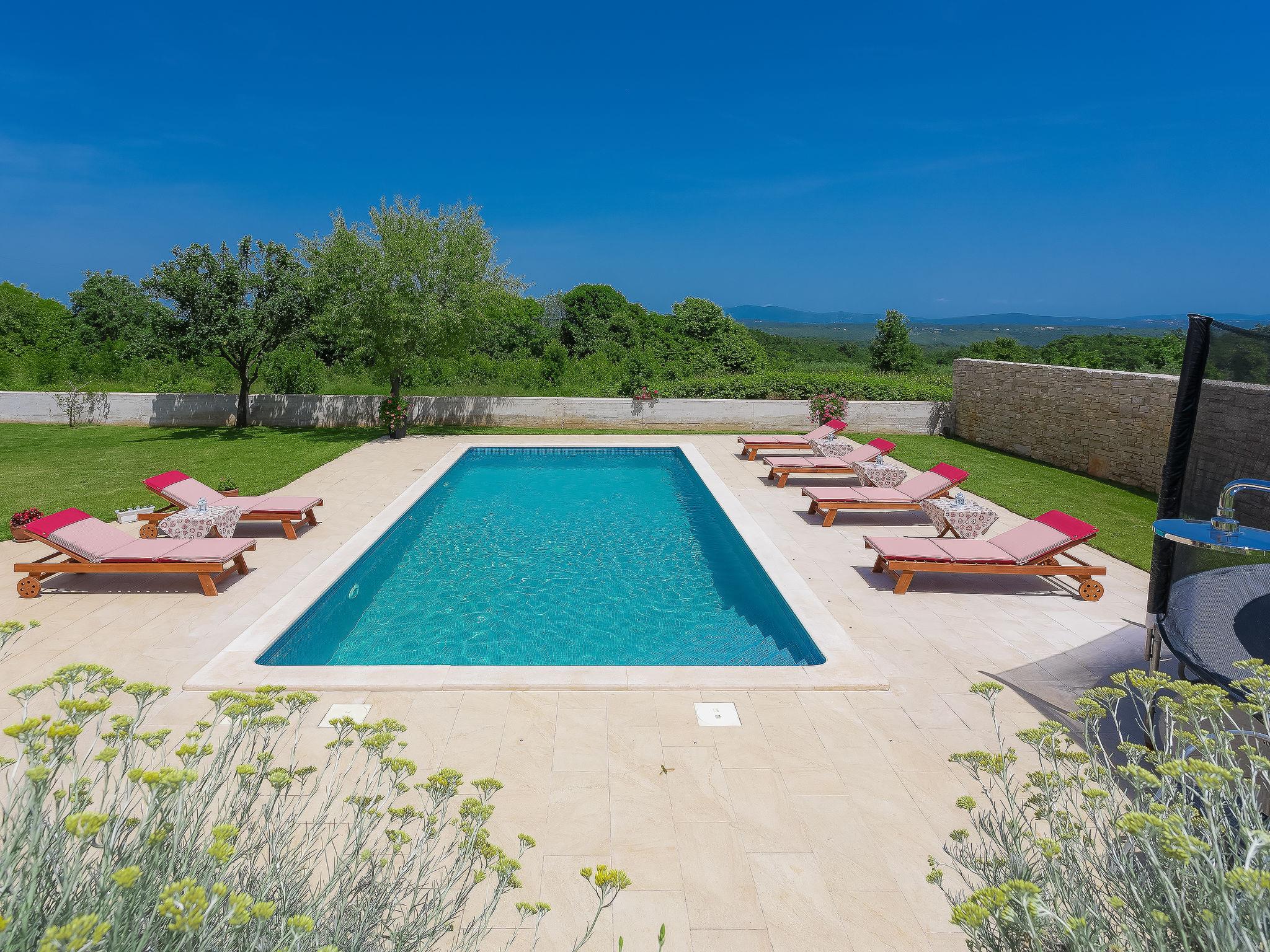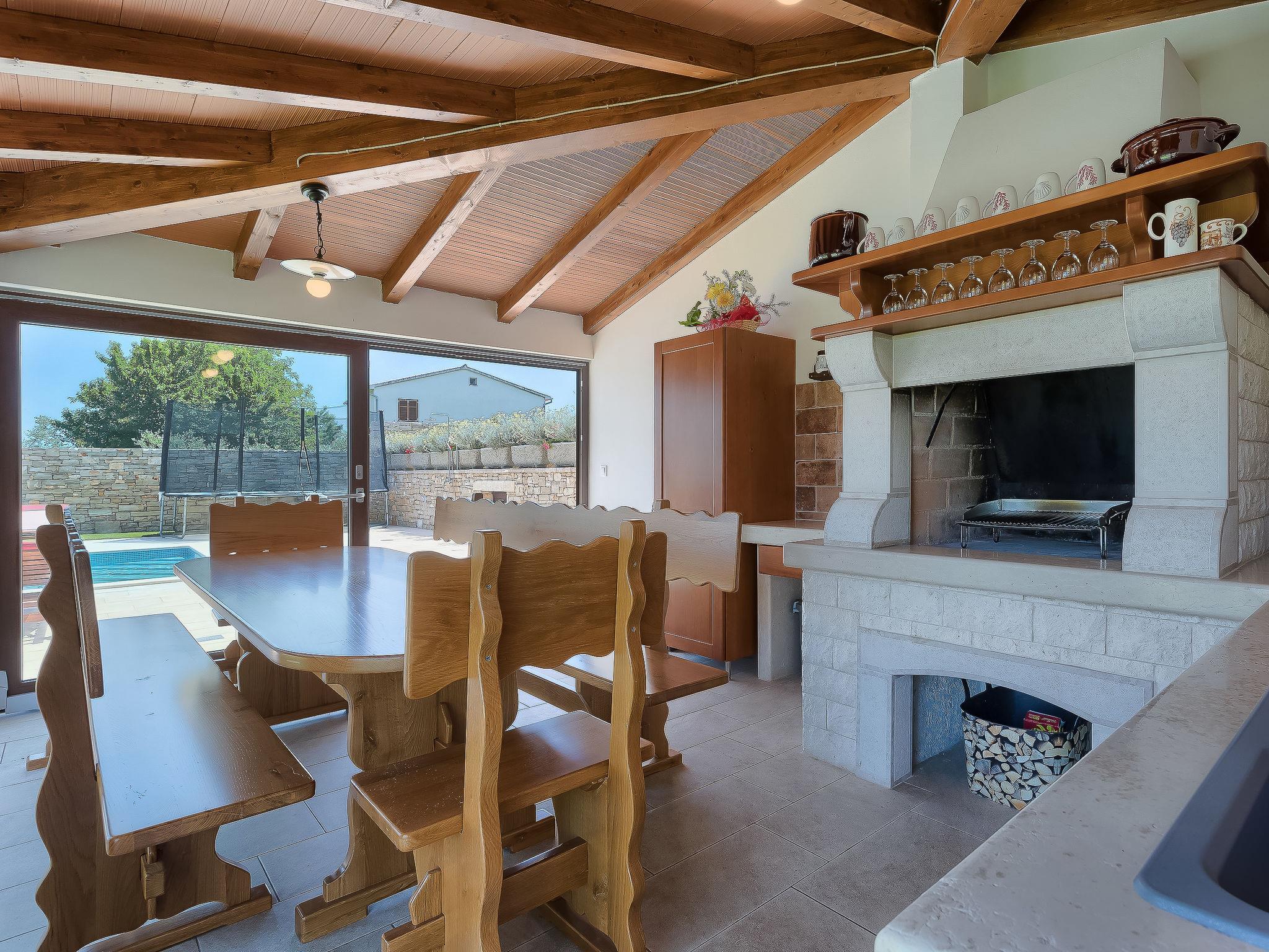 Beautiful single-family house "Mirjana", 2 storeys. In the hamlet Frkeci 2 km from the centre of Barban, 20 km from the centre of Rabac, in a quiet, sunny position, 10 km from the sea. Private: property 1'500 m2 (fenced), beautiful garden with lawn and wildlife garden, swimming pool angular (10 x 4 m, depth 150 cm, seasonal availability: 27.Apr. - 28.Sep.) with internal staircase. Outdoor shower, pool house with fridge and cooking stove, terrace (30 m2), garden furniture, barbecue, children's playground (slide, swing). In the house: internet access, sauna, trampoline, washing machine. Parking (for 3 cars) at the house on the premises. Shop 2 km, supermarket 12 km, restaurant 2 km, bus stop 2.2 km, pebble beach 12 km, rocky beach 10 km. Riding stable 9 km, walking paths from the house 500 m, cycle lane 550 m. Nearby attractions: adrenalin park 8 km. Groups of teenagers on request only.
