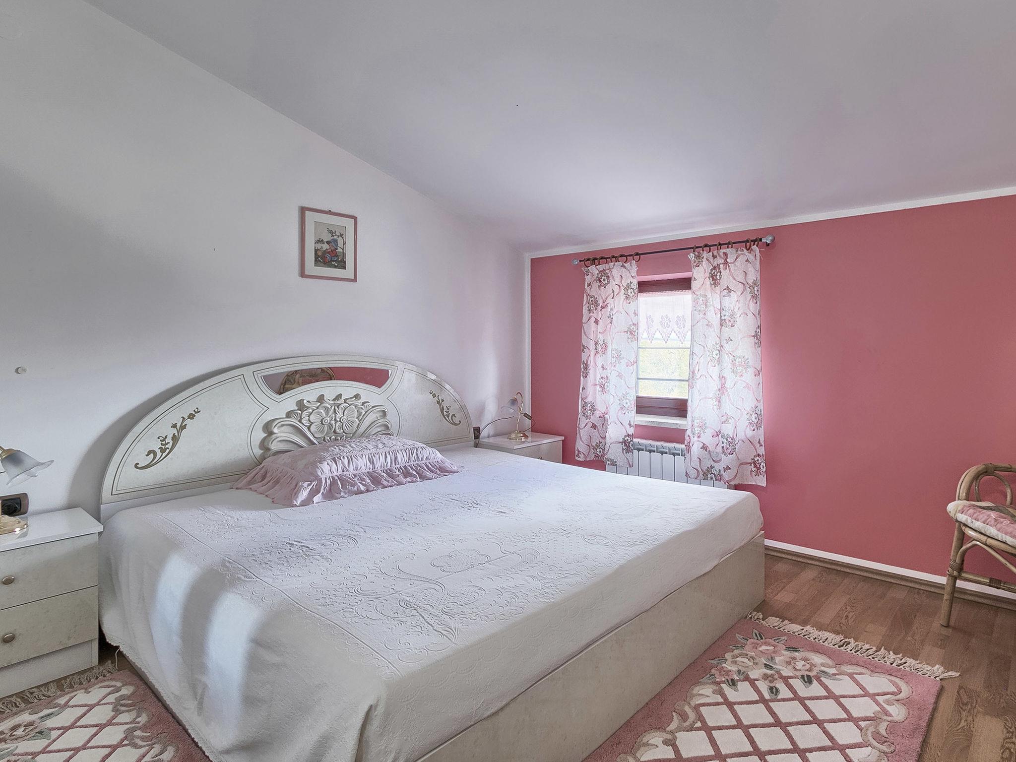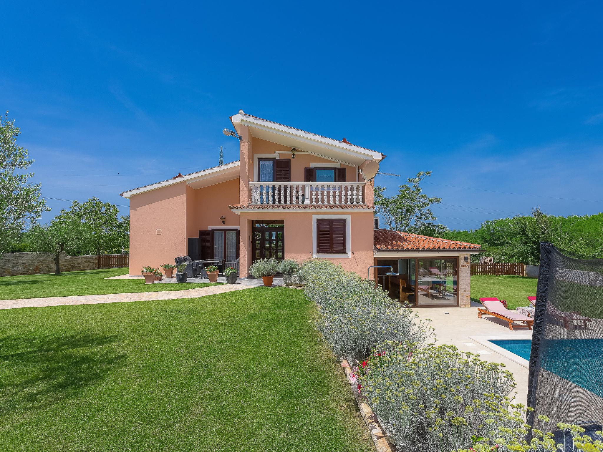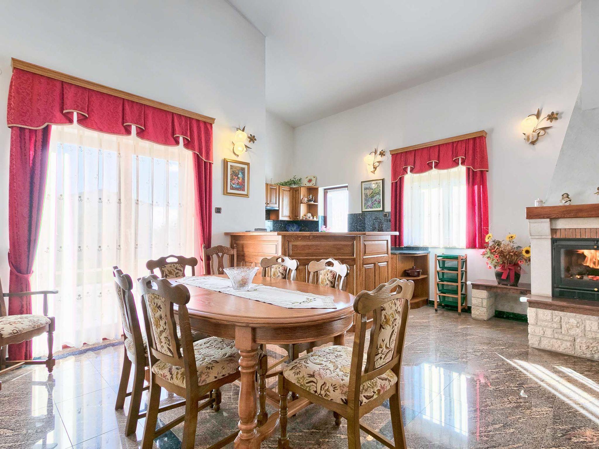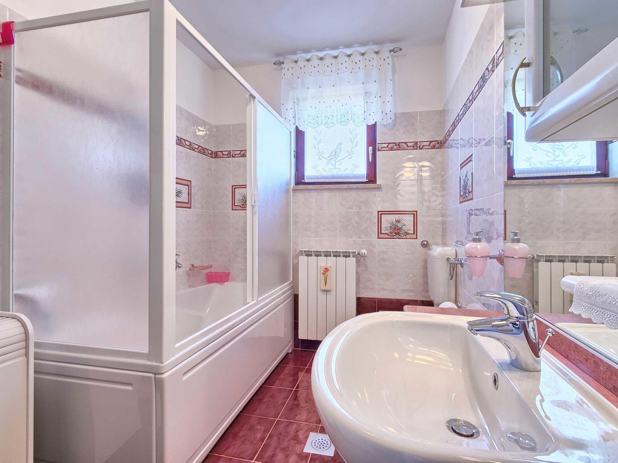 Beautiful single-family house "Mirjana", 2 storeys. In the hamlet Frkeci 2 km from the centre of Barban, 20 km from the centre of Rabac, in a quiet, sunny position, 10 km from the sea. Private: property 1'500 m2 (fenced), beautiful garden with lawn and wildlife garden, swimming pool angular (10 x 4 m, depth 150 cm, seasonal availability: 27.Apr. - 28.Sep.) with internal staircase. Outdoor shower, pool house with fridge and cooking stove, terrace (30 m2), garden furniture, barbecue, children's playground (slide, swing). In the house: internet access, sauna, trampoline, washing machine. Parking (for 3 cars) at the house on the premises. Shop 2 km, supermarket 12 km, restaurant 2 km, bus stop 2.2 km, pebble beach 12 km, rocky beach 10 km. Riding stable 9 km, walking paths from the house 500 m, cycle lane 550 m. Nearby attractions: adrenalin park 8 km. Groups of teenagers on request only.