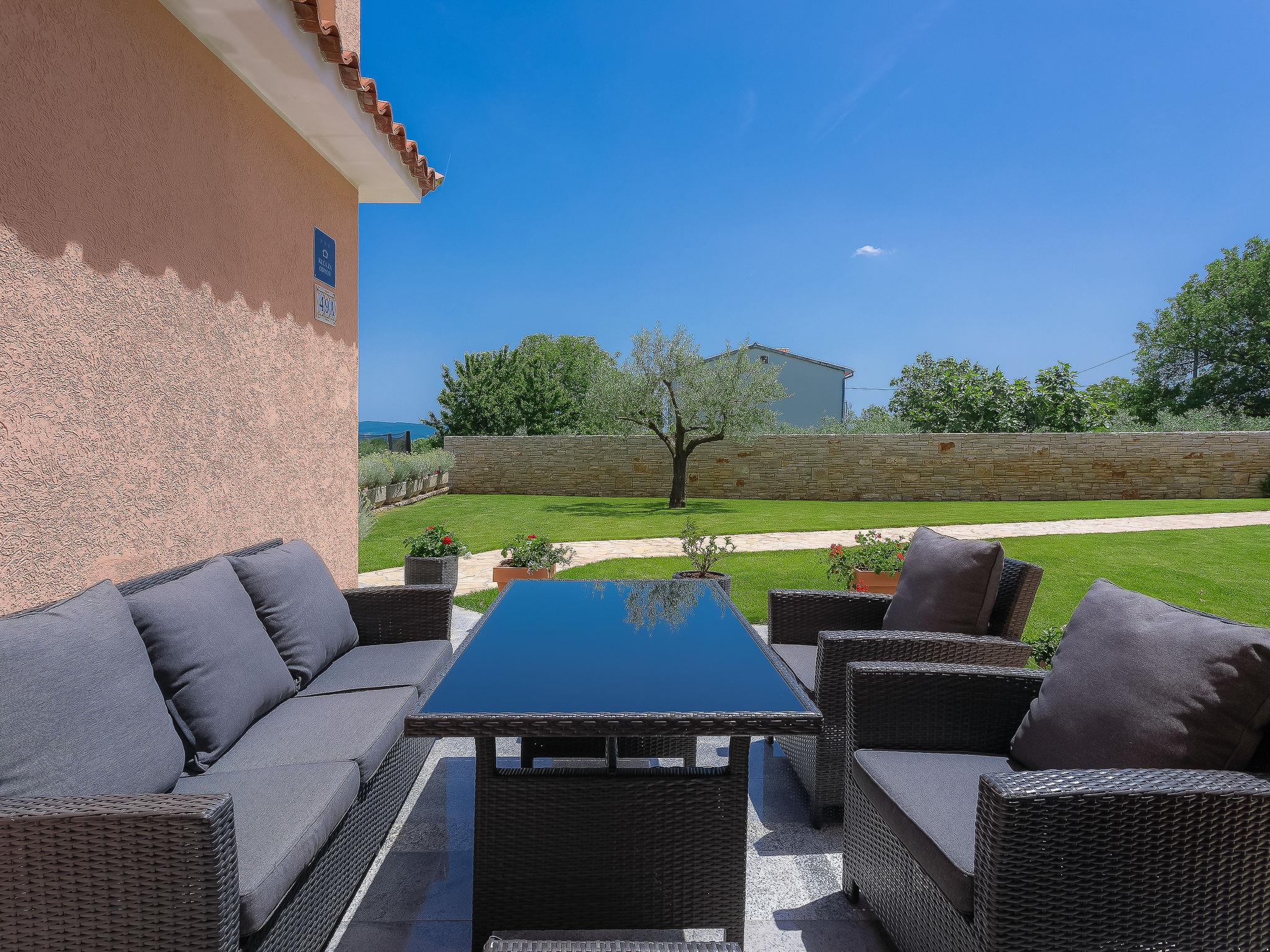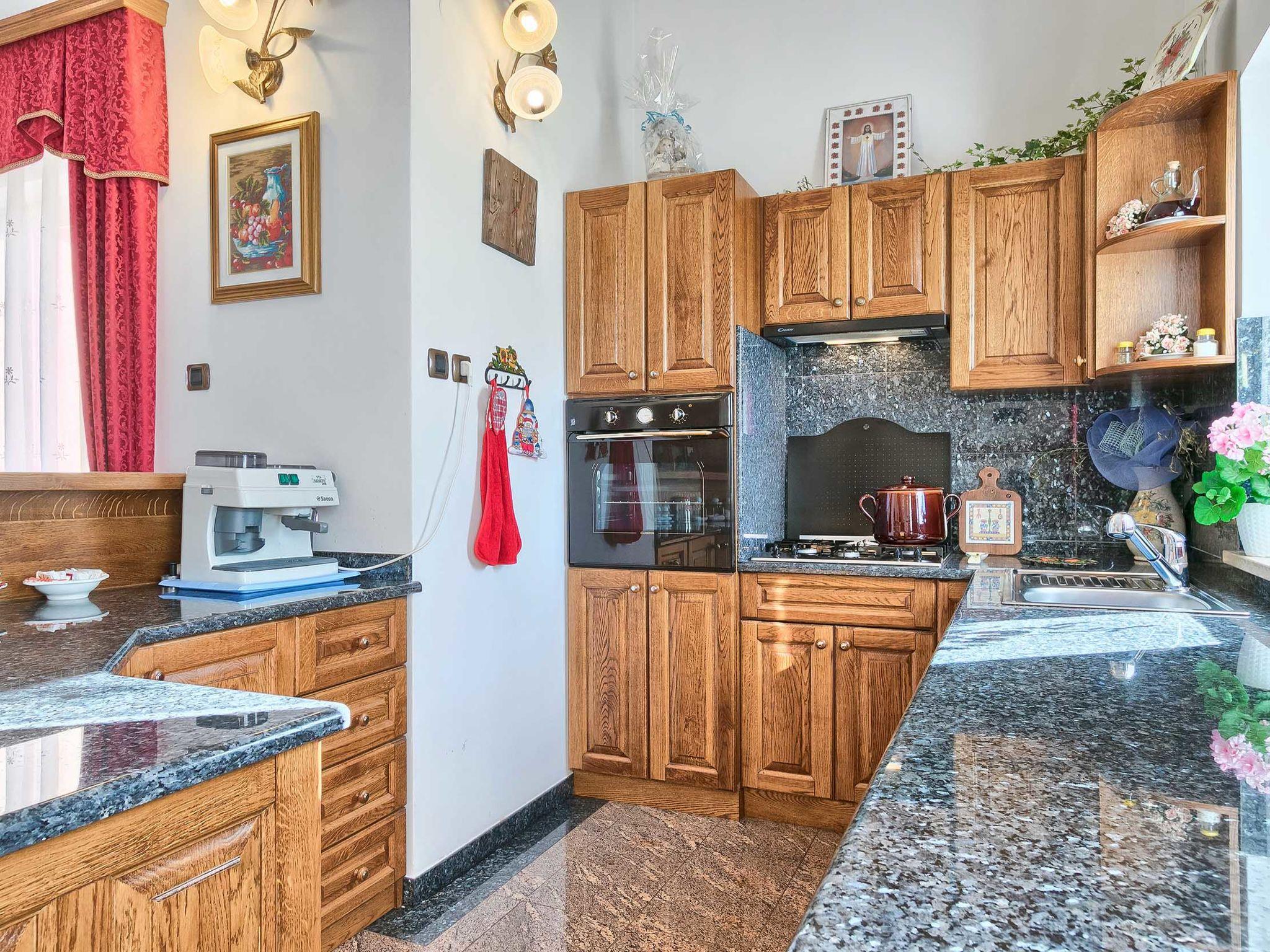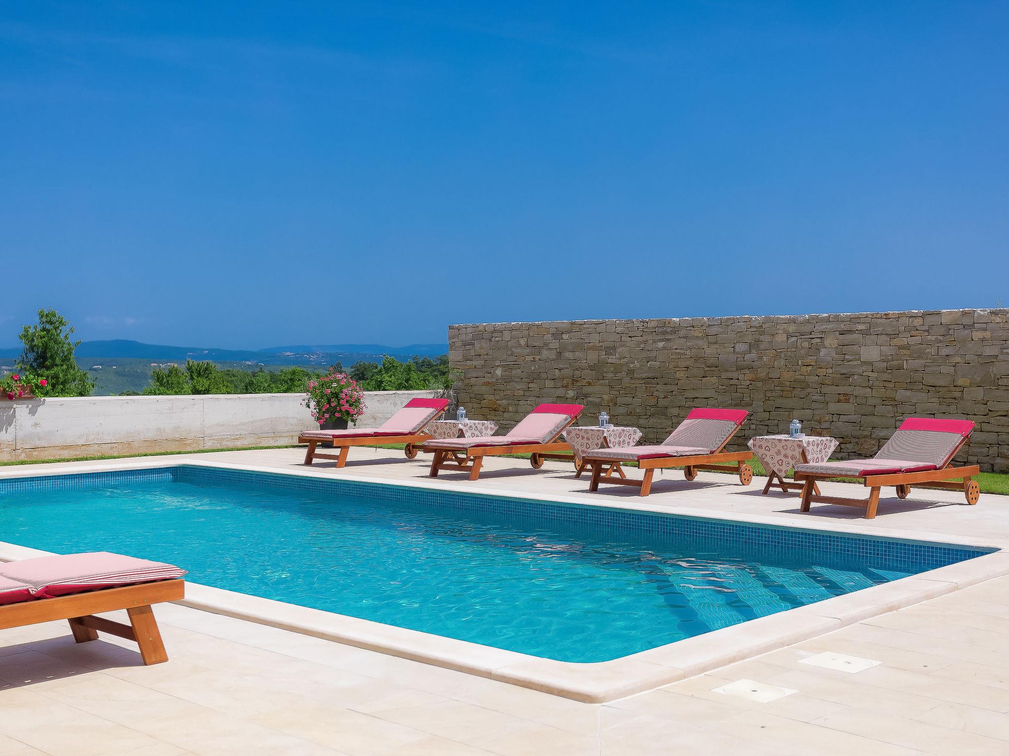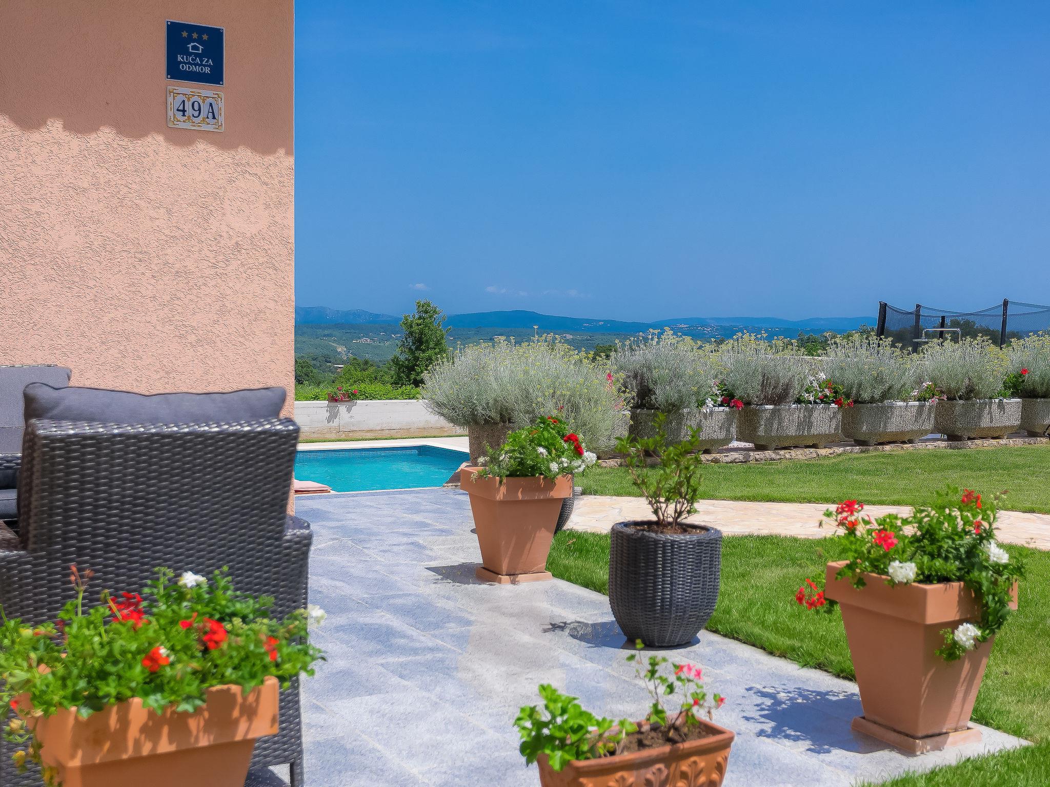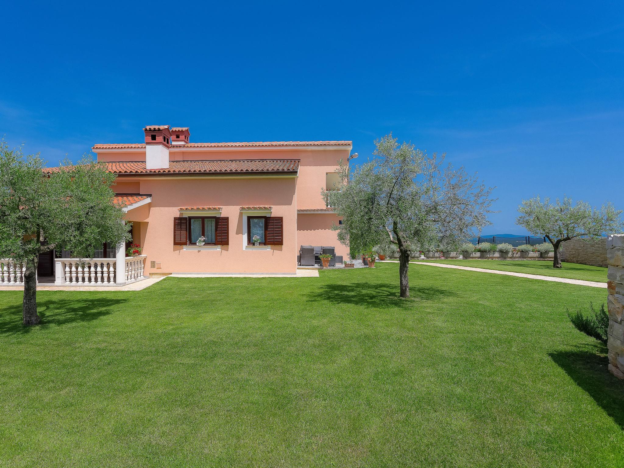 Beautiful single-family house "Mirjana", 2 storeys. In the hamlet Frkeci 2 km from the centre of Barban, 20 km from the centre of Rabac, in a quiet, sunny position, 10 km from the sea. Private: property 1'500 m2 (fenced), beautiful garden with lawn and wildlife garden, swimming pool angular (10 x 4 m, depth 150 cm, seasonal availability: 27.Apr. - 28.Sep.) with internal staircase. Outdoor shower, pool house with fridge and cooking stove, terrace (30 m2), garden furniture, barbecue, children's playground (slide, swing). In the house: internet access, sauna, trampoline, washing machine. Parking (for 3 cars) at the house on the premises. Shop 2 km, supermarket 12 km, restaurant 2 km, bus stop 2.2 km, pebble beach 12 km, rocky beach 10 km. Riding stable 9 km, walking paths from the house 500 m, cycle lane 550 m. Nearby attractions: adrenalin park 8 km. Groups of teenagers on request only.