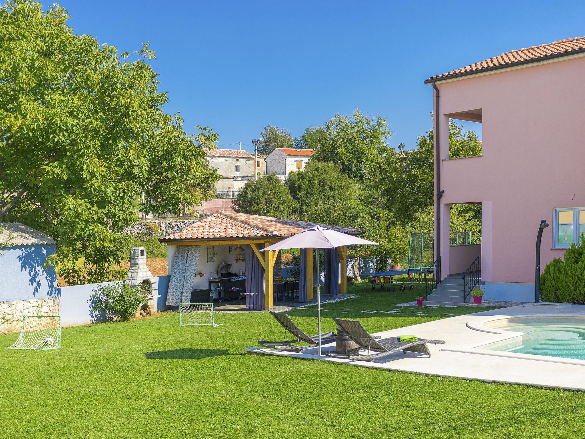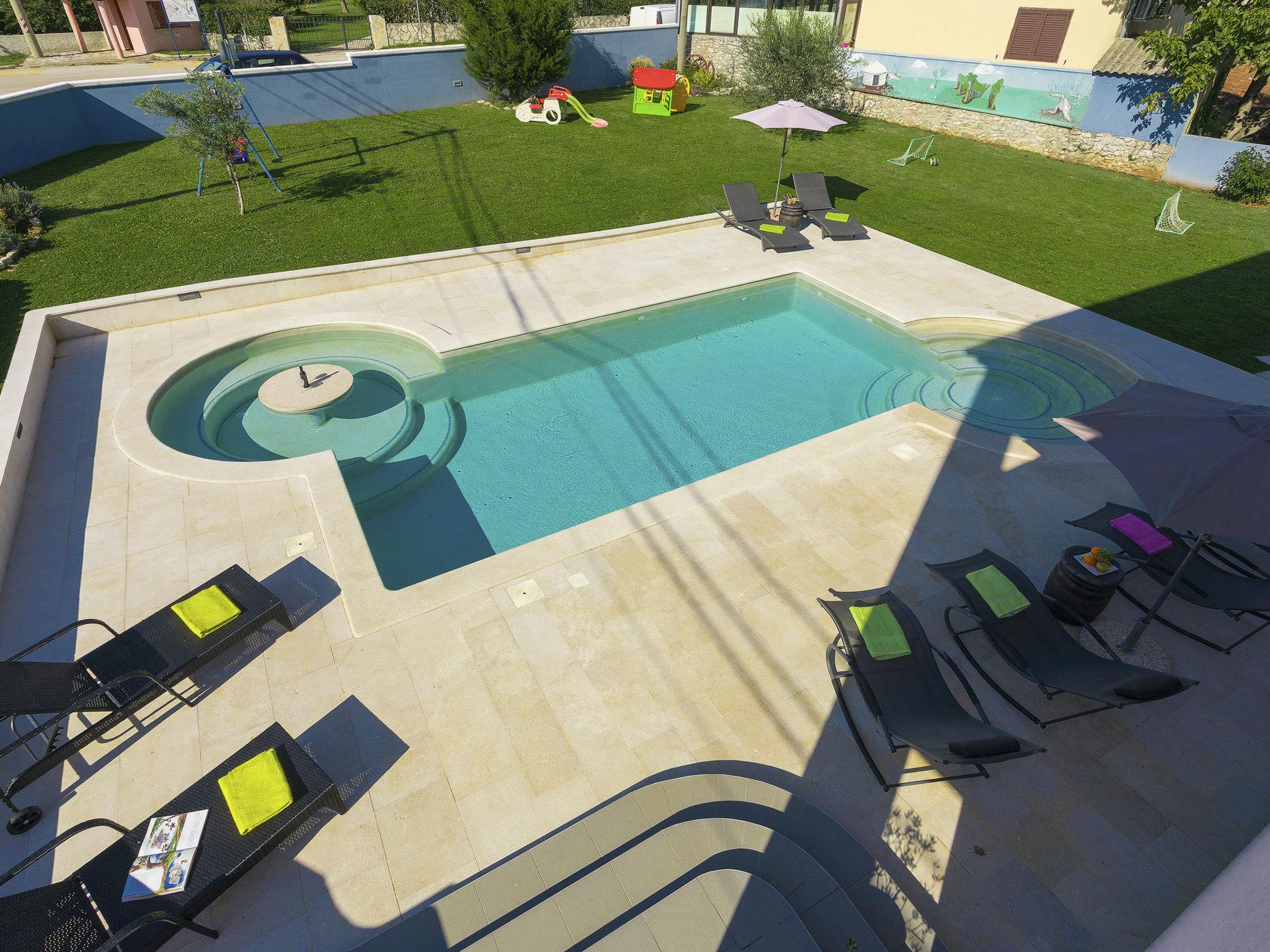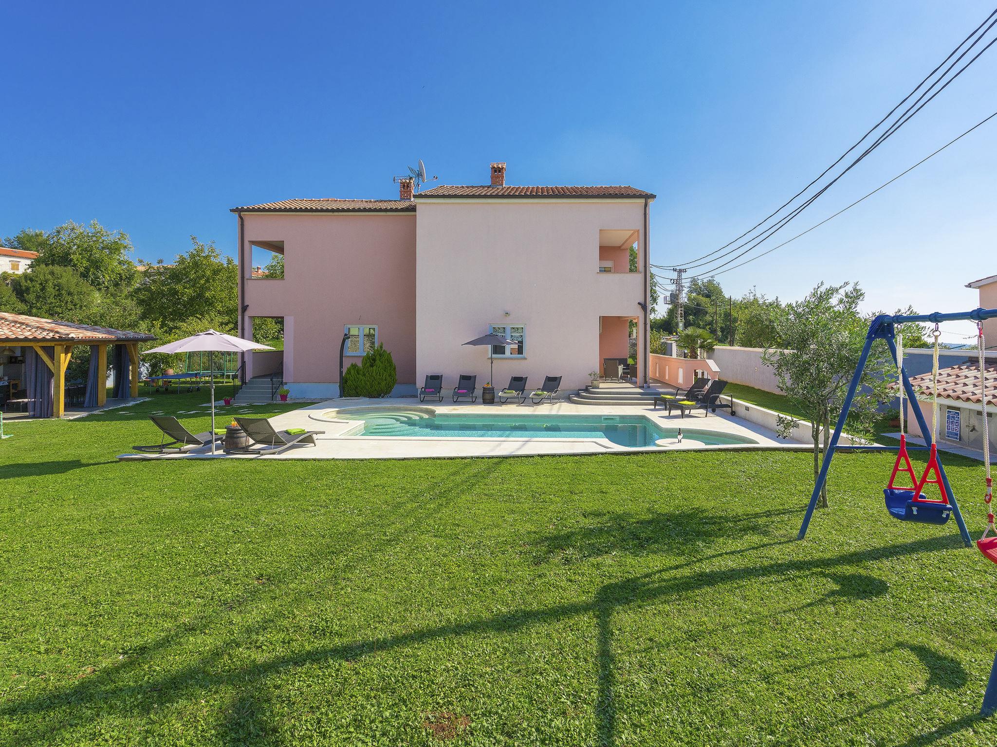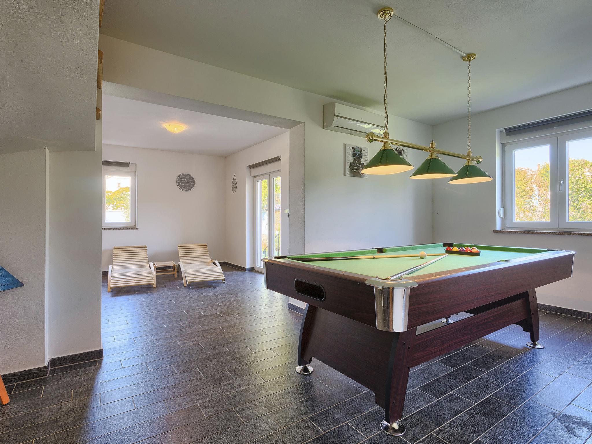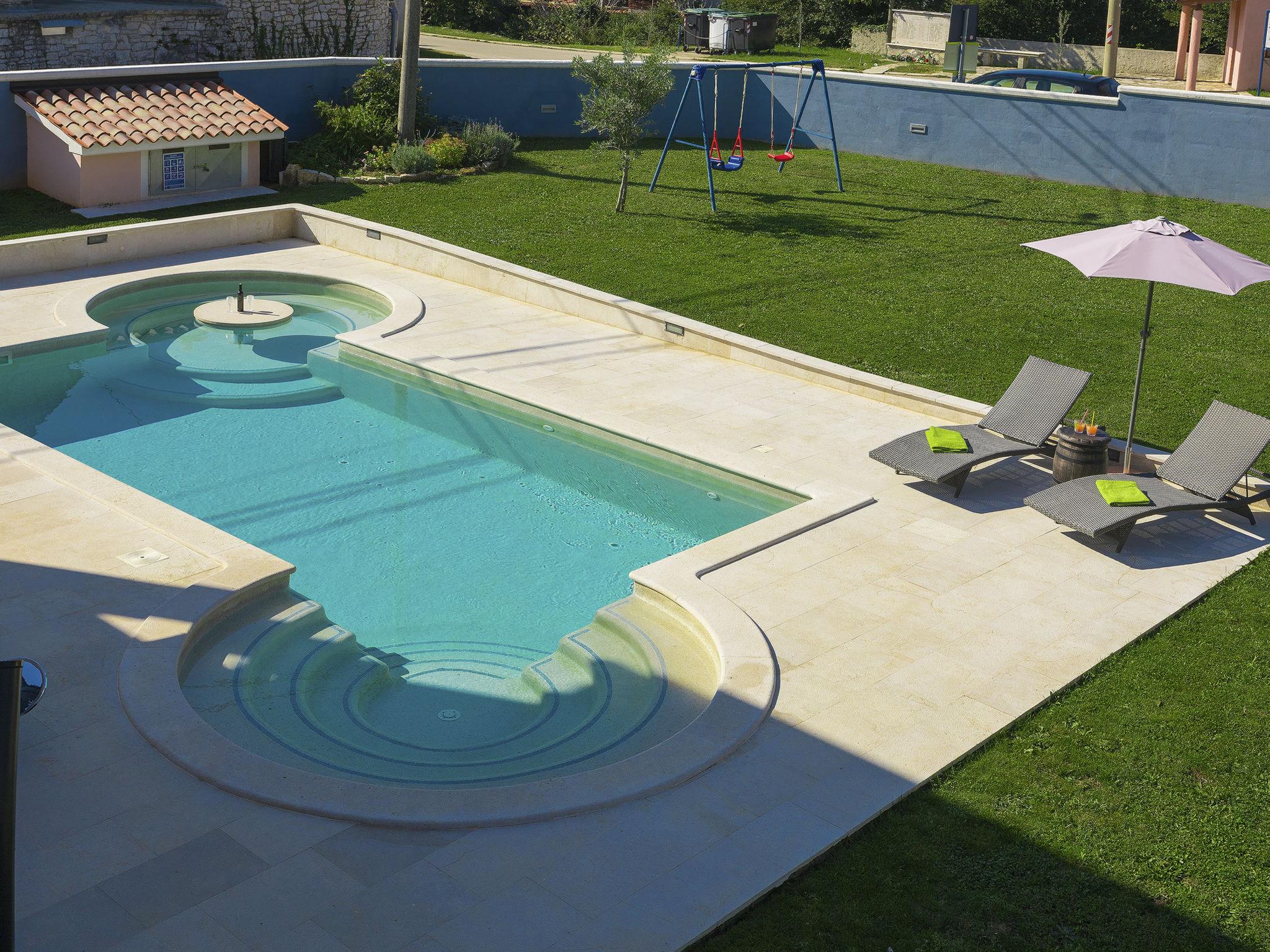 Single-family house "Paus", 2 storeys. In the hamlet Orihi 7 km from the centre of Barban, in a quiet, sunny position, 15 km from the sea. Private: property 1'000 m2 (fenced), garden with lawn and wildlife garden, swimming pool heated (32 m2, depth 140 cm, seasonal availability: 27.Apr. - 26.Oct.) with internal staircase. Unconventional pool shape. Outdoor shower, table tennis, terrace (40 m2), garden furniture, barbecue, children's playground (slide, swing). In the house: internet access, sauna, billiard table, trampoline, washing machine. Parking at the house on the premises. Shop 50 m, restaurant 250 m, bus stop 3 km, pebble beach 15 km. Riding stable 15 km, walking paths from the house 100 m, cycle lane 150 m. Nearby attractions: Adrenalin park 15 km. Groups of teenagers are not allowed.
