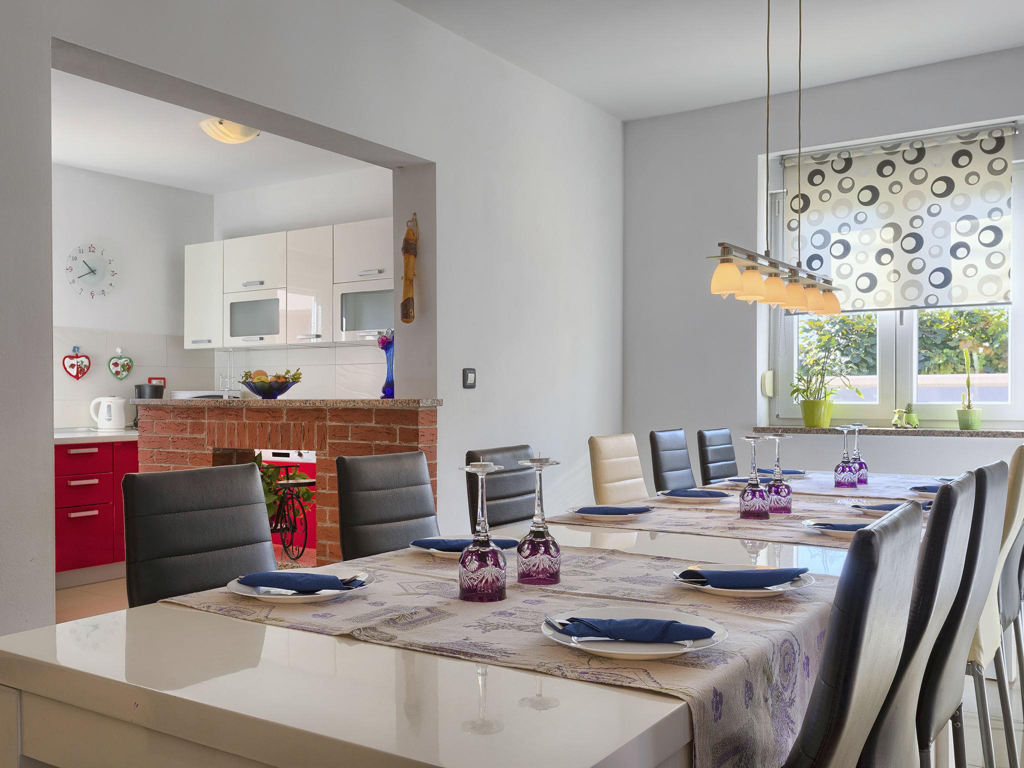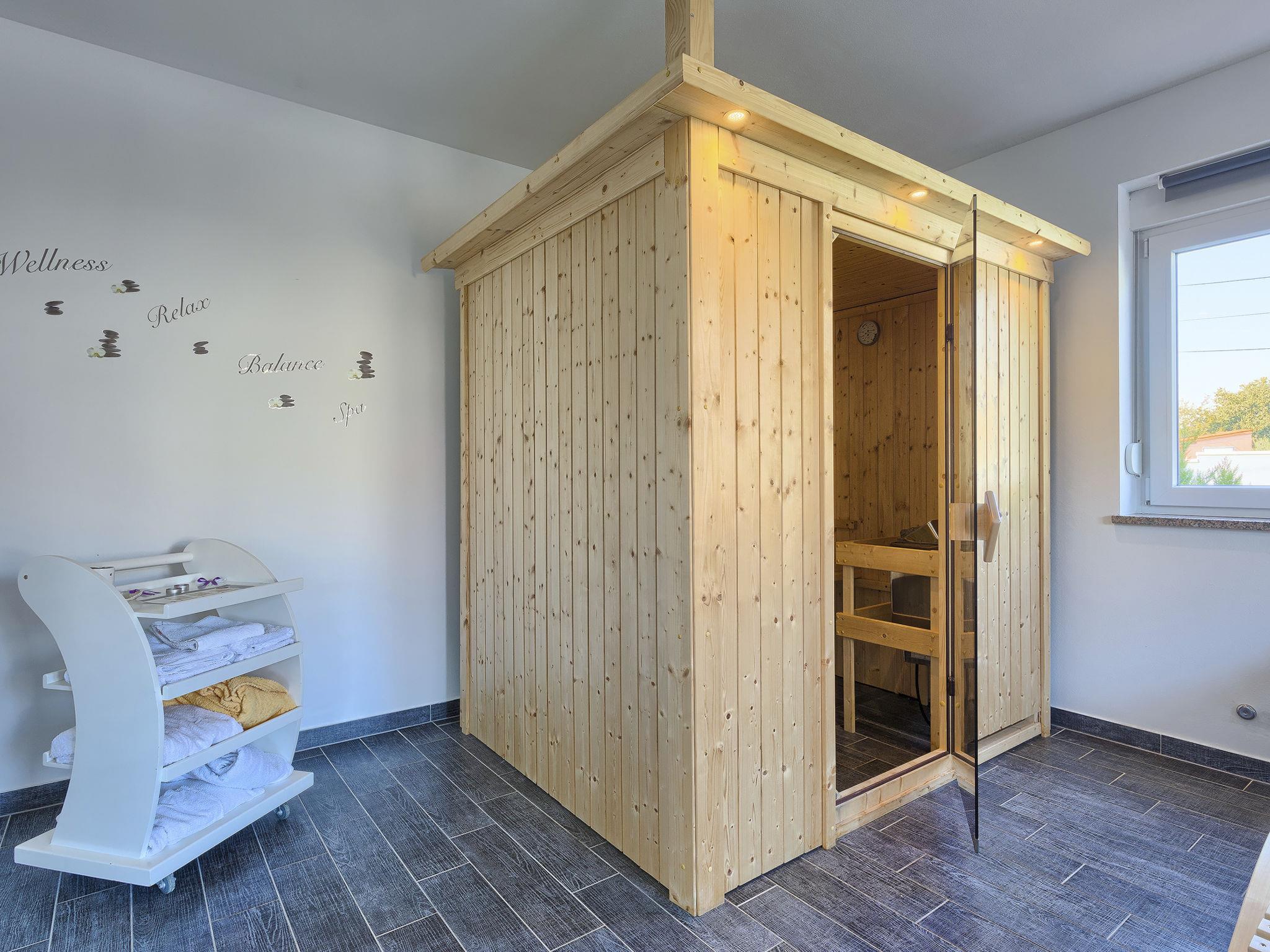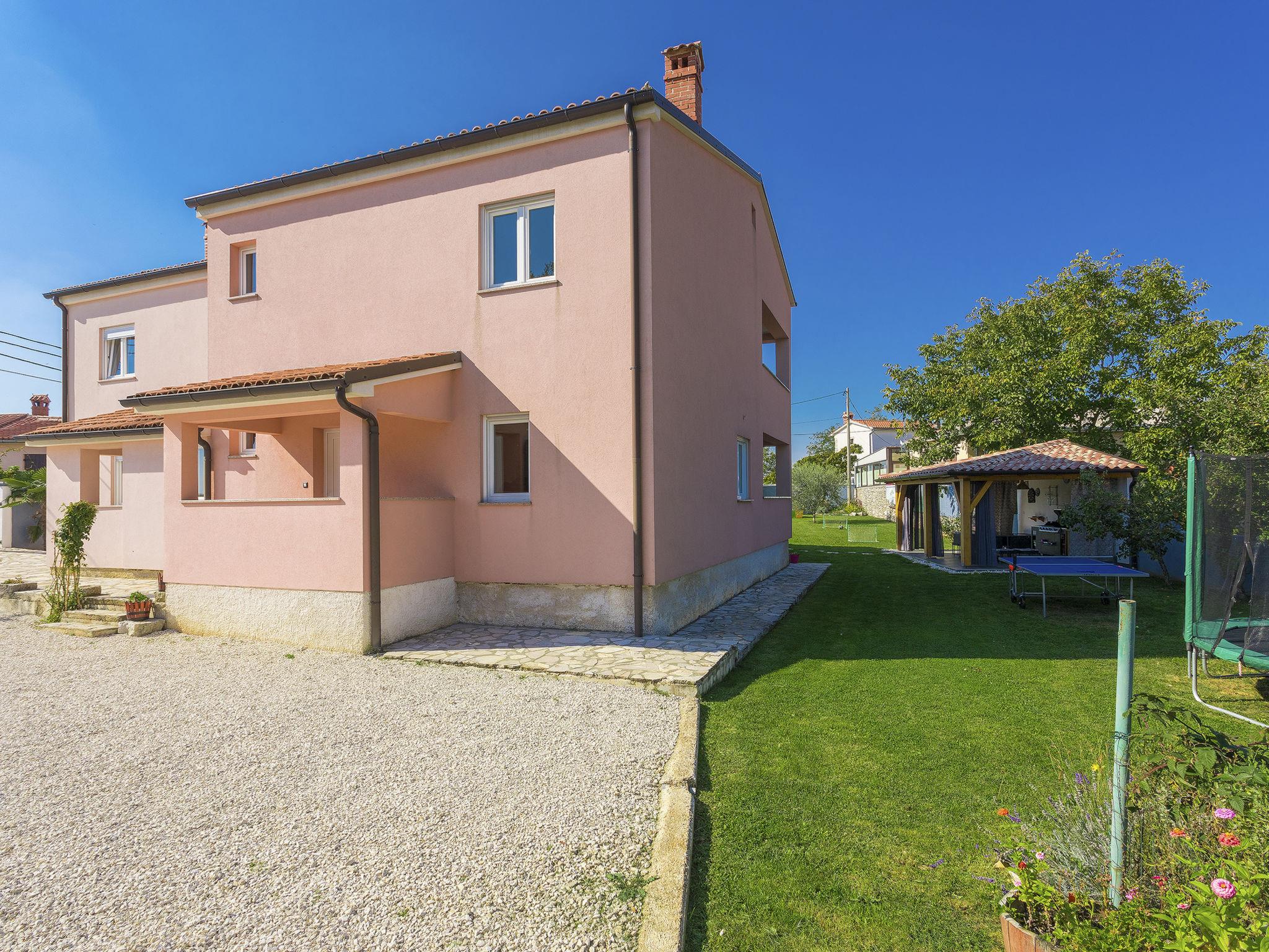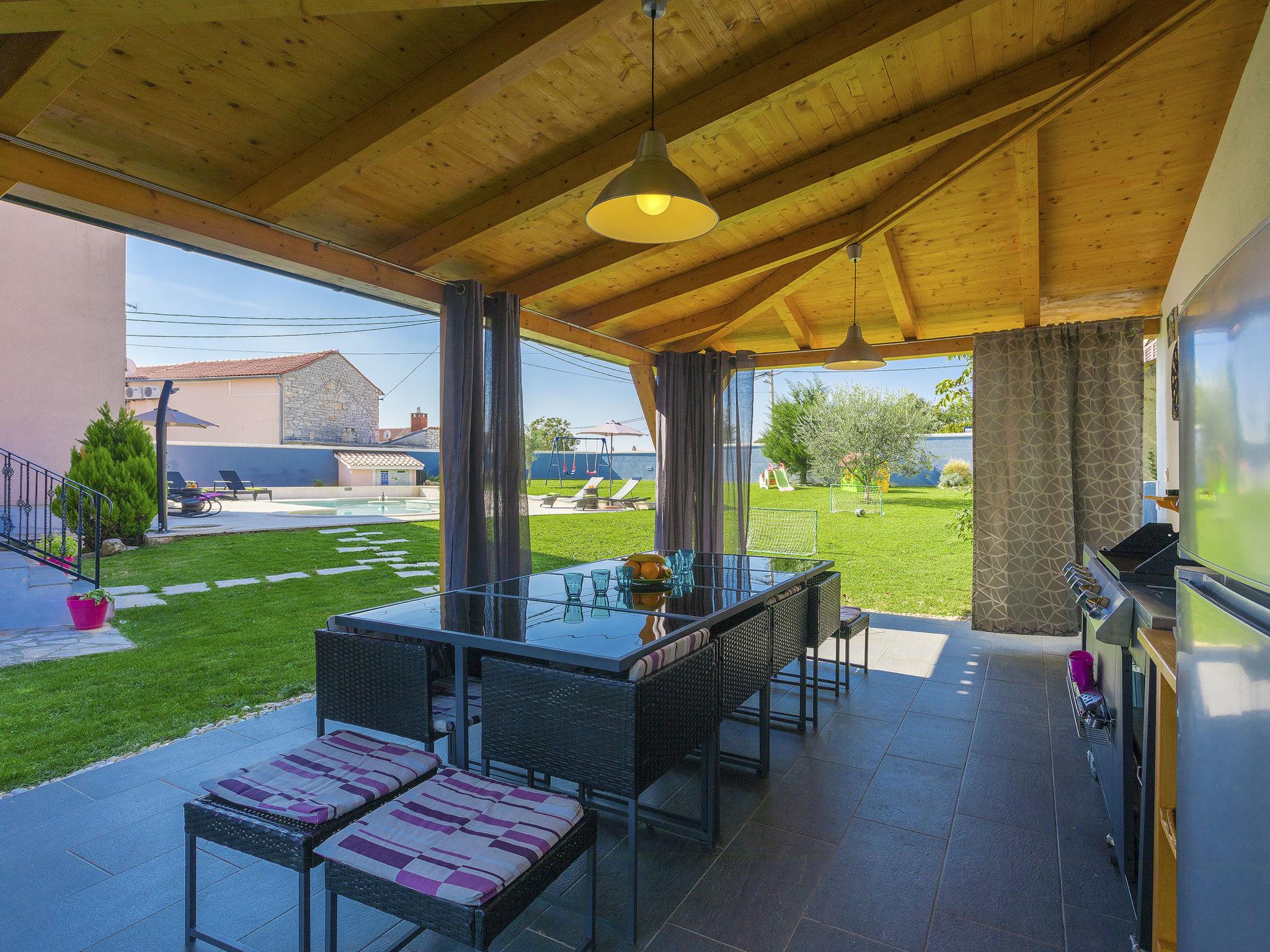 Single-family house "Paus", 2 storeys. In the hamlet Orihi 7 km from the centre of Barban, in a quiet, sunny position, 15 km from the sea. Private: property 1'000 m2 (fenced), garden with lawn and wildlife garden, swimming pool heated (32 m2, depth 140 cm, seasonal availability: 27.Apr. - 26.Oct.) with internal staircase. Unconventional pool shape. Outdoor shower, table tennis, terrace (40 m2), garden furniture, barbecue, children's playground (slide, swing). In the house: internet access, sauna, billiard table, trampoline, washing machine. Parking at the house on the premises. Shop 50 m, restaurant 250 m, bus stop 3 km, pebble beach 15 km. Riding stable 15 km, walking paths from the house 100 m, cycle lane 150 m. Nearby attractions: Adrenalin park 15 km. Groups of teenagers are not allowed.