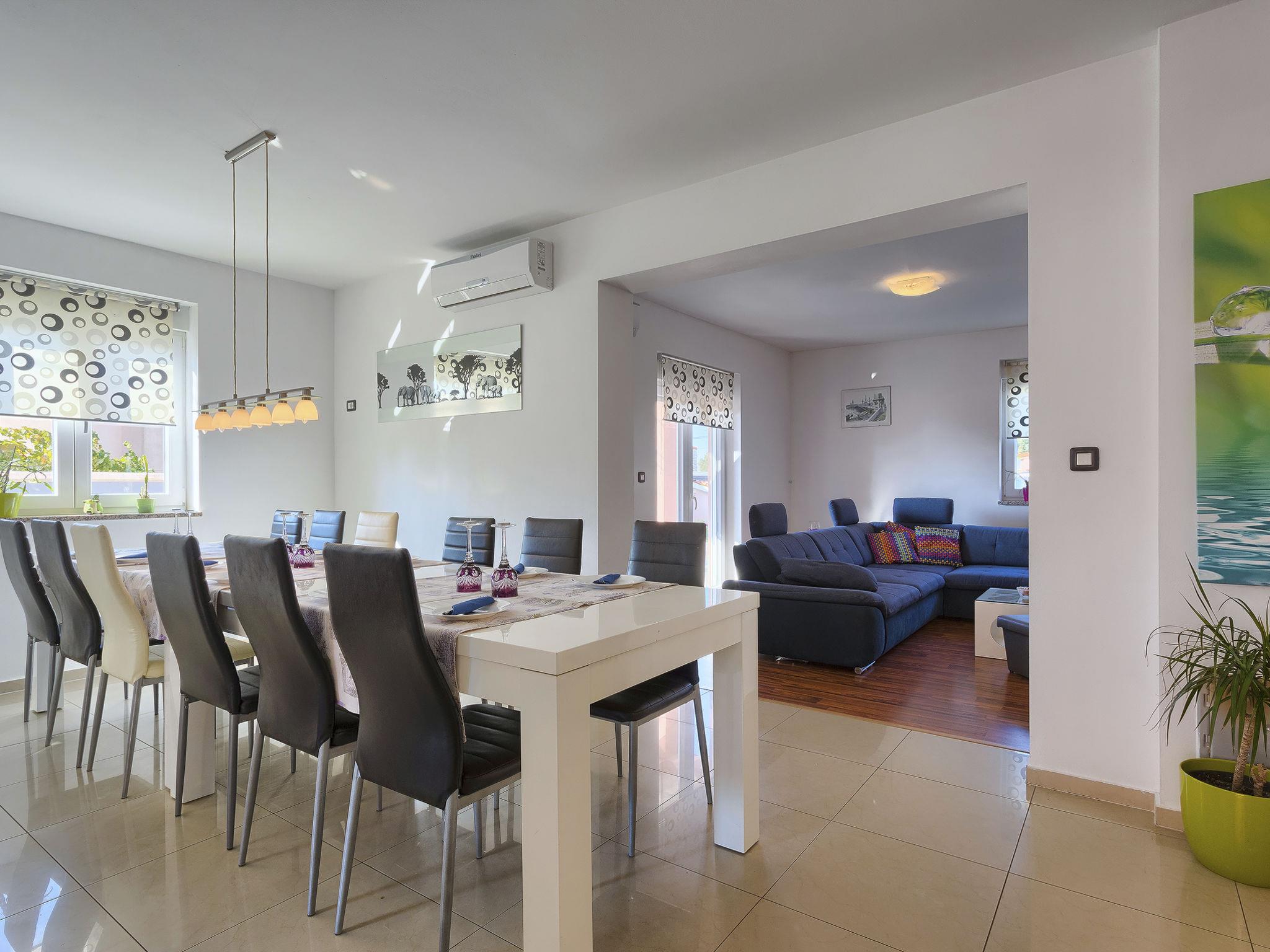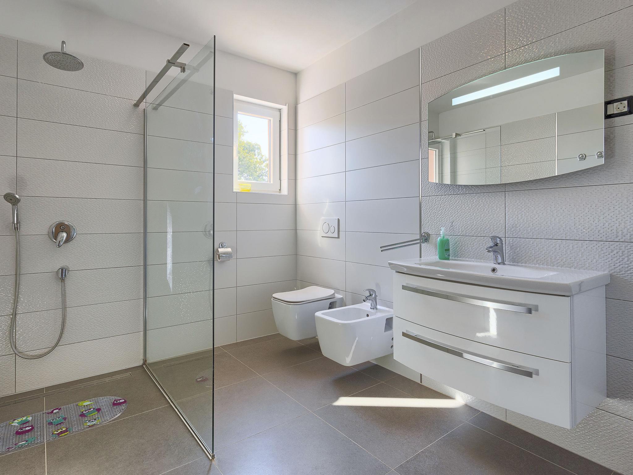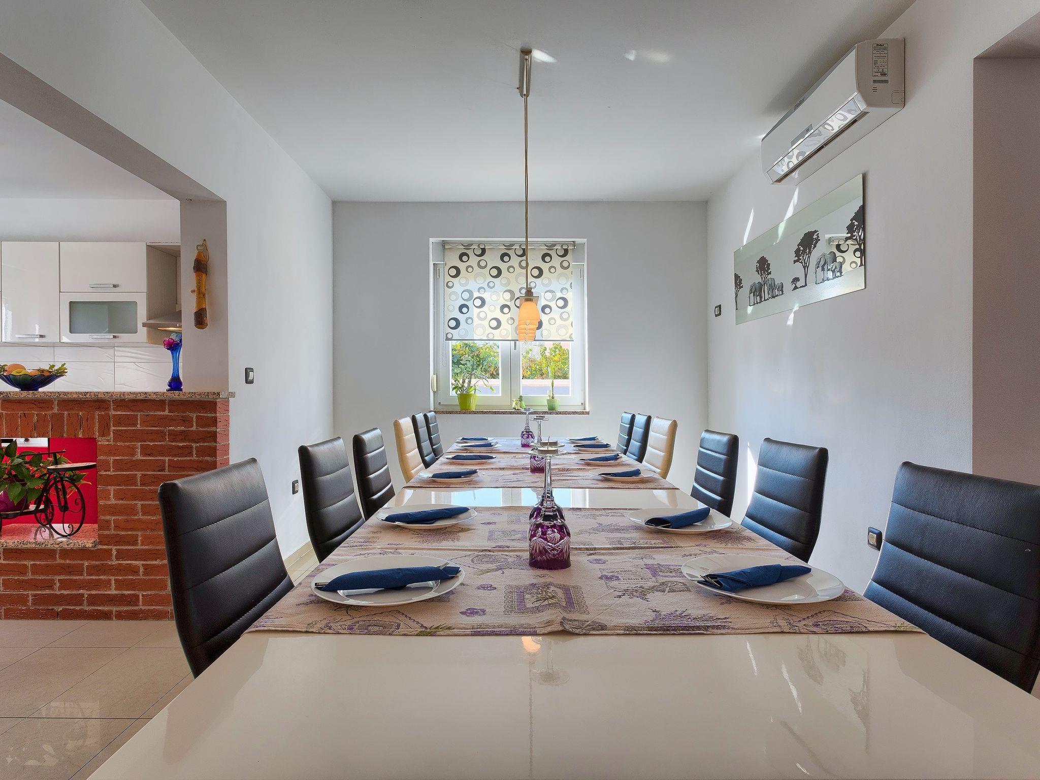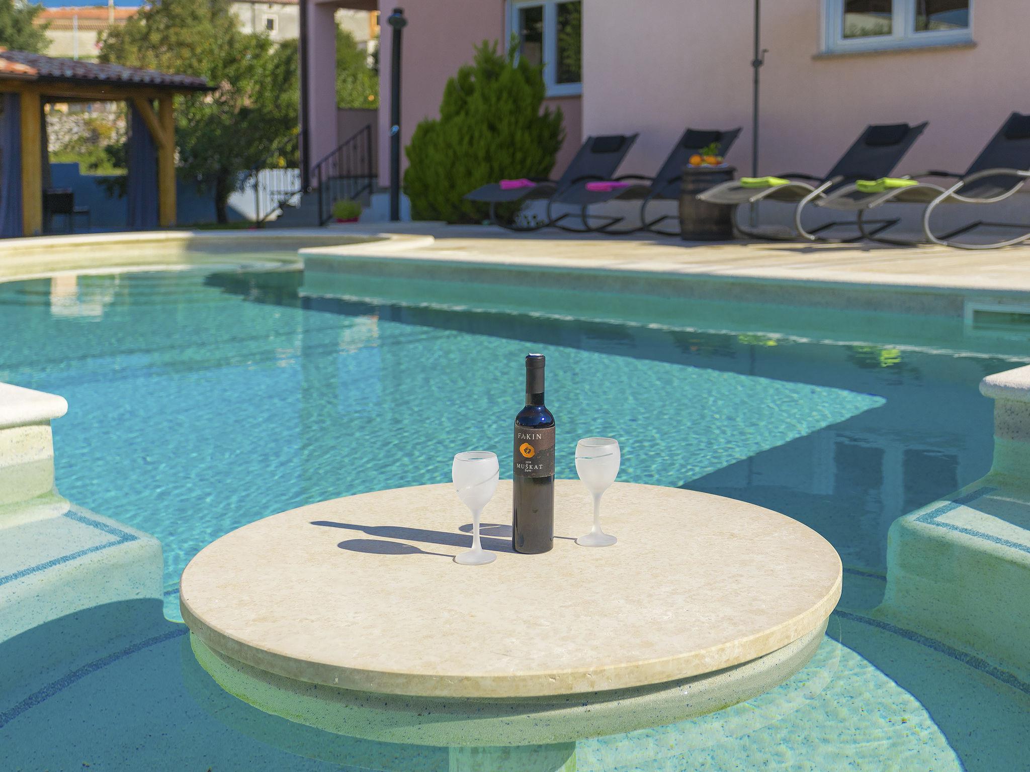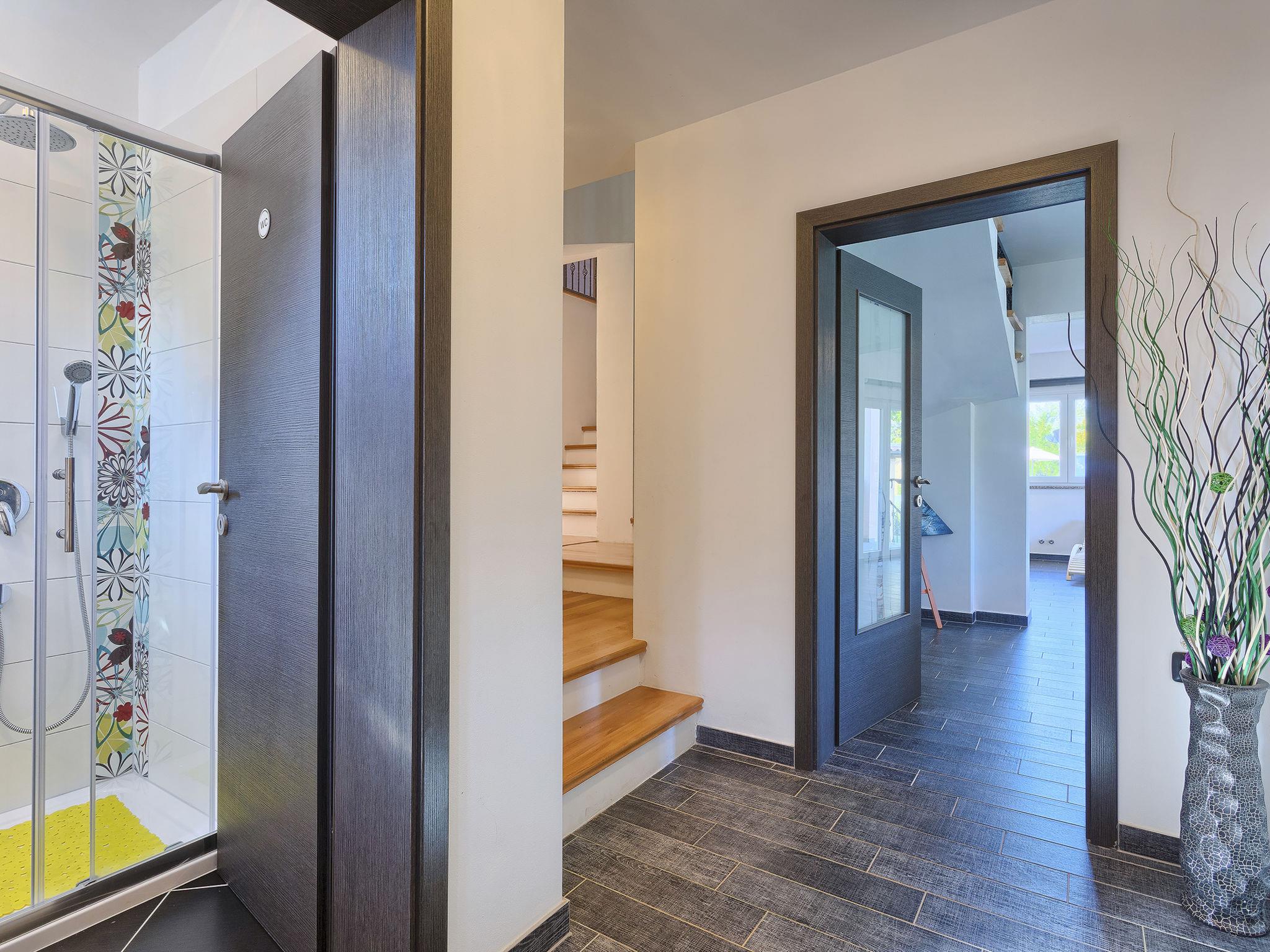 Single-family house "Paus", 2 storeys. In the hamlet Orihi 7 km from the centre of Barban, in a quiet, sunny position, 15 km from the sea. Private: property 1'000 m2 (fenced), garden with lawn and wildlife garden, swimming pool heated (32 m2, depth 140 cm, seasonal availability: 27.Apr. - 26.Oct.) with internal staircase. Unconventional pool shape. Outdoor shower, table tennis, terrace (40 m2), garden furniture, barbecue, children's playground (slide, swing). In the house: internet access, sauna, billiard table, trampoline, washing machine. Parking at the house on the premises. Shop 50 m, restaurant 250 m, bus stop 3 km, pebble beach 15 km. Riding stable 15 km, walking paths from the house 100 m, cycle lane 150 m. Nearby attractions: Adrenalin park 15 km. Groups of teenagers are not allowed.