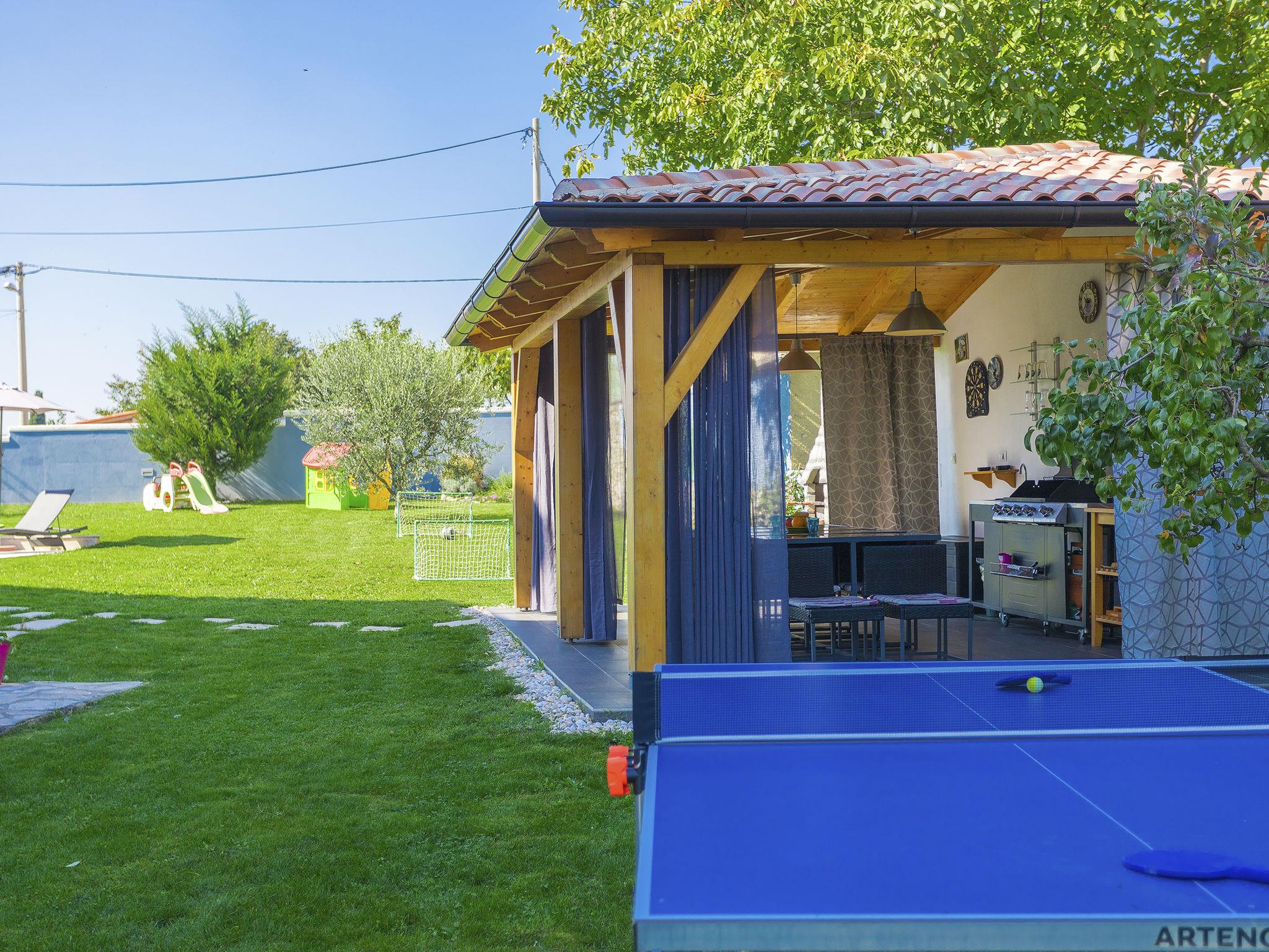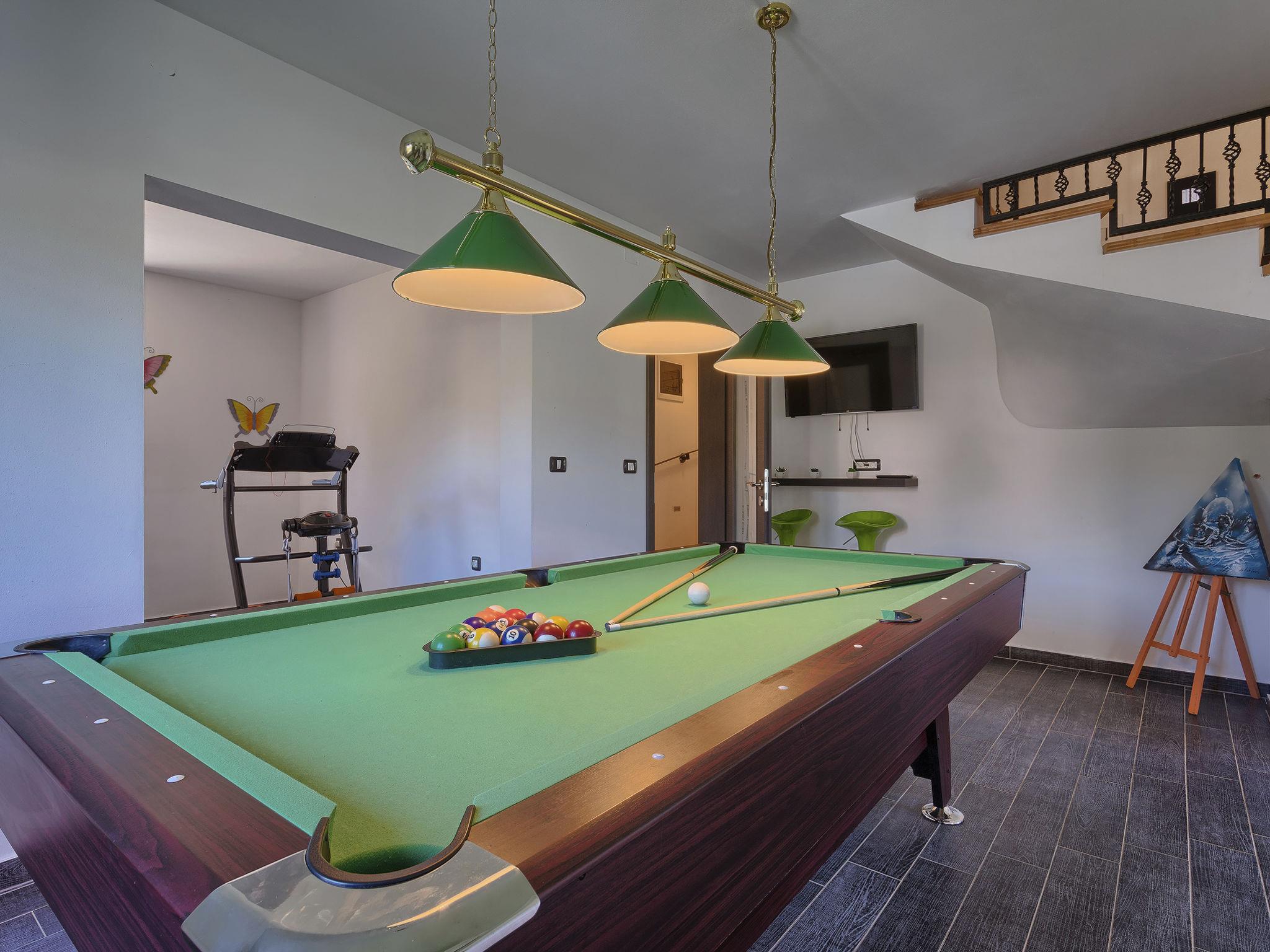 8-room house 280 m2 on 2 levels. Living/dining room with satellite TV (flat screen), air conditioning. Exit to the terrace. Billiard room 50 m2 with satellite TV (flat screen), air conditioning. Exit to the garden, to the swimming pool. Open kitchen (4 hot plates, oven, dishwasher, microwave, freezer, electric coffee machine). 2 showers/WC. Upper floor: entrance hall with air conditioning. 1 room with 1 french bed (180 cm, length 200 cm). 1 room with 1 french bed (180 cm, length 200 cm). Exit to the terrace. 1 room with 1 double sofabed (140 cm, length 200 cm), TV (flat screen). Exit to the terrace. Entrance hall with air conditioning. 1 room with 1 french bed (160 cm, length 200 cm). 1 room with 2 beds (90 cm, length 200 cm). Exit to the terrace. 1 room with 1 french bed (180 cm, length 200 cm). Exit to the terrace. Bath/bidet/WC, shower/WC. Terrace 15 m2, roofed, 2 terraces 8 m2. Terrace furniture, barbecue (portable), deck chairs. View of the swimming pool and the garden. Facilities: safe, children's high chair, baby cot, hair dryer. Internet (WiFi, free). Maximum 1 pet/ dog allowed. Ground floor: washing machine and sep. WC in the room with external and separate entrance. Sports equipment and sauna are located in the billiard room.
