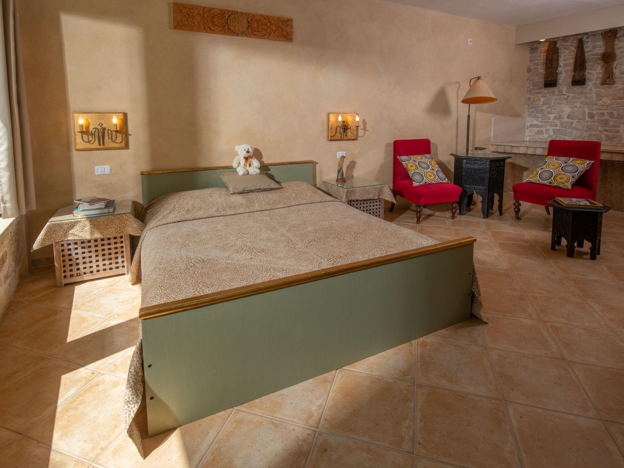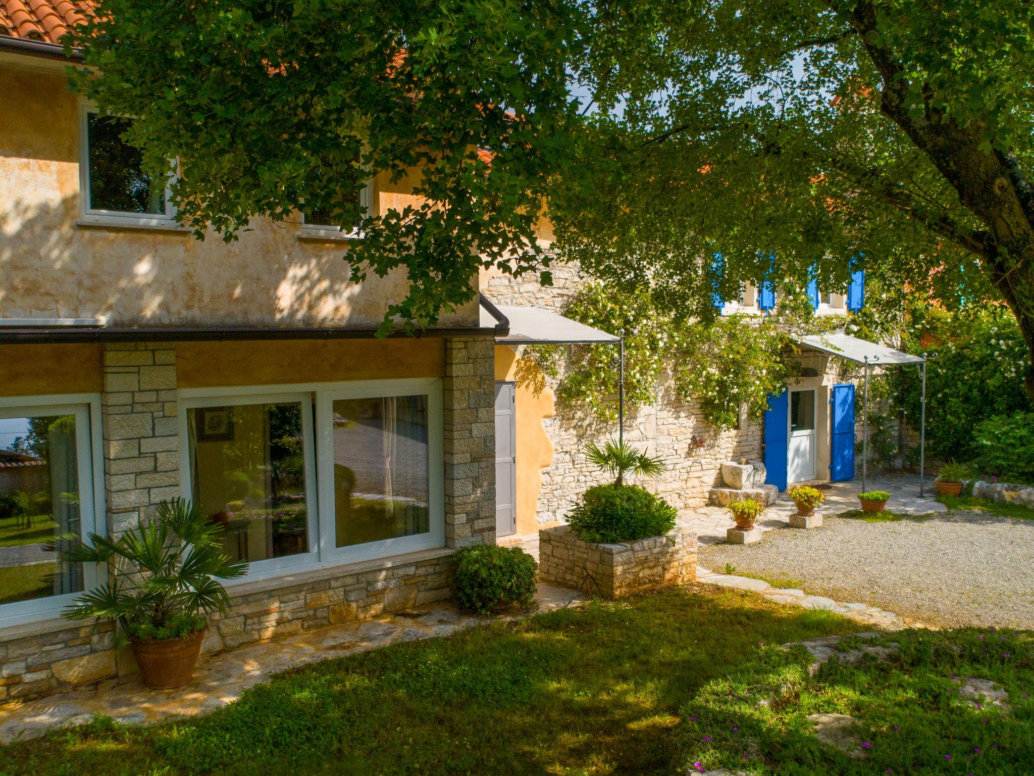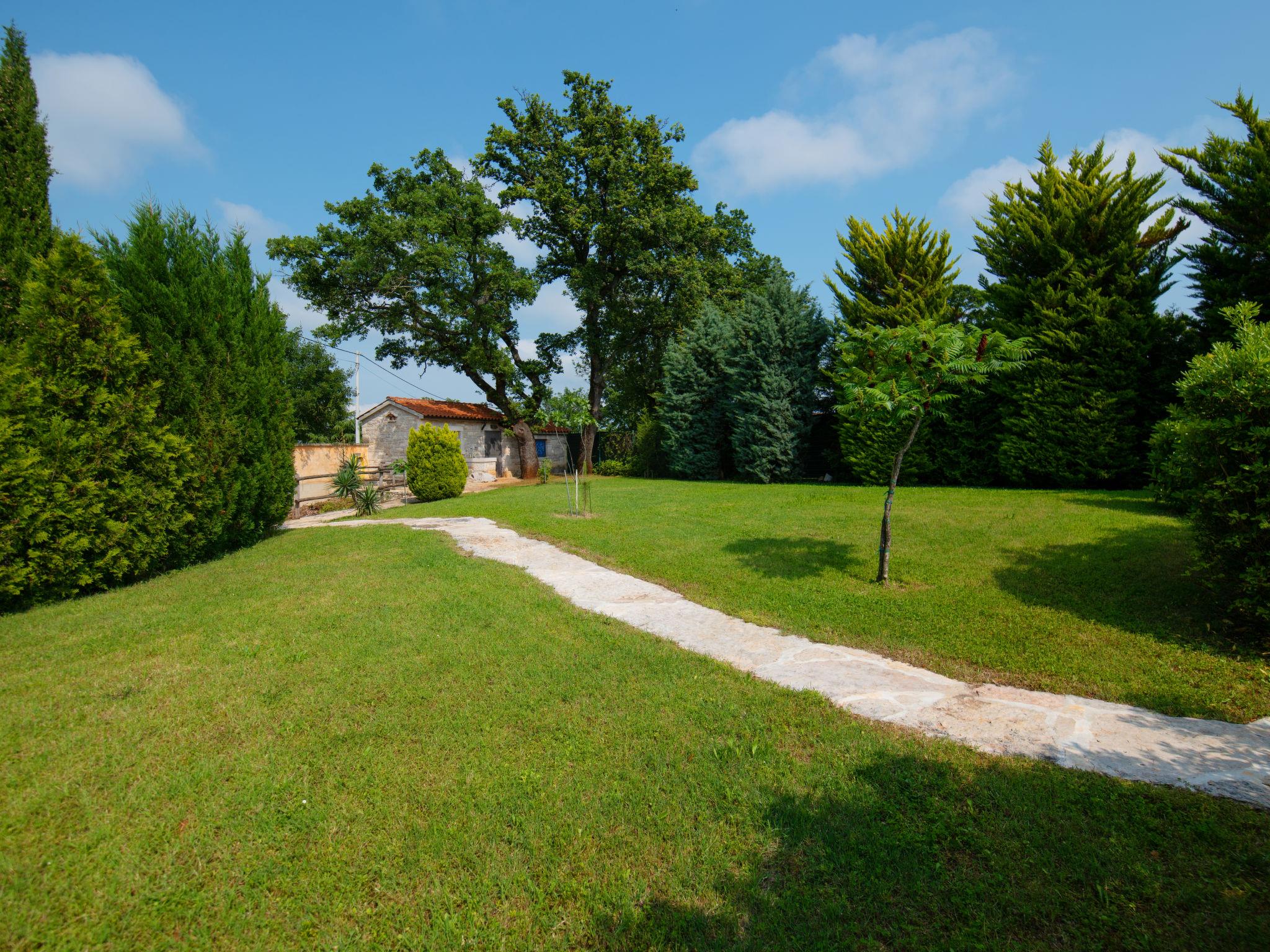 The unit consists of 2 houses rented as one unit. Beautiful villa "Mega". In the hamlet Šajini 9 km from the centre of Barban, in a quiet, sunny position, 12 km from the sea. Private: property 4'000 m2 (fenced), garden with lawn and trees, swimming pool (60 m2, depth 130 cm, seasonal availability: 01.Apr. - 01.Nov.) with internal staircase. Unconventional pool shape. Shower/WC in the pool area, pool house with fridge and cooking stove, terrace (20 m2), garden furniture, barbecue, children's playground (swing), pool maintenance by the owner/gardener. In the house: internet access, table tennis, central heating system, washing machine, tumble dryer. Parking (for 4 cars) at the house on the premises. Shop 250 m, restaurant 3 km, bus stop 5.3 km, pebble beach 12 km, rocky beach 12 km. Riding stable 2.5 km, walking paths from the house, cycle lane 100 m. Nearby attractions: adventure park 1.5 km. Please note: airfield 20 km from the property. By groups of young people double deposit is requested on arrival.