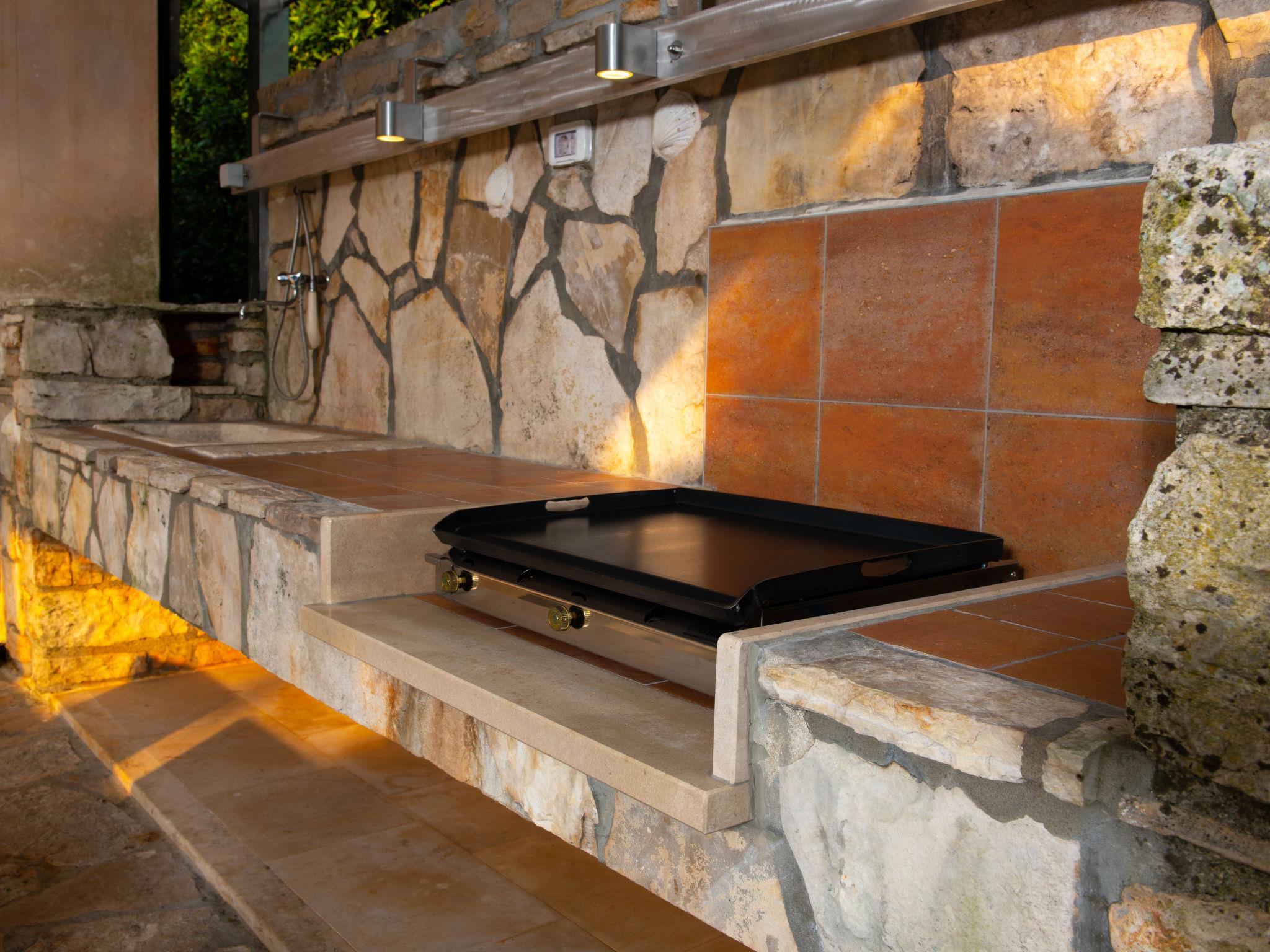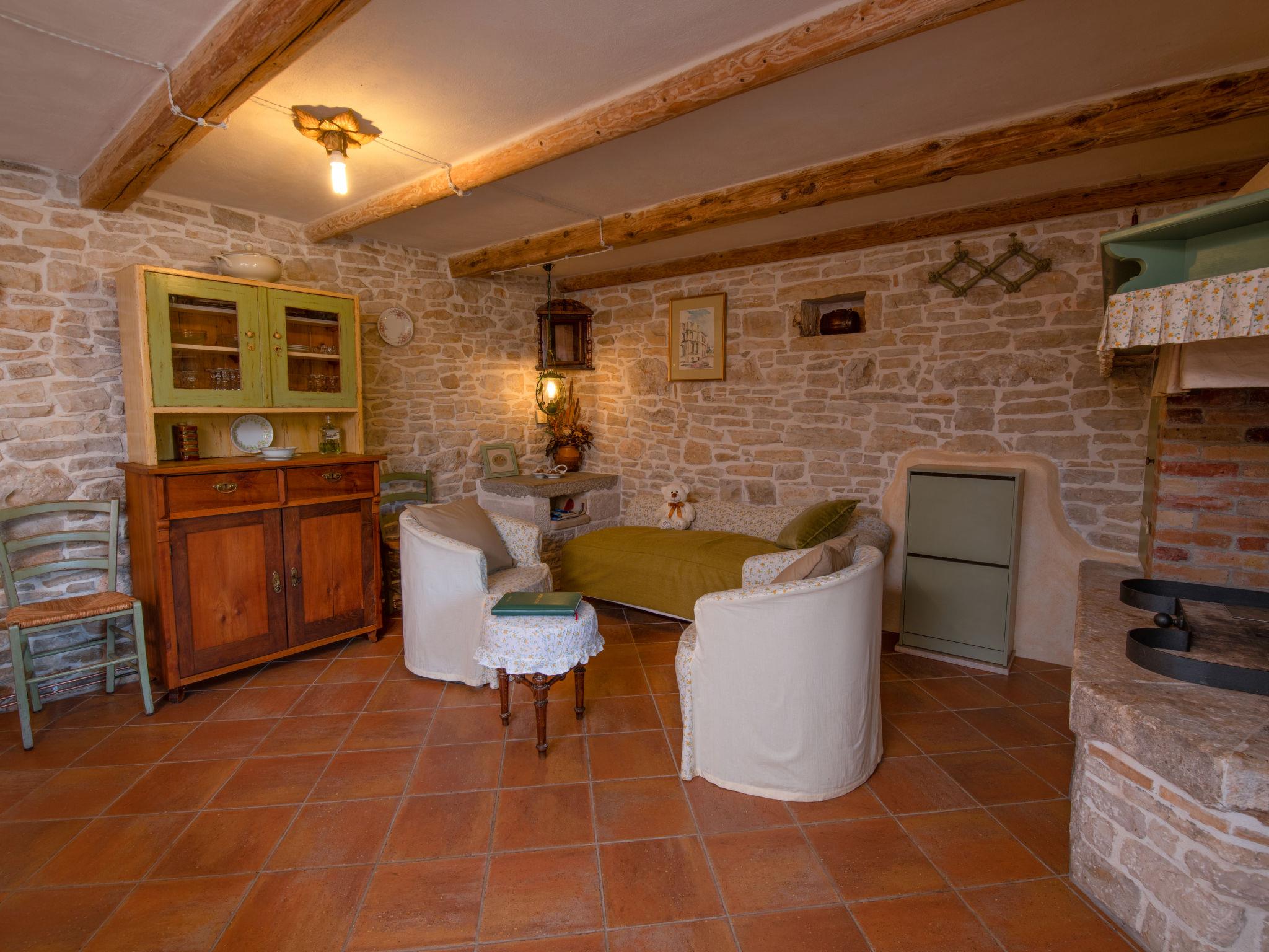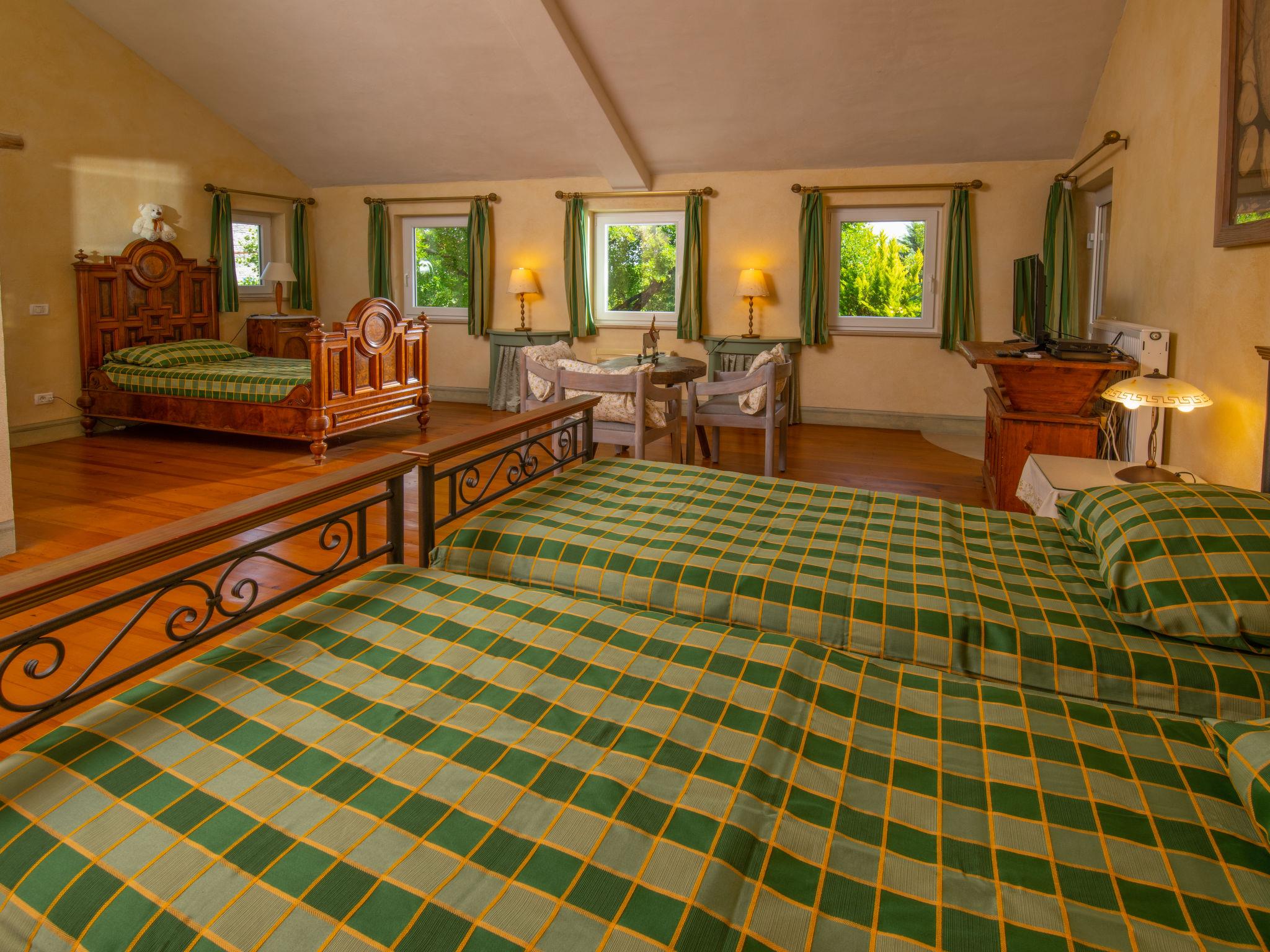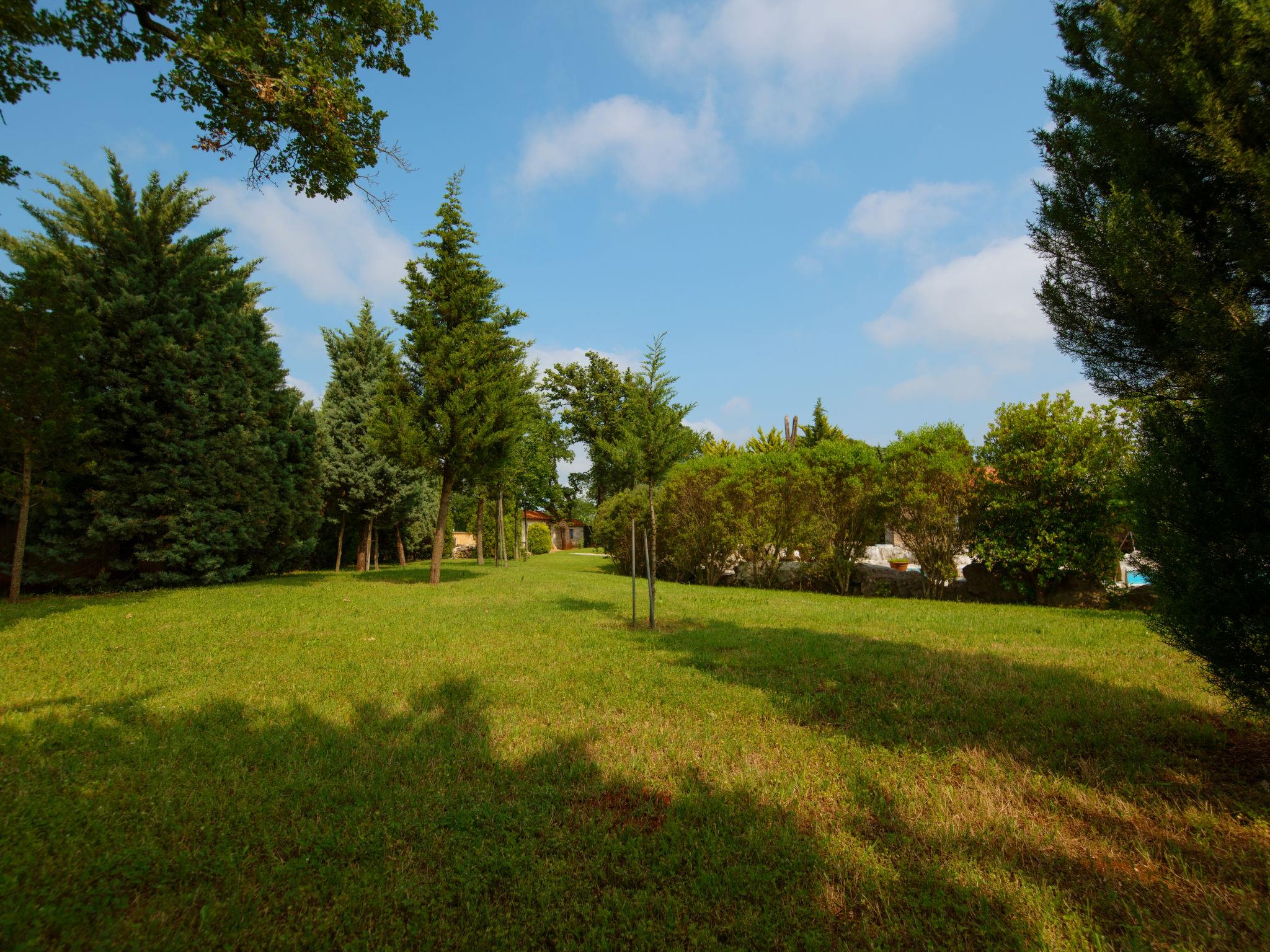 The unit consists of 2 houses rented as one unit. Beautiful villa "Mega". In the hamlet Šajini 9 km from the centre of Barban, in a quiet, sunny position, 12 km from the sea. Private: property 4'000 m2 (fenced), garden with lawn and trees, swimming pool (60 m2, depth 130 cm, seasonal availability: 01.Apr. - 01.Nov.) with internal staircase. Unconventional pool shape. Shower/WC in the pool area, pool house with fridge and cooking stove, terrace (20 m2), garden furniture, barbecue, children's playground (swing), pool maintenance by the owner/gardener. In the house: internet access, table tennis, central heating system, washing machine, tumble dryer. Parking (for 4 cars) at the house on the premises. Shop 250 m, restaurant 3 km, bus stop 5.3 km, pebble beach 12 km, rocky beach 12 km. Riding stable 2.5 km, walking paths from the house, cycle lane 100 m. Nearby attractions: adventure park 1.5 km. Please note: airfield 20 km from the property. By groups of young people double deposit is requested on arrival.