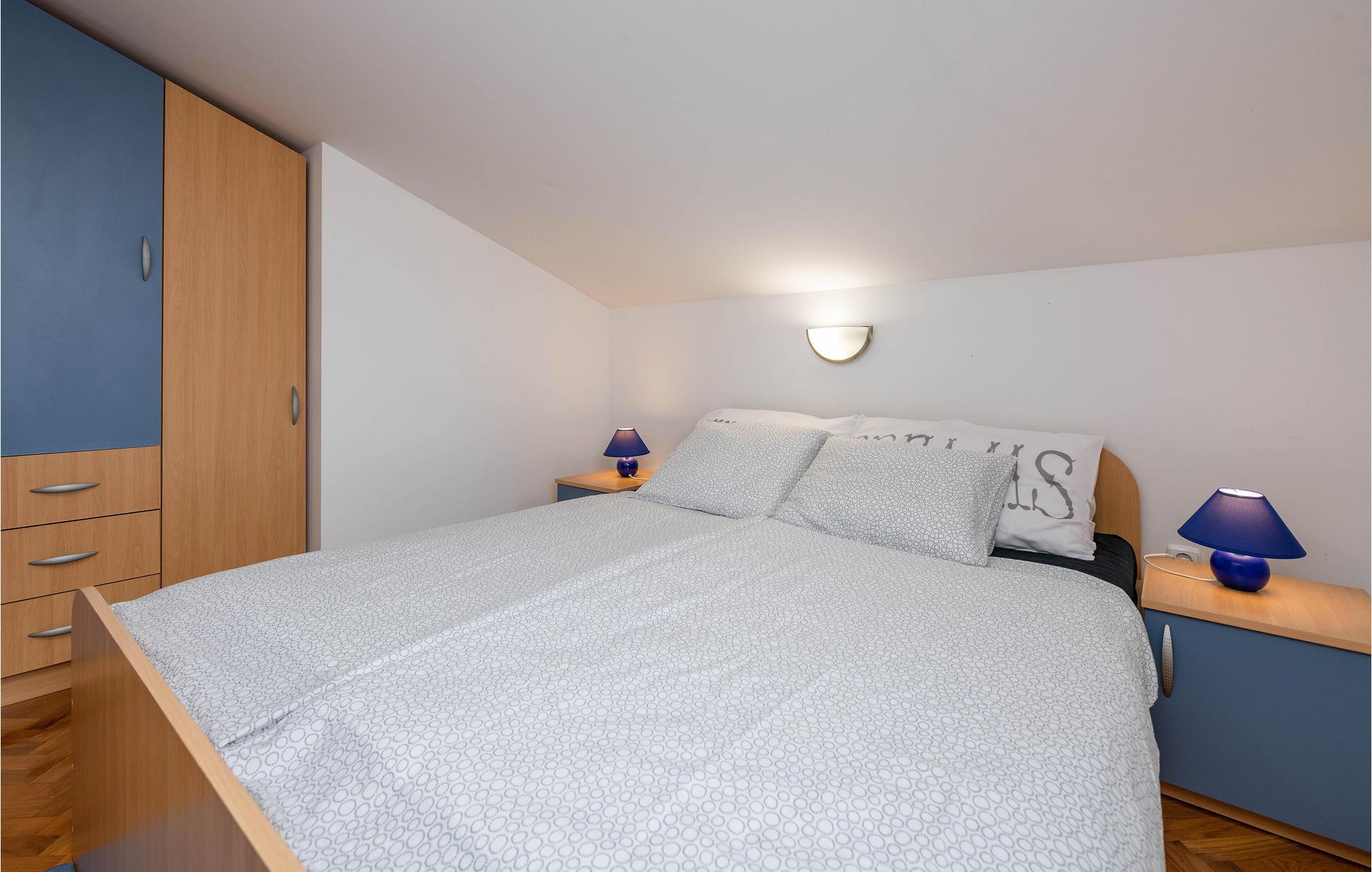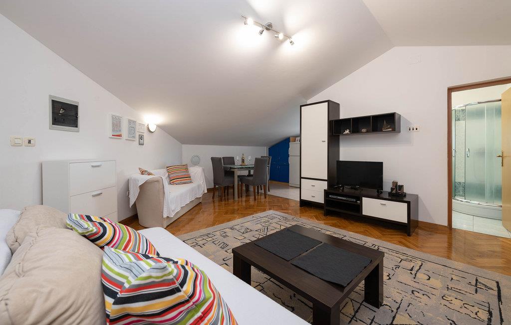 I feriebyen Babariga, på anden sal i en ejendom ligger denne enkelt indrettede ferielejlighed. Den rummer to soveværelser, et stue i åben forbindelse med køkkenet, et badeværelse og en balkon med udsigt ud over Brijuni-øerne. Der er skrå vægge der er ca. 135 cm i kanten. Det tager kun få minutter at køre i bil til de nærmeste badestrande med strandbarer og restauranter. Omgivelserne indbyder også til gå- og cykelture ligesom det er skøn at spadsere langs den livlige havnepromenade i den lille by Fažana, hvor der også er både restauranter, cafeer og mange former for sommerunderholdning.