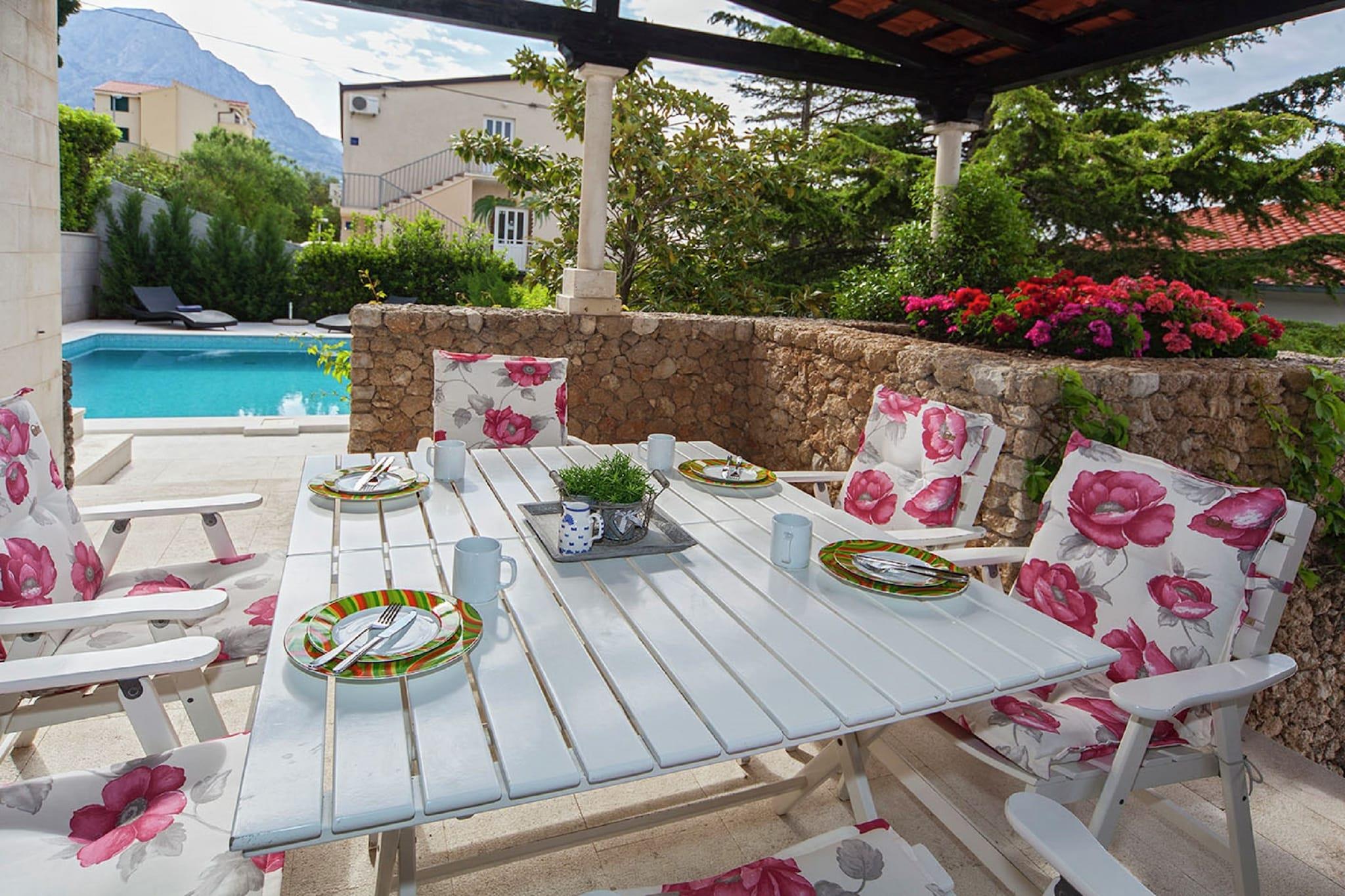 Villa Skalinada er beliggende i den maleriske lille by Baska Voda på Makarska Riviera. Denne charmerende villa kan rumme 8 personer komfortabelt. Denne to etagers villa består af et køkken / spisestue / opholdsstue, et soveværelse med dobbeltseng (140 x 190 cm seng), et separat toilet og et lille motionsrum (med en motionscykel og en siddebænk) på stueetage. Siddemødet er udstyret med kabel-tv, dvd-afspiller og cd-afspiller. Herudover er der strygejern og strygebræt, og det trådløse internet er tilgængeligt overalt i villaen. Første sal består af to soveværelser med dobbeltsenge, to enkeltsenge og to badeværelser (et med et brusebad (størrelse 80 x 80 cm) og et med et badekar (størrelse 100 x 55 cm)). Et af de dobbelte soveværelser er et soveværelse med dobbeltseng (størrelse 160 x 190 cm), eget badeværelse (med bruser), et pengeskab og en udgang til en overdækket altan med en smuk havudsigt. Det andet soveværelse med dobbeltseng har en sengstørrelse på 140 x 190 cm, mens sengene i de enkelte værelser er henholdsvis 90 x 200 cm og 90 x 190 cm. Hvert soveværelse på første sal har havudsigt. Villaen er delvist aircondition. Villaen er udstyret med 5 A / C enheder i alt. Alle 3 dobbeltværelser er udstyret med en enhed hver, mens de to andre enheder er placeret i køkkenområdet i stueetagen og i hallen på første sal henholdsvis. Udendørs grund af villaen omfatter en swimmingpool (24 m2) med en terrasse til solbadning med 8 liggestole, en overdækket terrasse med et bord og 8 stole, have og et område med børns legetøj. Villaen kan nås med et køretøj, men byens centrum og nyttige faciliteter såsom et bageri, et posthus, en café og et apotek er inden for gåafstand takket være små trapper, der fører til centrum. Desuden er havet kun 160 meter væk ved hjælp af disse trapper.